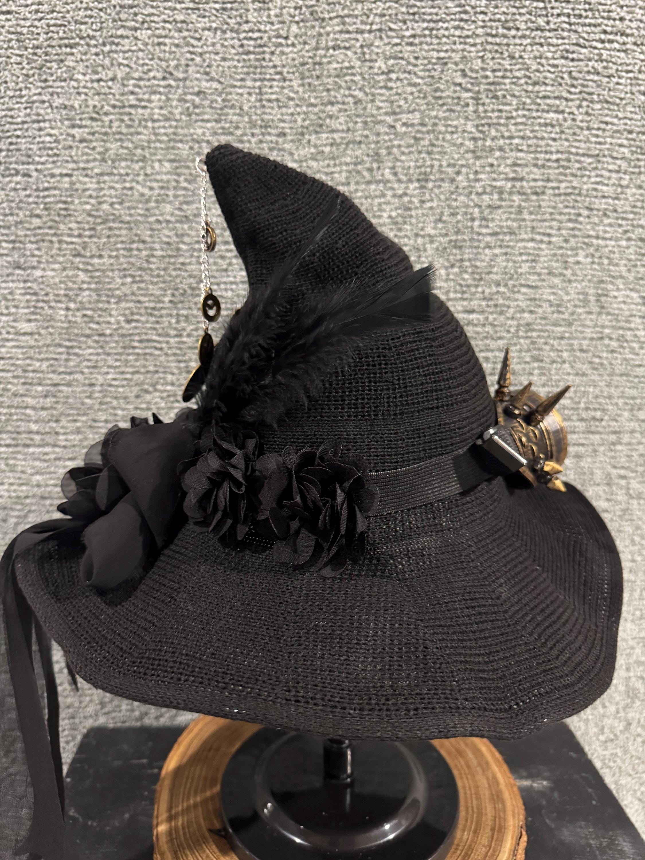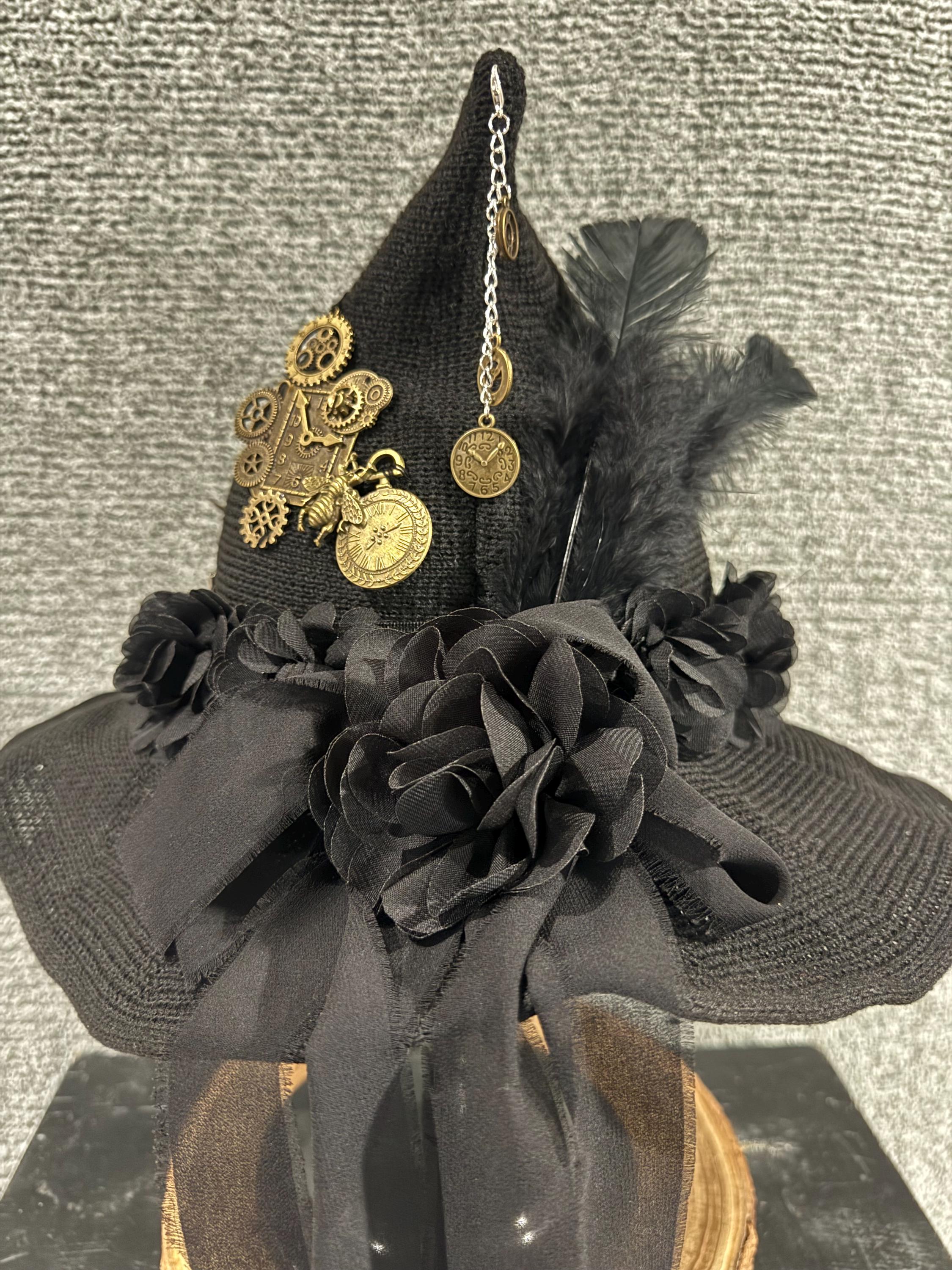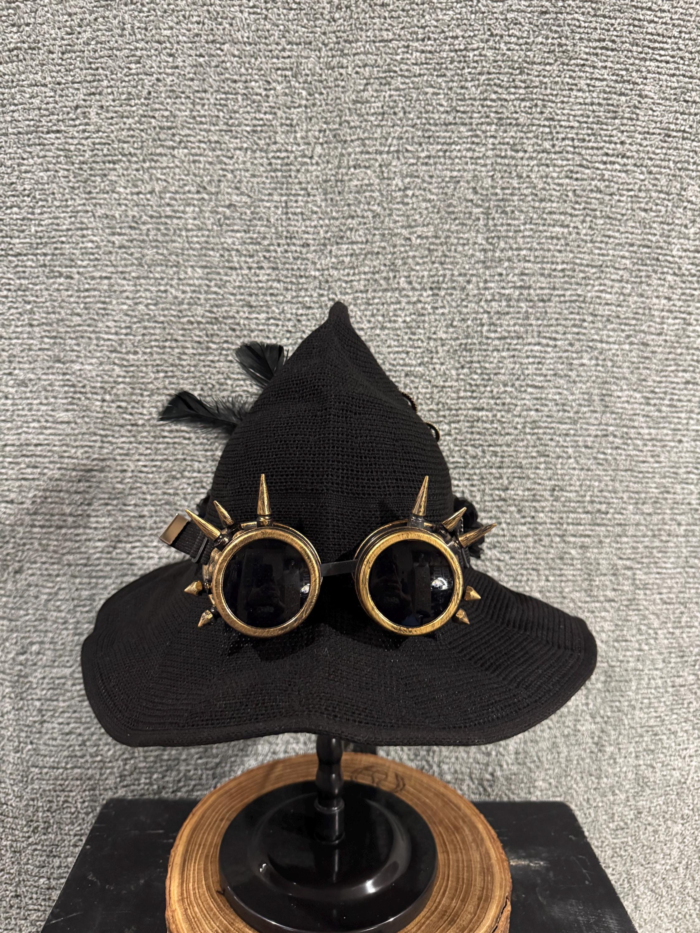 Black high quality fabric Witch Hat with Steampunk glasses and charms. Witch Hat has 2 small black chiffon flowers to each side of hat and 1 large chiffon flower in the back in the middle of large chiffon bow. Witch hat has 2 black feathers to the right side of hat and removeable hanging silver chain with bronze steampunk charms. Hat has large bronze steampunk charms on back left side. My hats are 1 of kind witch hats some are similar but never exactly alike. One size fits most people head circumference 22"-22.83". Items are all sewed on. Blessed Be!
