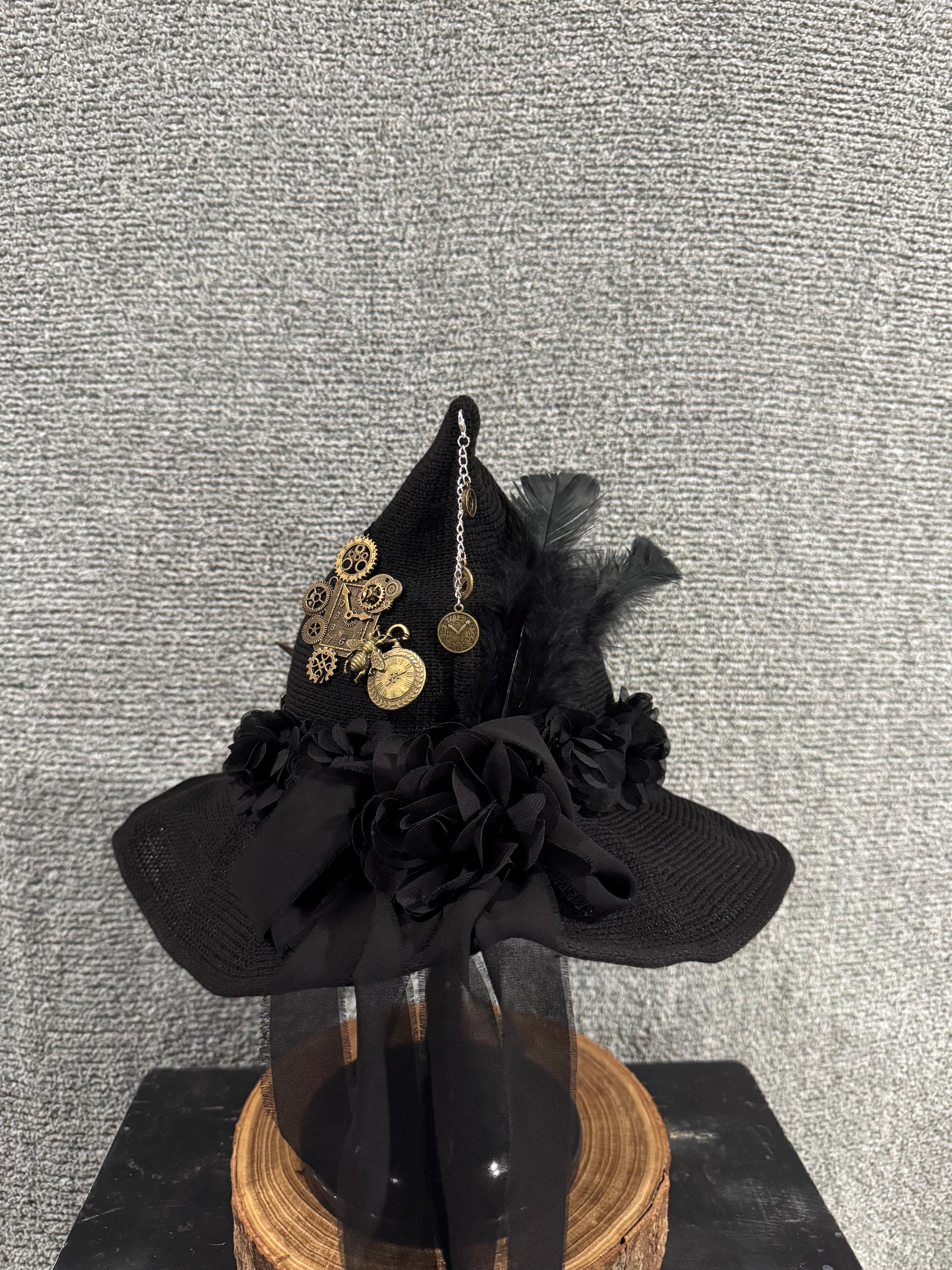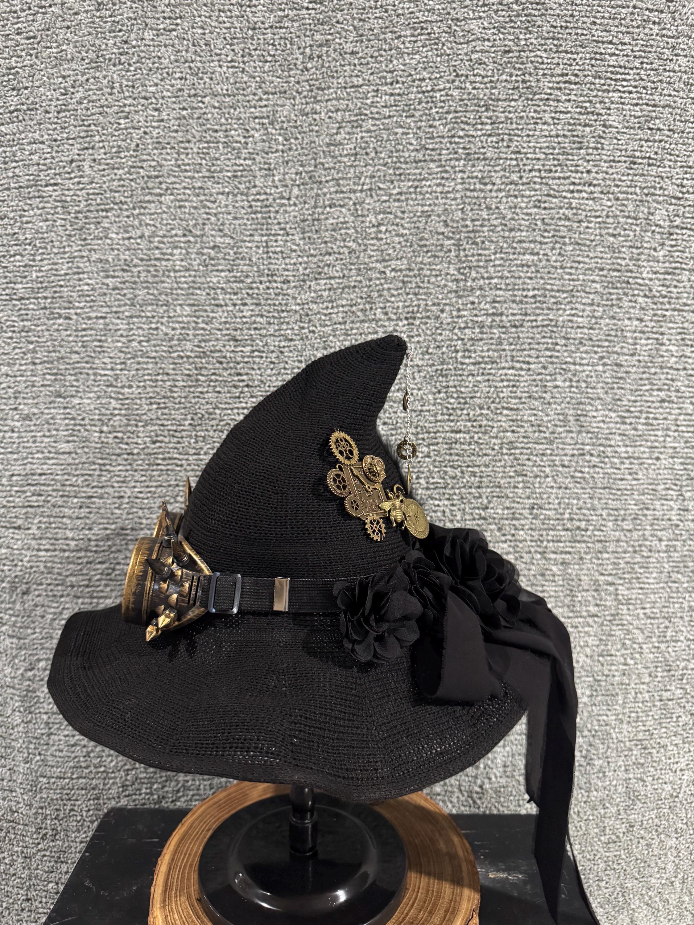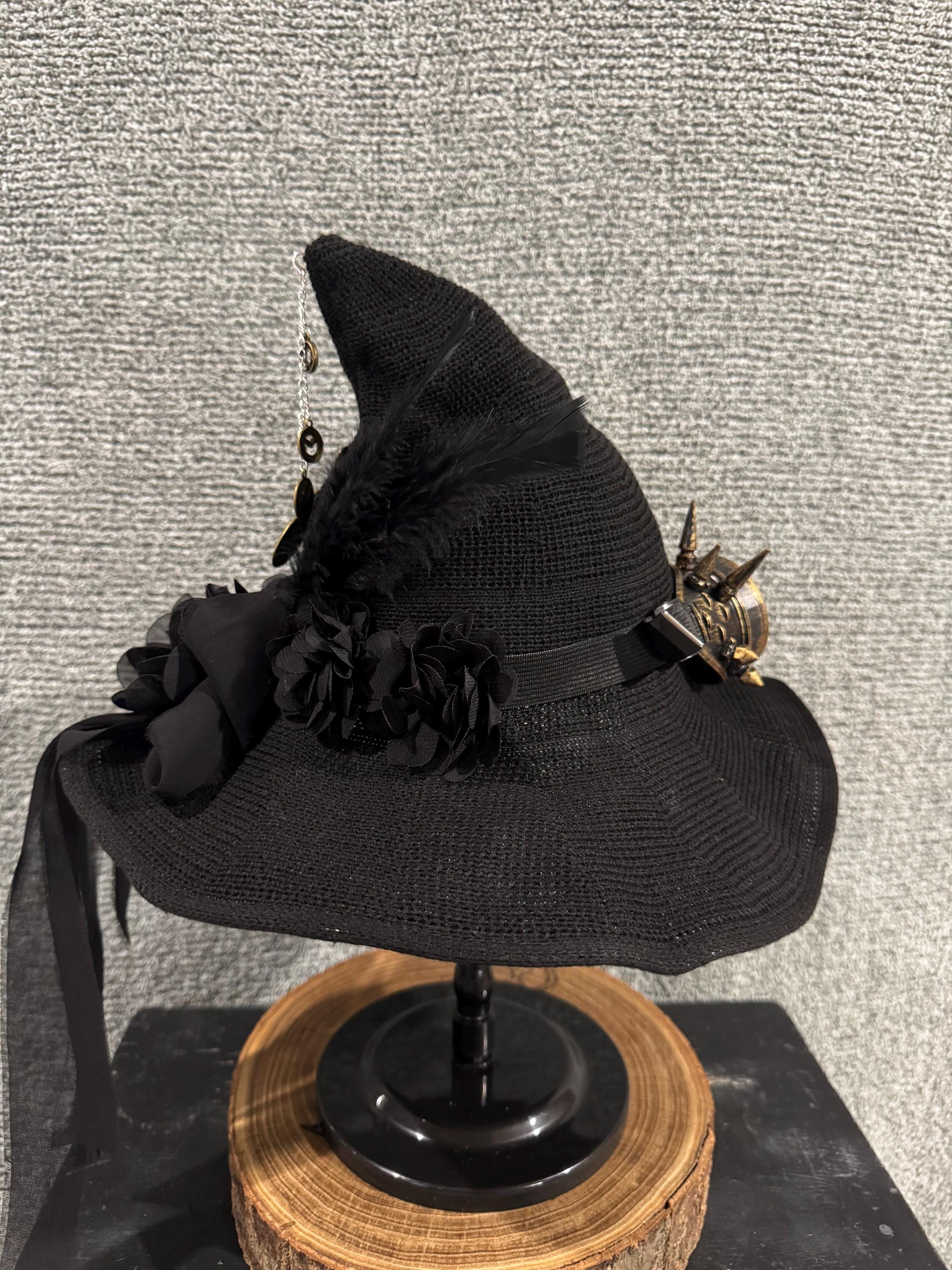 Black high quality fabric Witch Hat with Steampunk glasses and charms. Witch Hat has 2 small black chiffon flowers to each side of hat and 1 large chiffon flower in the back in the middle of large chiffon bow. Witch hat has 2 black feathers to the right side of hat and removeable hanging silver chain with bronze steampunk charms. Hat has large bronze steampunk charms on back left side. My hats are 1 of kind witch hats some are similar but never exactly alike. One size fits most people head circumference 22"-22.83". Items are all sewed on. Blessed Be!