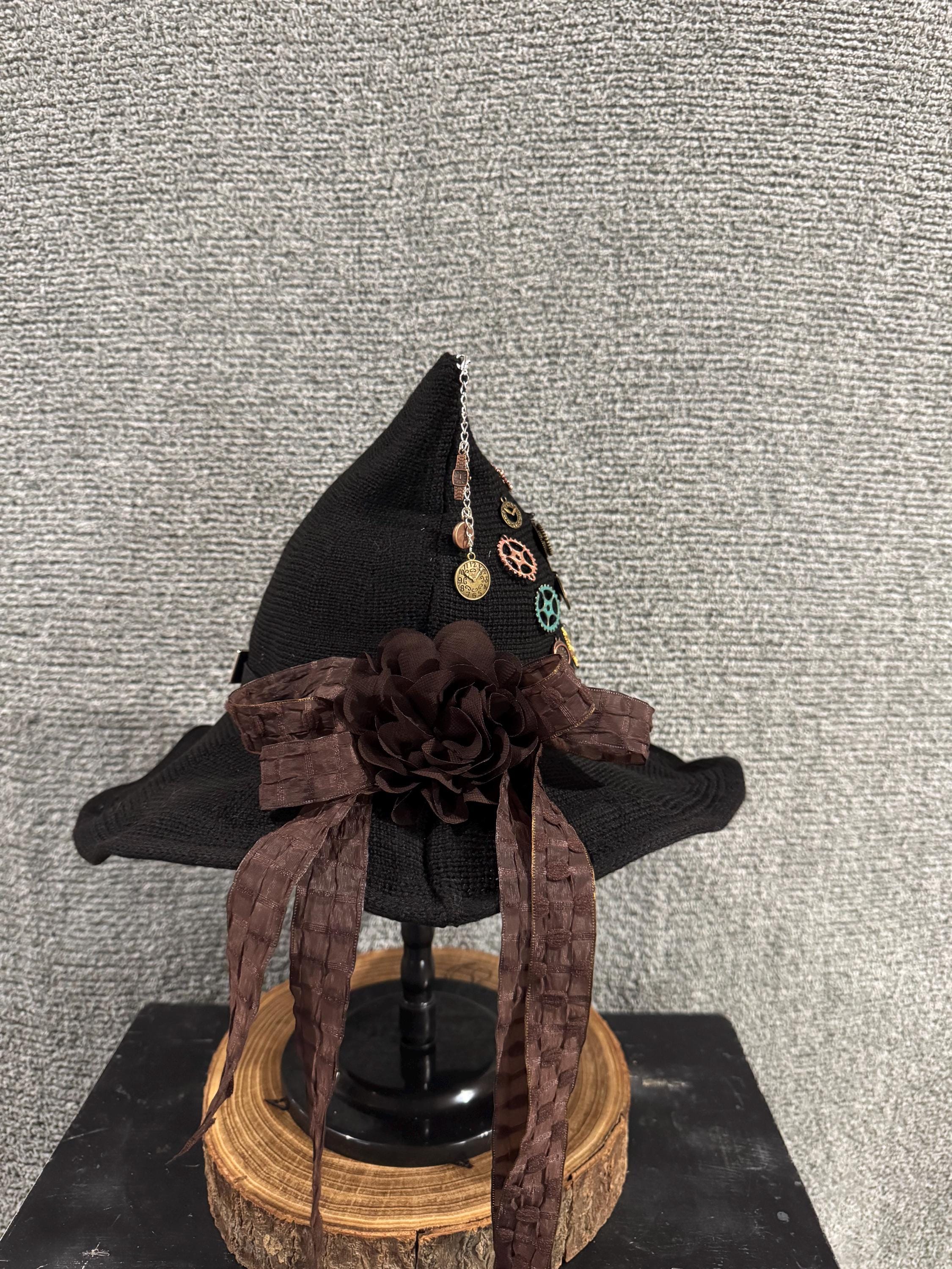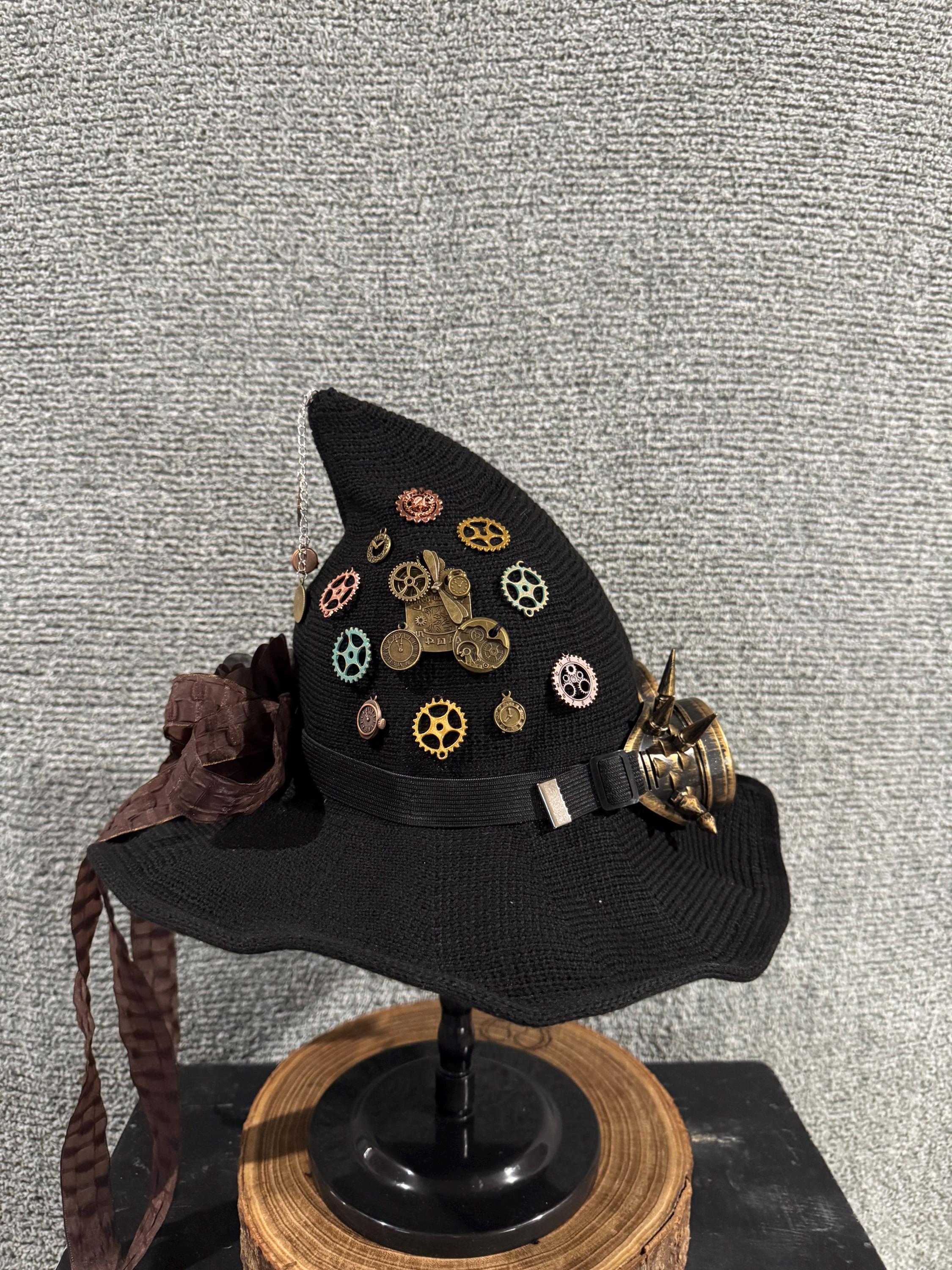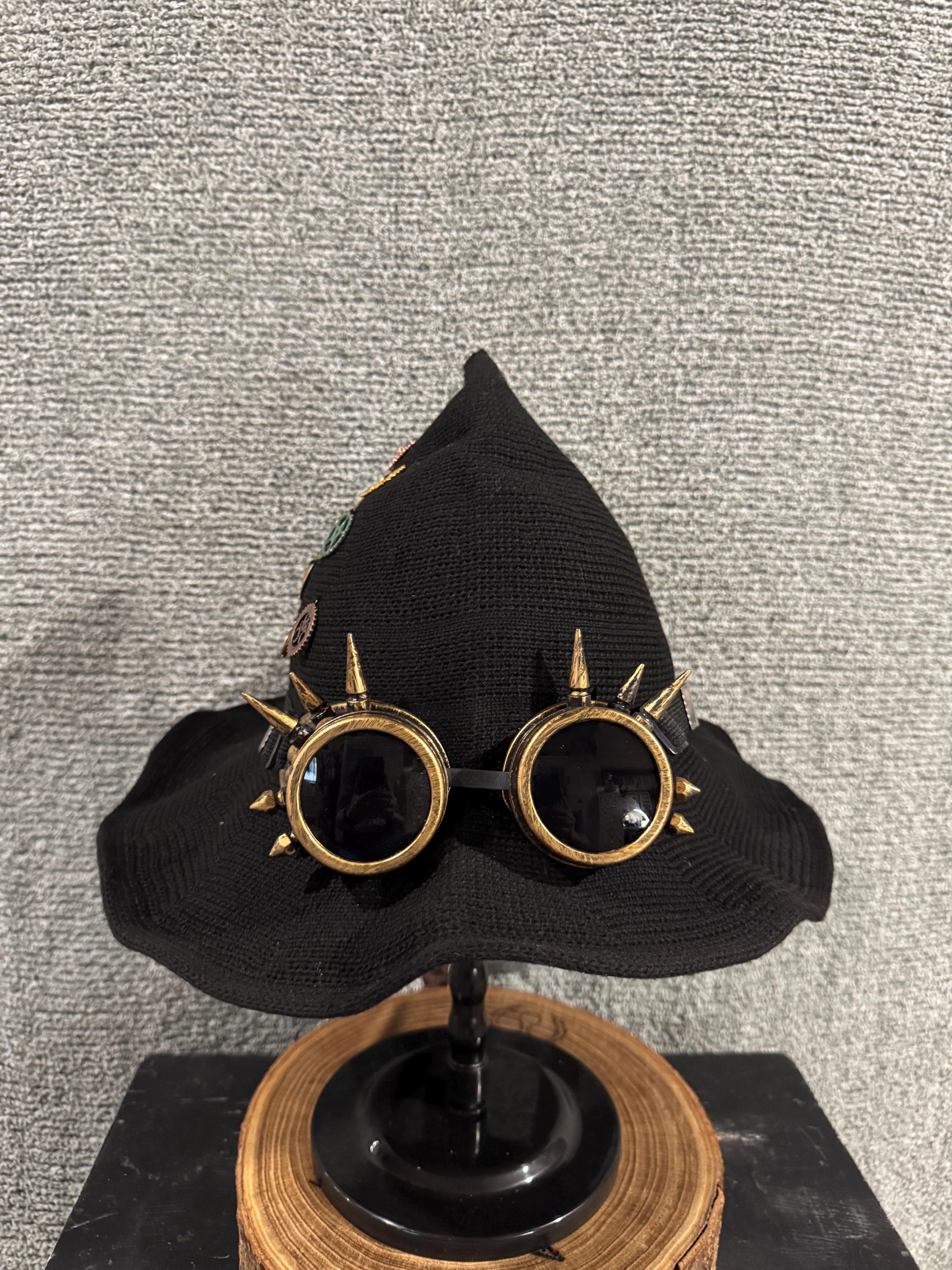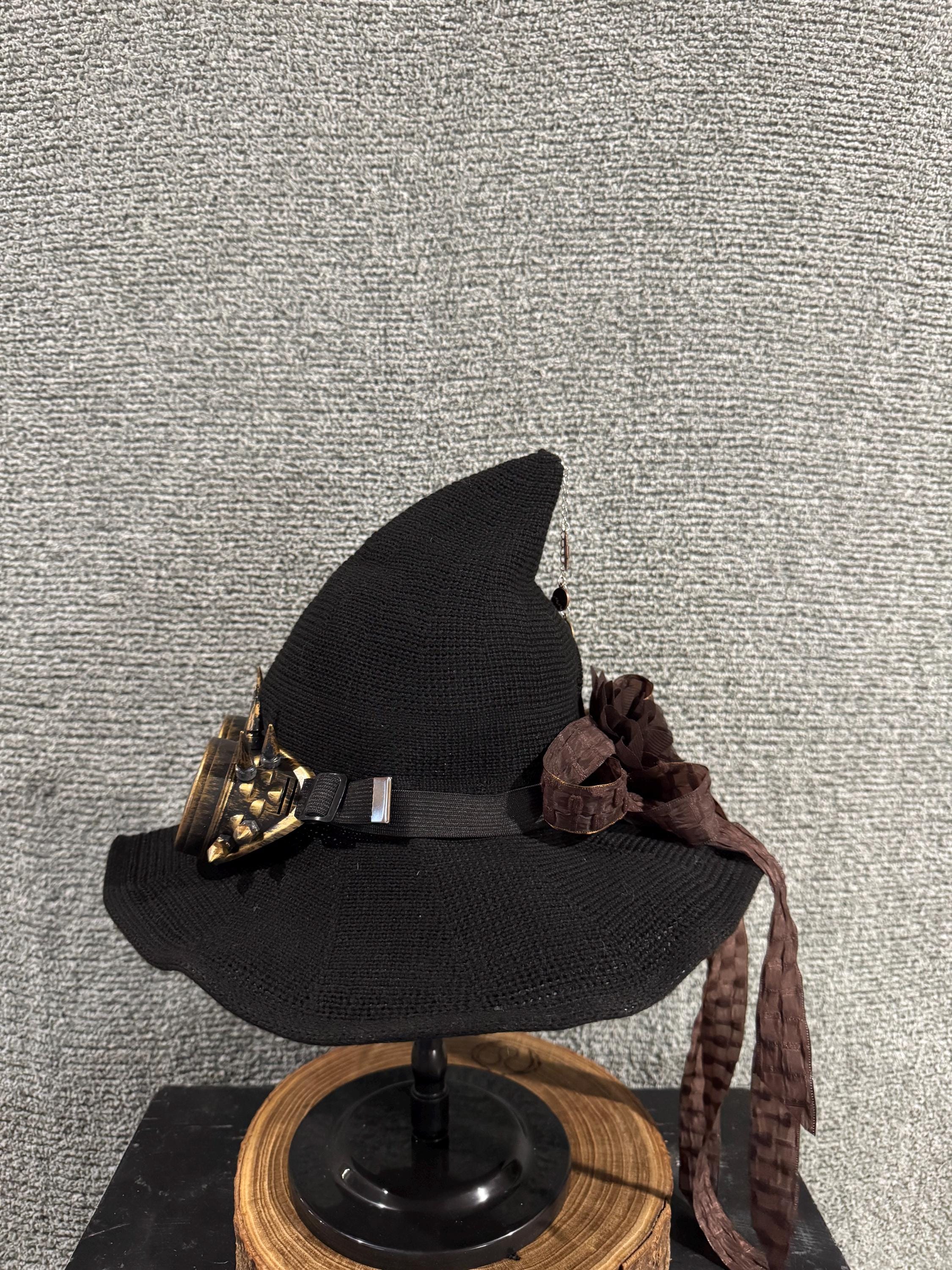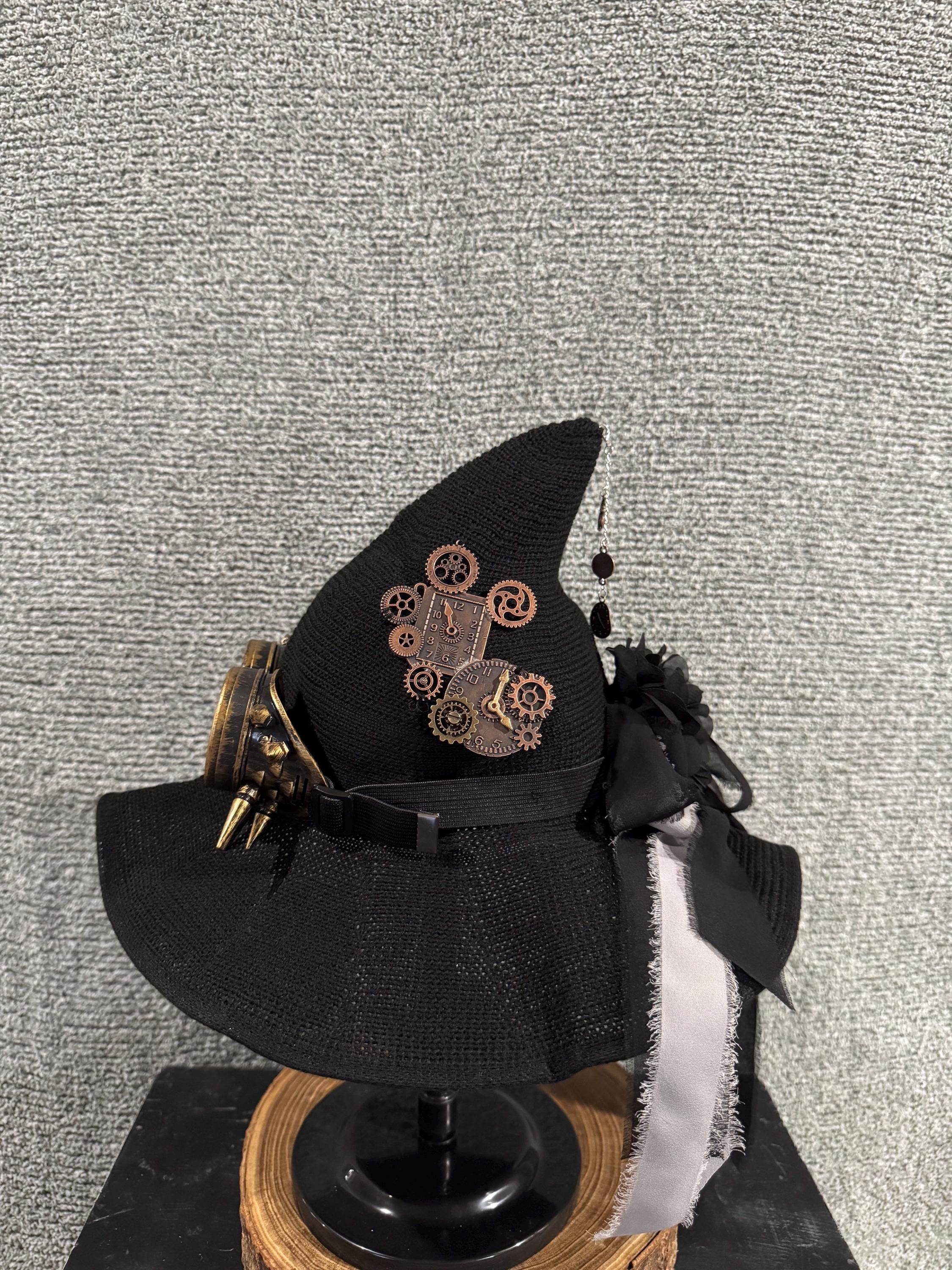 Womens Black Steampunk Witch Hat with Steampunk Glasses and Charms. Hat is Made of High-Quality Fabrics which is light and soft. Hat has steampunk glasses in the front, steampunk charms of the right side, dark brown ribbon bow in the back with a brown chiffon flower in the middle and removeable silver chain with steampunk charms, all items are sewed on the hat. All Witch Hats are 1 of a kind, some are similar but never exactly alike. Blessed Be!