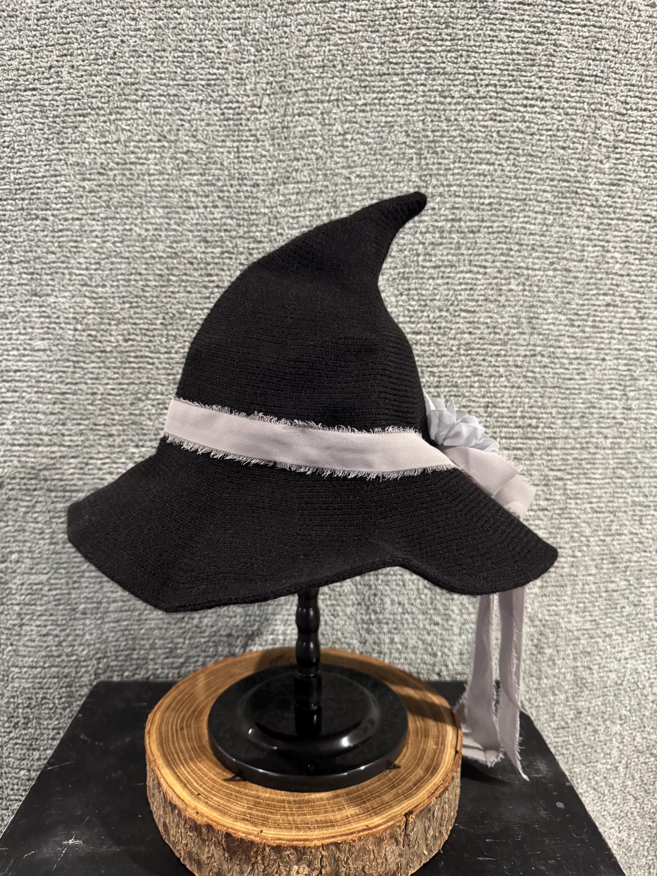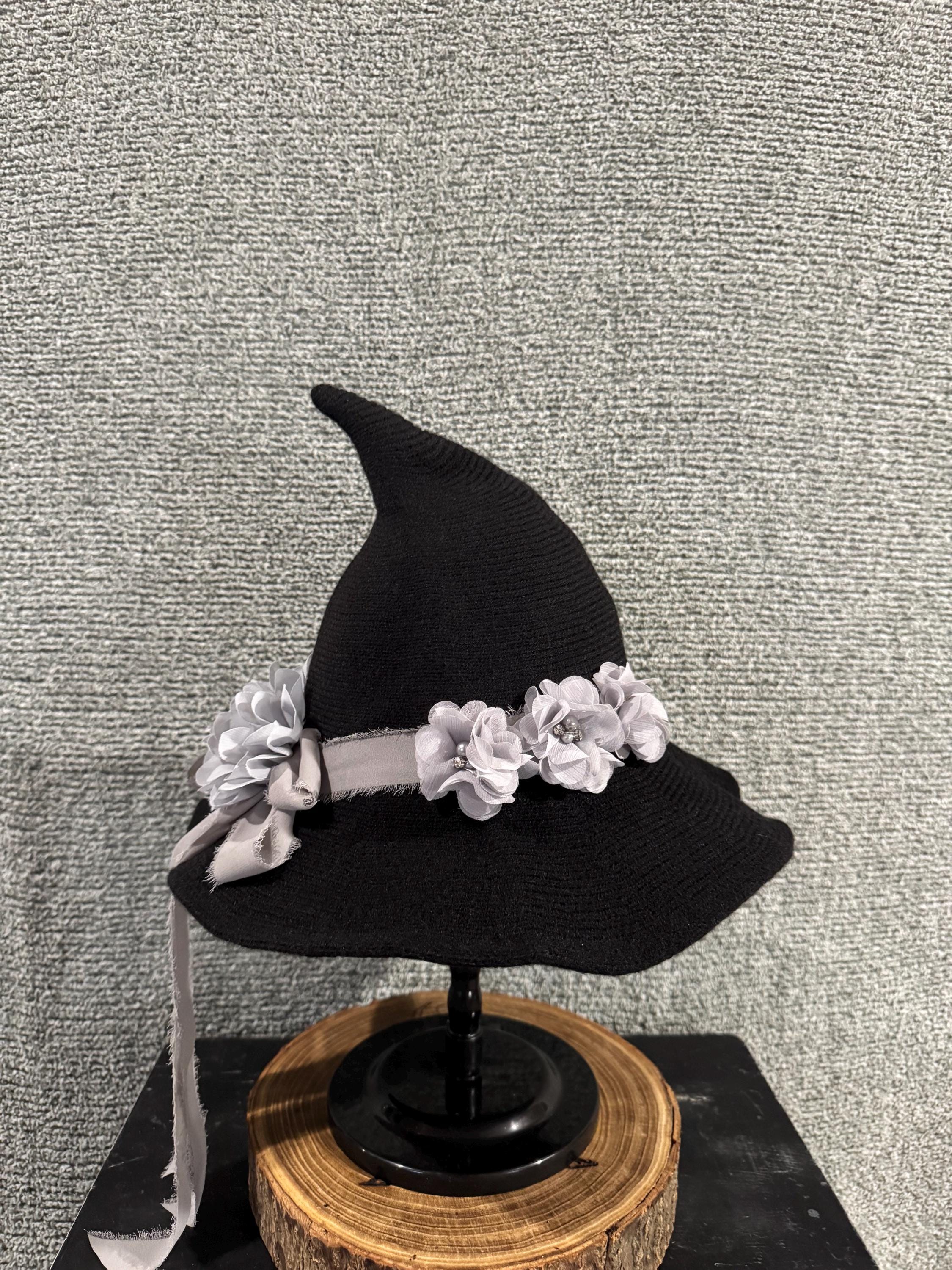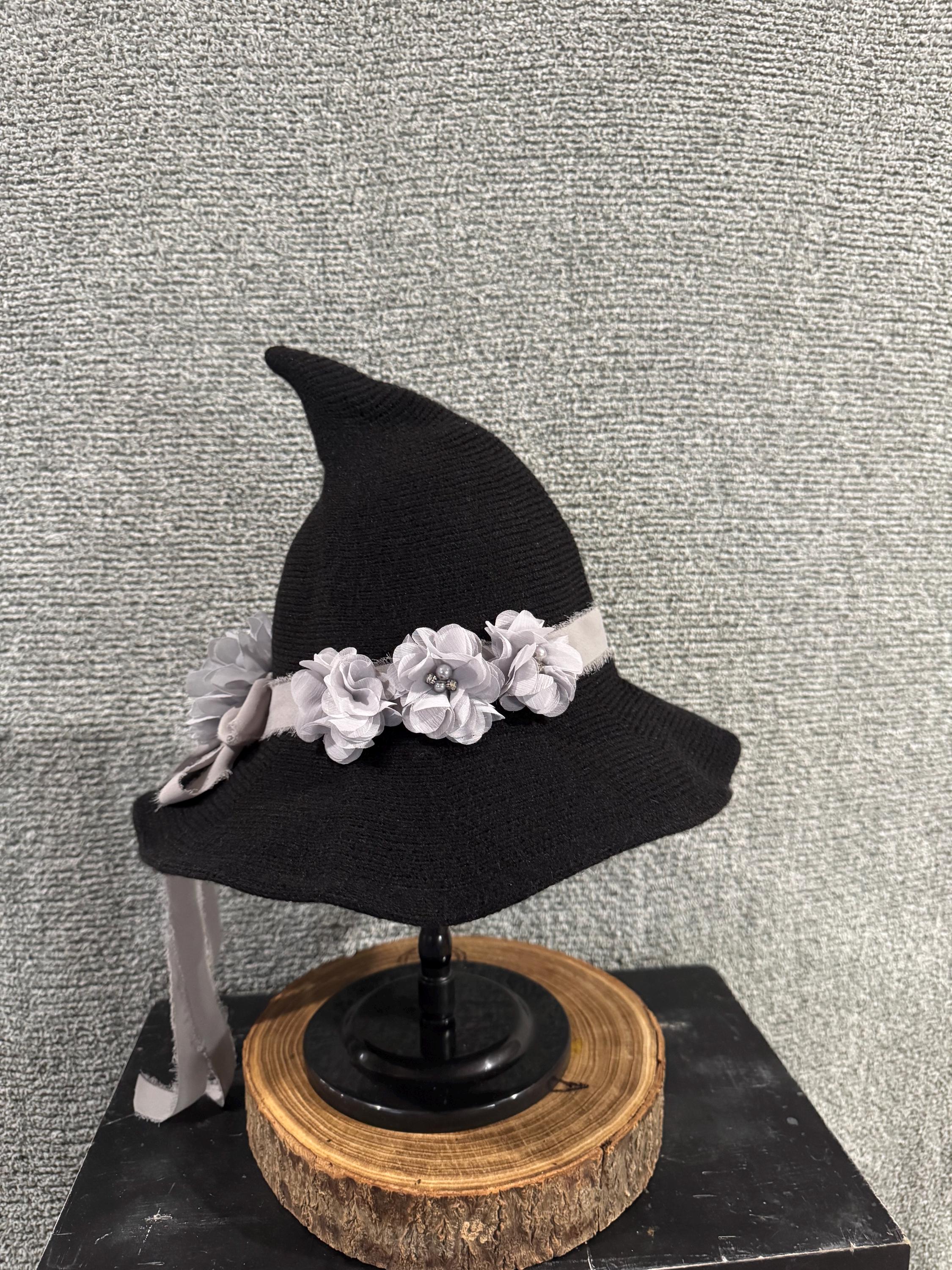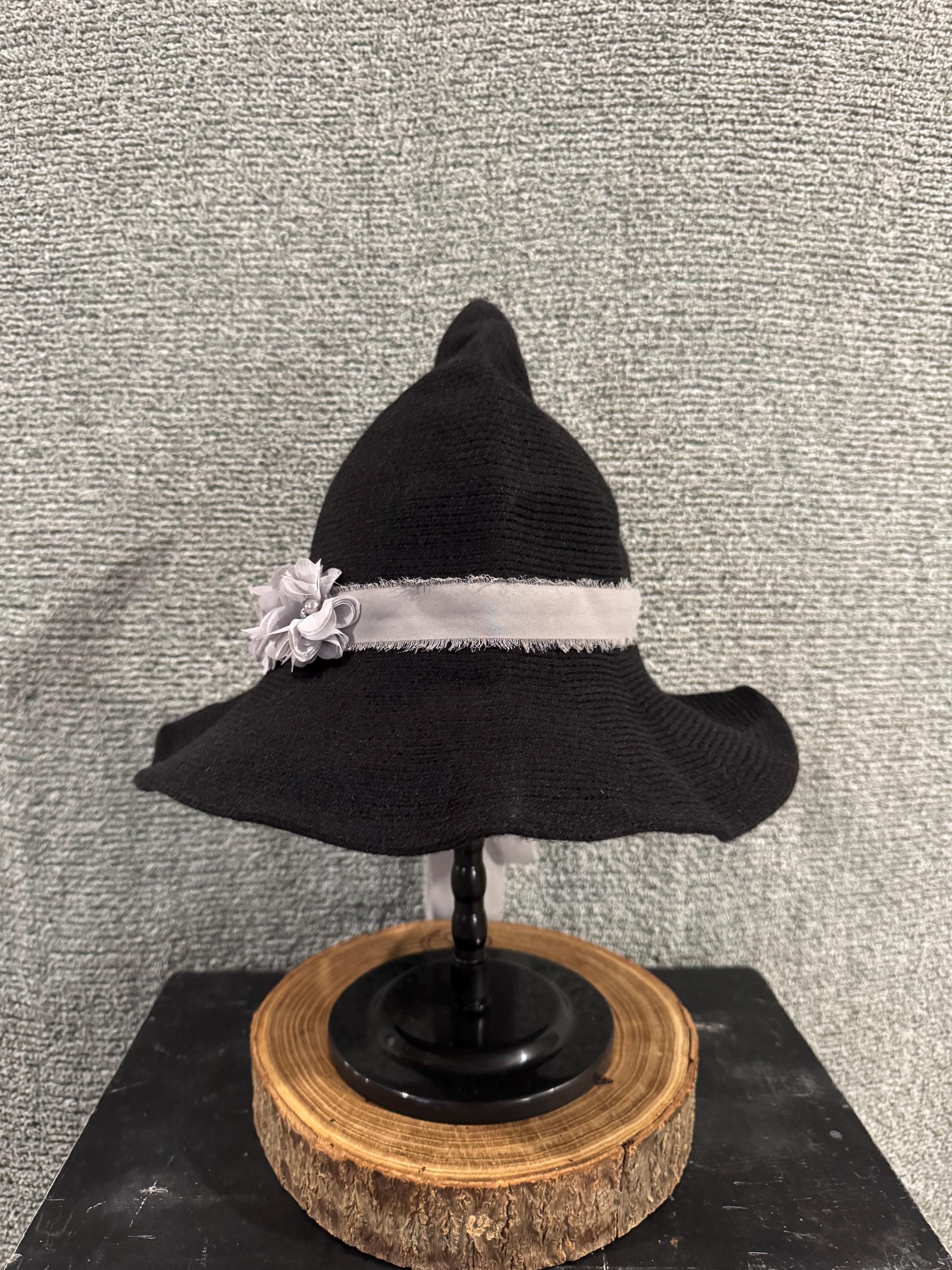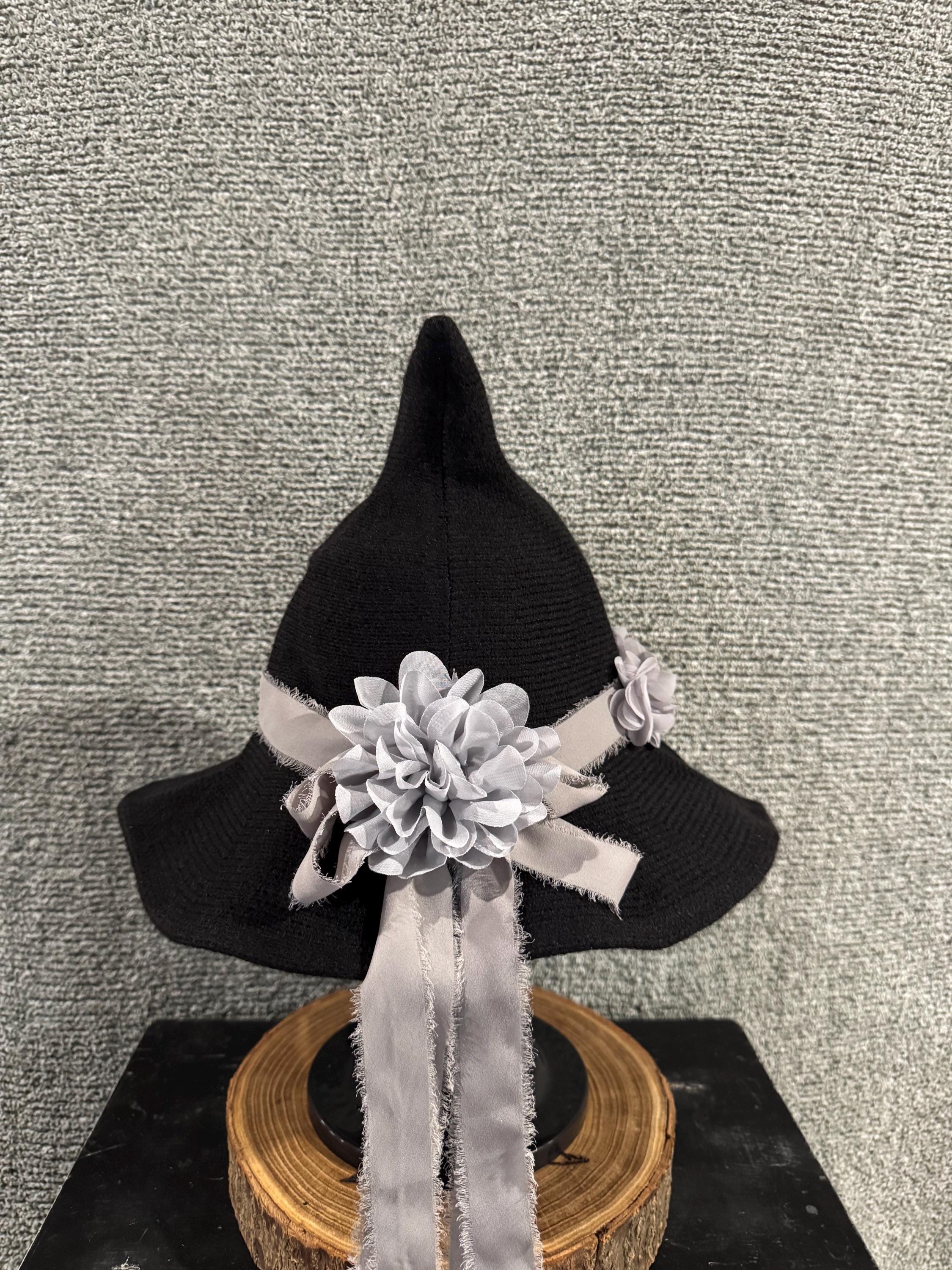 Womens Black Pointed Wool Blend Knitted Witch Hat. Hat size is about 22.05-22.83 Inches in hat circumference. The Witch Hat has gray chiffon ribbon around the hat and a chiffon bow in the back with a large chiffon gray flower. Hat has 3 gray chiffon small flowers on the right side of hat with pearls and rhinestones in the middle. I make 1 of a kind Witch Hats some are similar but never exactly alike. Everything is sewed on the hat. Blessed Be!