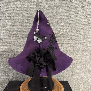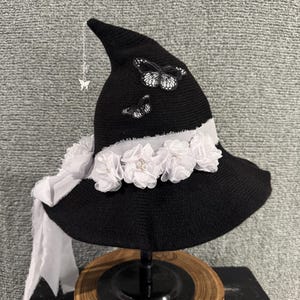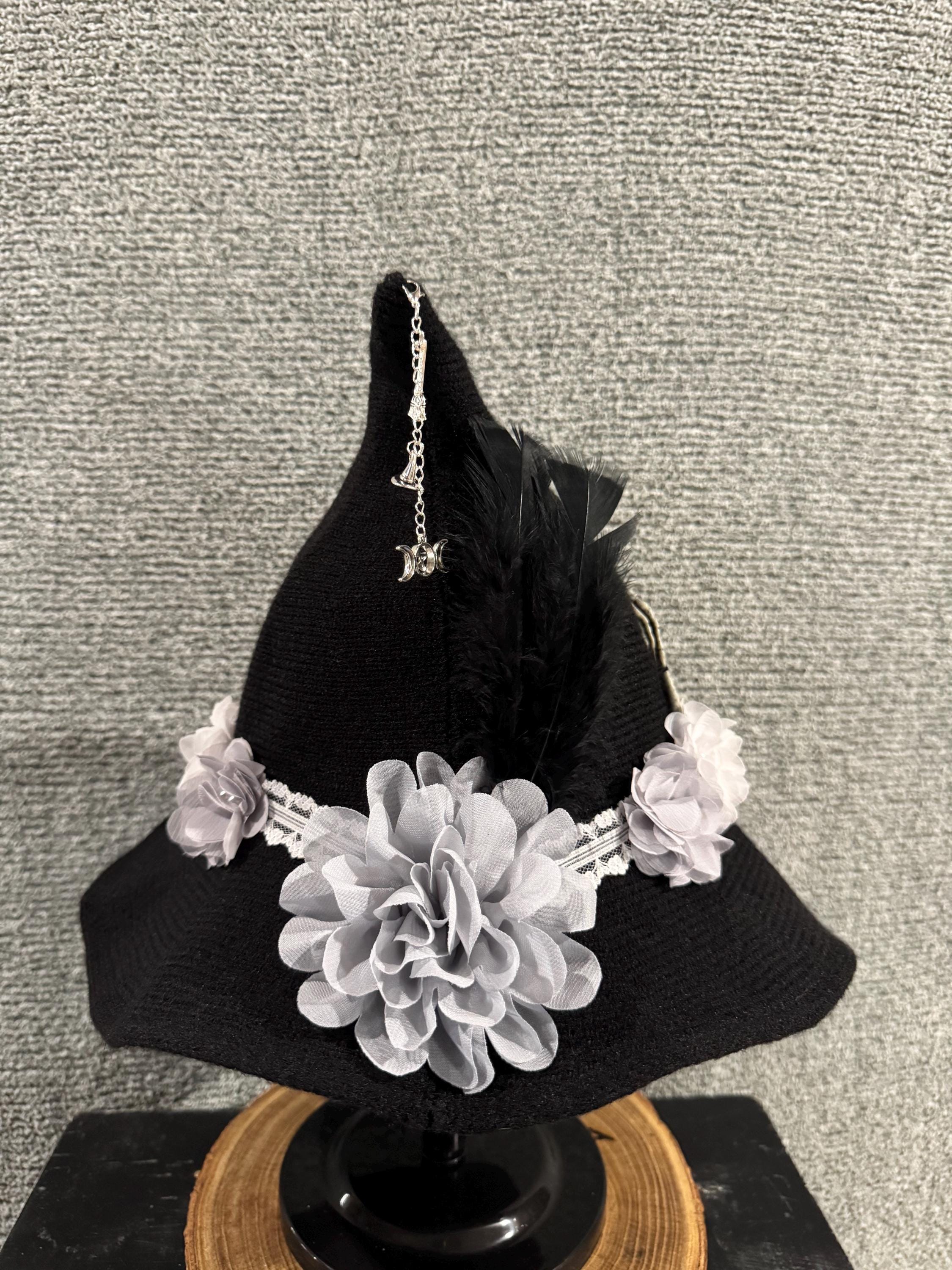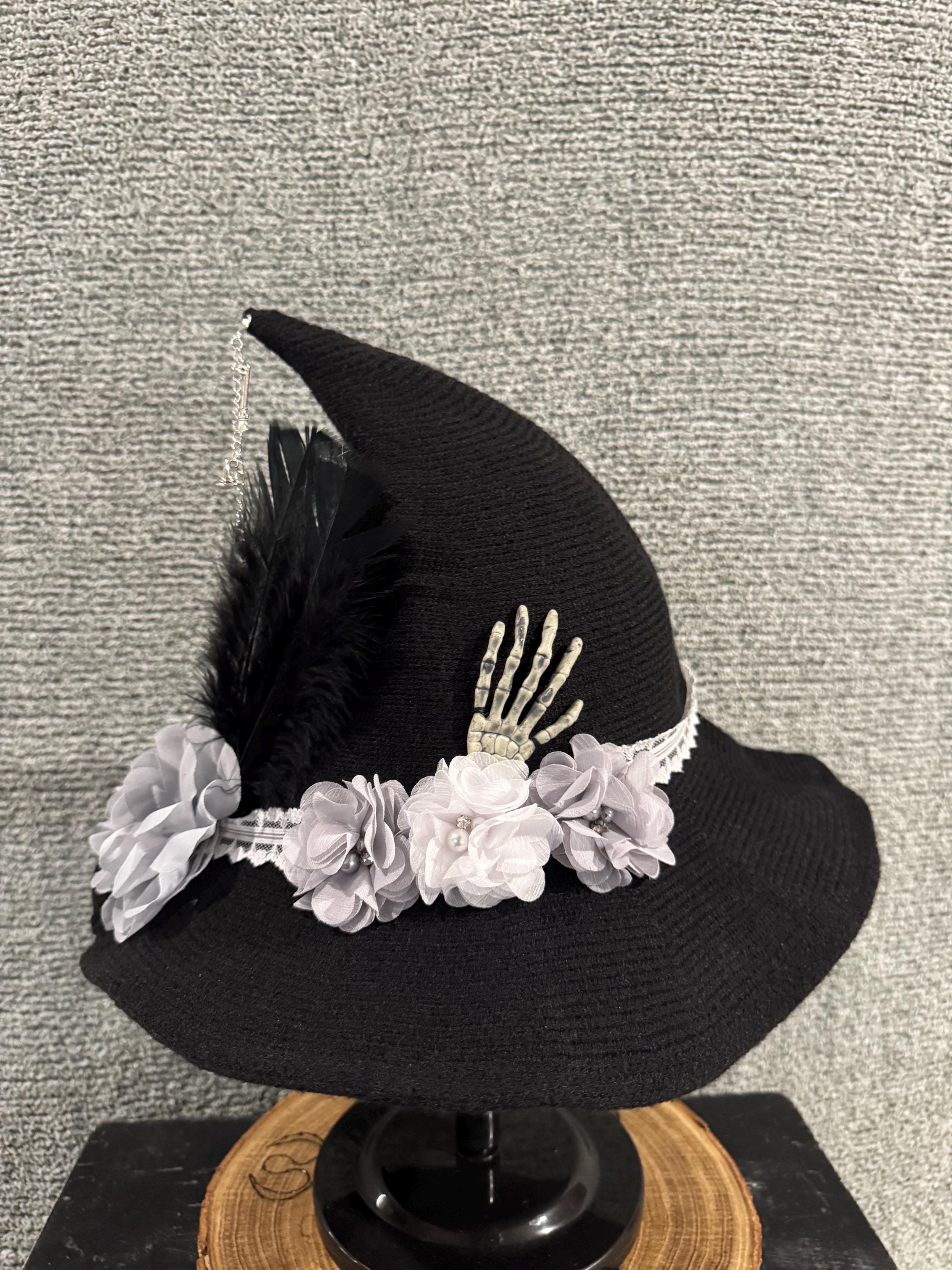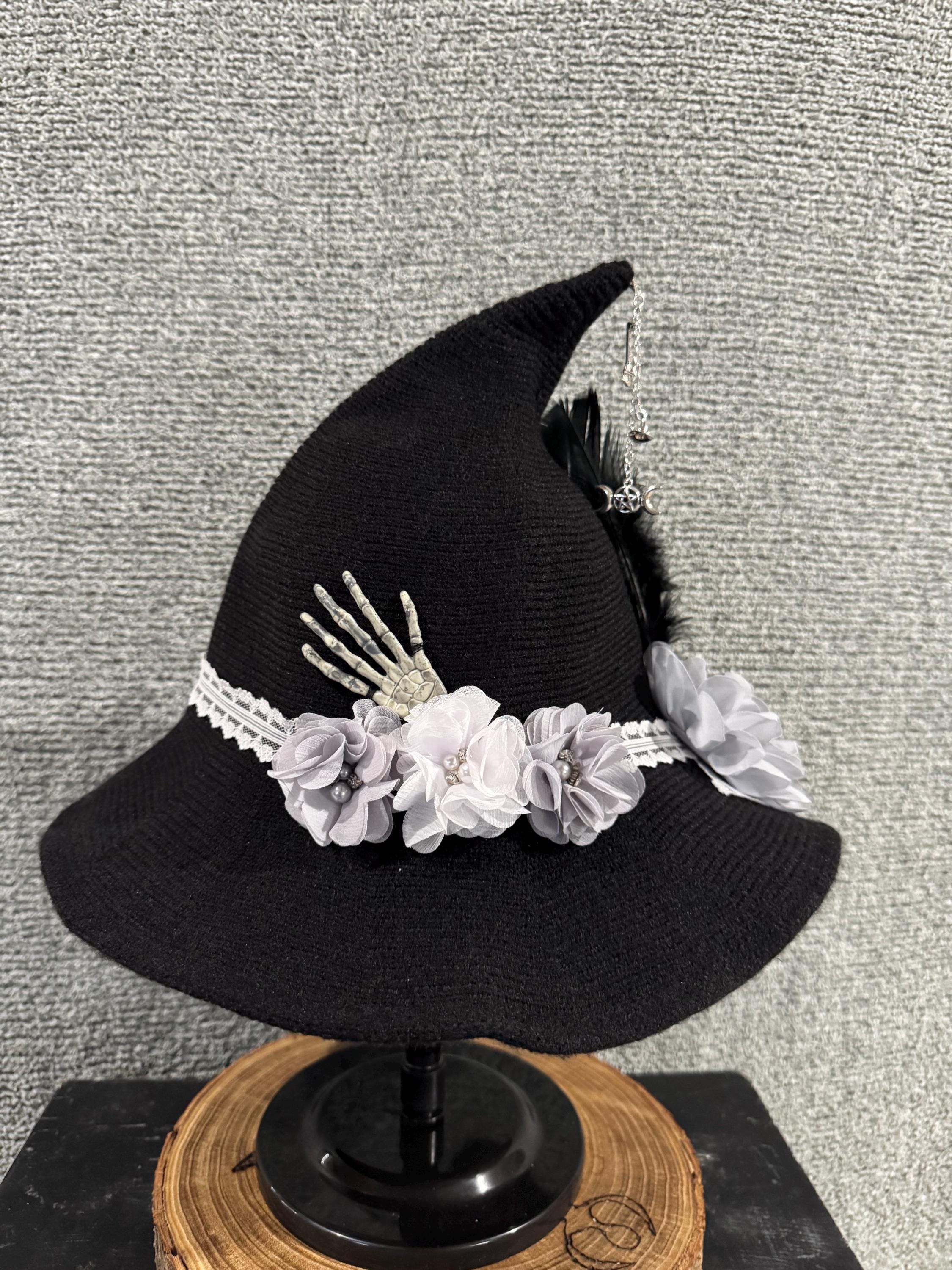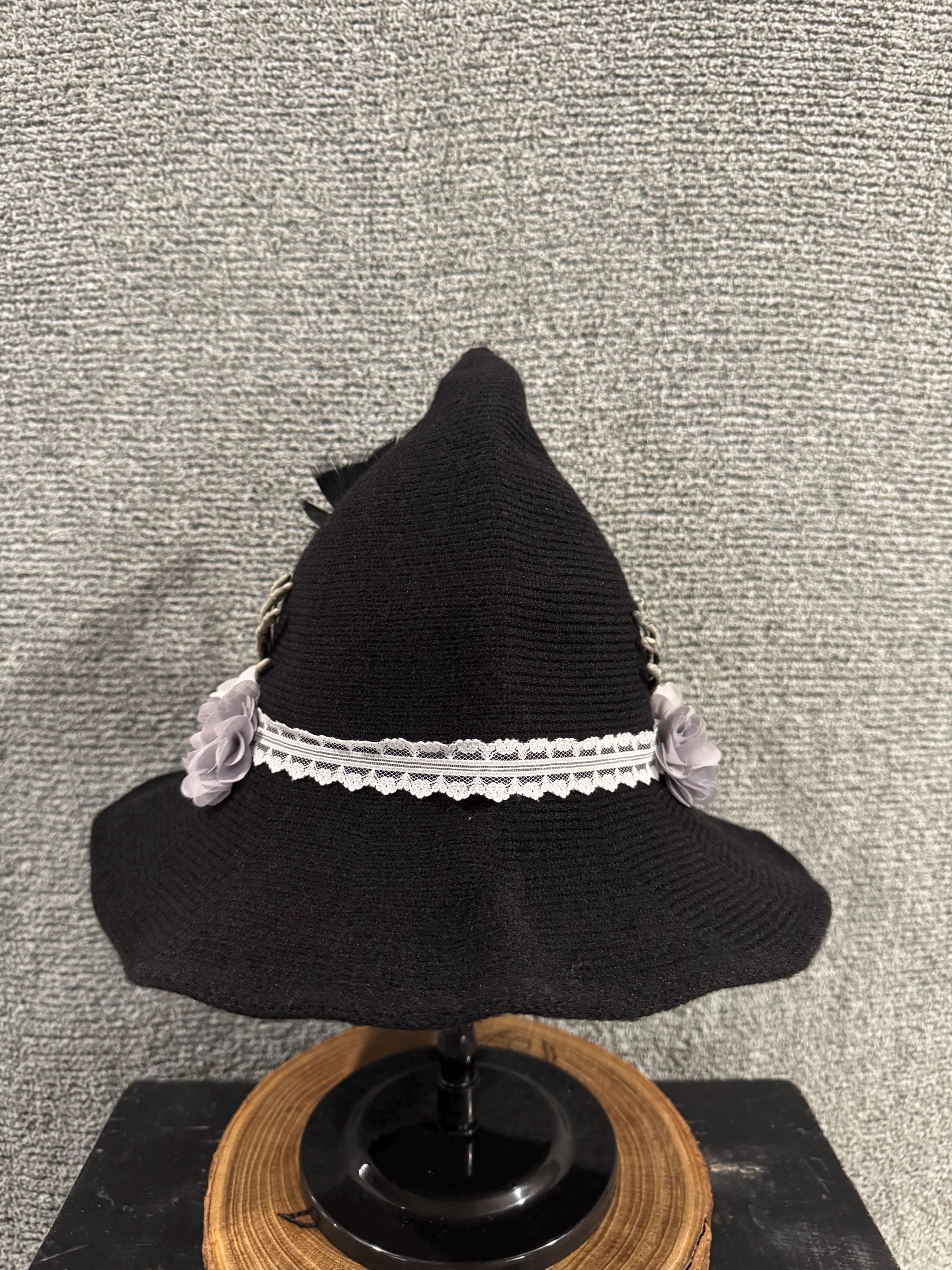 Womens Black Wool Knitted Witch Hat. Witch Hat measures approximately 22.05"-22.83" in hat circumference. Hat is soft, elastic, breathable and lightweight. Witch Hat has white lace going around the hat and 2 small chiffon gray flowers and 1 white chiffon flower with skeleton hands on both left and right side. Hat has 1 large gray chiffon flower in the back and 2 black feathers along with silver chain with 3 charms (besom, witch hat, triple moon pentacle charms). I make 1 of a kind witch hats, some are similar but never exactly the same. All items are sewed on the hat. Blessed Be!