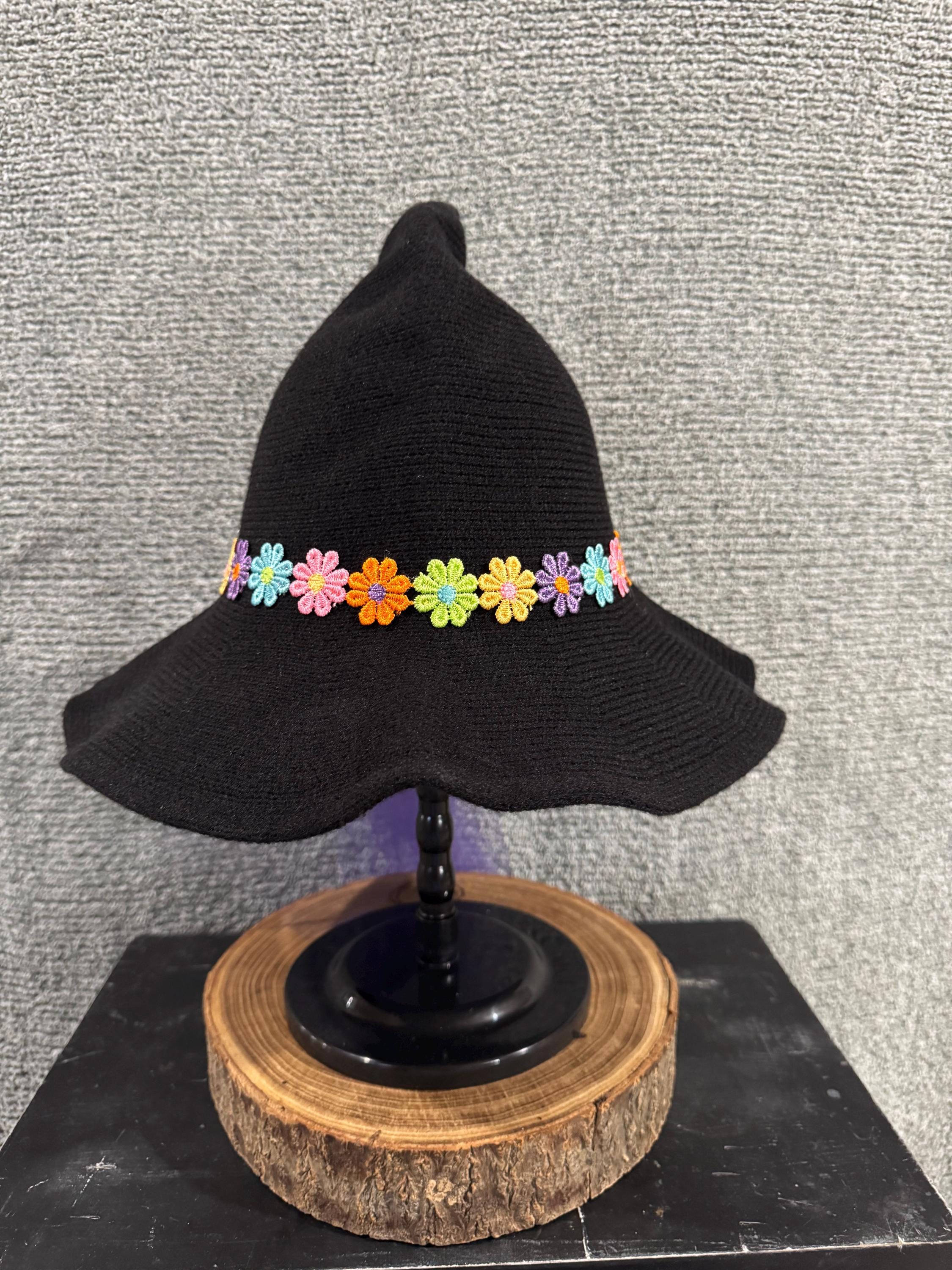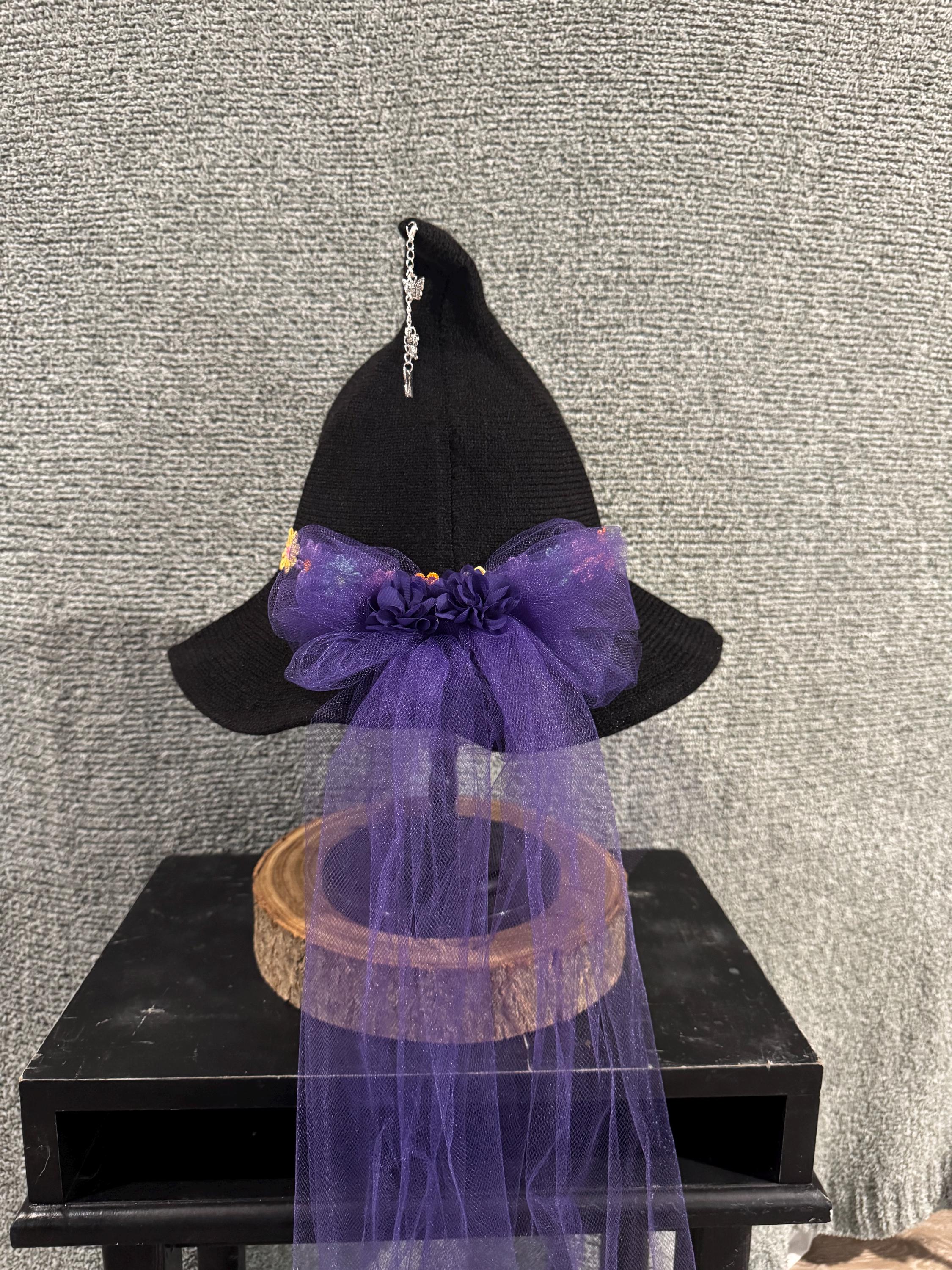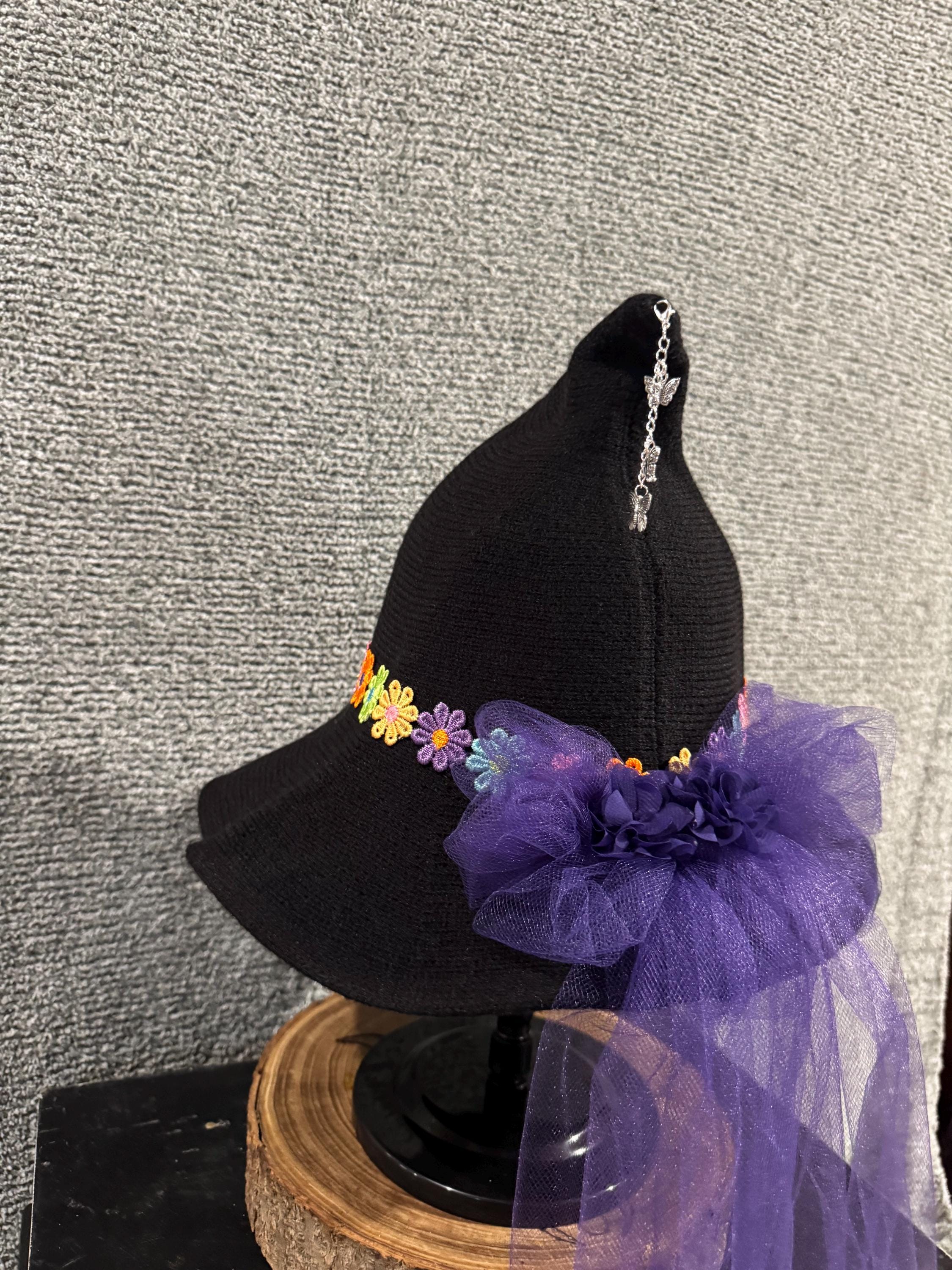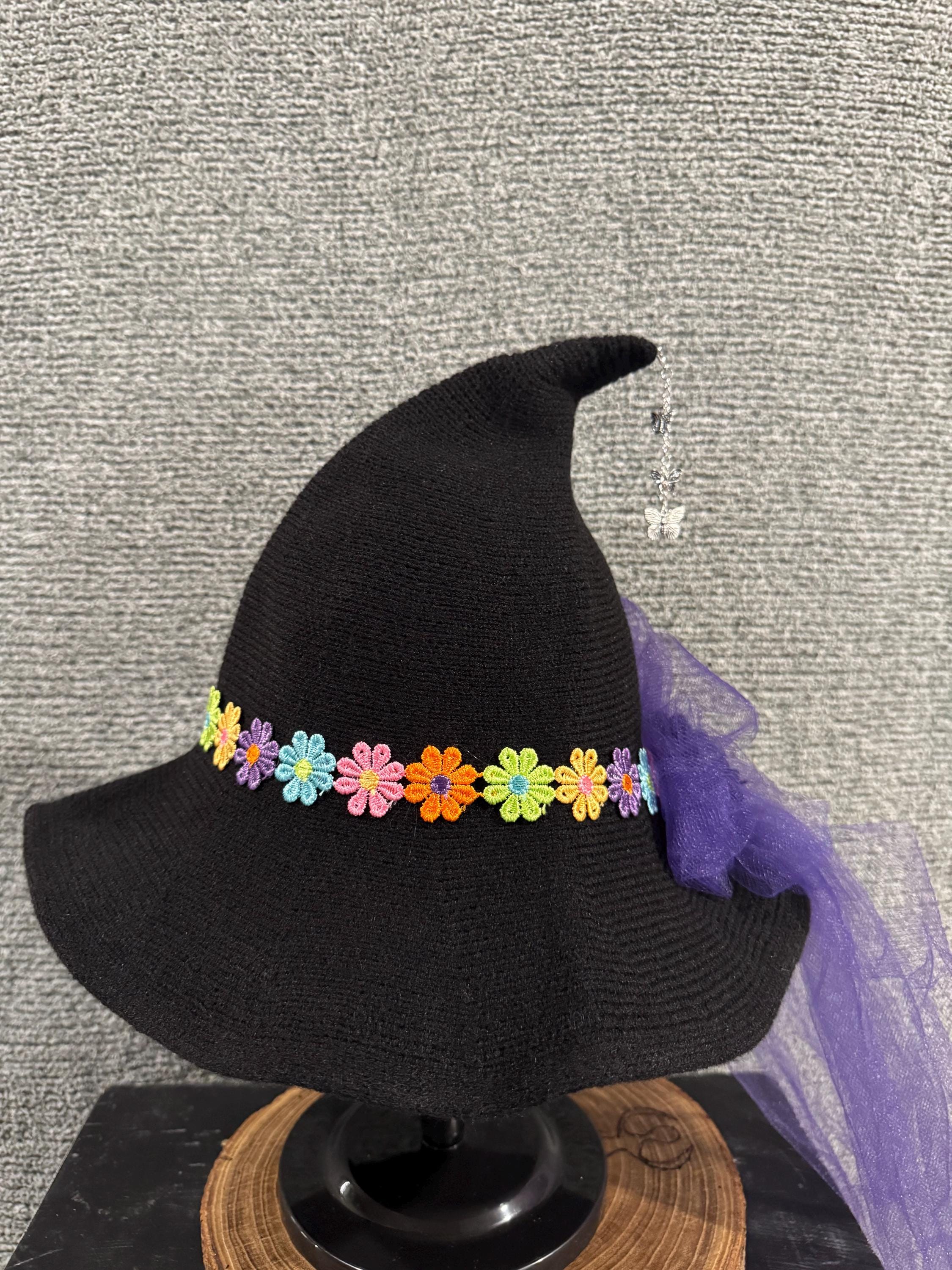 Womens Black Knitted Wool Blend Witch Hat. Hat is made of wool blend, which is soft and elastic, breathable and lightweight. Hat has embroidered colored flowers going around it with a purple tulle ribbon bow in the back that has 2 small chiffon purple flowers in the middle. On the point of the hat is a removeable silver chain with 3 silver butterfly charms on it. All items are sewed on. I make 1 of a kind witch hats, some are similar but no 2 are exactly the same. Blessed Be!