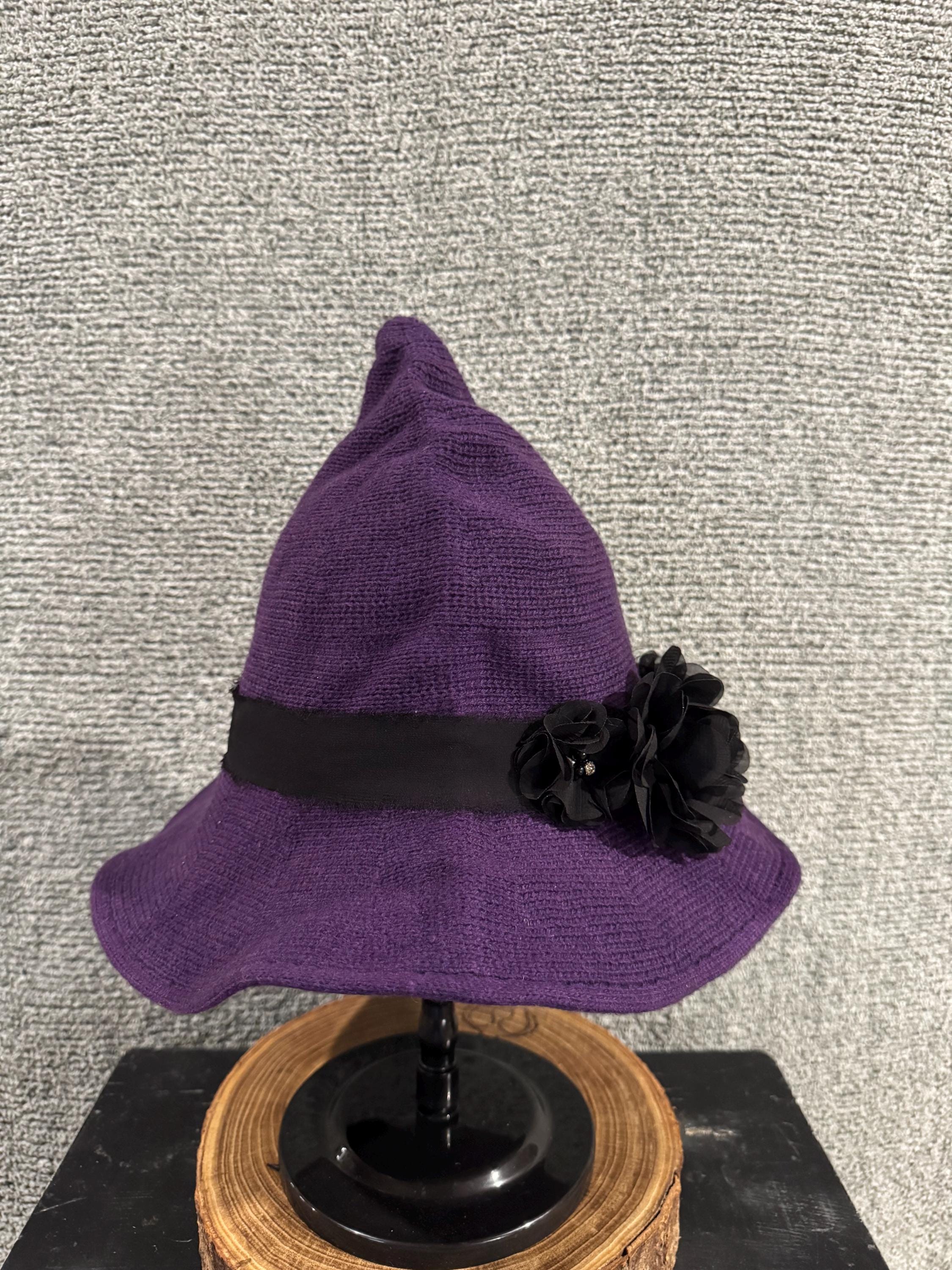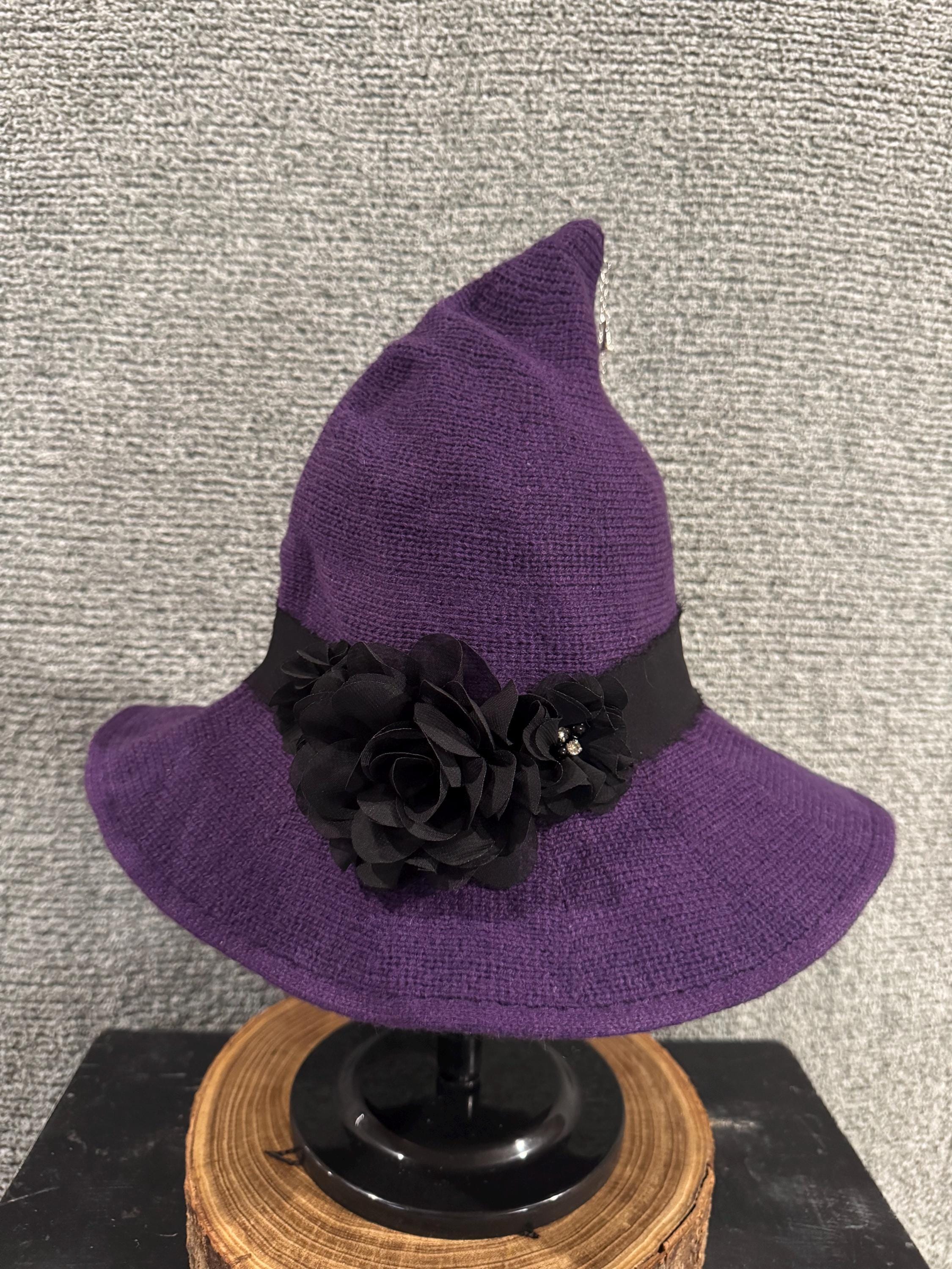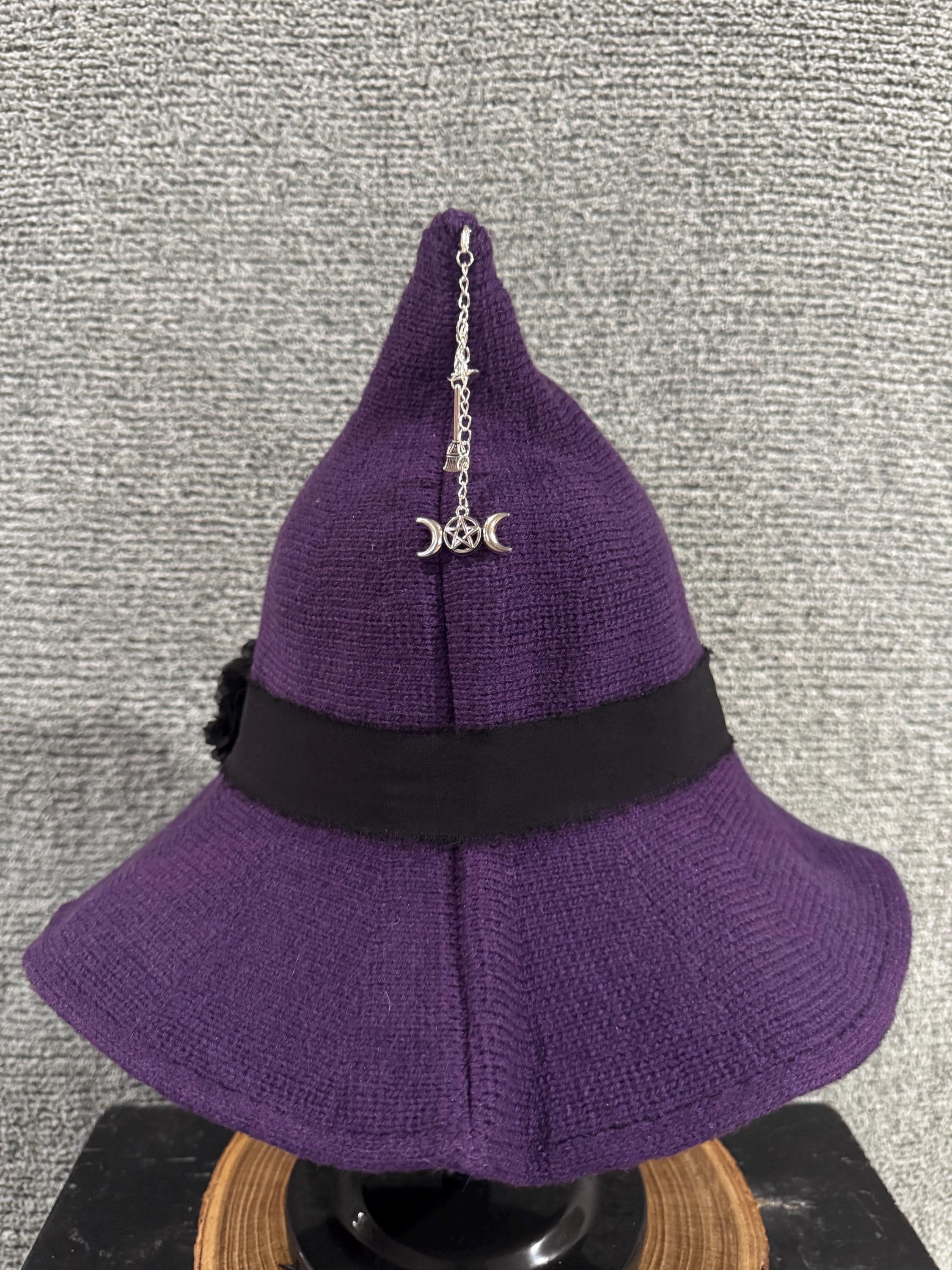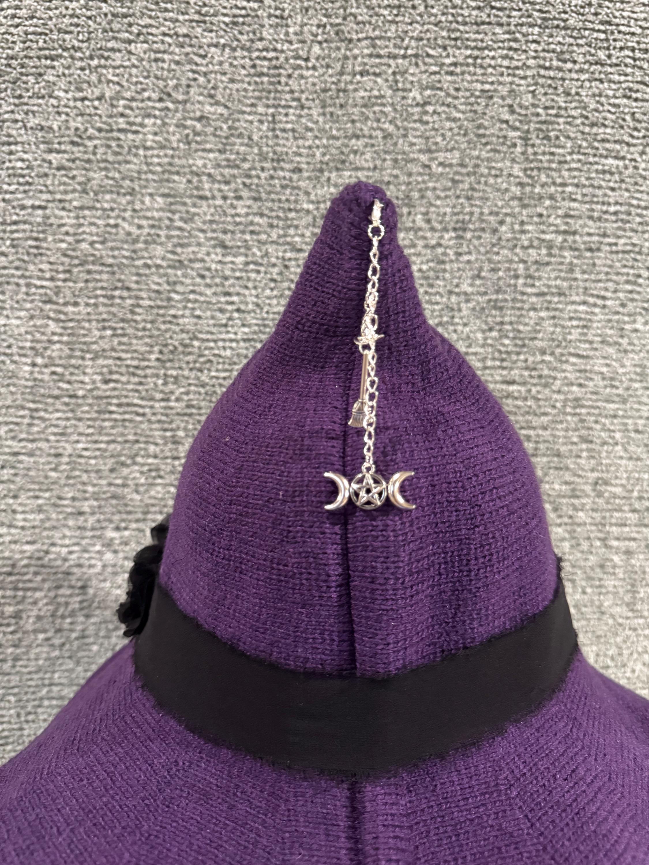 Womens Purple Wool Blend Knitted Witch Hat. Hat is wool blend knitted which is soft and elastic, breathable and lightweight. Witch hat has black chiffon ribbon going around it with 2 small black chiffon flowers and 1 large black chiffon flower on the left side. At the point in the back is a silver charm chain with 3 silver charms attached, besom, witch hat, triple moon with pentacle which is removeable, everything else is sewed on. I make 1 of a kind witch hats, some are similar but no 2 are exactly the same. Blessed Be!
