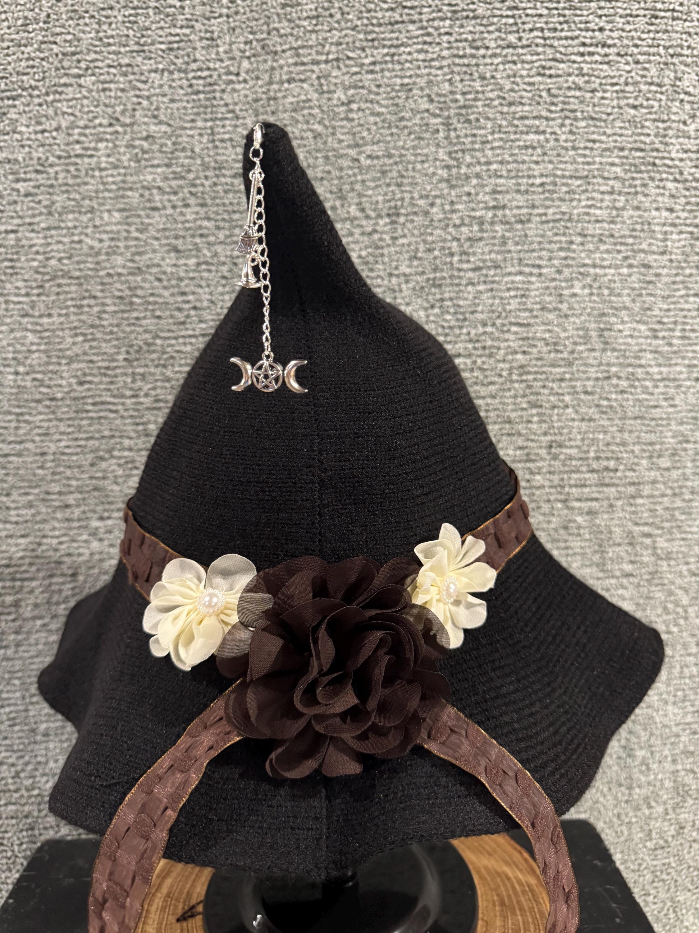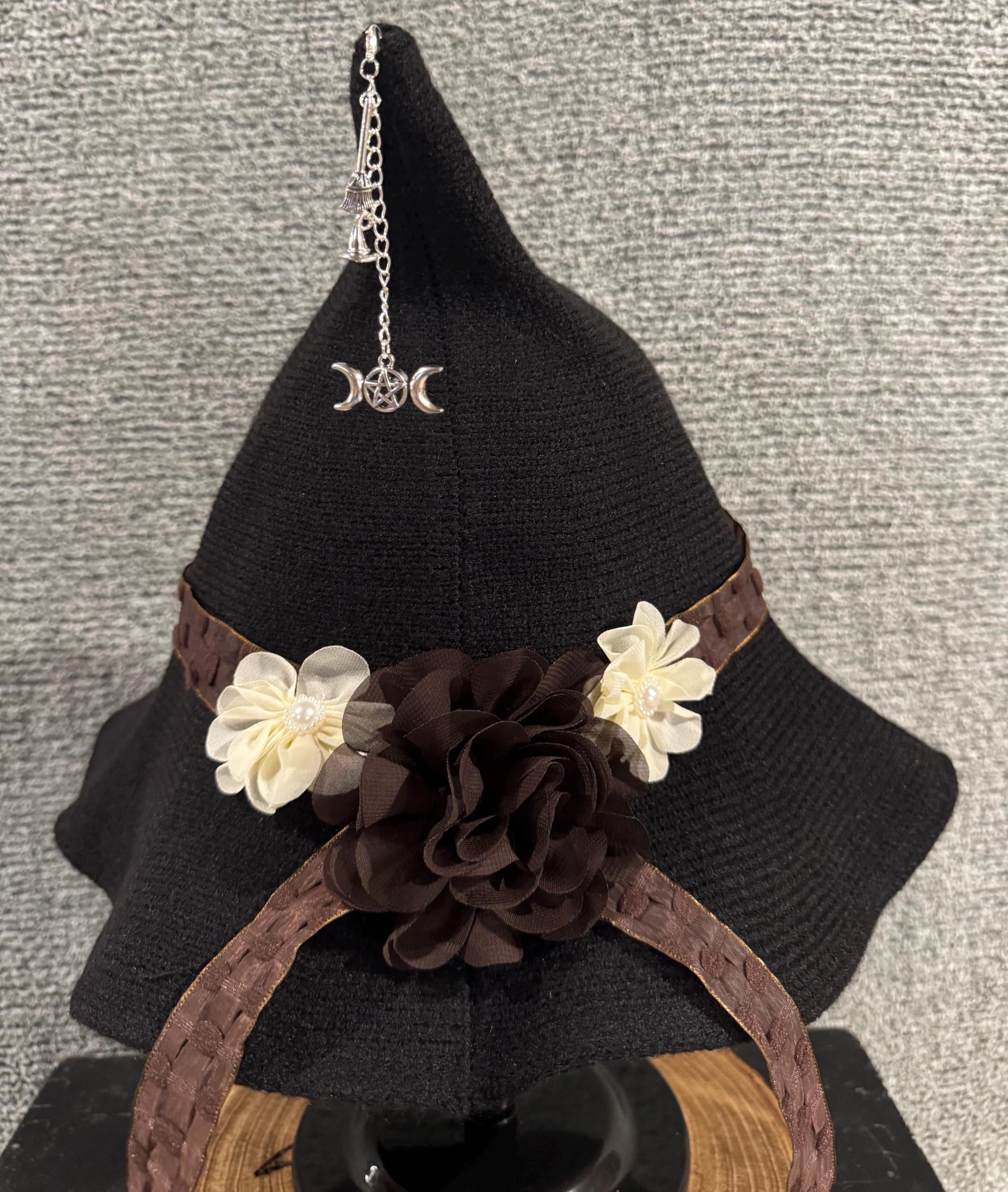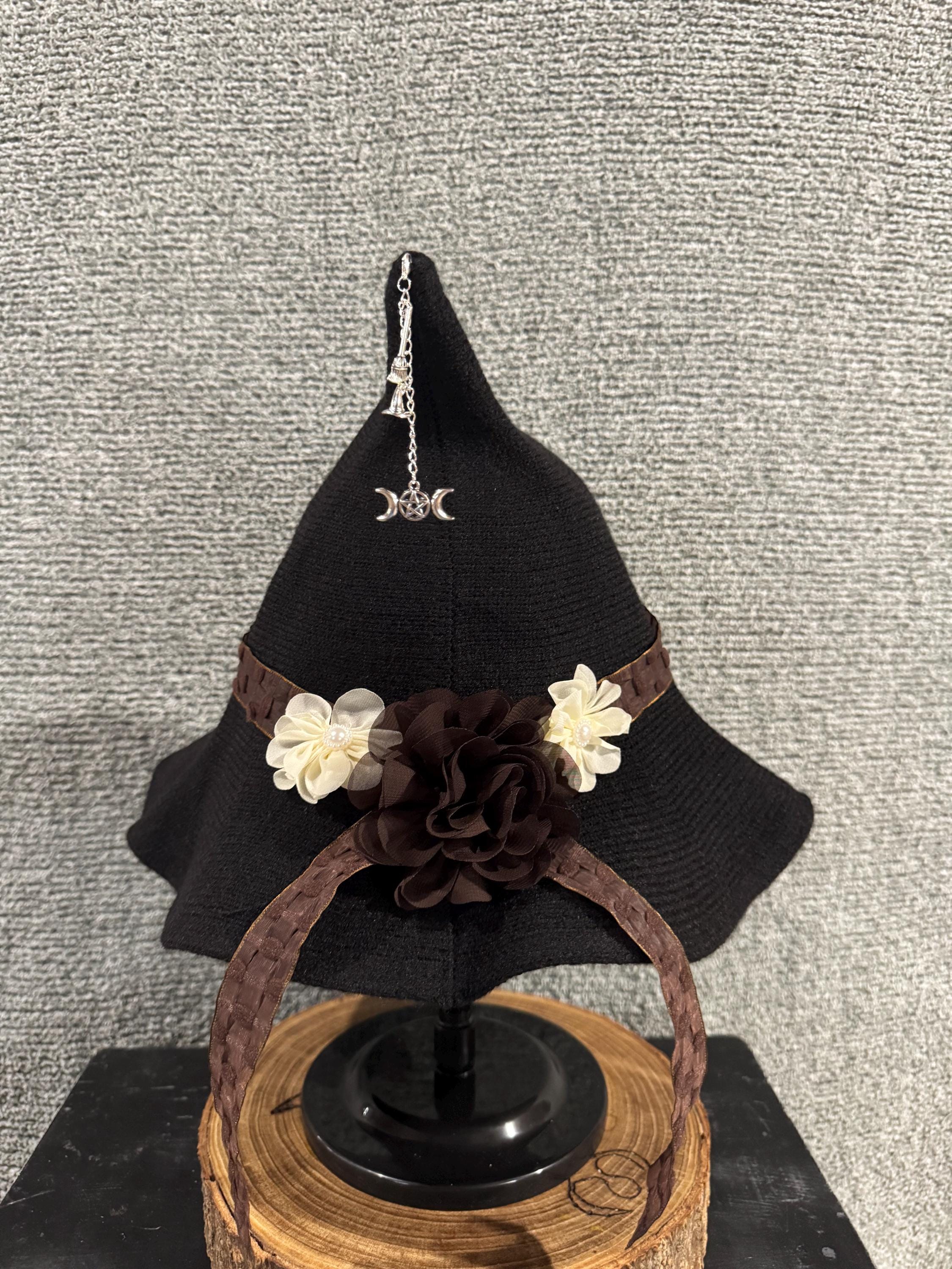 Womens Black Wool Blend Pointed Witch Hat. Witch hat is made of a wool blend, which is soft and elastic, breathable and lightweight. Hat is about 22.05"-22.83" in hat circumference. Hat has dark brown ribbon going around it with a large brown chiffon Flower in the back, with 2 small cream chiffon flowers to each side. At the point in the back is a removeable silver charm chain with 3 silver charms, besom, witch hat and triple moon with a pentacle in the middle. I make 1 of a kind witch hats, no 2 are the same some are similar but not exactly the same. Blessed Be!
