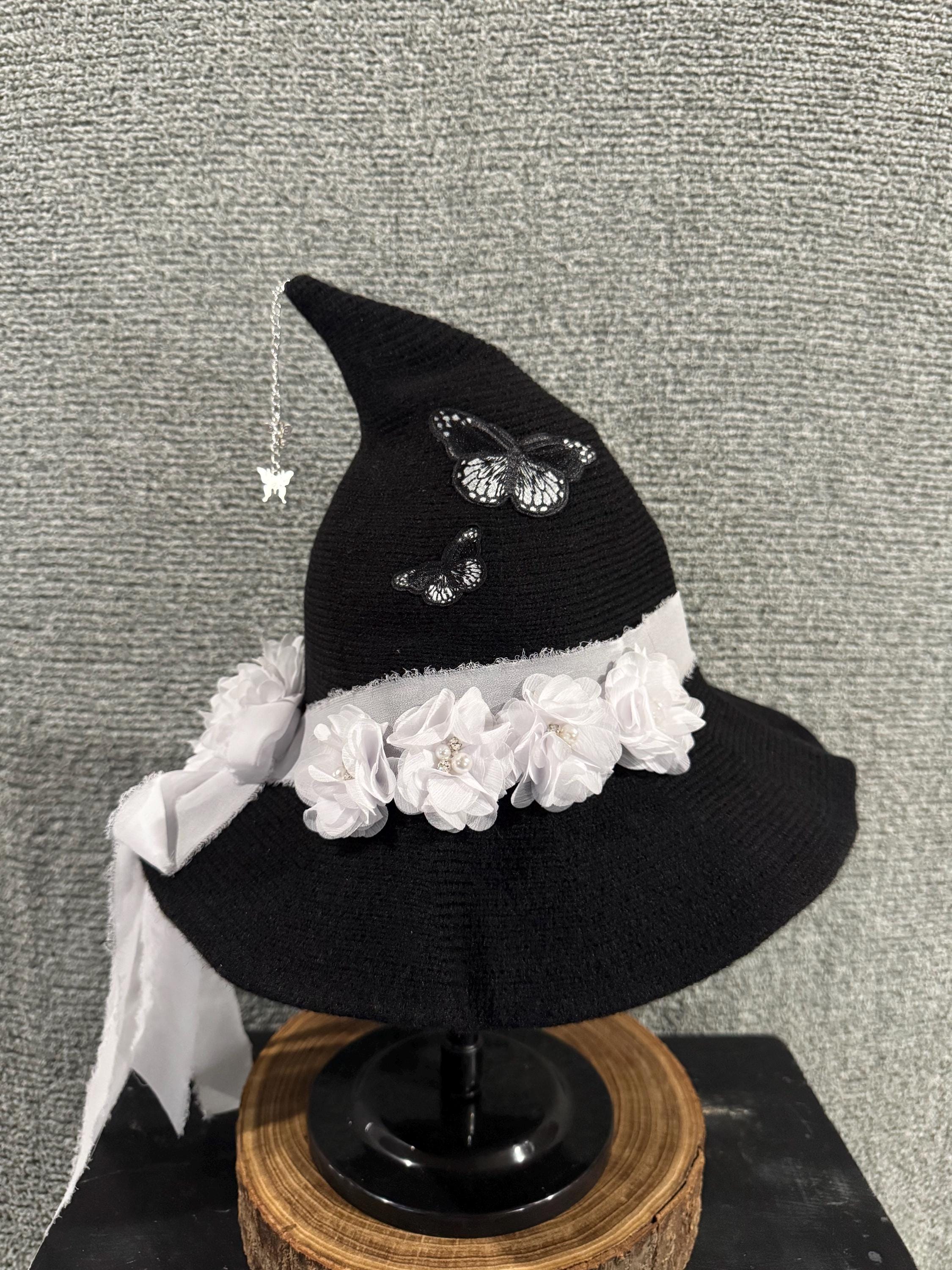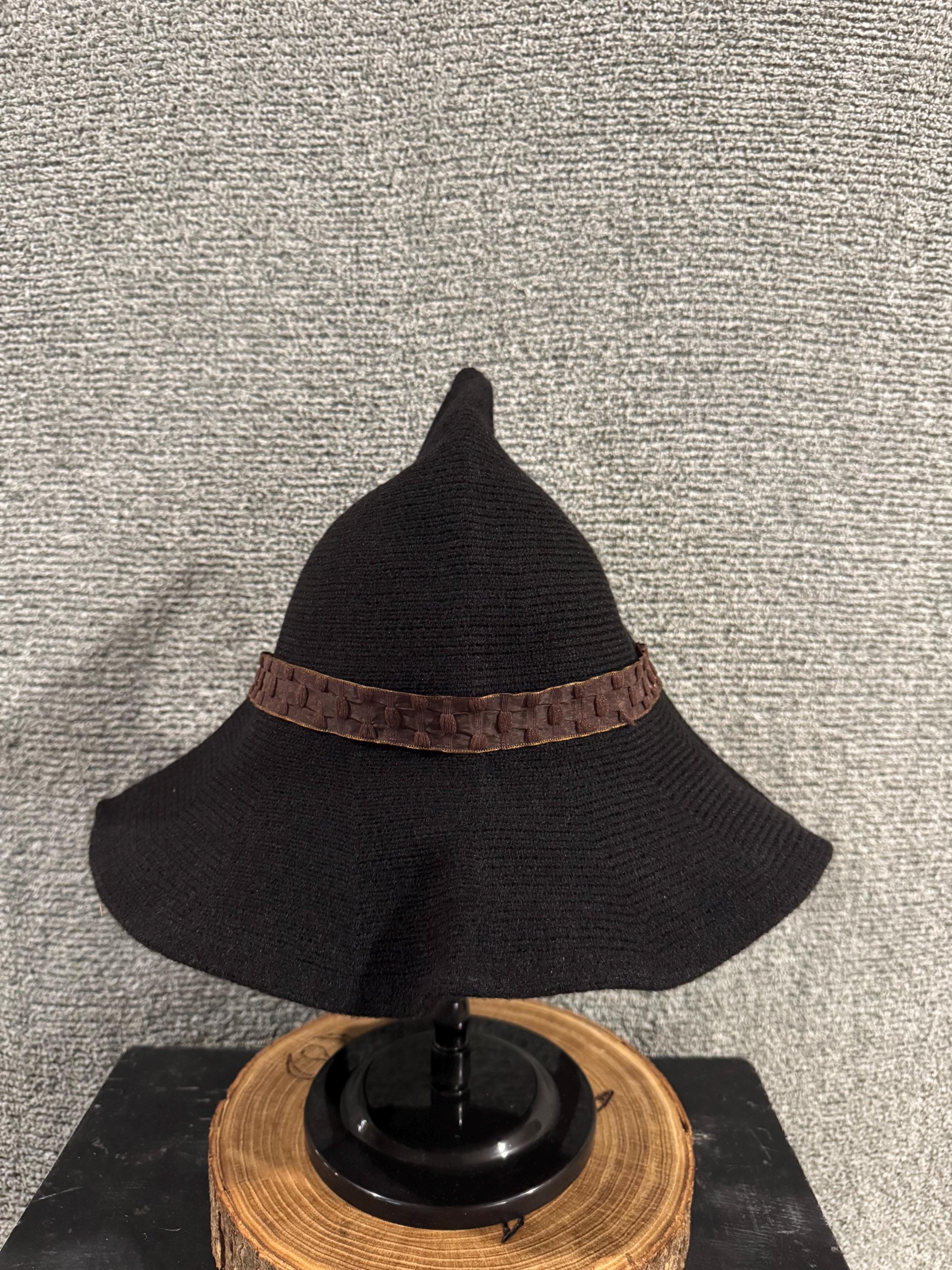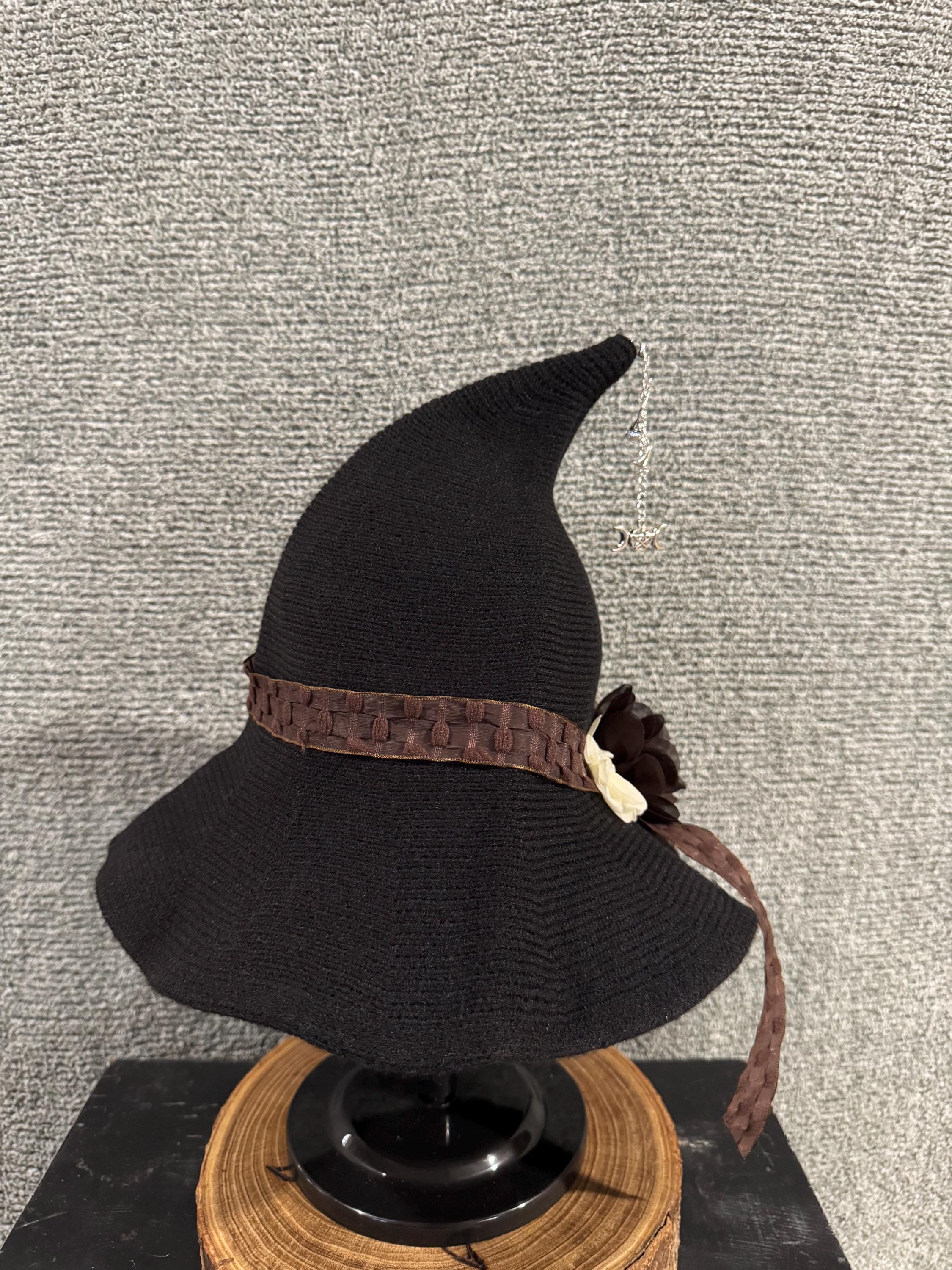Womens Black Wool Blend Pointed Witch Hat. Witch hat is made of a wool blend, which is soft and elastic, breathable and lightweight. Hat is about 22.05"-22.83" in hat circumference. Hat has dark brown ribbon going around it with a large brown chiffon Flower in the back, with 2 small cream chiffon flowers to each side. At the point in the back is a removeable silver charm chain with 3 silver charms, besom, witch hat and triple moon with a pentacle in the middle. I make 1 of a kind witch hats, no 2 are the same some are similar but not exactly the same. Blessed Be!