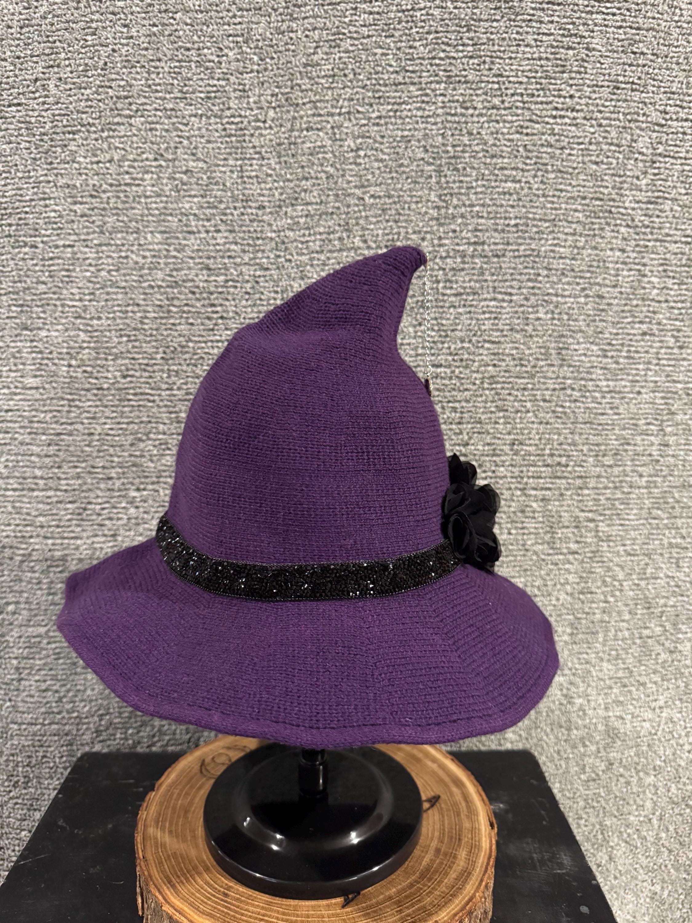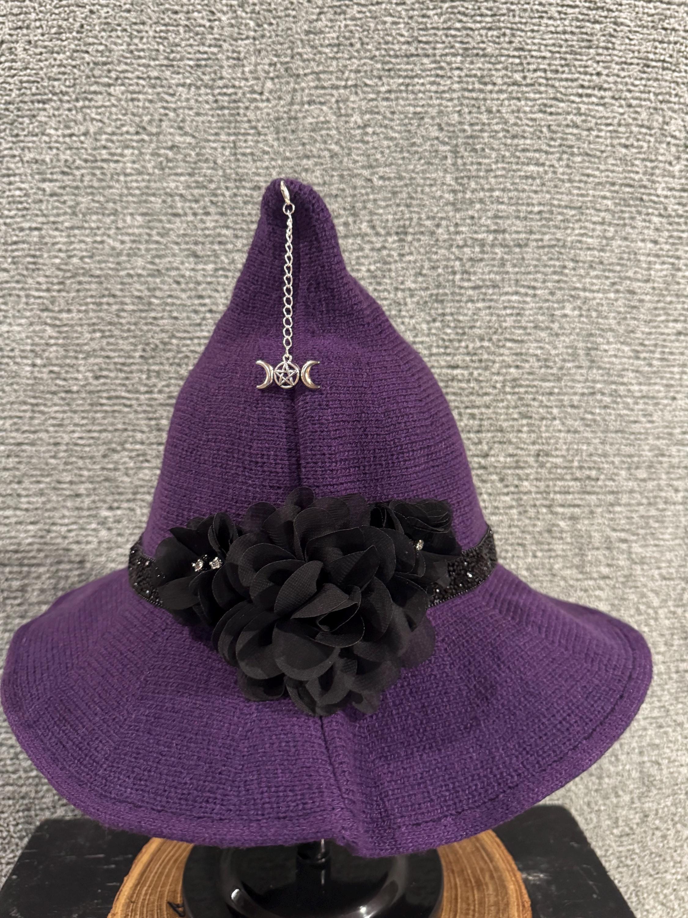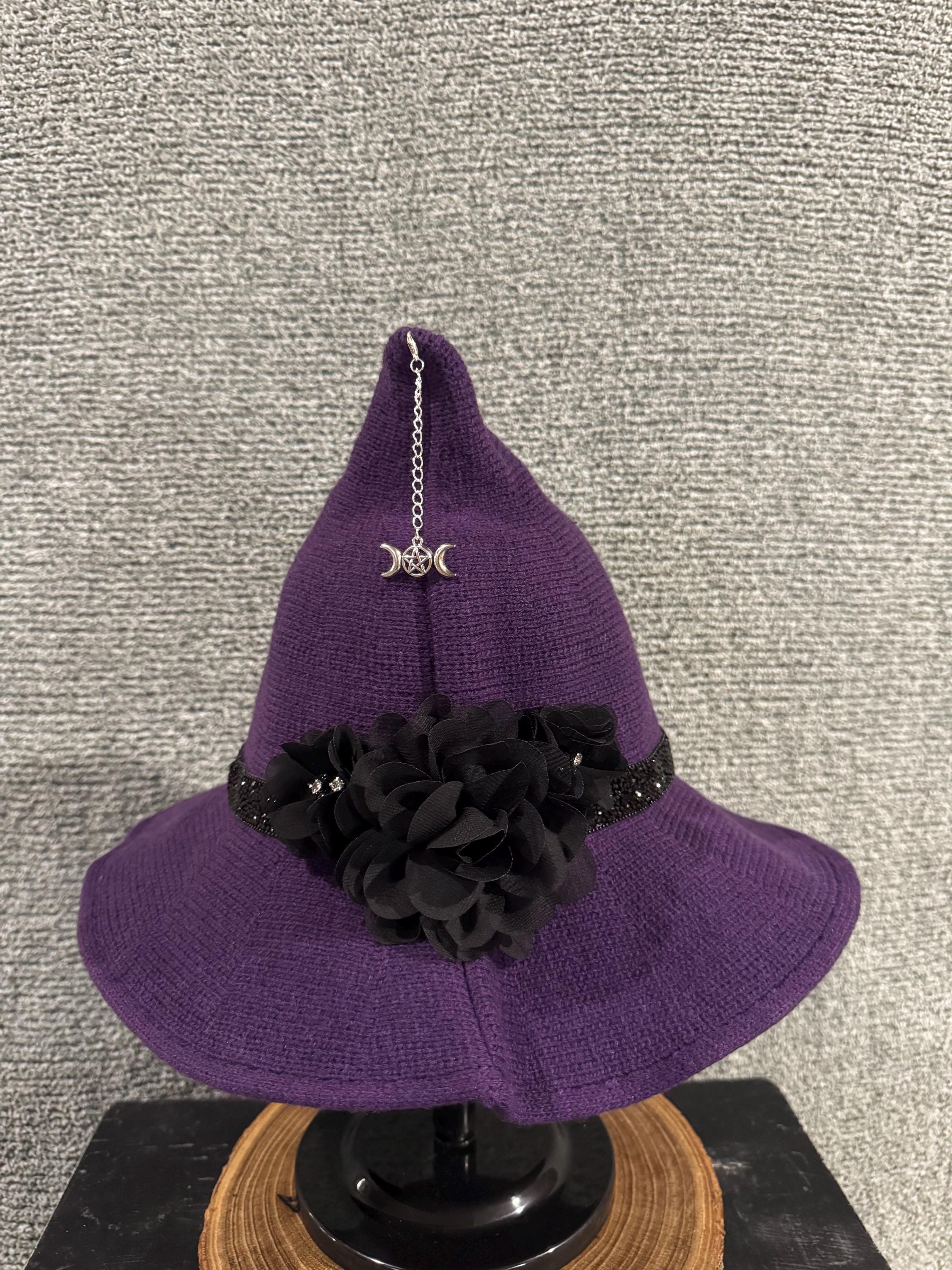Womens Purple Wool Blend Pointed Witch Hat. Hat is made of a wool blend, which is soft and elastic, breathable and lightweight. Hat measures approximately 22.05-22.83". Hat has black rhinestone trim going around the hat and a large chiffon flower in the middle of the back and 2 small chiffon flowers to each side of the large flower. Hat has a small silver removeable charm chain that has a triple moon pentacle at the end. Everything is sewed on. I make 1 of kind no 2 are exactly the same. Blessed Be.
