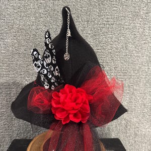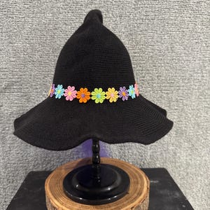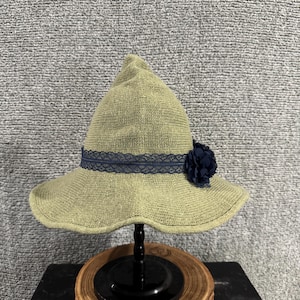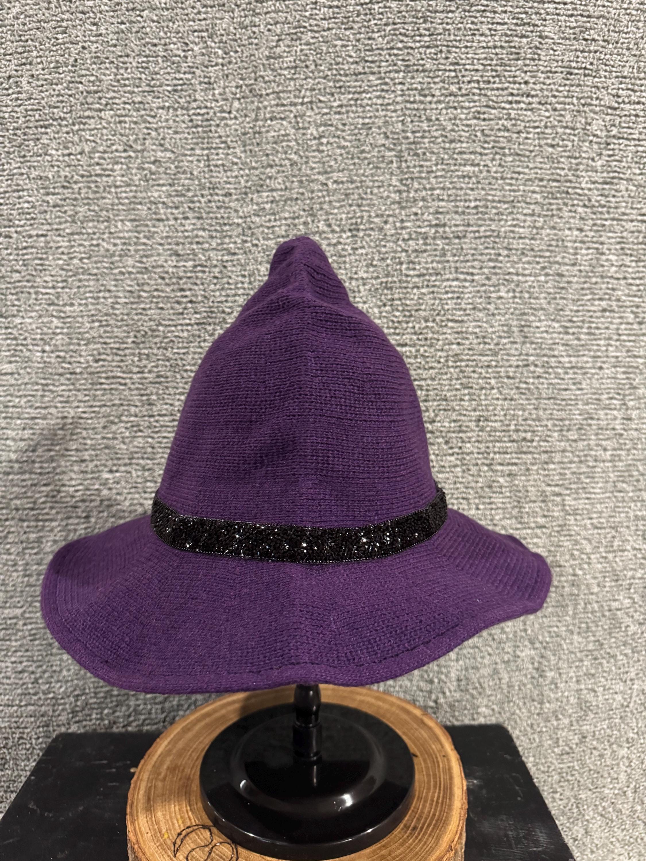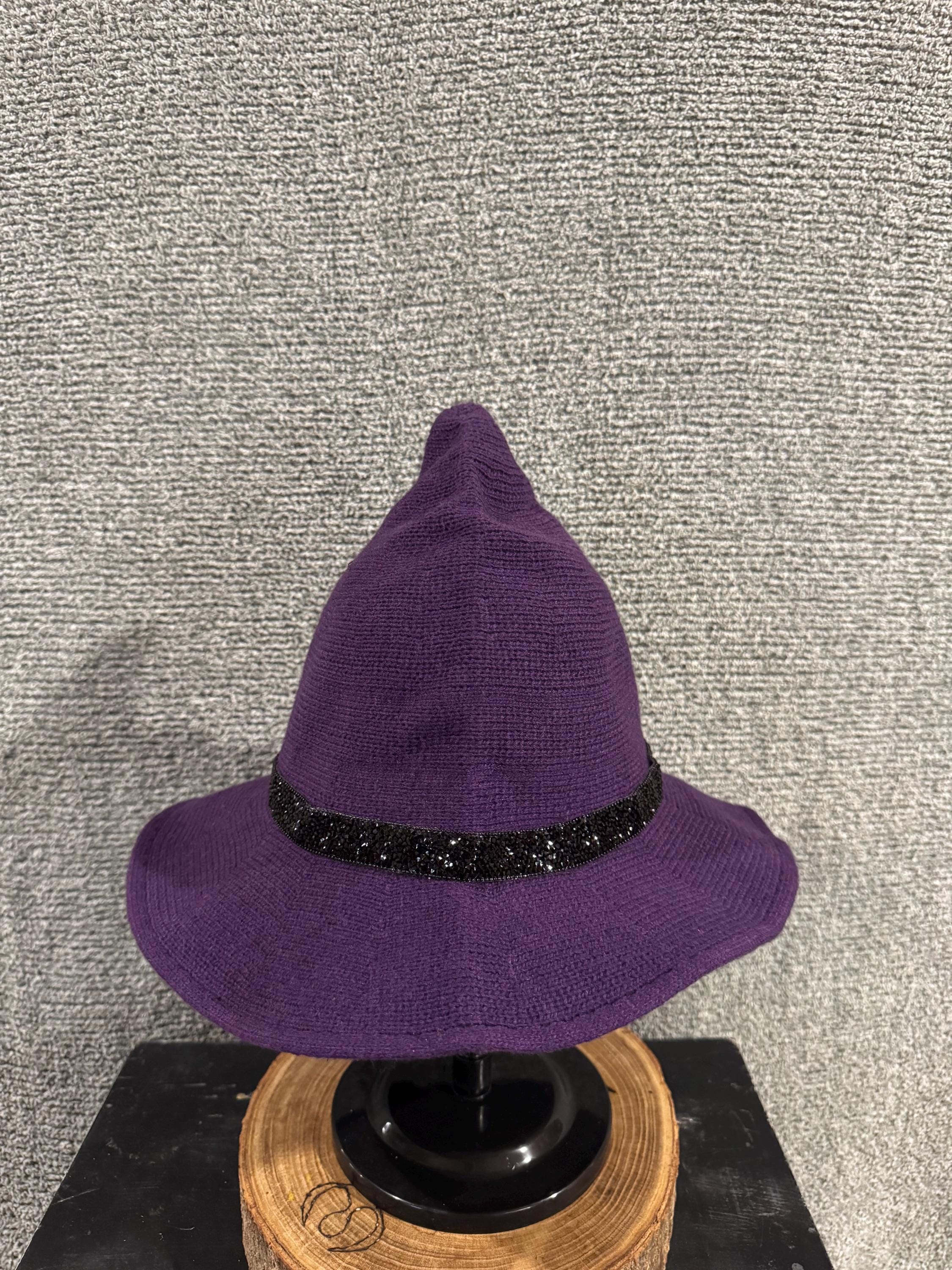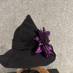 Womens Purple Wool Blend Pointed Witch Hat. Hat is made of a wool blend, which is soft and elastic, breathable and lightweight. Hat measures approximately 22.05-22.83". Hat has black rhinestone trim going around the hat and a large chiffon flower in the middle of the back and 2 small chiffon flowers to each side of the large flower. Hat has a small silver removeable charm chain that has a triple moon pentacle at the end. Everything is sewed on. I make 1 of kind no 2 are exactly the same. Blessed Be.
