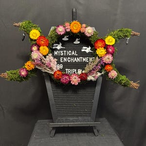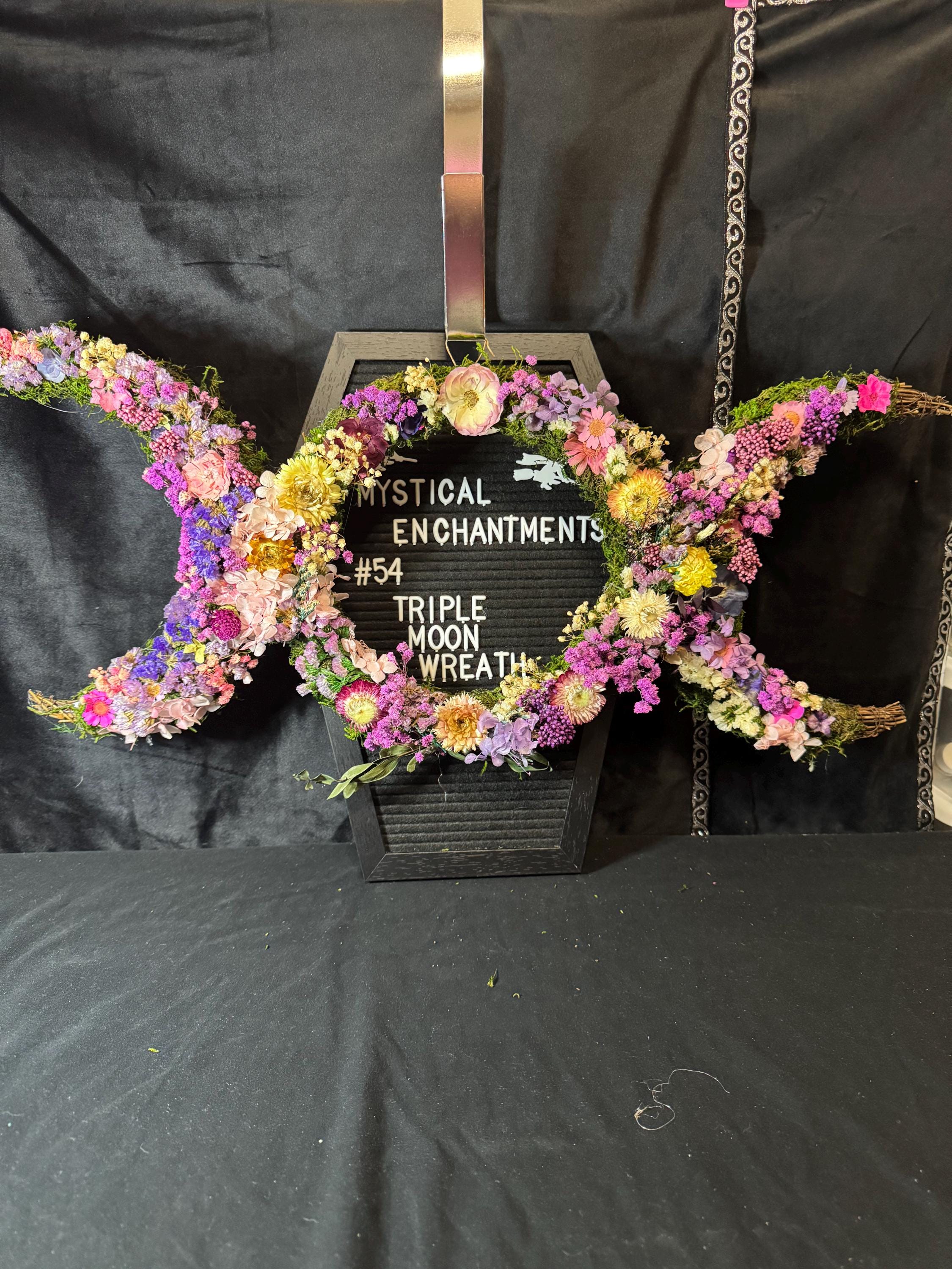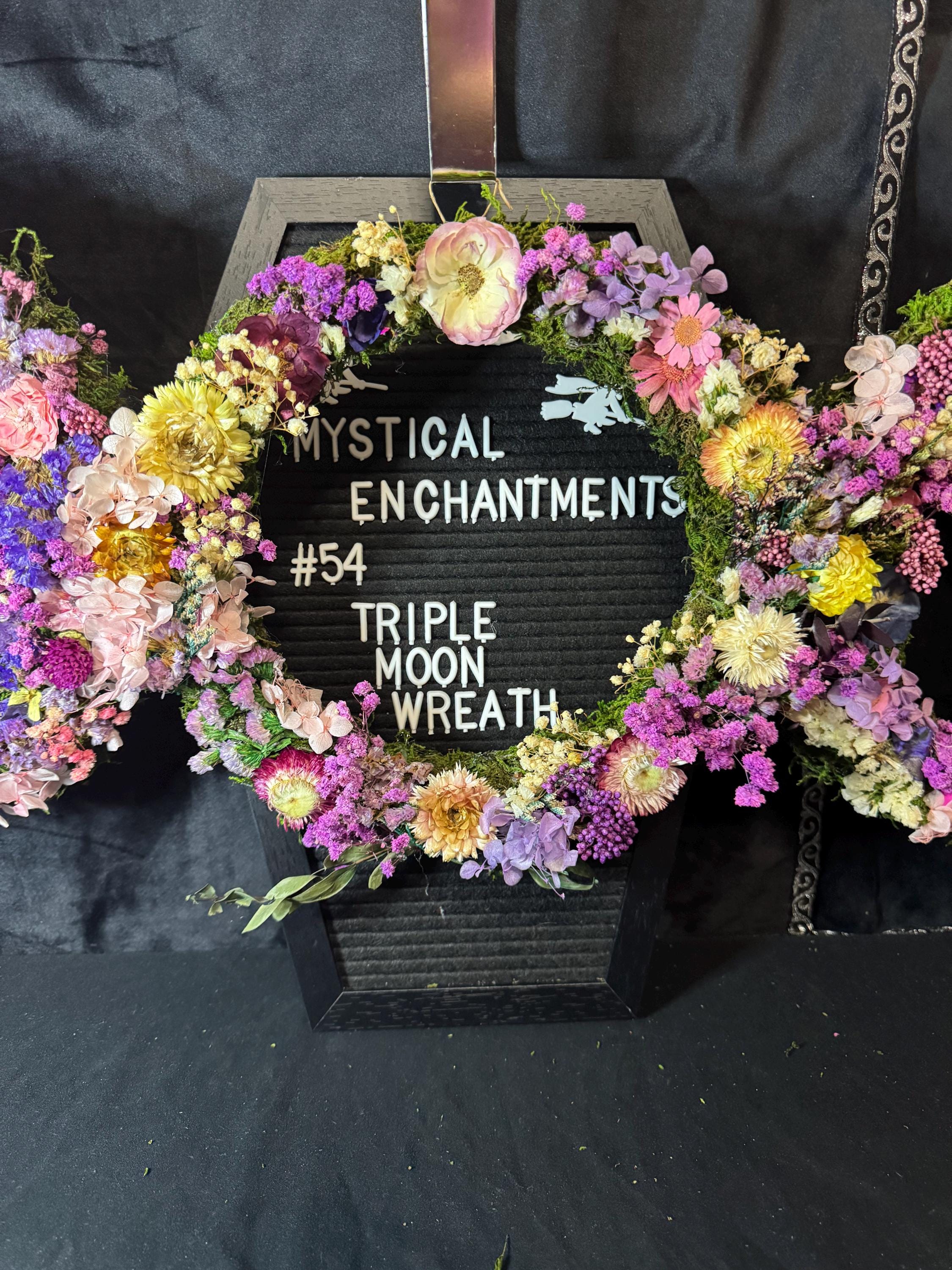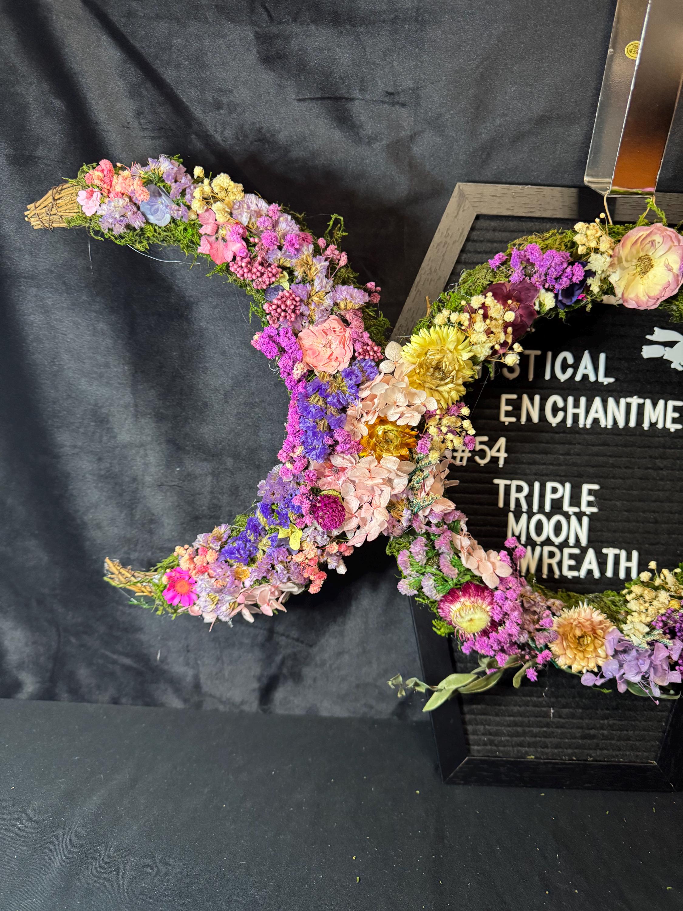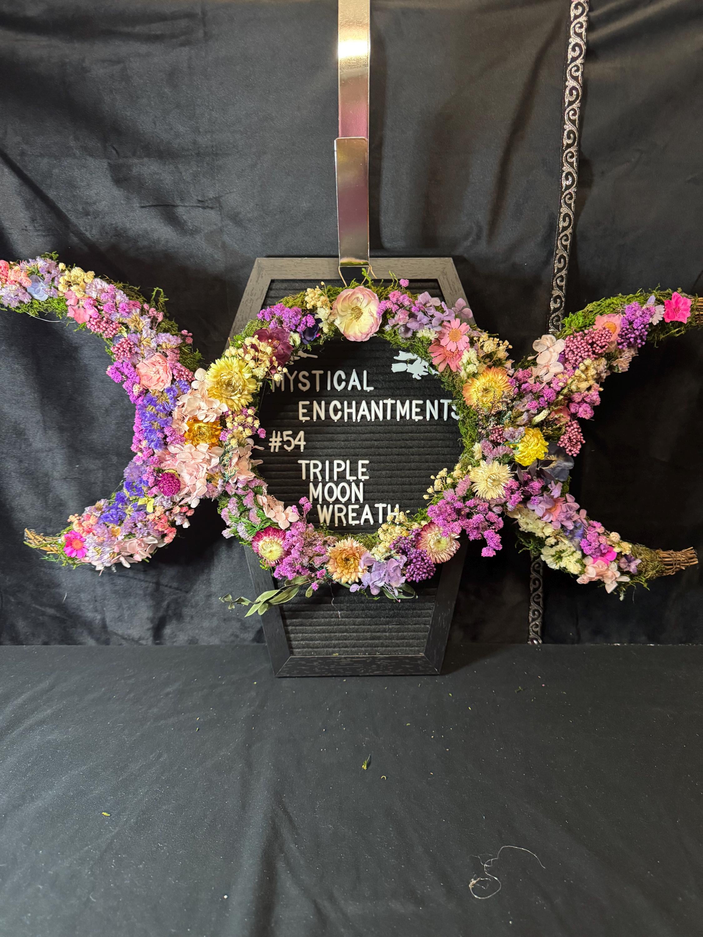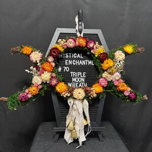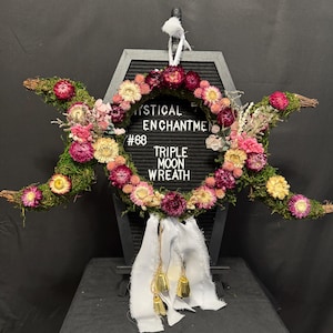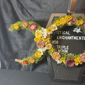 Triple Moon Wreath made with real preserved dried flowers. Wreath measures 27" long, the half moon is 11" tall, and the full moon is 10". The triple moon symbol represents the Triple Moon Goddess and the eternal cycle of birth, life, and death, commonly found in Wiccan and Pagan traditions. It symbolizes the three phases of womanhood-the Maiden (youth), the Mother (fertility), and the Crone (wisdom). I make one of a kind wreaths all made with the best intentions! Blessed Be!