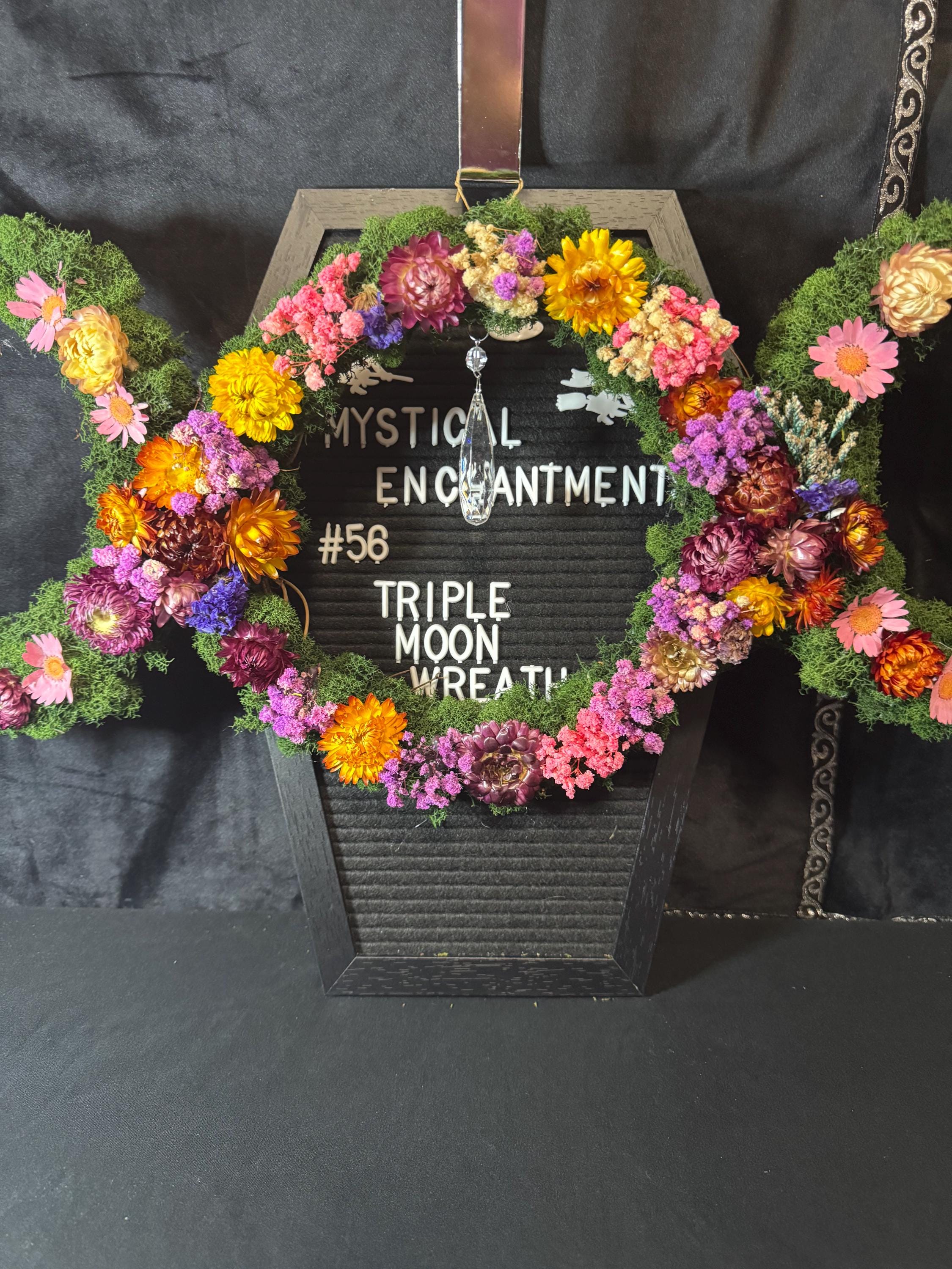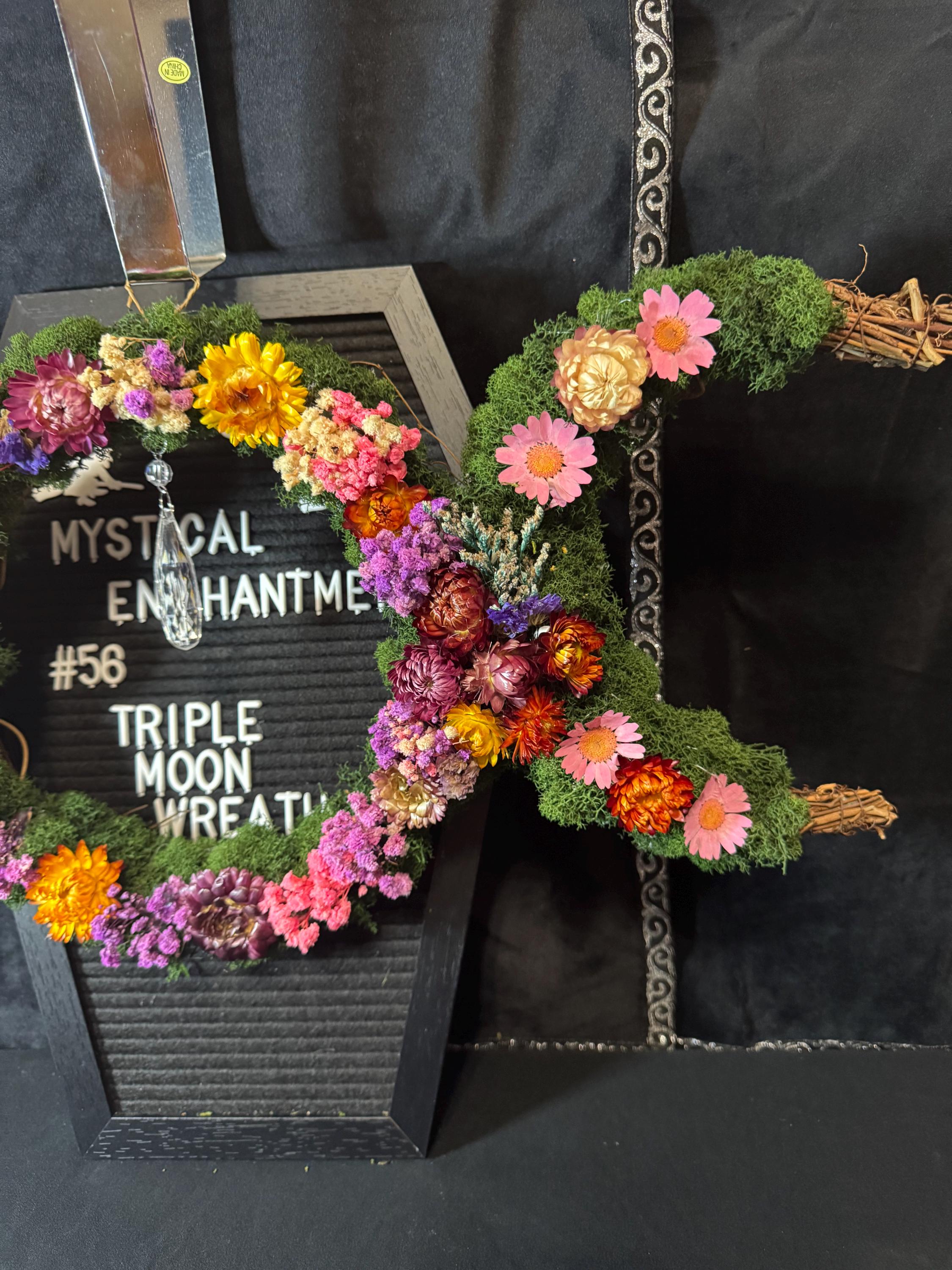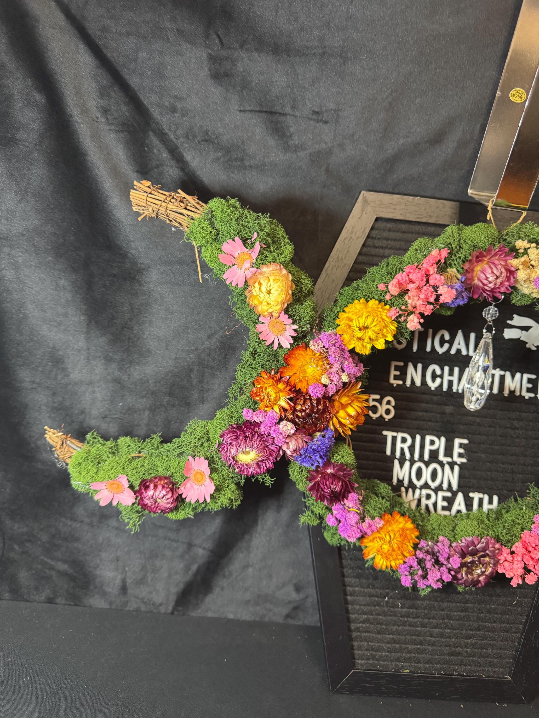 Triple Moon Wreath. Grapevine wreath made with real moss and dried flowers that has been preserved. The triple moon wreath symbol represents the Triple Goddess and the eternal cycle of birth, life, and death, commonly found in Wiccan and Pagan traditions. It symbolizes the three phases of womanhood-the Maiden (youth), the Mother (fertility), and the Crone (wisdom)--each corresponding to a different phase of the moon's cycle: the waxing moon, the full moon, and the waning crescent, respectively. The wreath measures 27" long, measures 11" from top to bottom of the half moons and the full moon is a 10" wreath. Blessed Be!