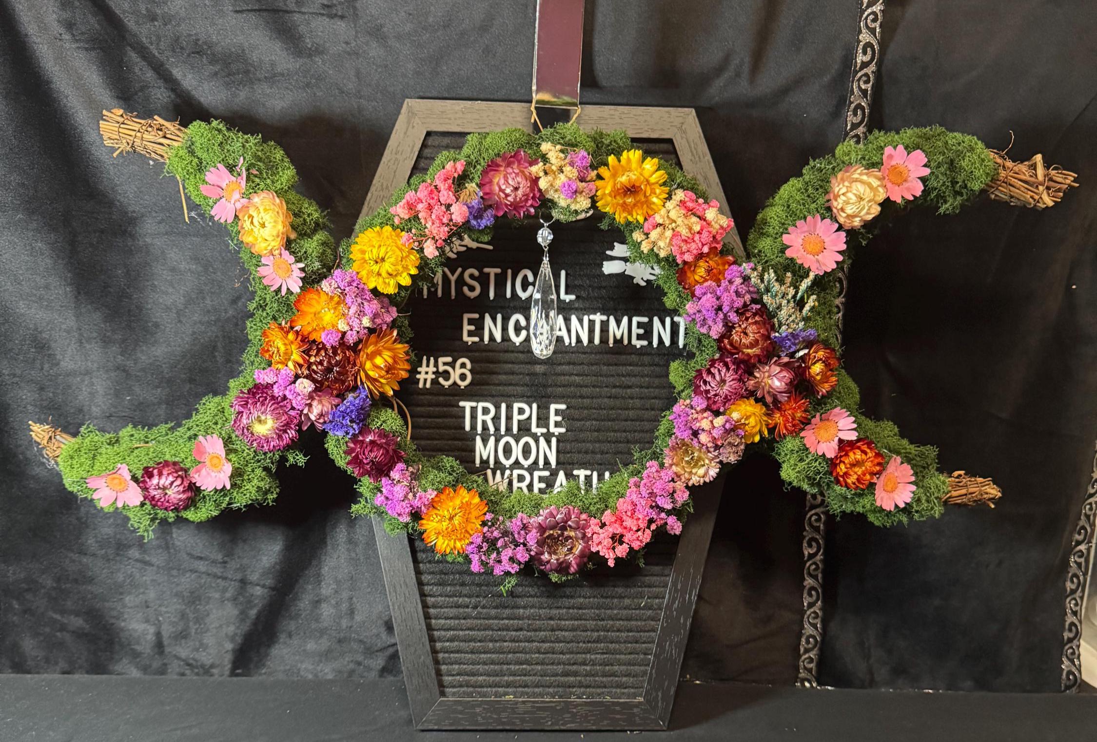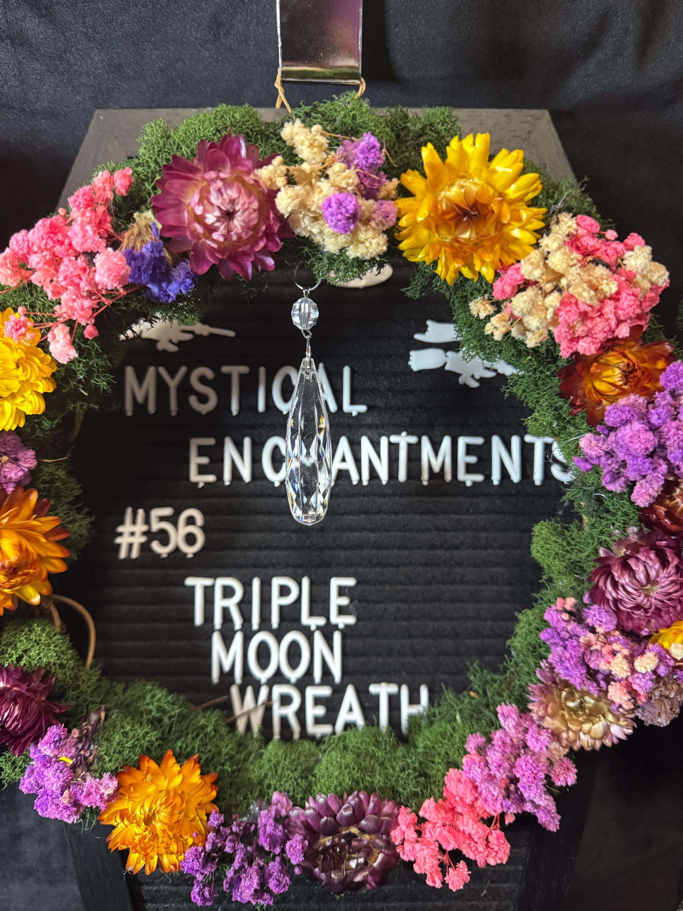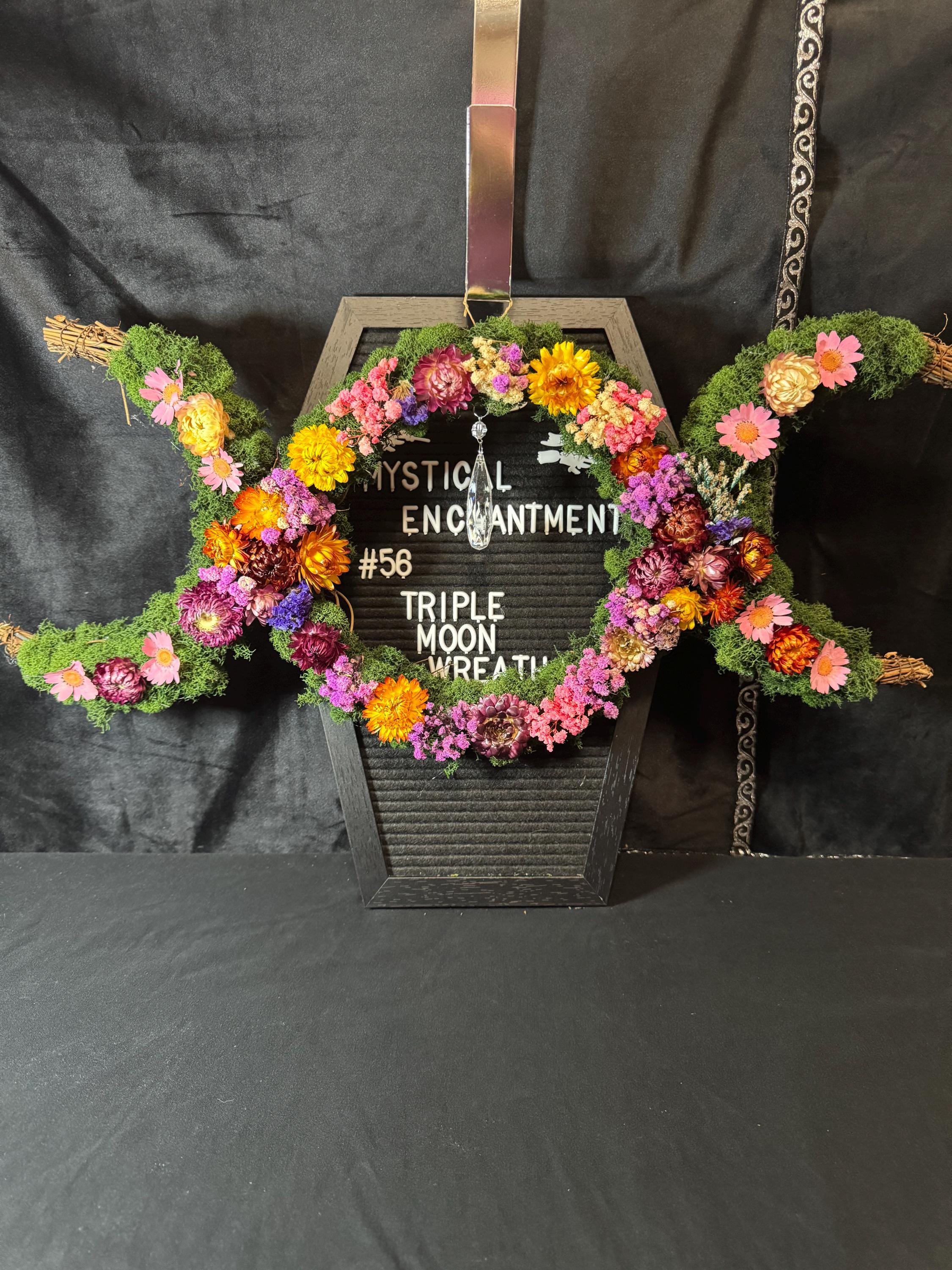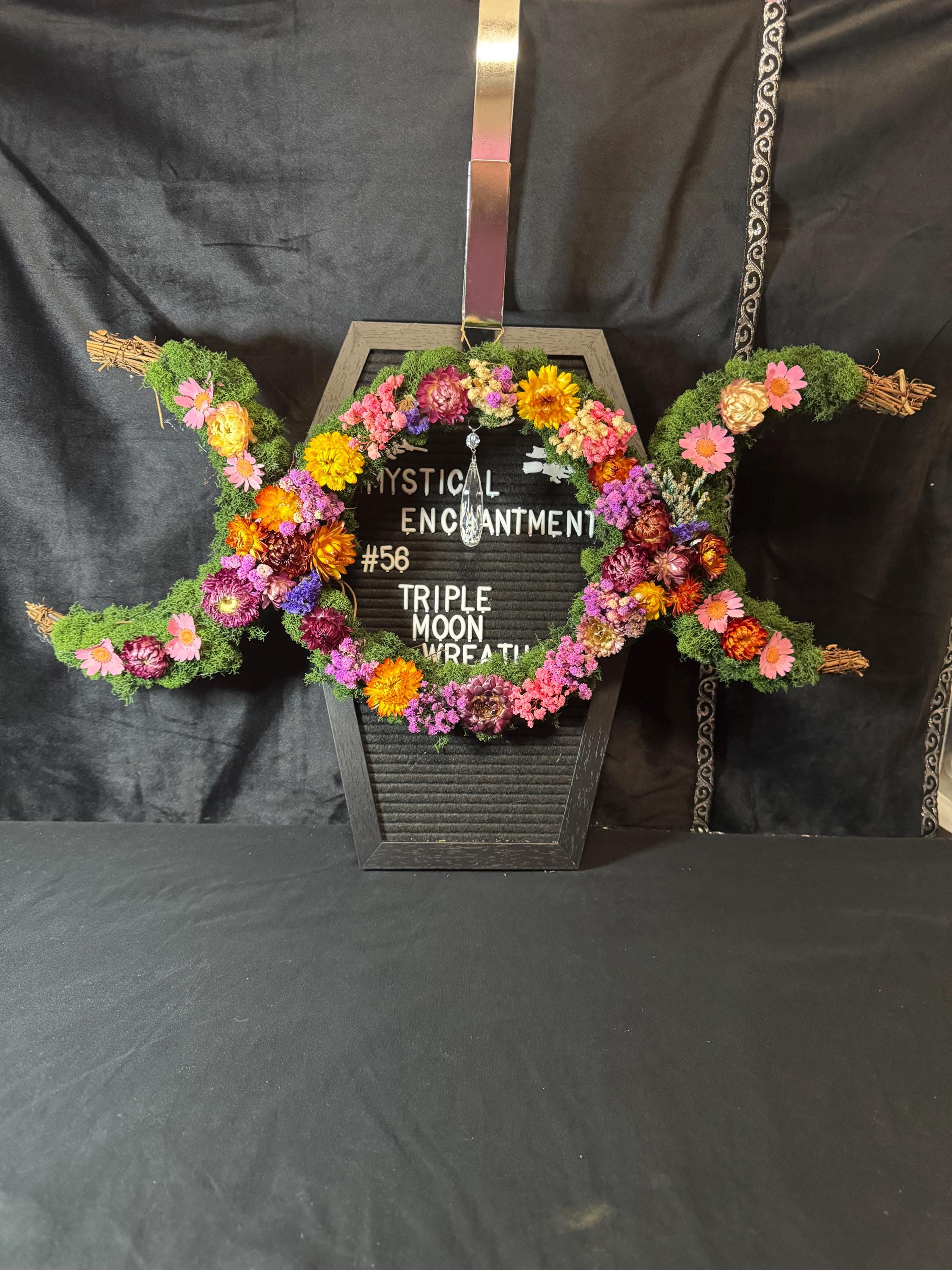 Triple Moon Wreath. Grapevine wreath made with real moss and dried flowers that has been preserved. The triple moon wreath symbol represents the Triple Goddess and the eternal cycle of birth, life, and death, commonly found in Wiccan and Pagan traditions. It symbolizes the three phases of womanhood-the Maiden (youth), the Mother (fertility), and the Crone (wisdom)--each corresponding to a different phase of the moon's cycle: the waxing moon, the full moon, and the waning crescent, respectively. The wreath measures 27" long, measures 11" from top to bottom of the half moons and the full moon is a 10" wreath. Blessed Be!