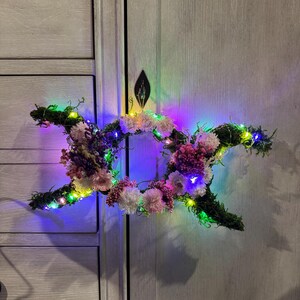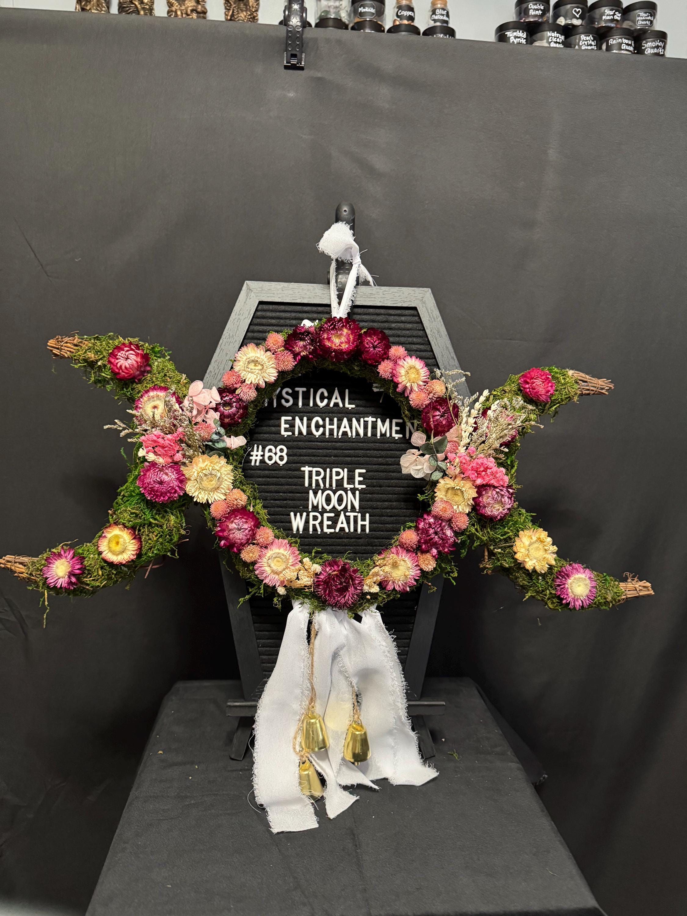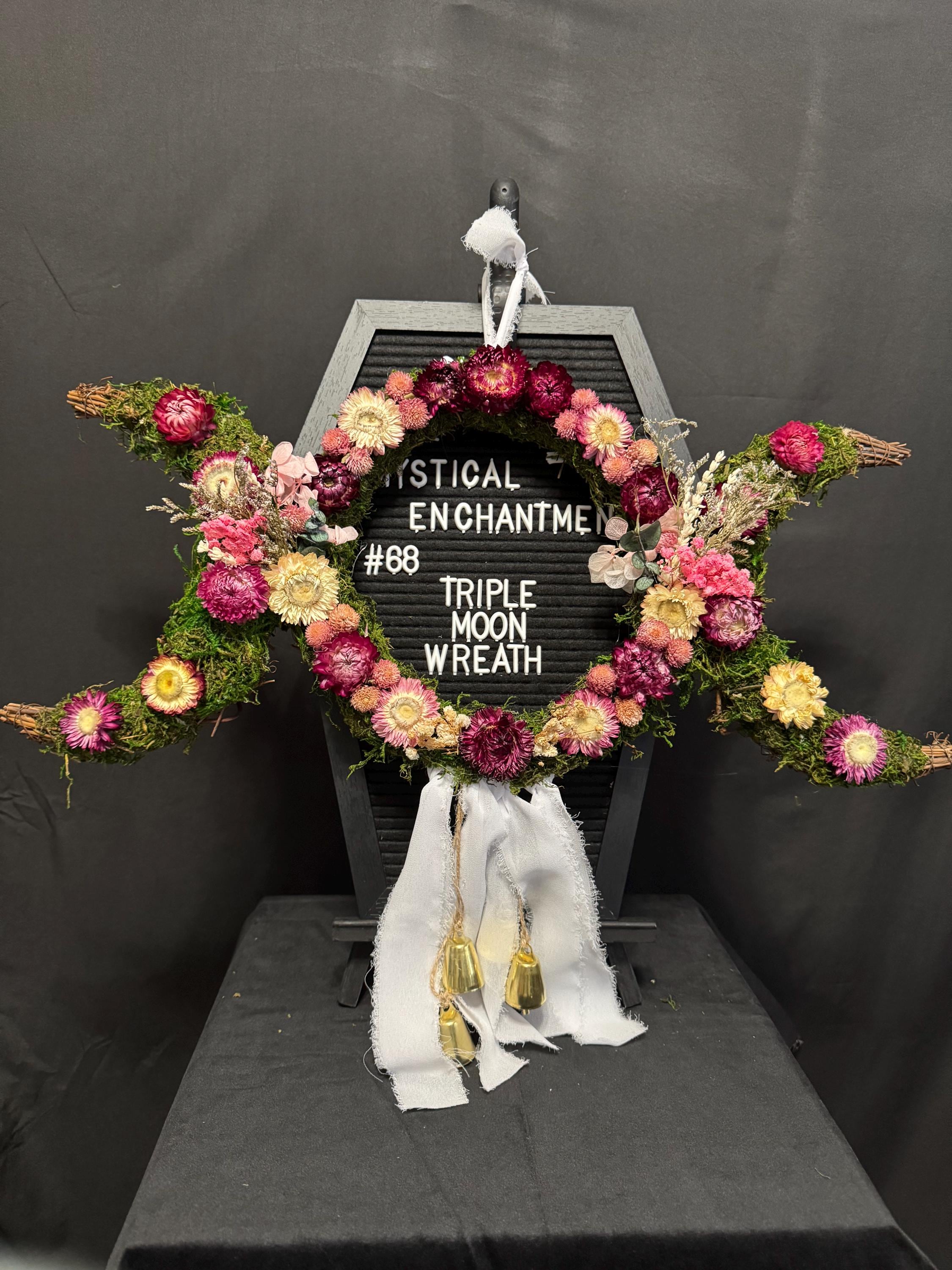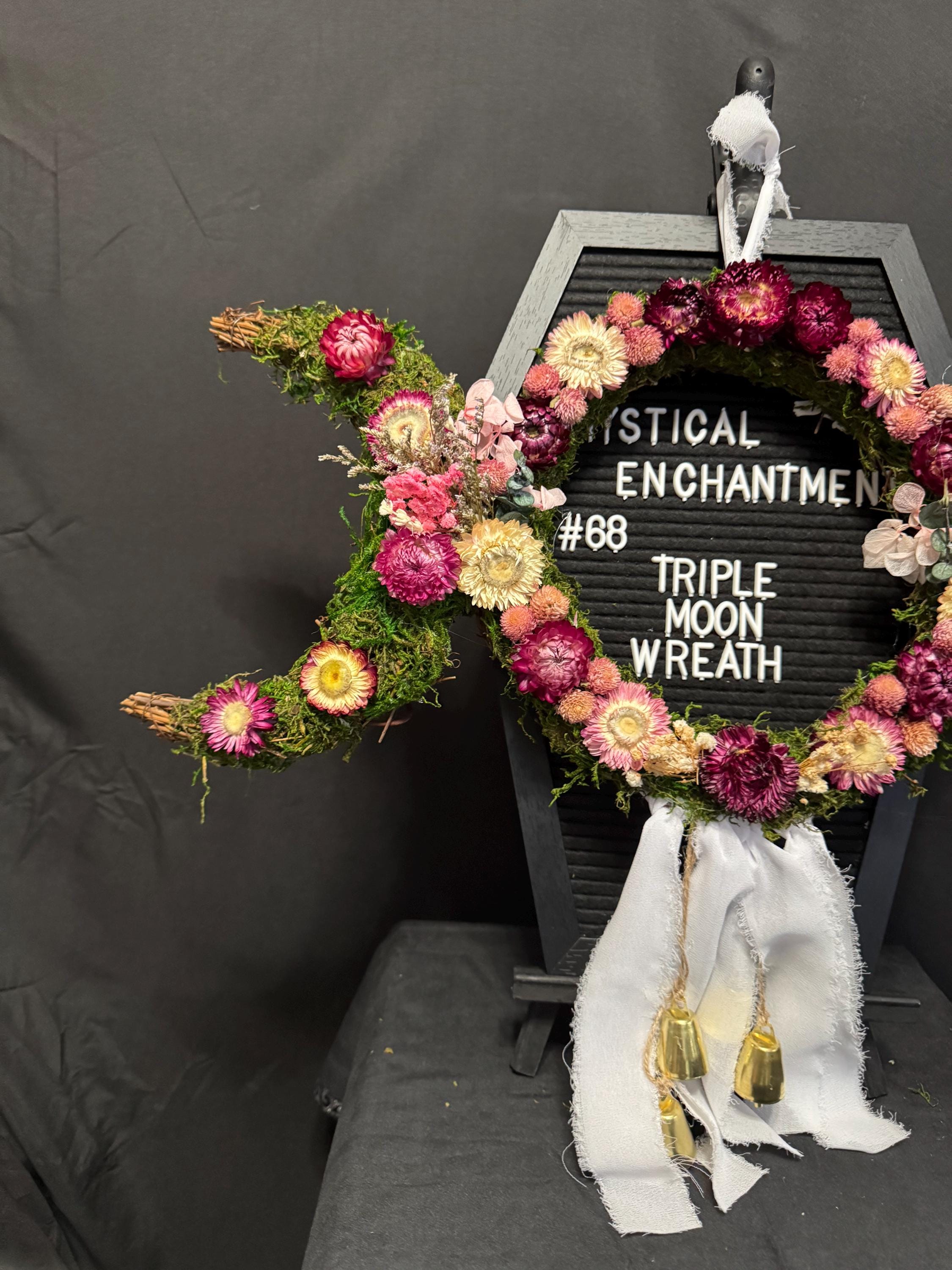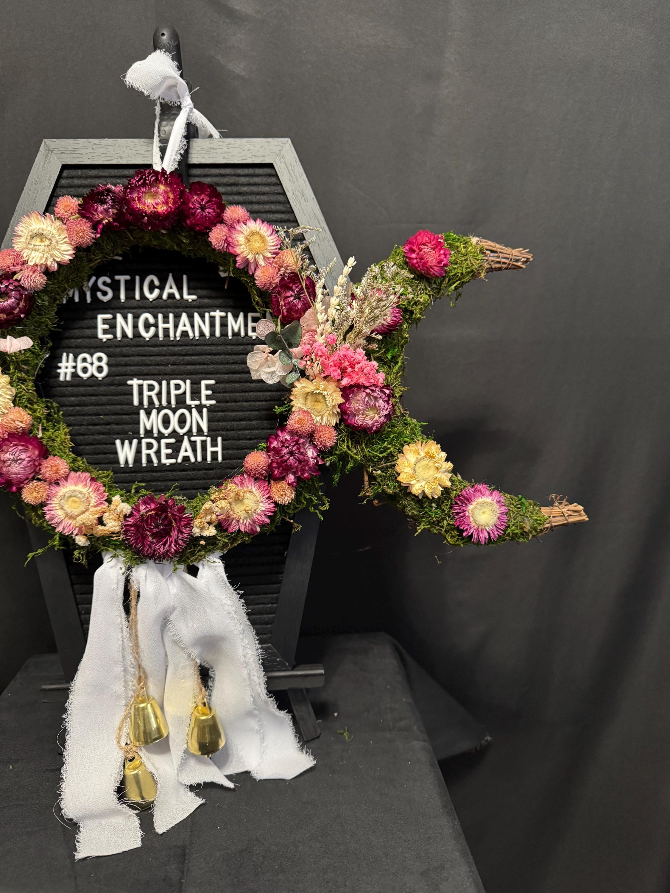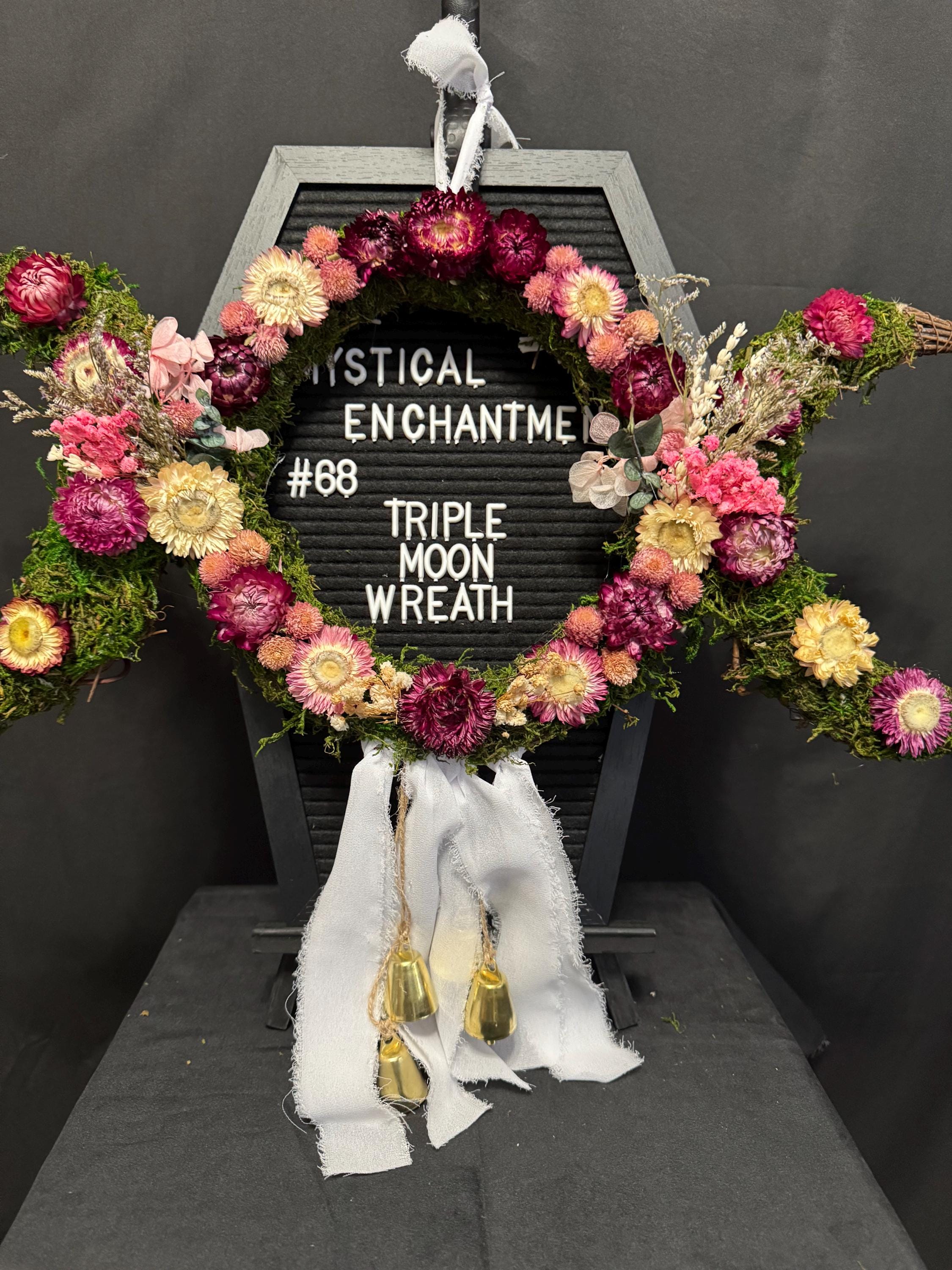 Triple Moon Grapevine Wreath made with green moss and real dried preserved flowers, and 4 gold witch bells. The triple moon symbol represents the Triple Goddess and the eternal cycle of birth, life, and death, commonly found in Wiccan and Pagan traditions. It symbolizes the three phases of womanhood-the Maiden (youth), the Mother (fertility), and the Crone (wisdom) - each corresponding to a different phase of the moon's cycle: the waxing crescent, the full moon, and the waning crescent, respectively. Blessed Be!