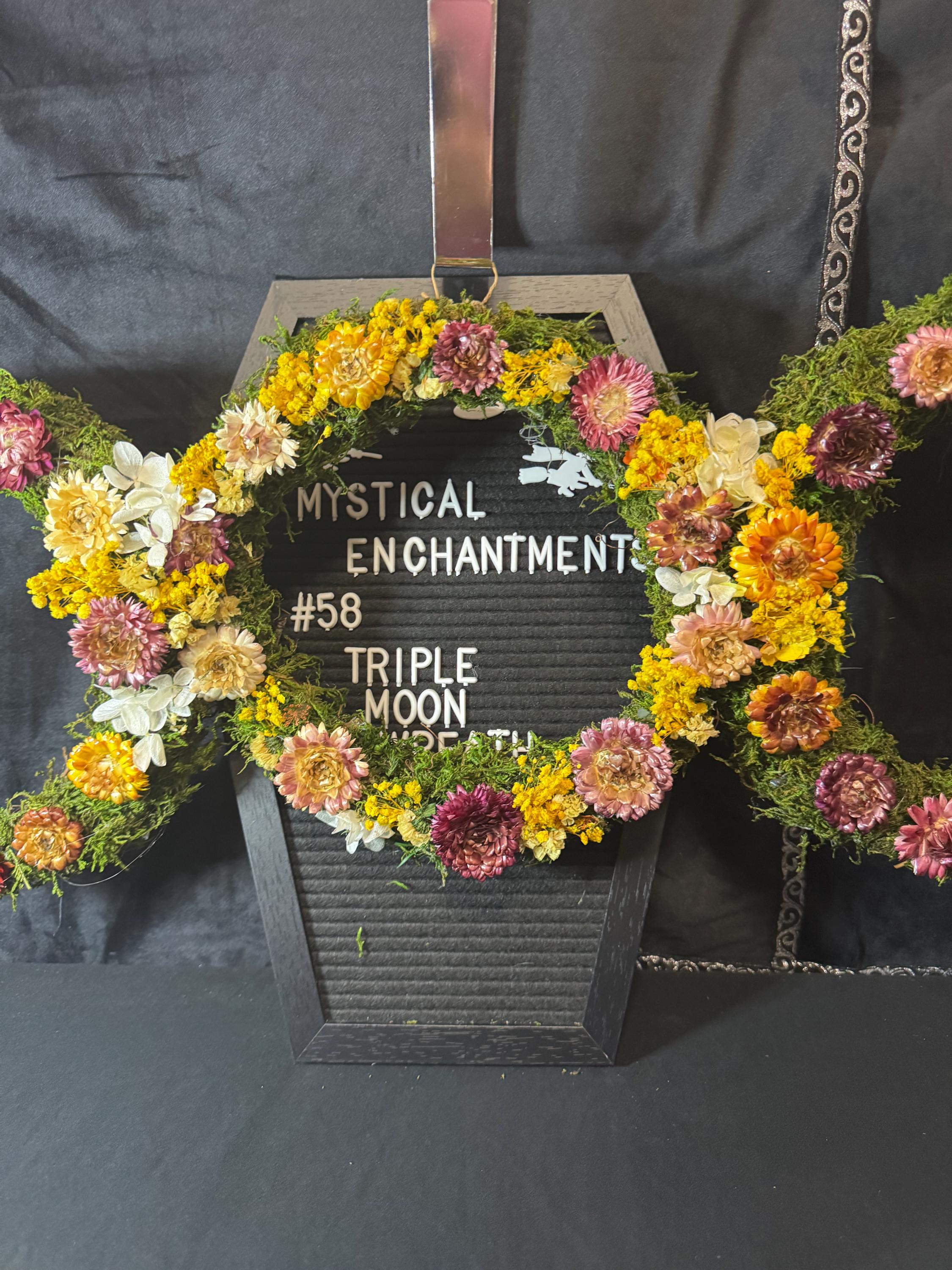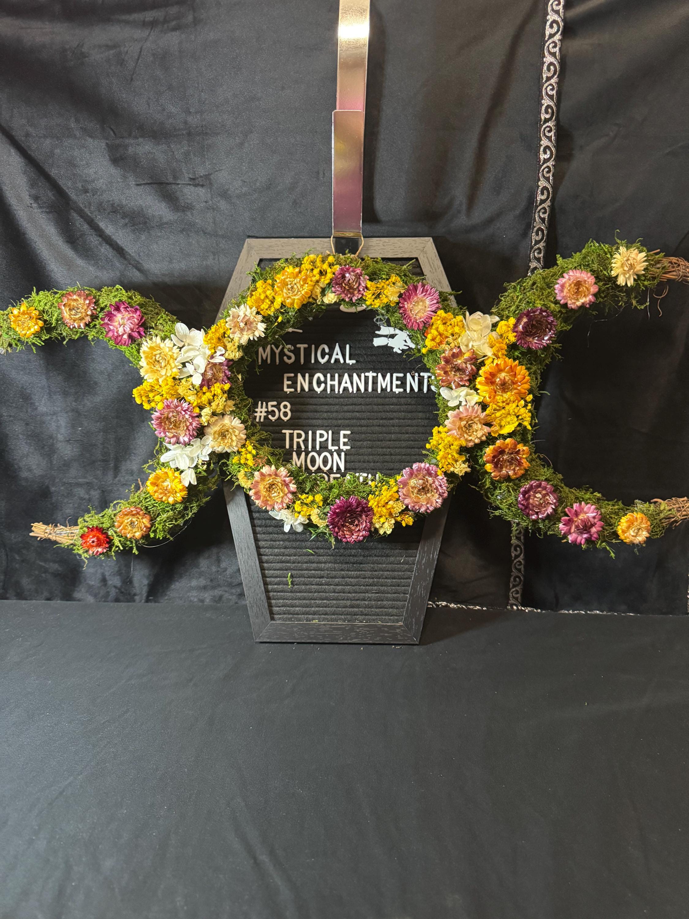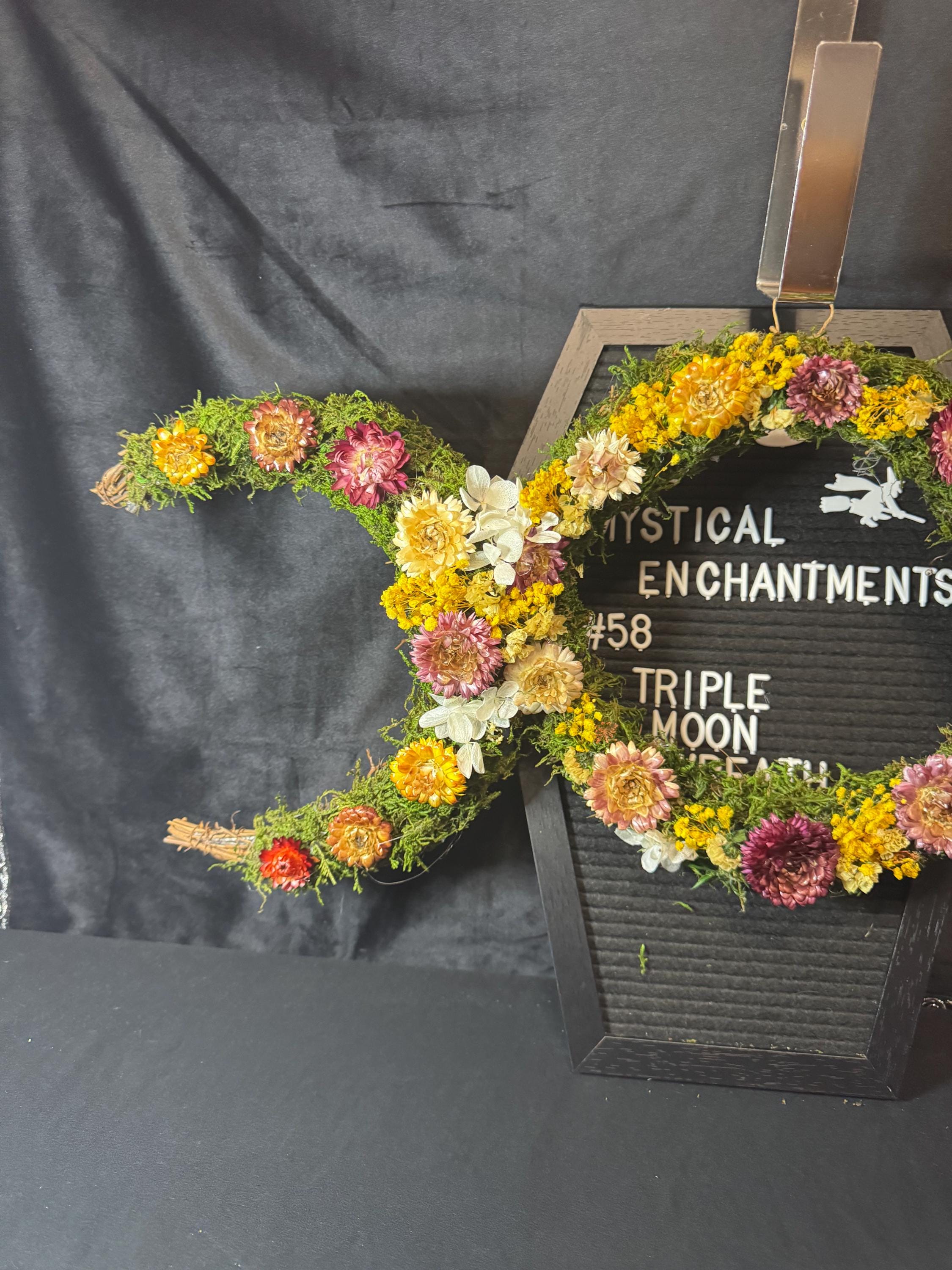 Triple Moon Grapevine Wreath made with real moss and real dried flowers that have been preserved. Wreath measures 27" from half moon to half moon the middle moon is 10". The Triple moon symbol represents the Triple Goddess and the eternal cycle of birth, life, and death, commonly found in Wiccan and pagan traditions. It symbolizes the three phases of womanhood- the Maiden (youth), the Mother (fertility), and the Crone (wisdom) - each corresponding to a different phase of the moon's cycle: the waxing crescent, the full moon, and the waning crescent, respectively. Blessed Be!