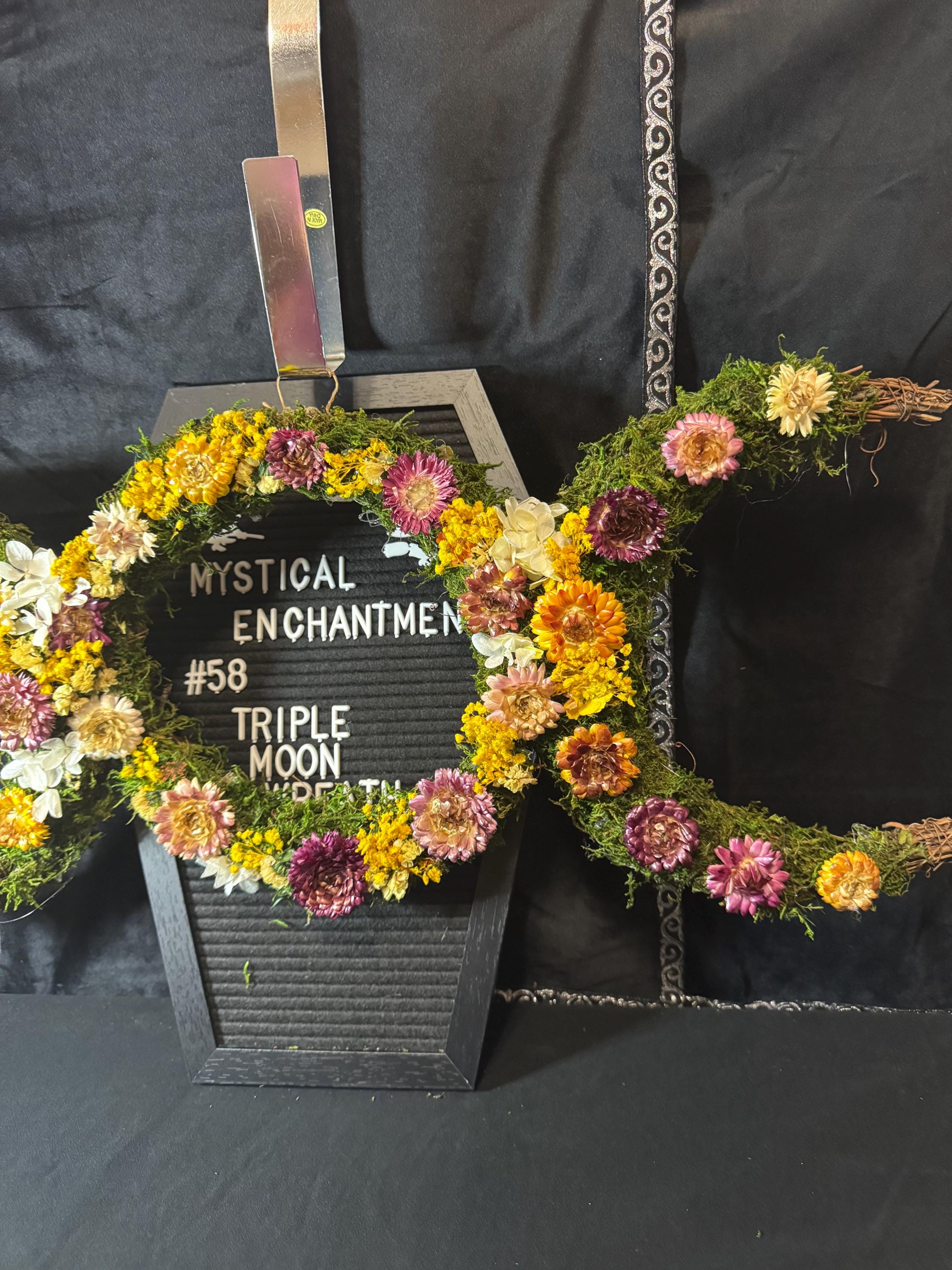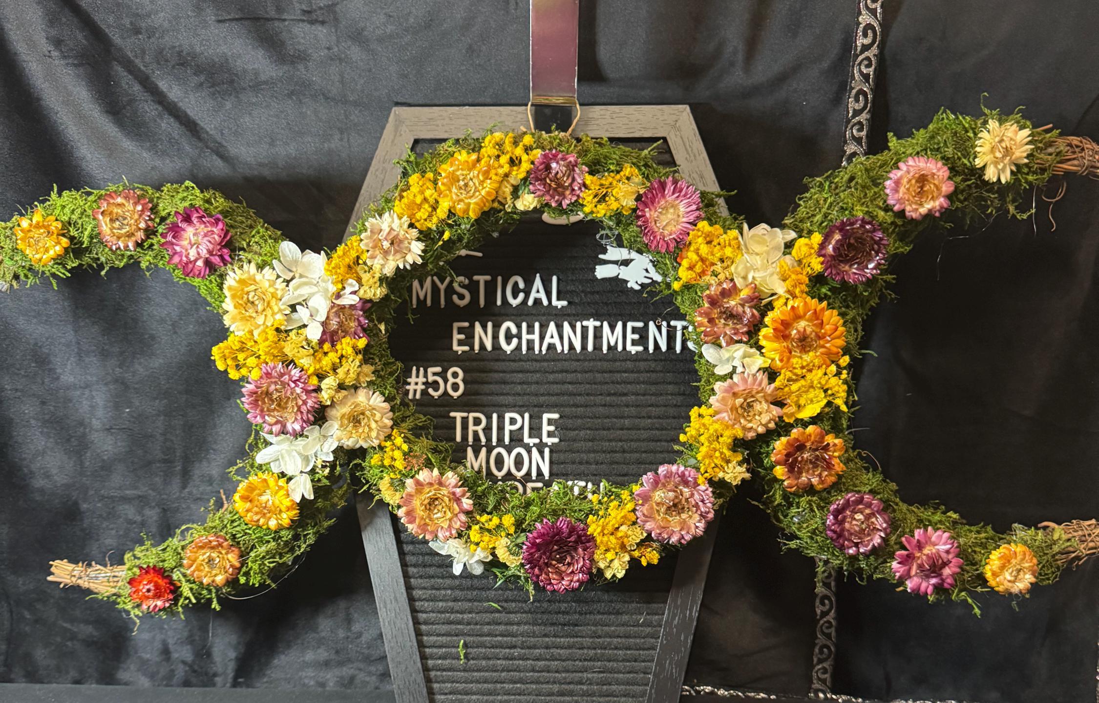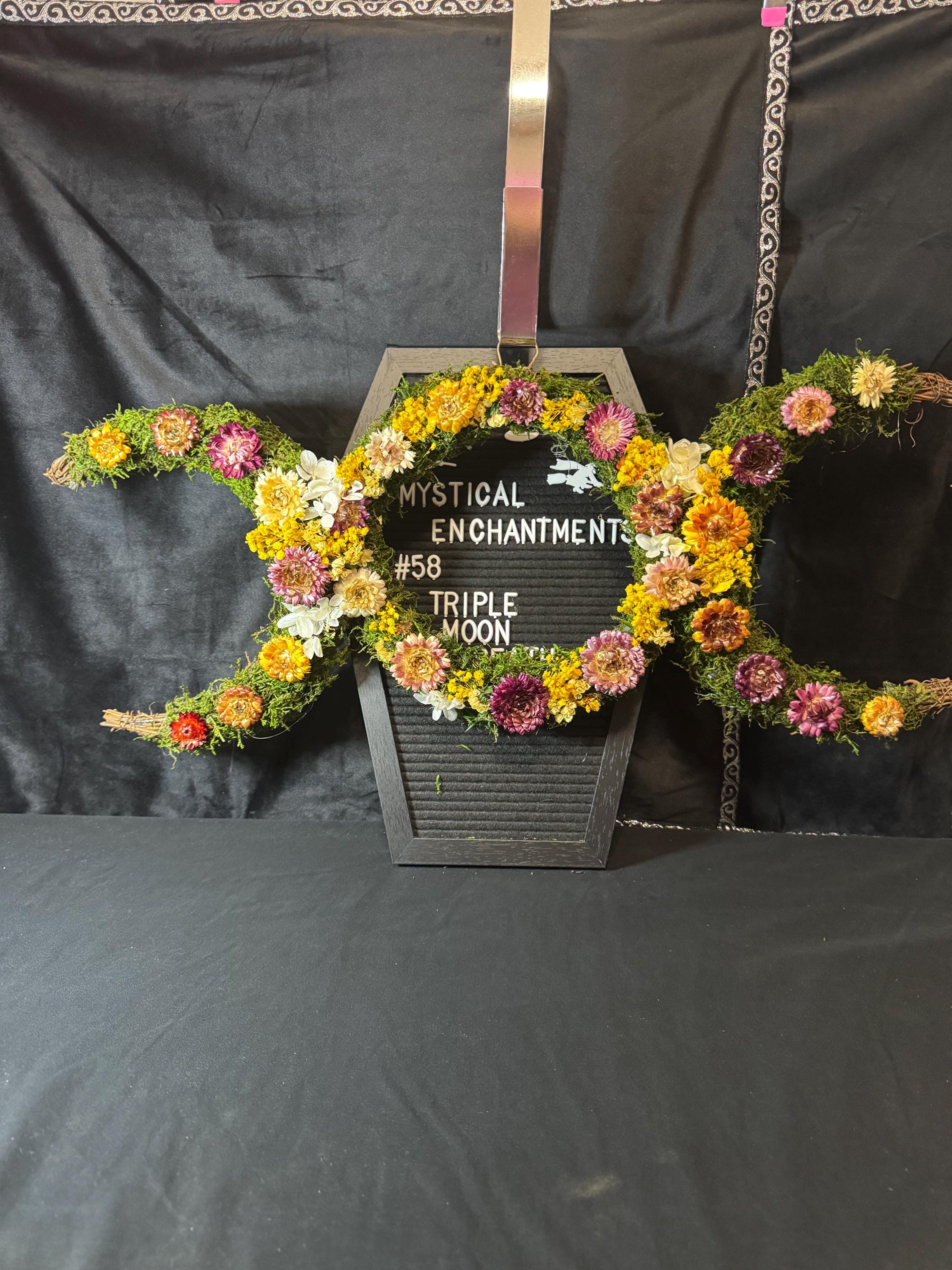 Triple Moon Grapevine Wreath made with real moss and real dried flowers that have been preserved. Wreath measures 27" from half moon to half moon the middle moon is 10". The Triple moon symbol represents the Triple Goddess and the eternal cycle of birth, life, and death, commonly found in Wiccan and pagan traditions. It symbolizes the three phases of womanhood- the Maiden (youth), the Mother (fertility), and the Crone (wisdom) - each corresponding to a different phase of the moon's cycle: the waxing crescent, the full moon, and the waning crescent, respectively. Blessed Be!