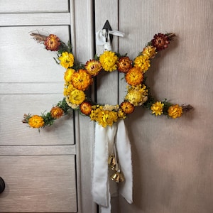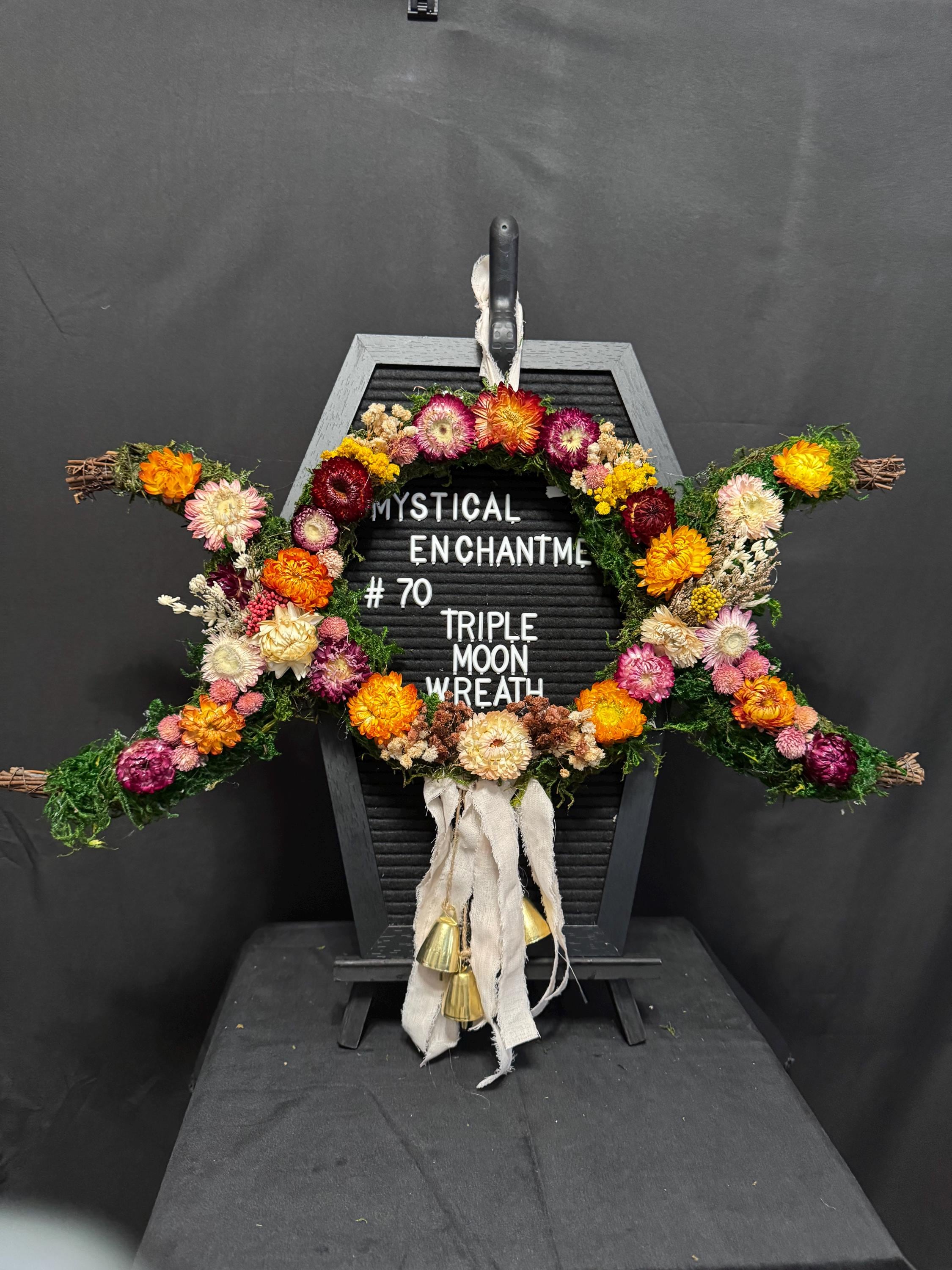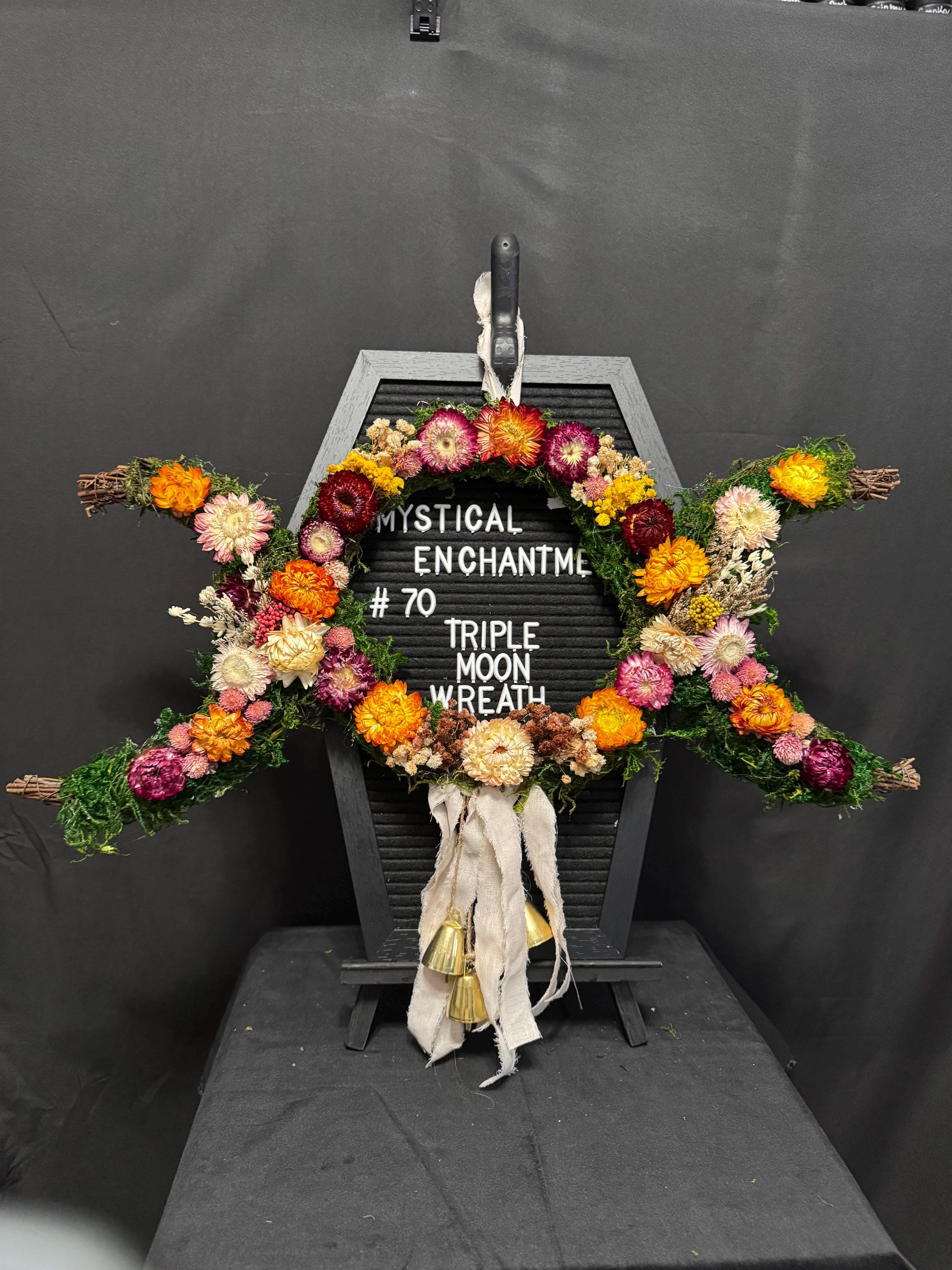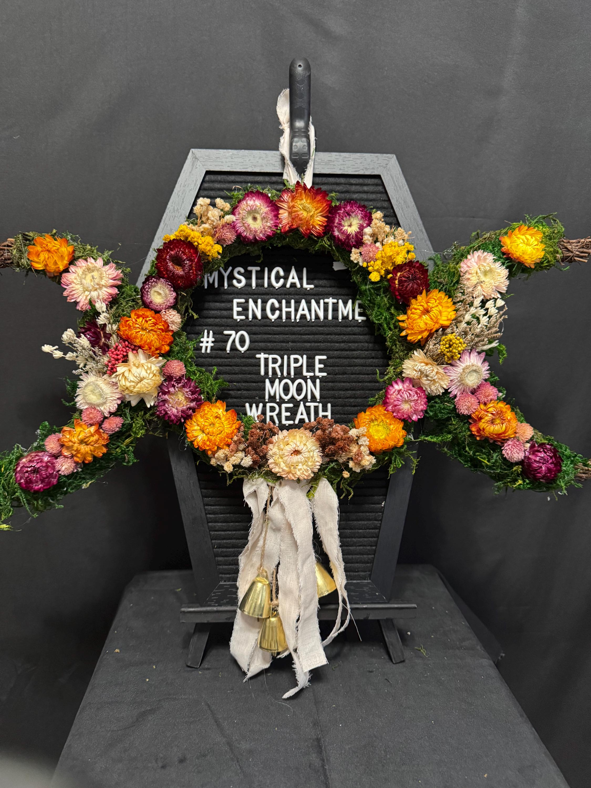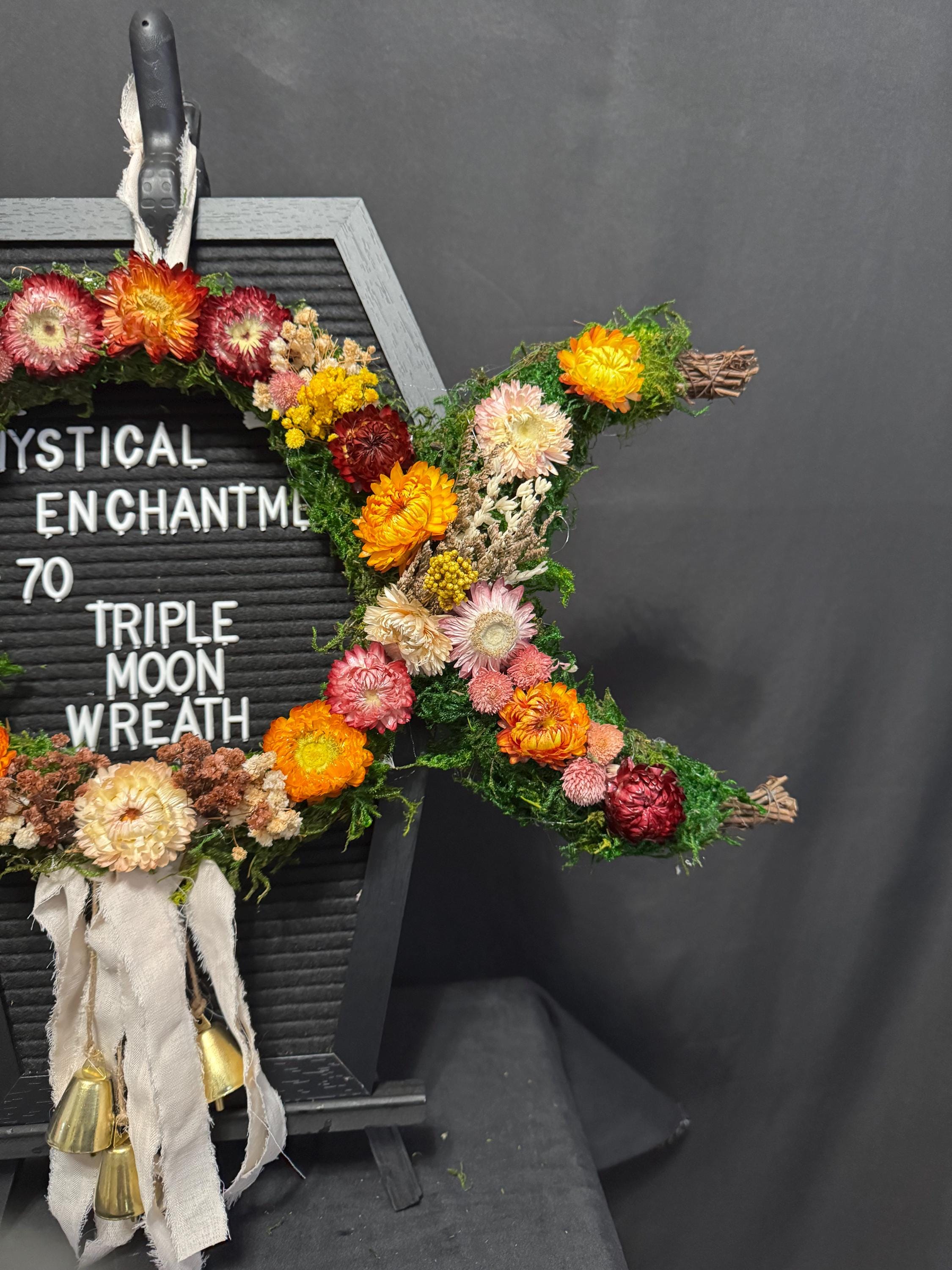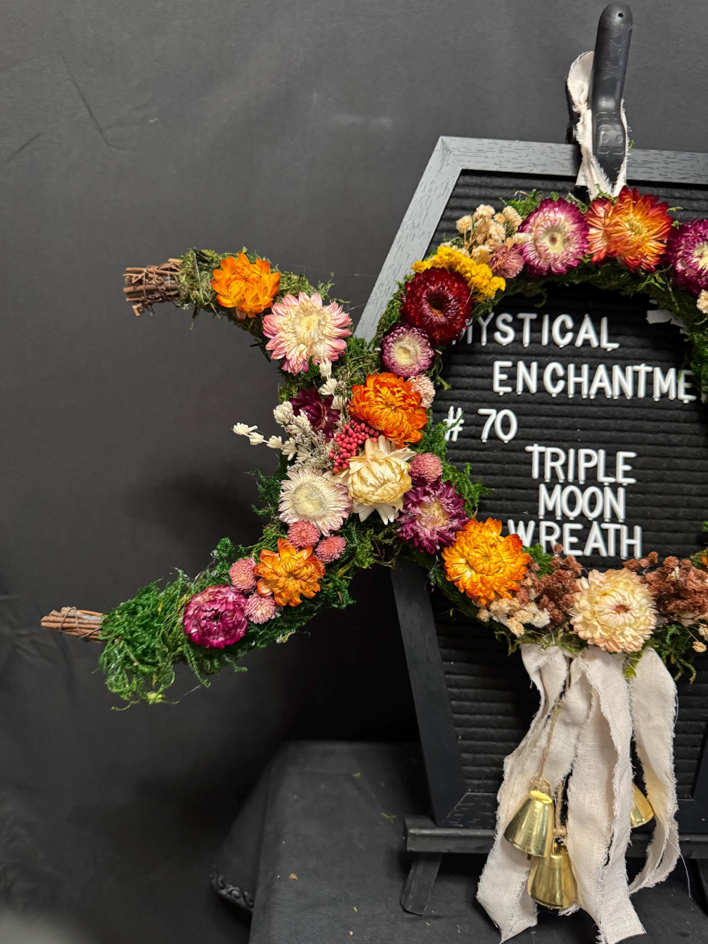 Triple Moon Grapevine Wreath with Witch Bells, made with moss and real preserved dried flowers. Wreath measures 27" from half-moon to half-moon, the middle wreath is 10". The triple moon symbol represents the Triple Goddess and the eternal cycle of birth, life, and death, commonly found in Wiccan and Pagan traditions. It symbolizes the three phases of womanhood-the Maiden (youth), the Mother (fertility), and the crone (wisdom) - each corresponding to a different phase of the moon's cycle: the waxing crescent, the full moon, and the waning crescent, respectively. Also, has 4 gold witch bells attached for protection. Blessed Be!