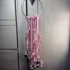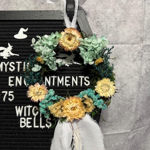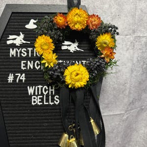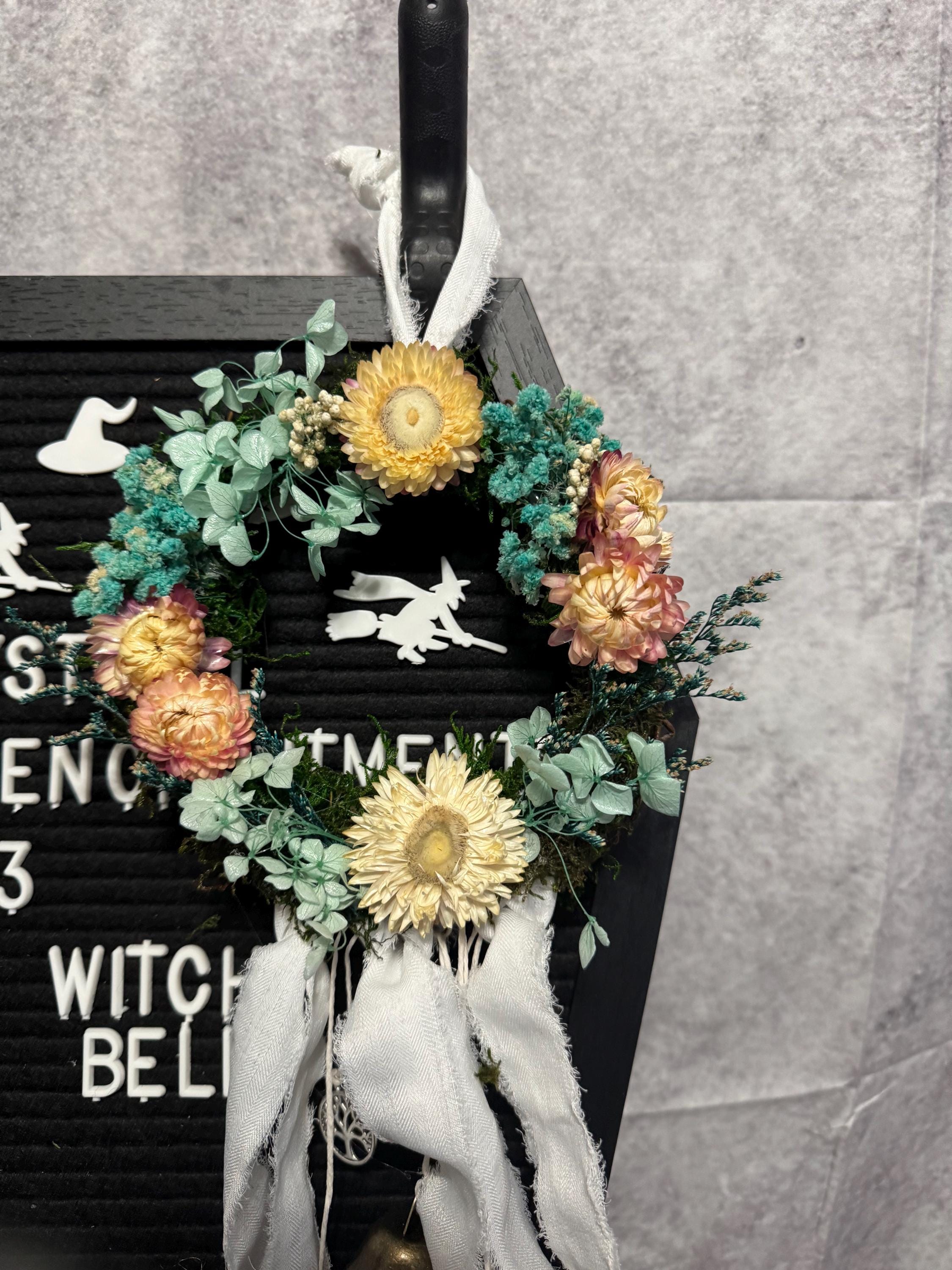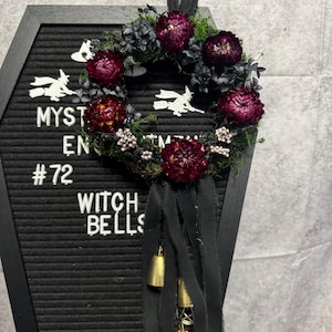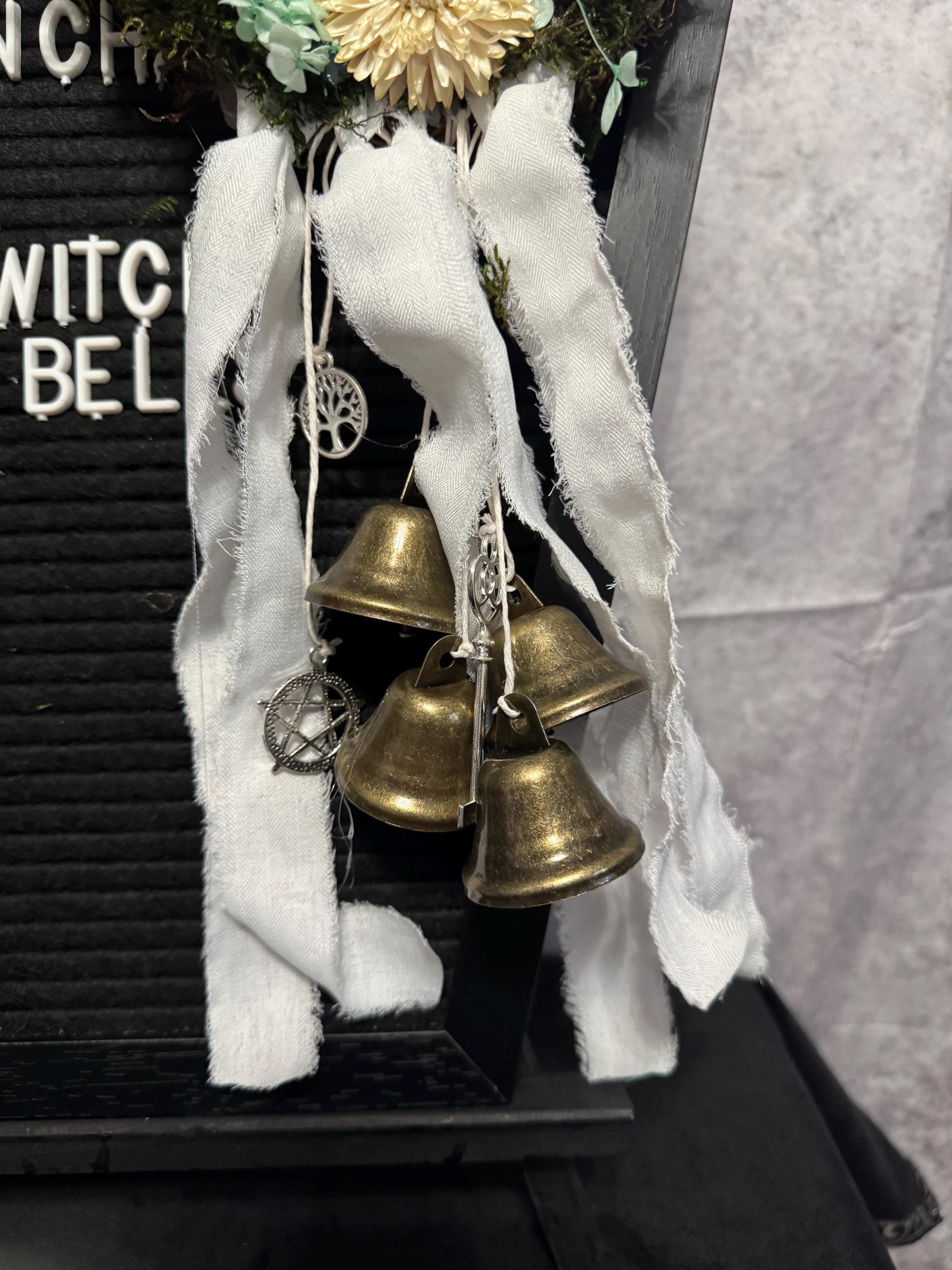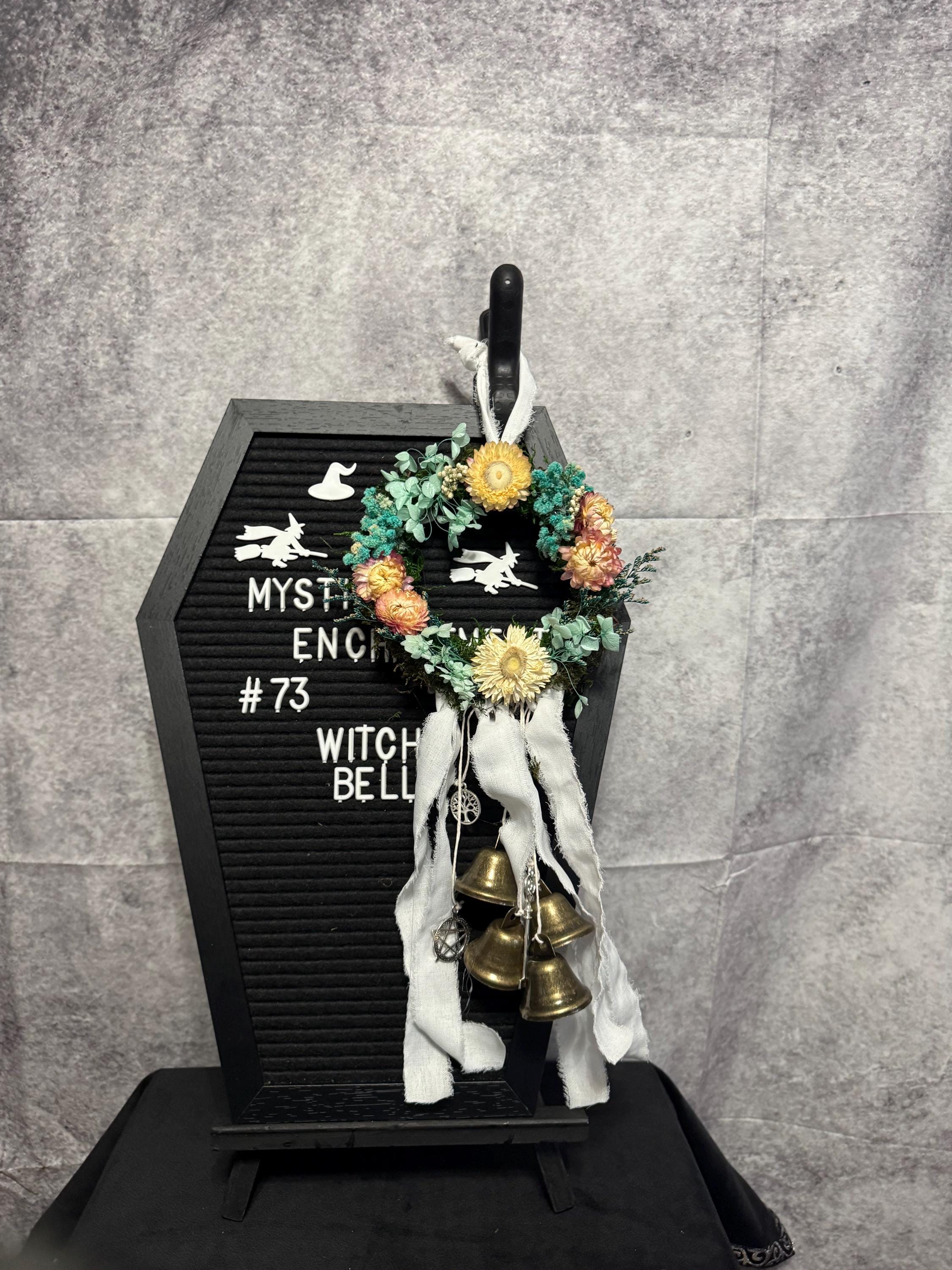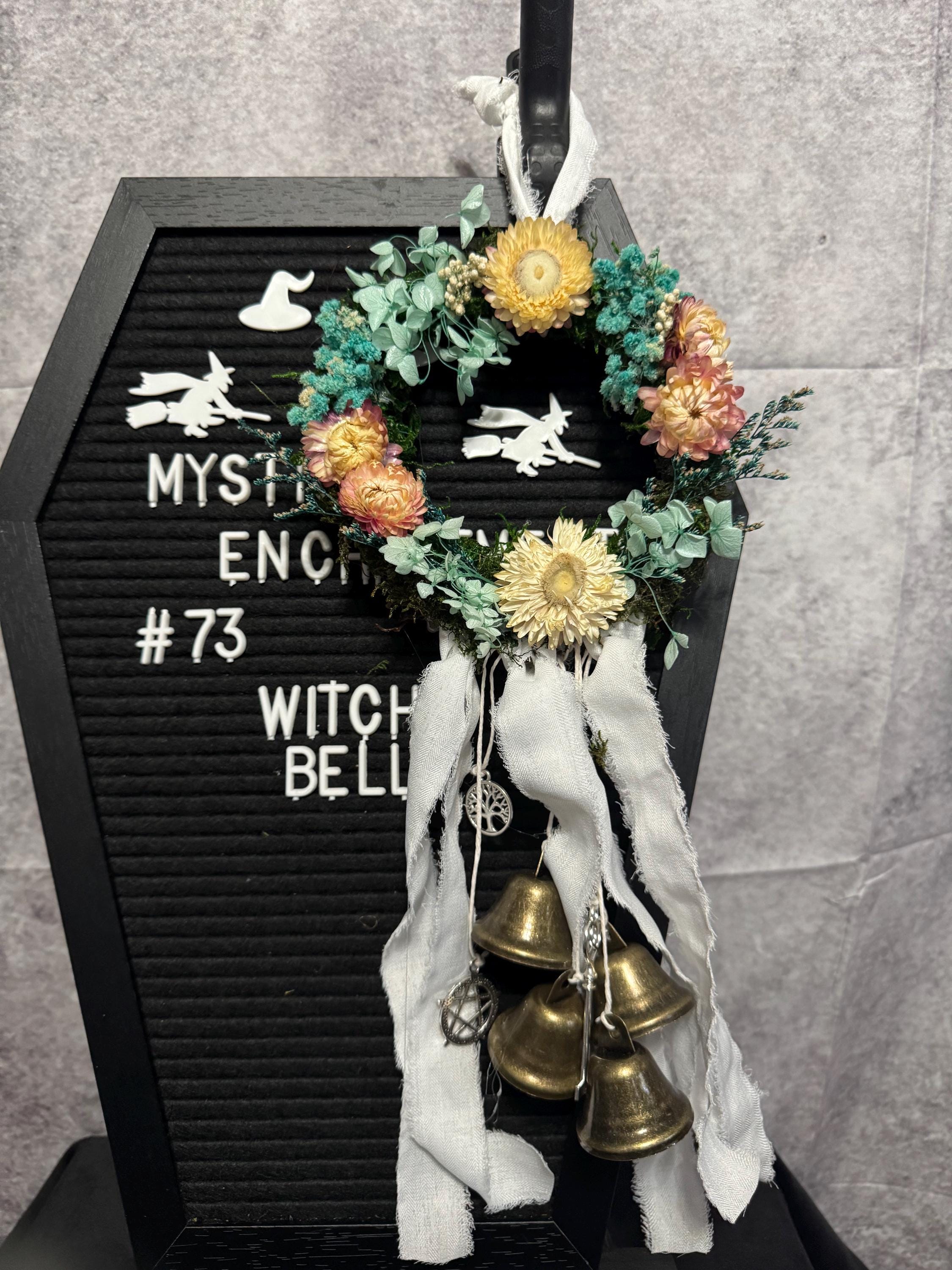 Doorknob Witch Bells, made with small grapevine wreath, real dried flowers, moss, off-white chiffon ribbon, 4 bronze witch bells, and 4 silver charms. Witches' bells are primarily used for protection and clearing of negative energy from a home or sacred space. They are hung on doorknobs or near entrances to chime and ward off unwanted spirits or energy as the door opens and closes. They are also used as a decorative item and in various rituals for protection, cleansing, or to summon spirits. Blessed Be!