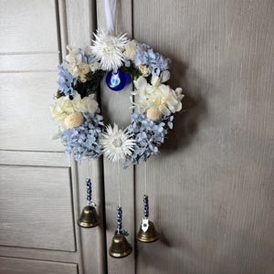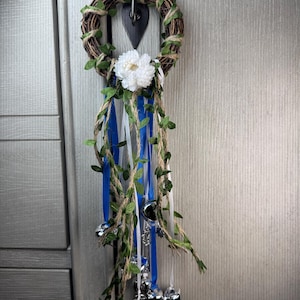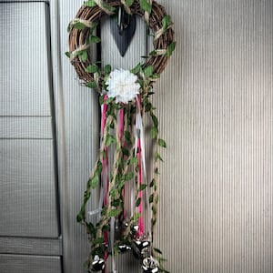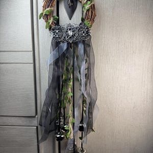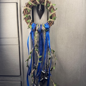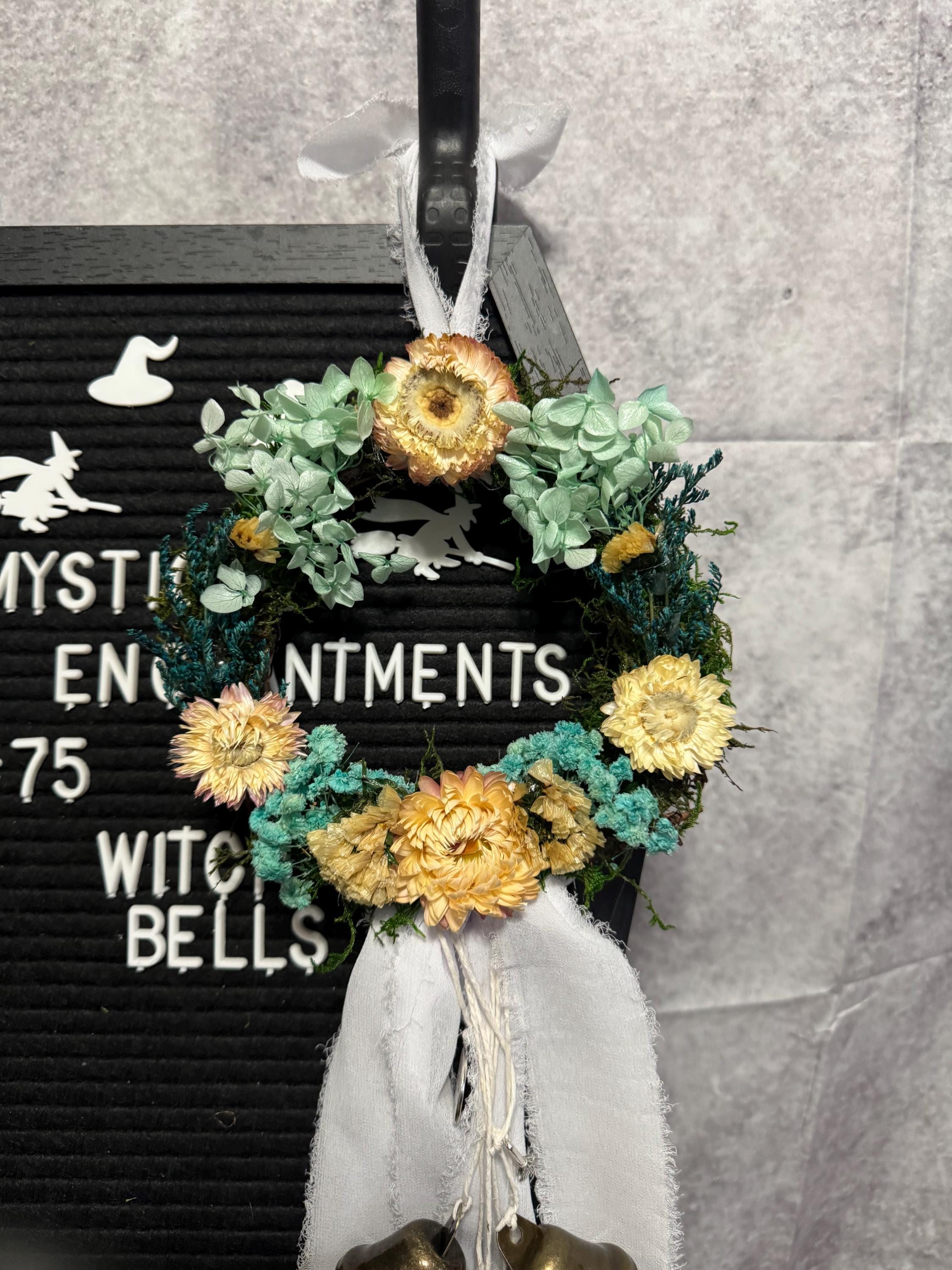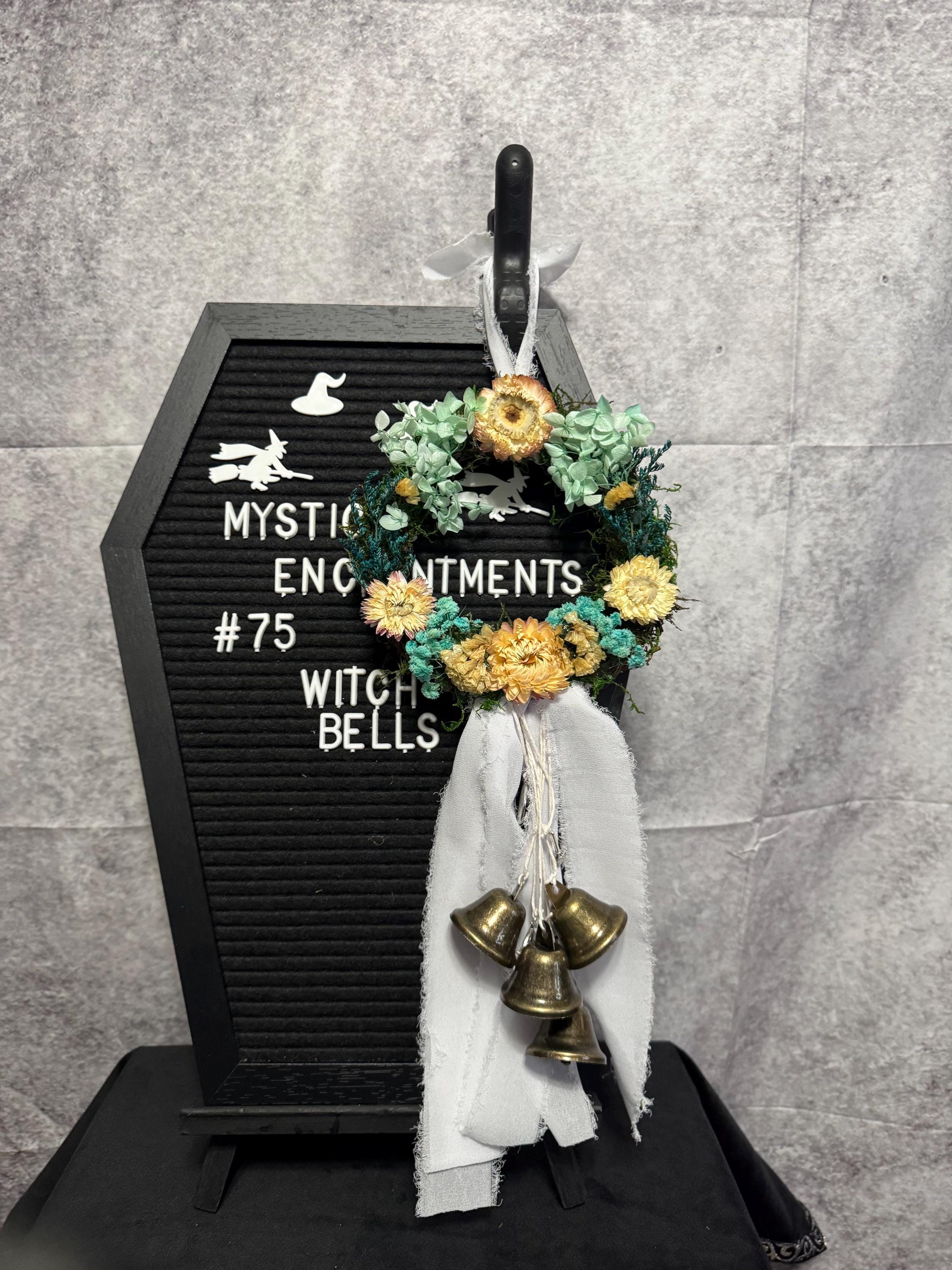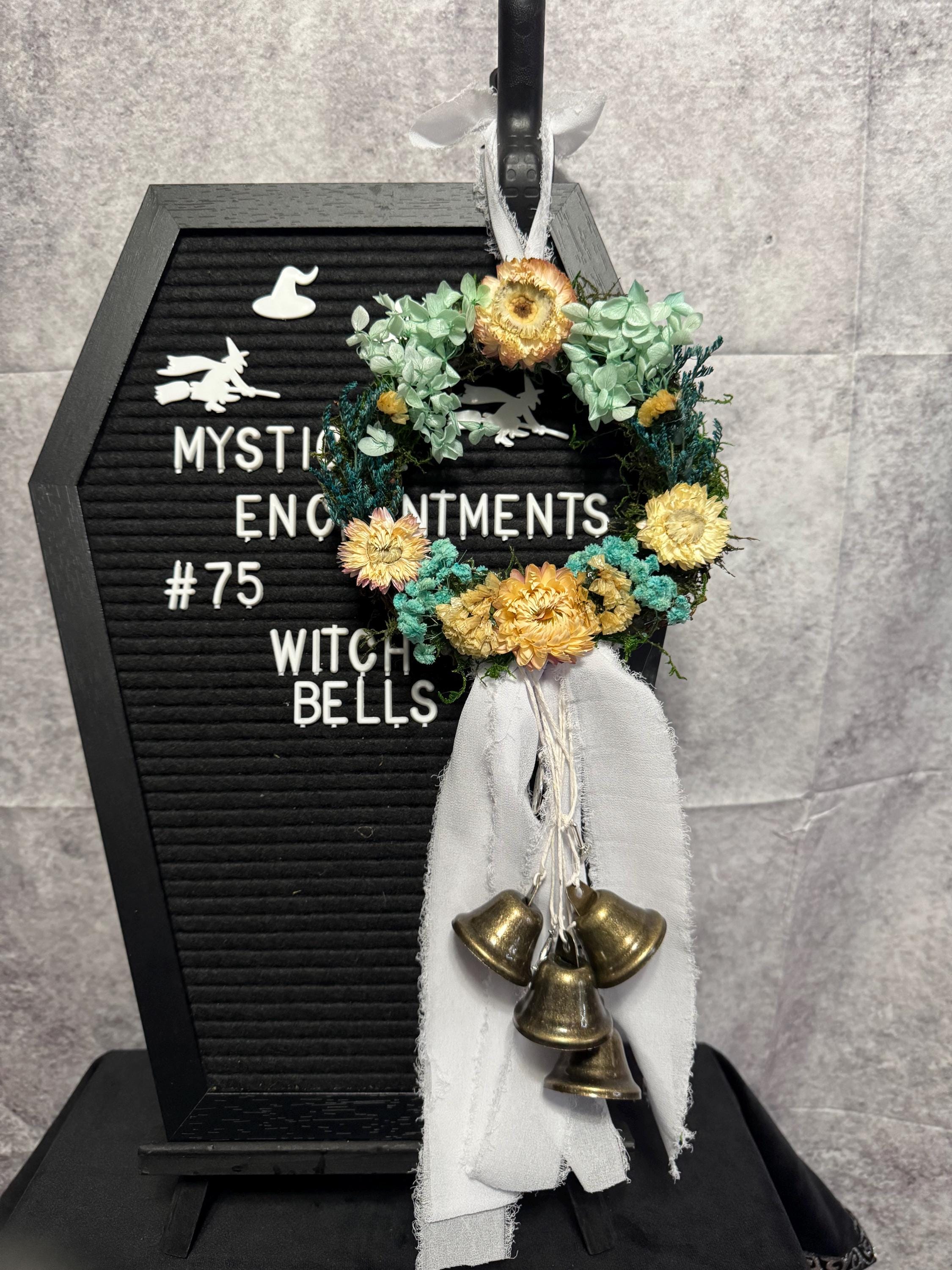 Witch Bells made with 6" grapevine wreath, green and pale-yellow dried flowers, white chiffon ribbon, 4 bronze bells, silver charms. Witch bells are primarily used for protection and clearing negative energy from a home or sacred space. They are hung on doorknobs or near entrances to chime and ward off unwanted spirits or energy as the door opens and closes. They are also used as a decorative item and in various rituals for protection, cleansing, or to summon spirits. Other Common Uses: Home Protection, Clearing and purification, Ritual tool, Amulets and decor, Spiritual communication, and Wind Chimes.