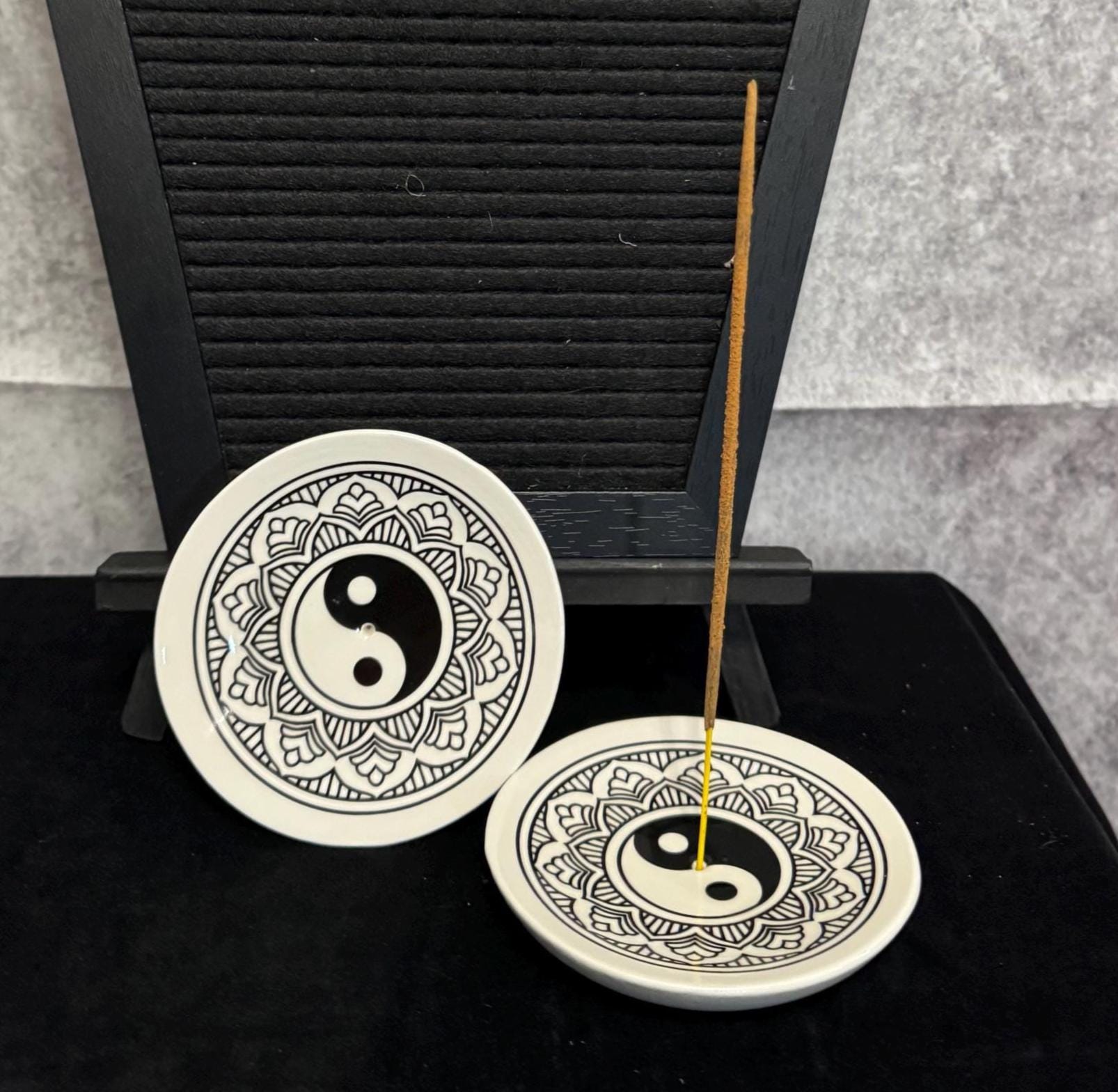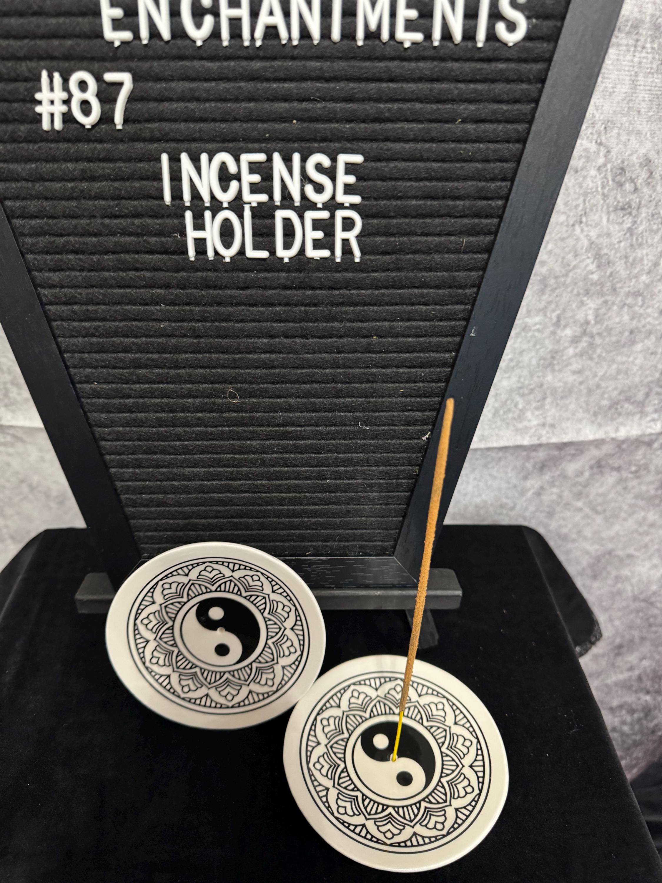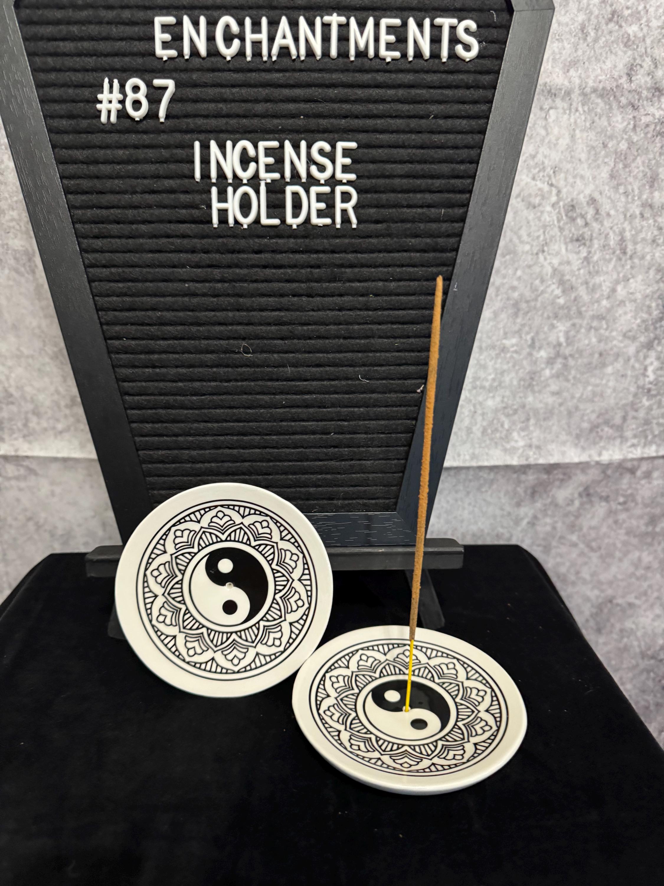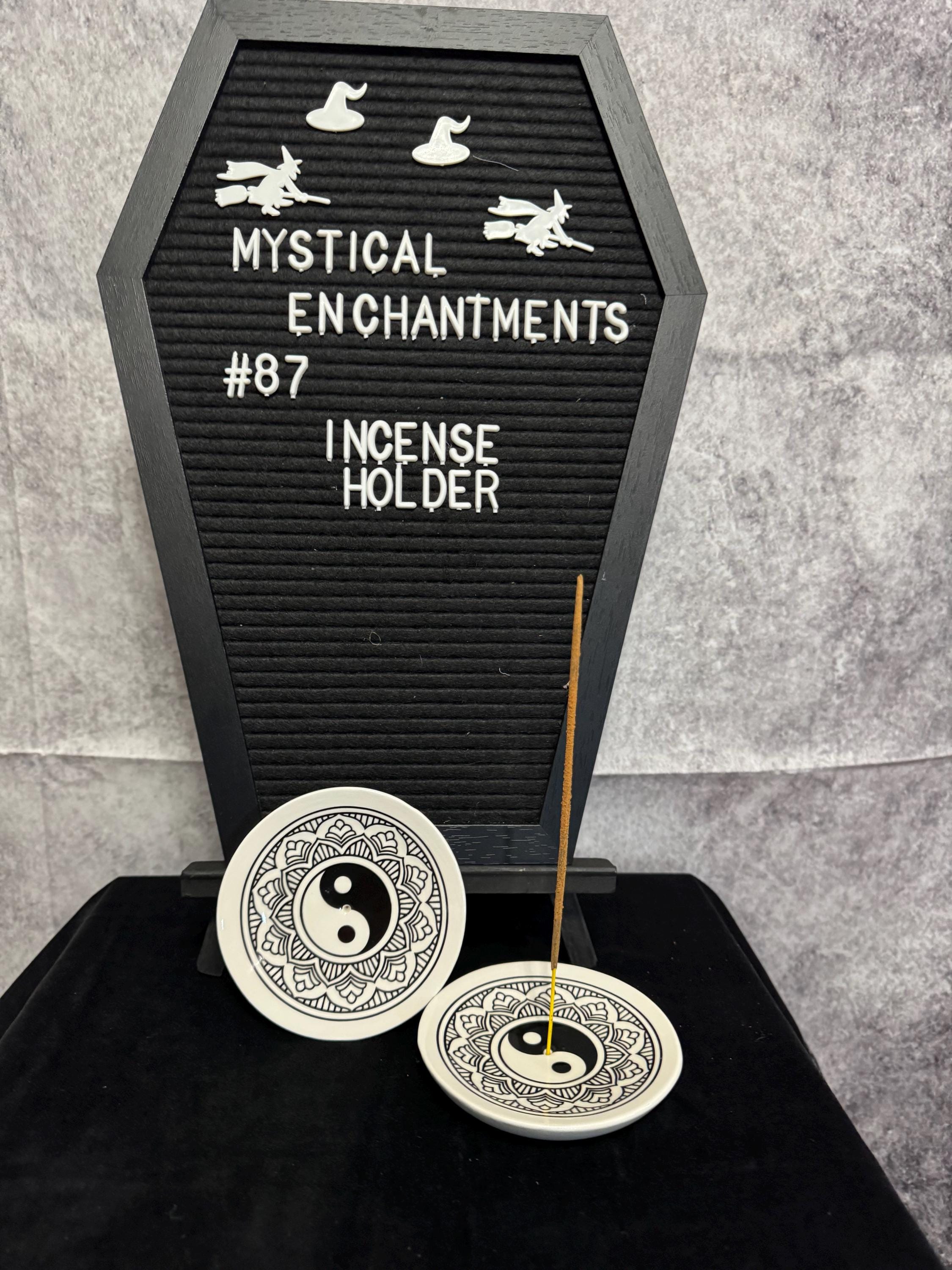 Yin-Yang Black White Zen Mandala Incense Stick Holder. Glass incense goes in the middle and its big enough to catch all ashes. The yin-yang symbol represents the concept of dualism in Taoism, where all forms of energy have and equally powerful opposing energy. Yin (the black section) represents darkness, shadows, and feminine energy. Yang (the white section) represents light, the sun, and masculine energy.