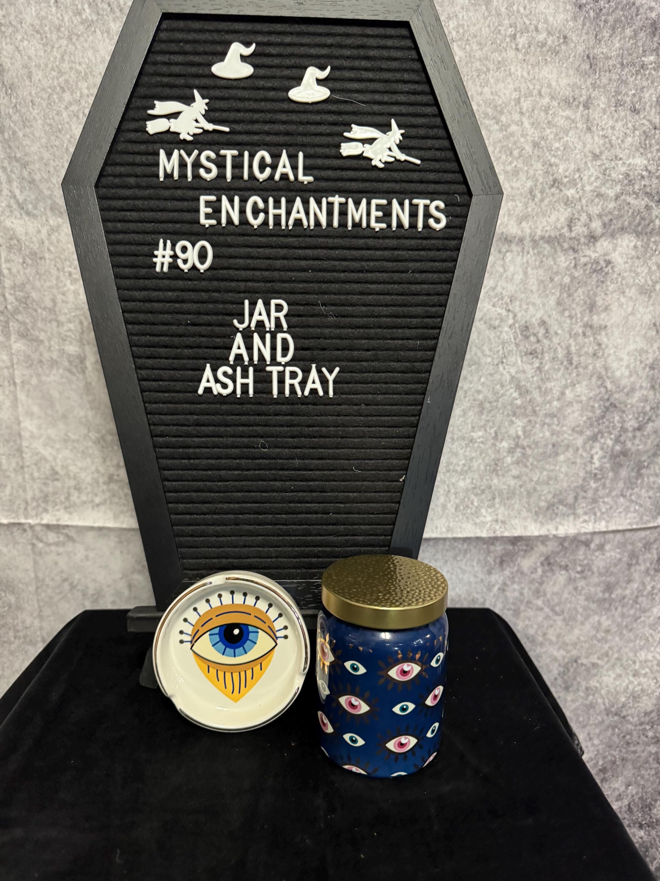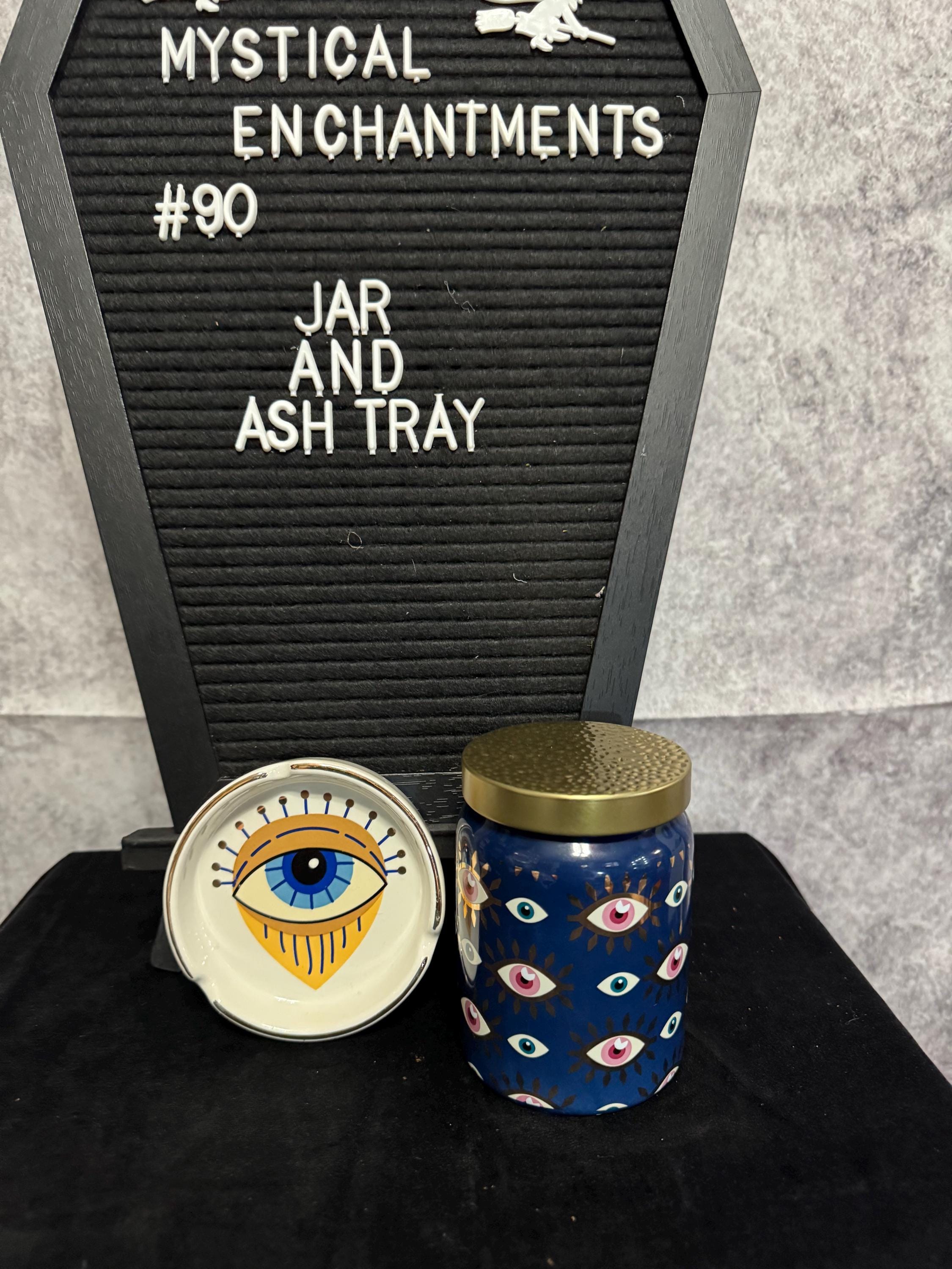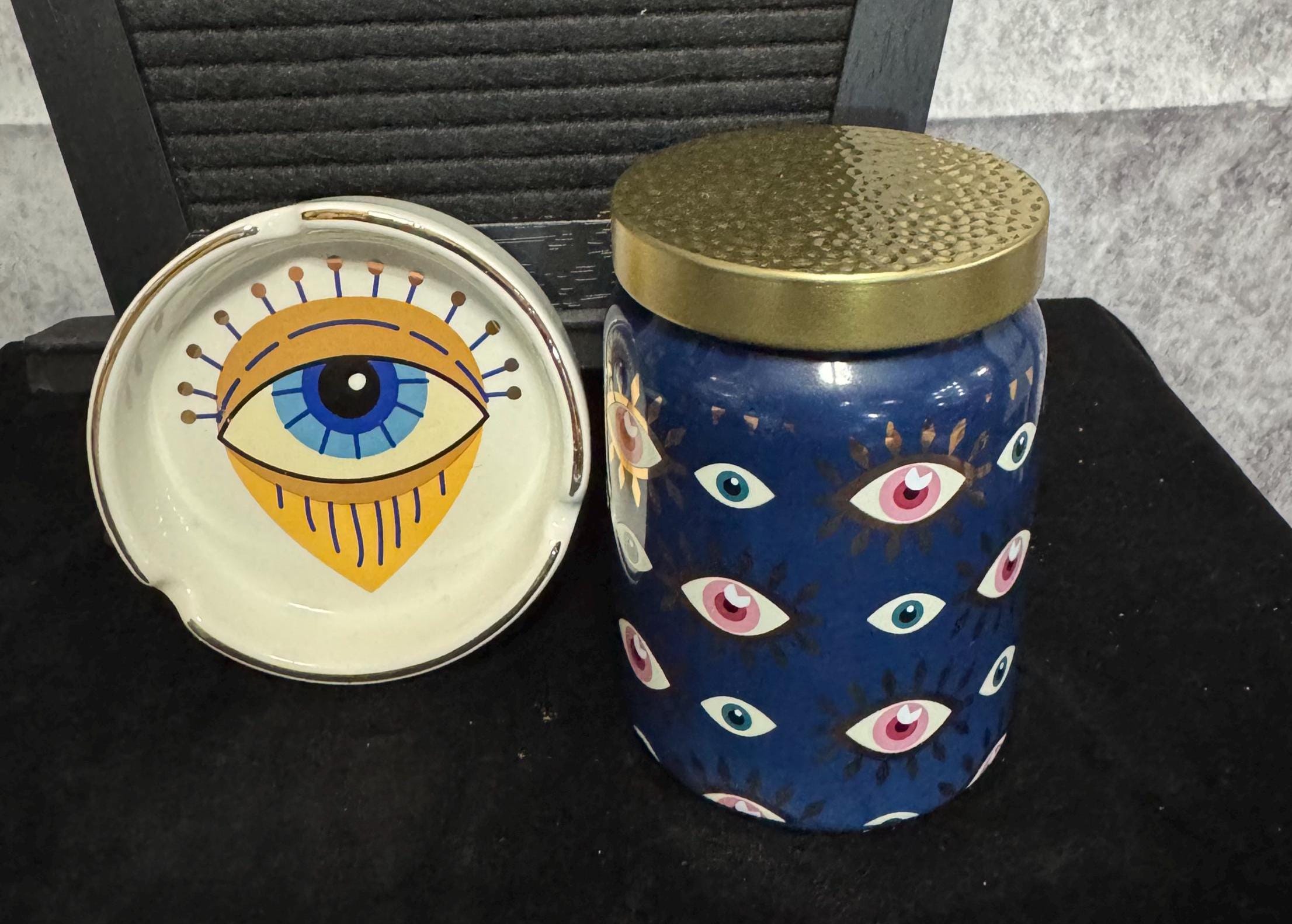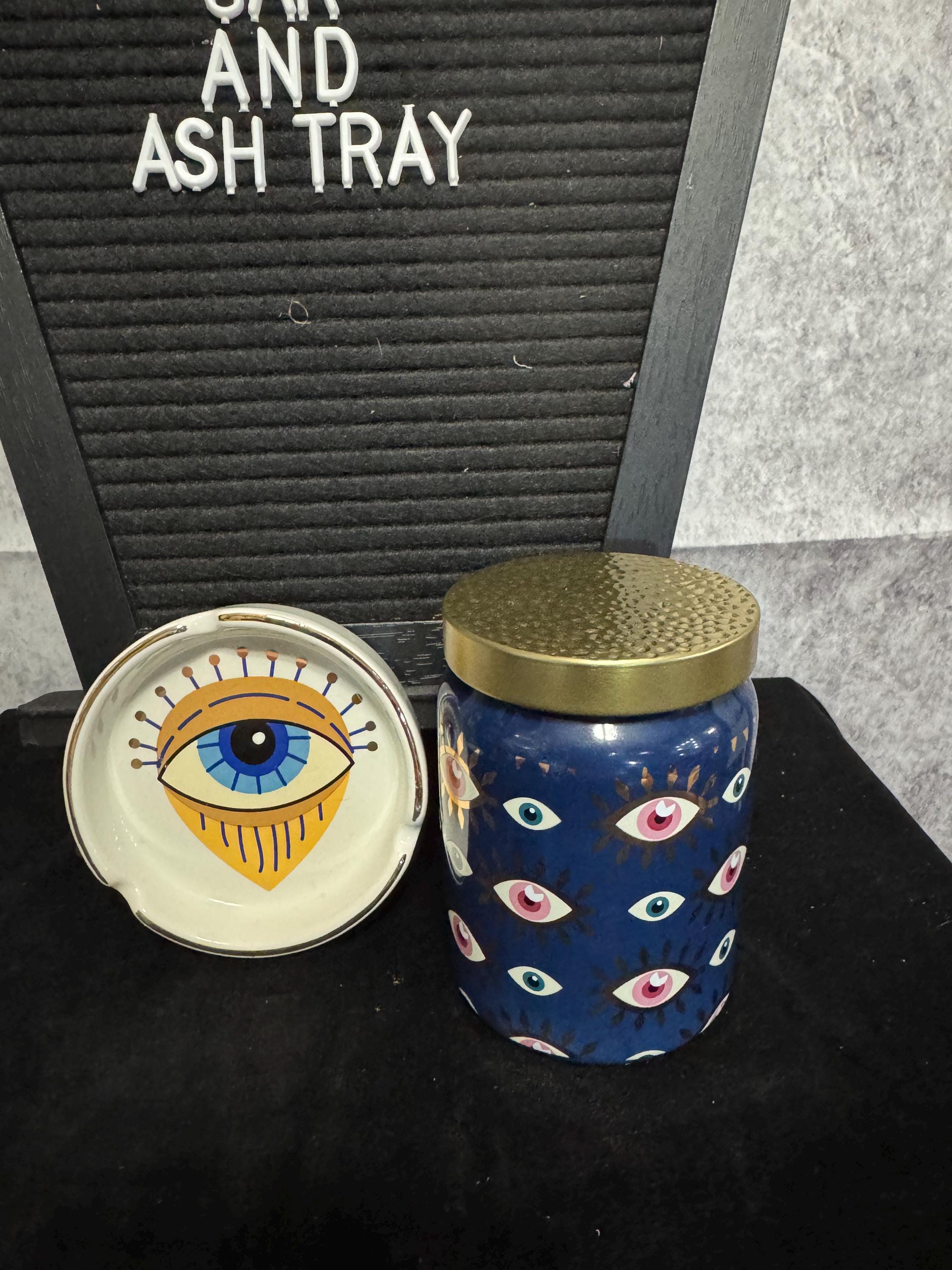 Evil Eye Ash Tray and Stash Jar Set. The evil eye is a symbol believed to provide protection against malevolent glares and bring good luck, and is traditionally a symbol believed to ward of negative energy. The ashtray is made of ceramic and features a hand painted eye design, I use as a cone incense holder since I don't smoke. The jar is also ceramic, and features hand painted evil eyes.
