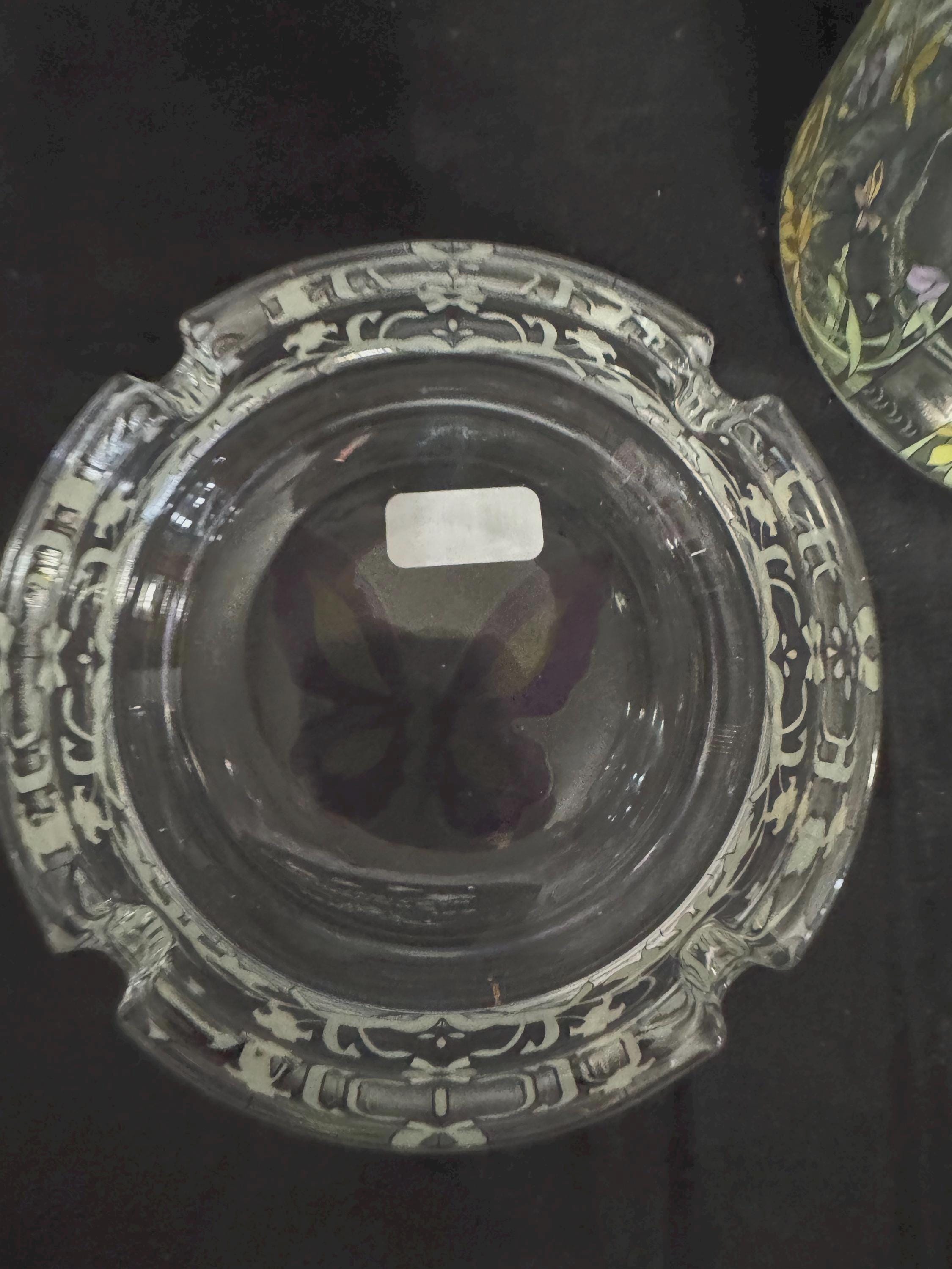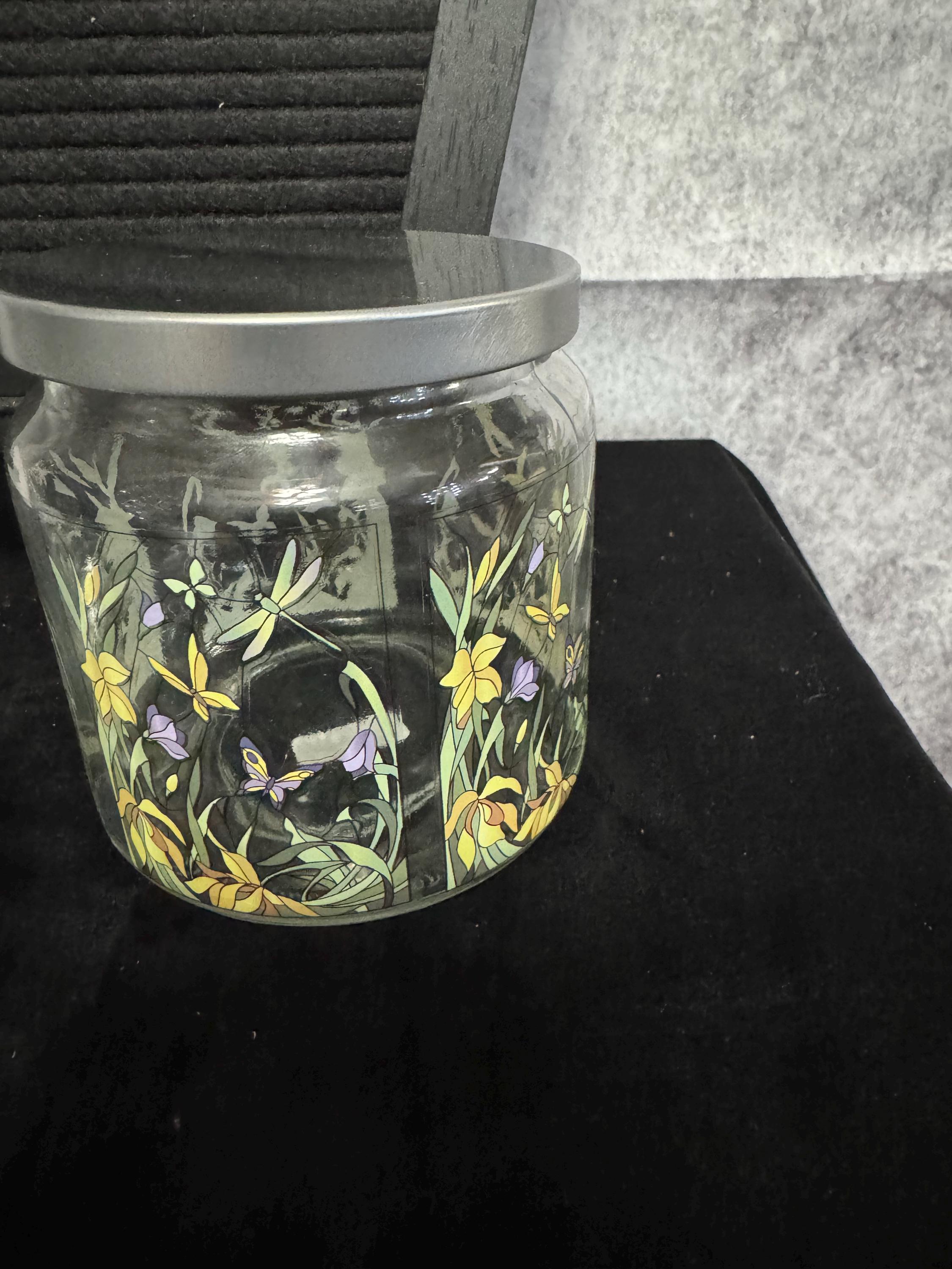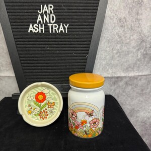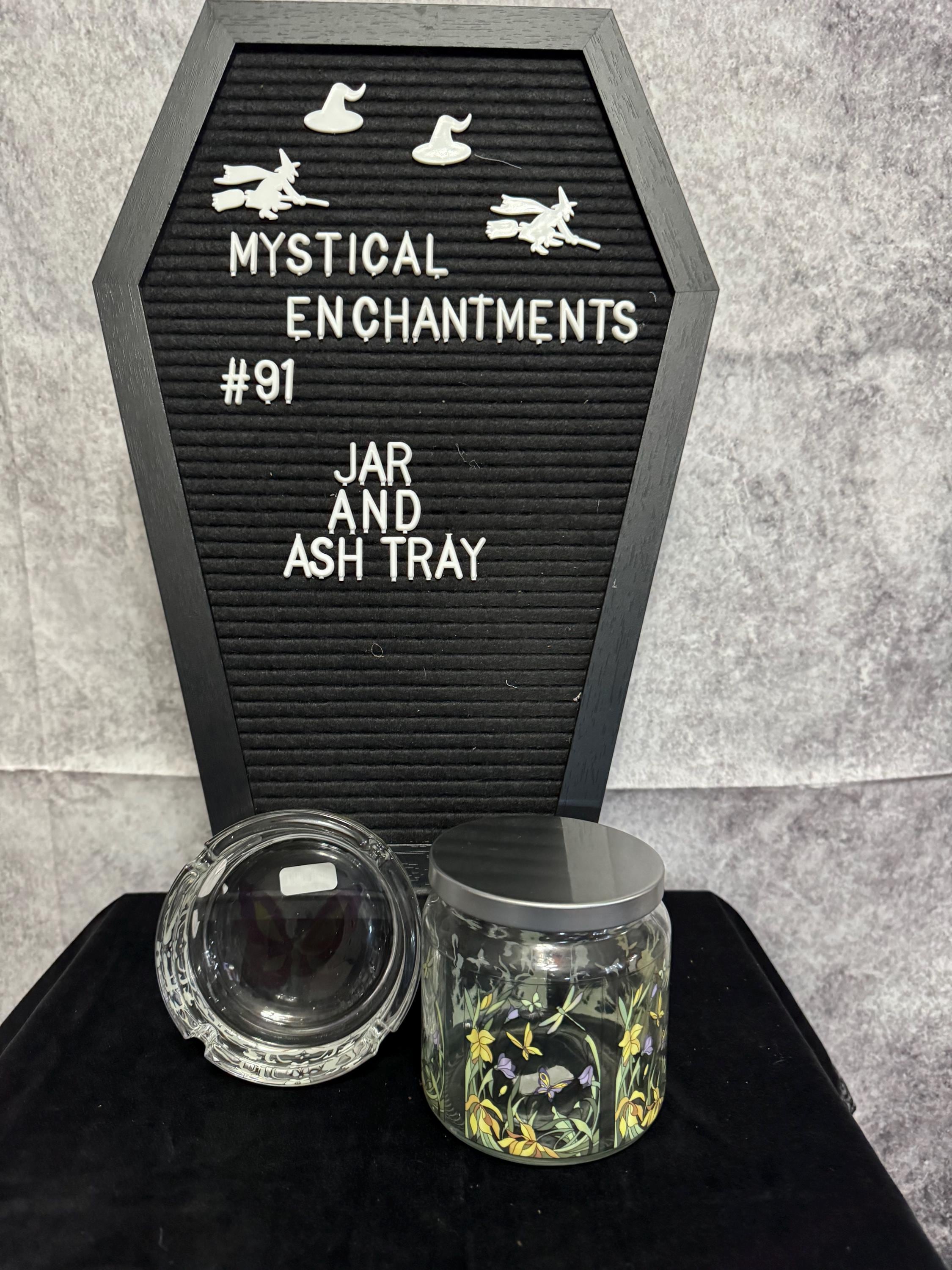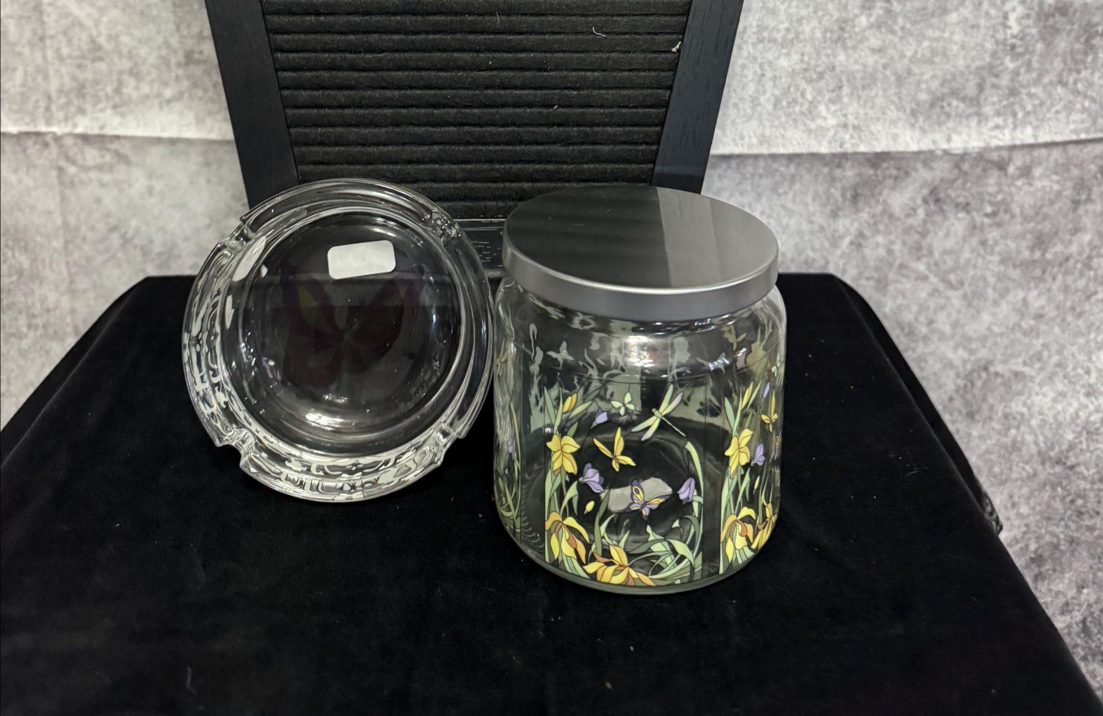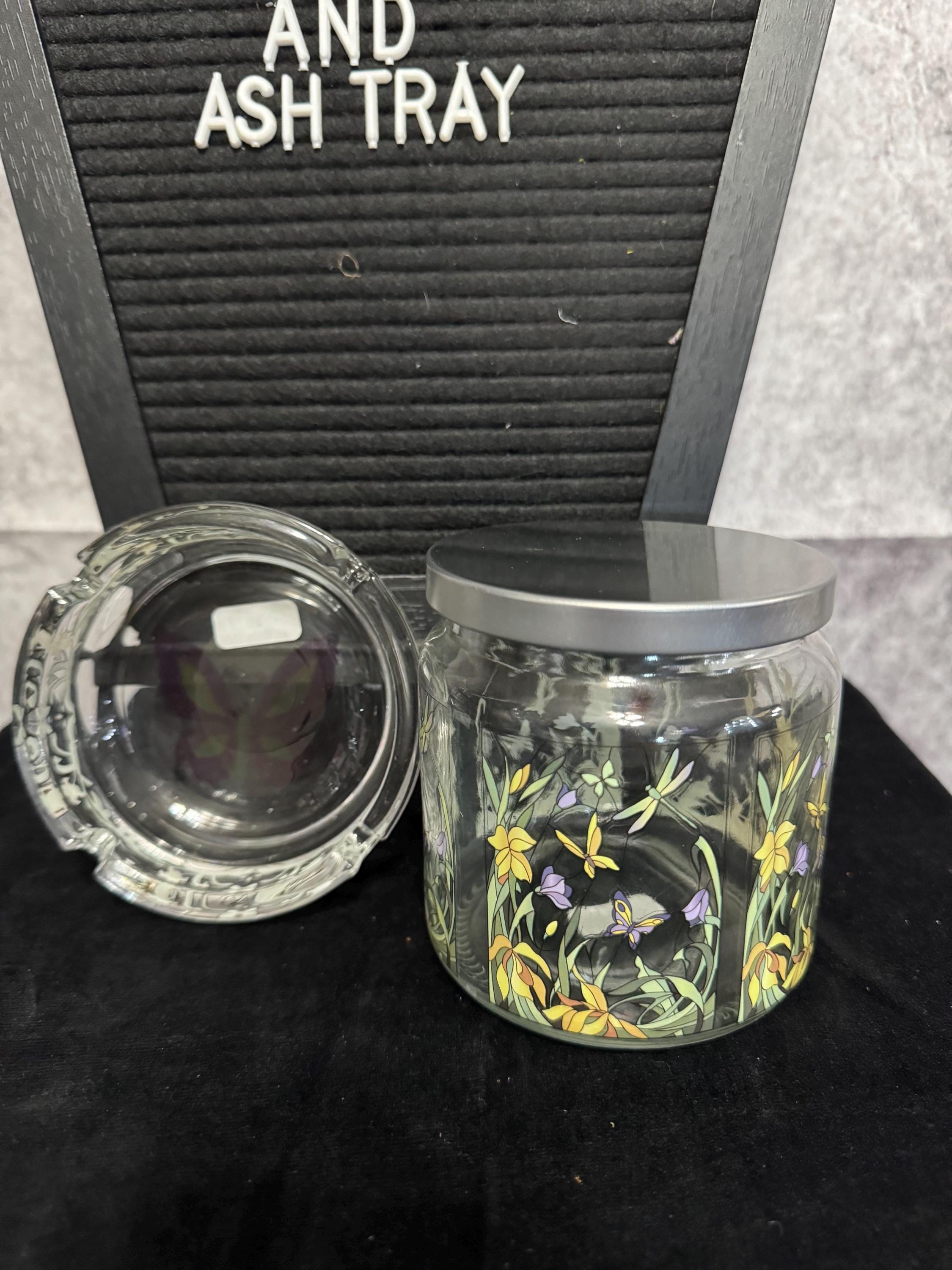 Clear Glass Storage Jar and Ash Tray featuring a floral and butterfly design. The stash jar is made of glass with a threaded lid, which helps create a secure seal. The ash tray can also be used as a cone incense holder if you do not smoke that's what I use it for, and jar can be used to store many different things.