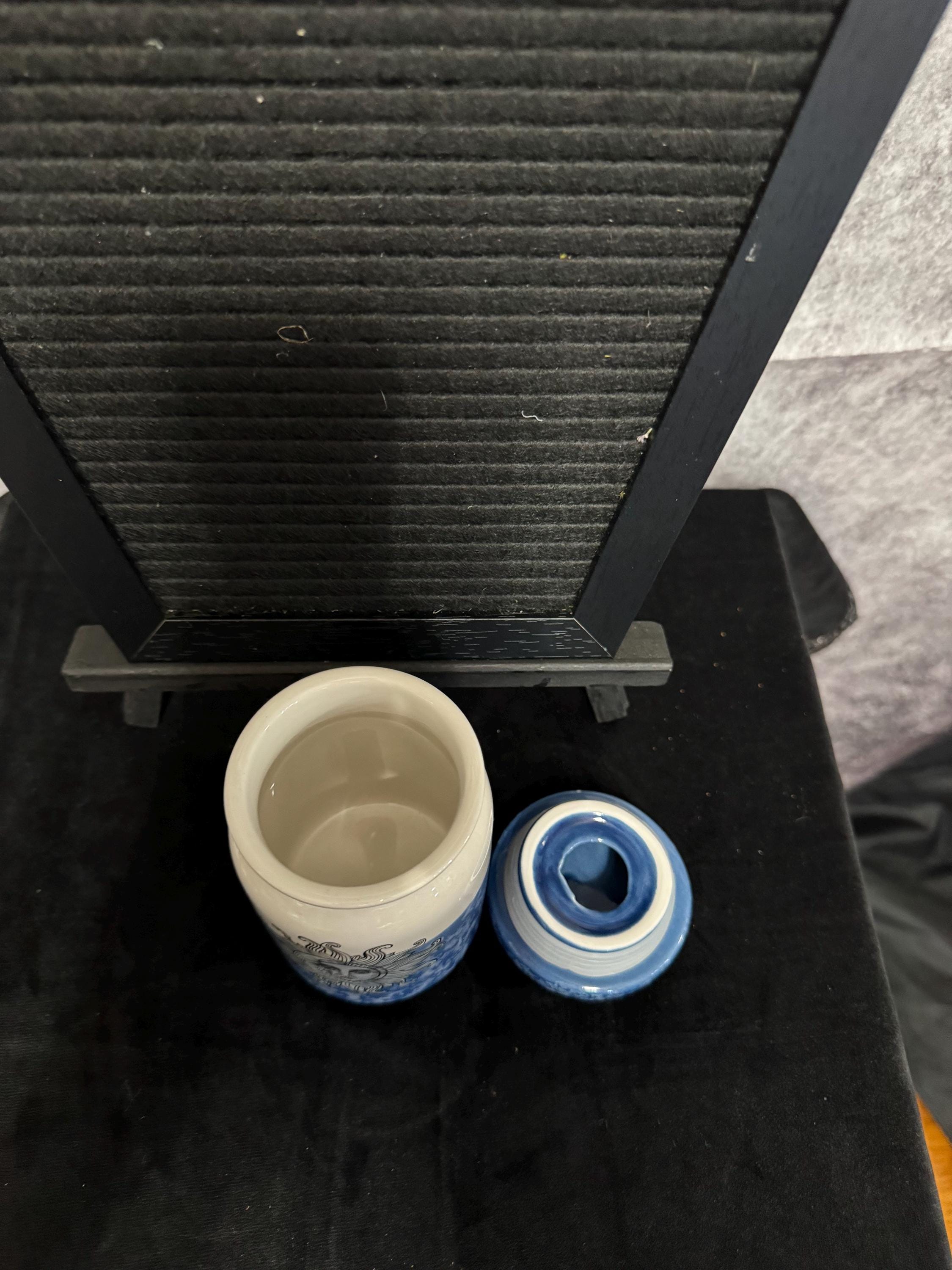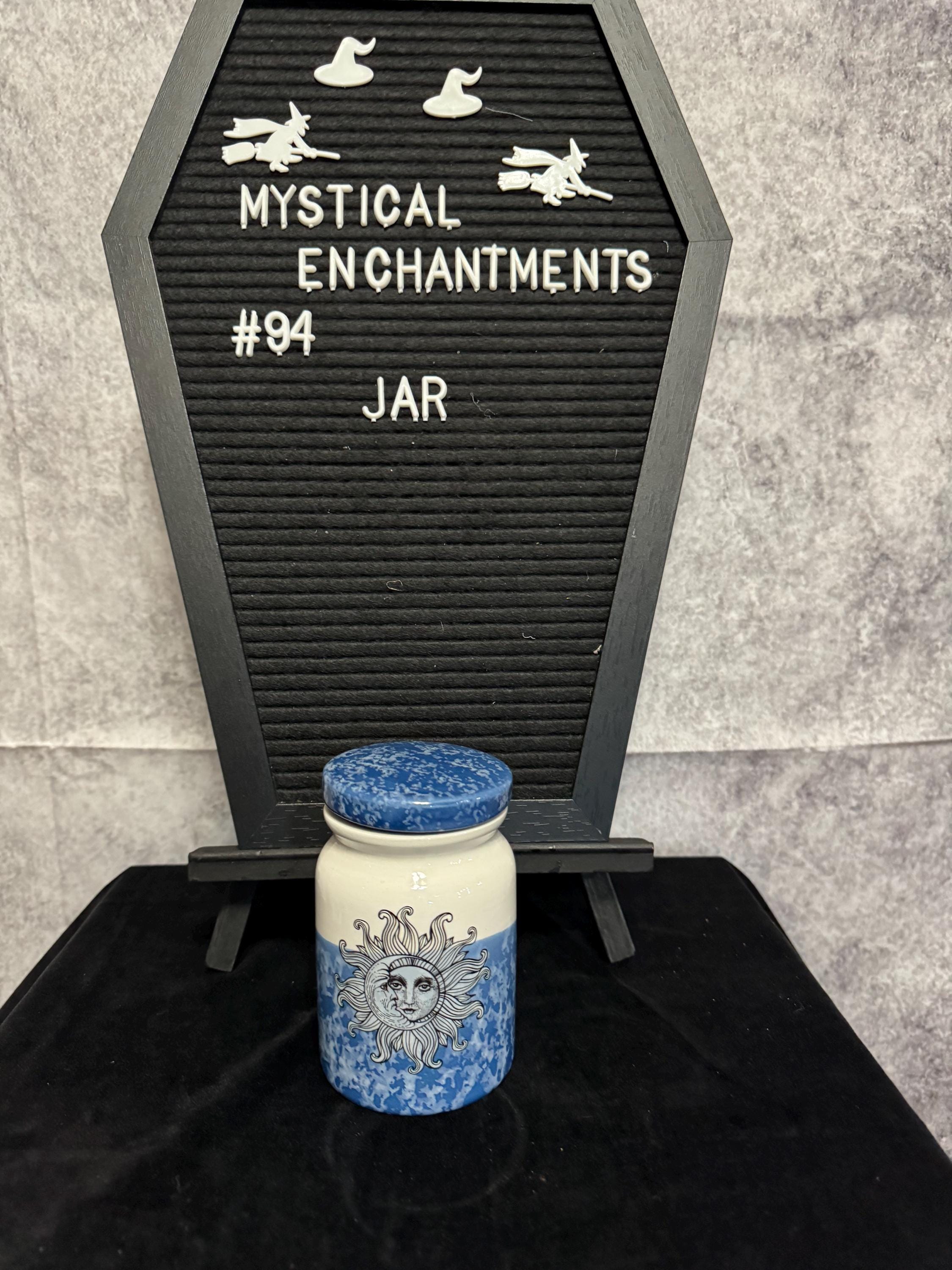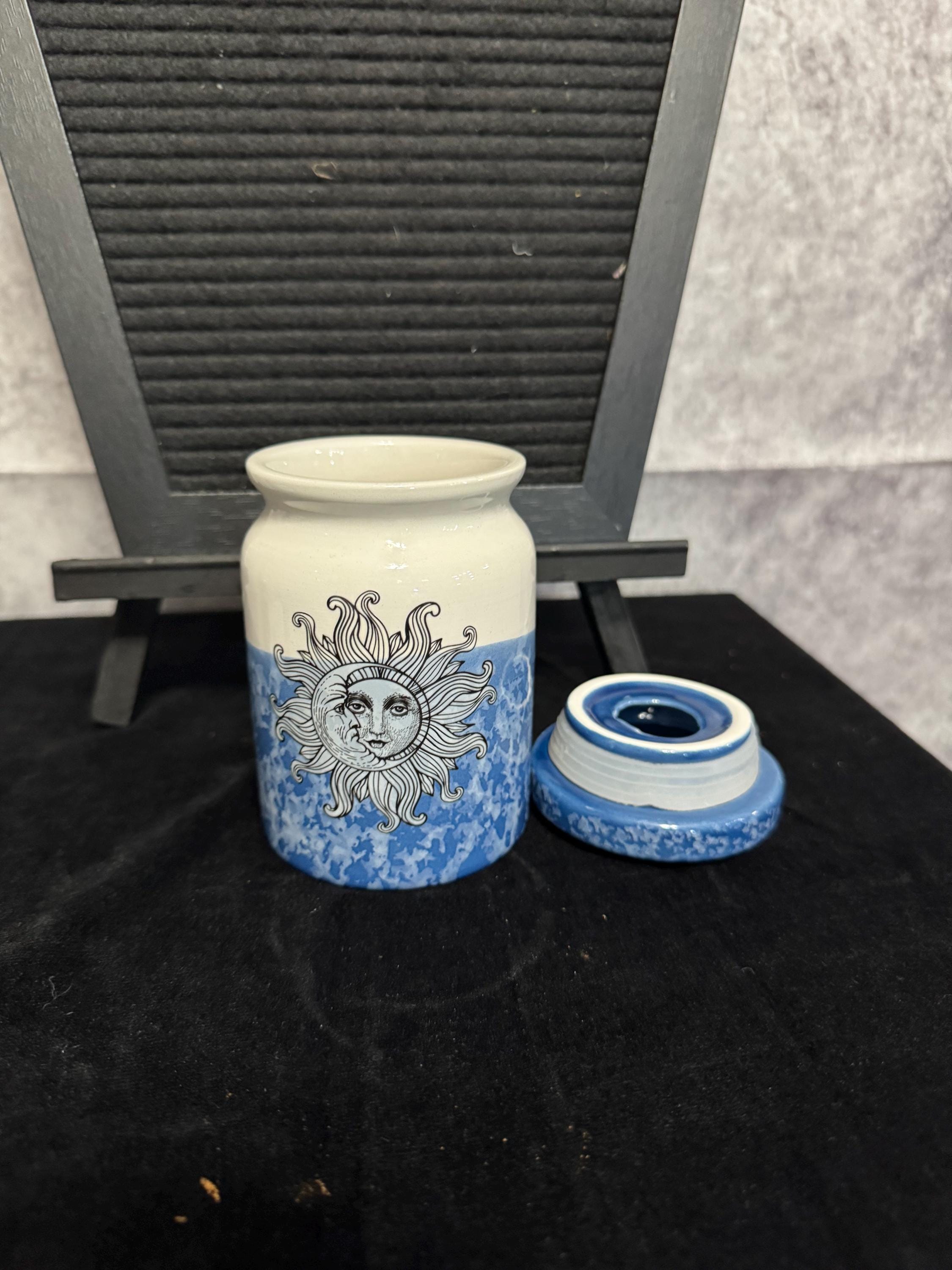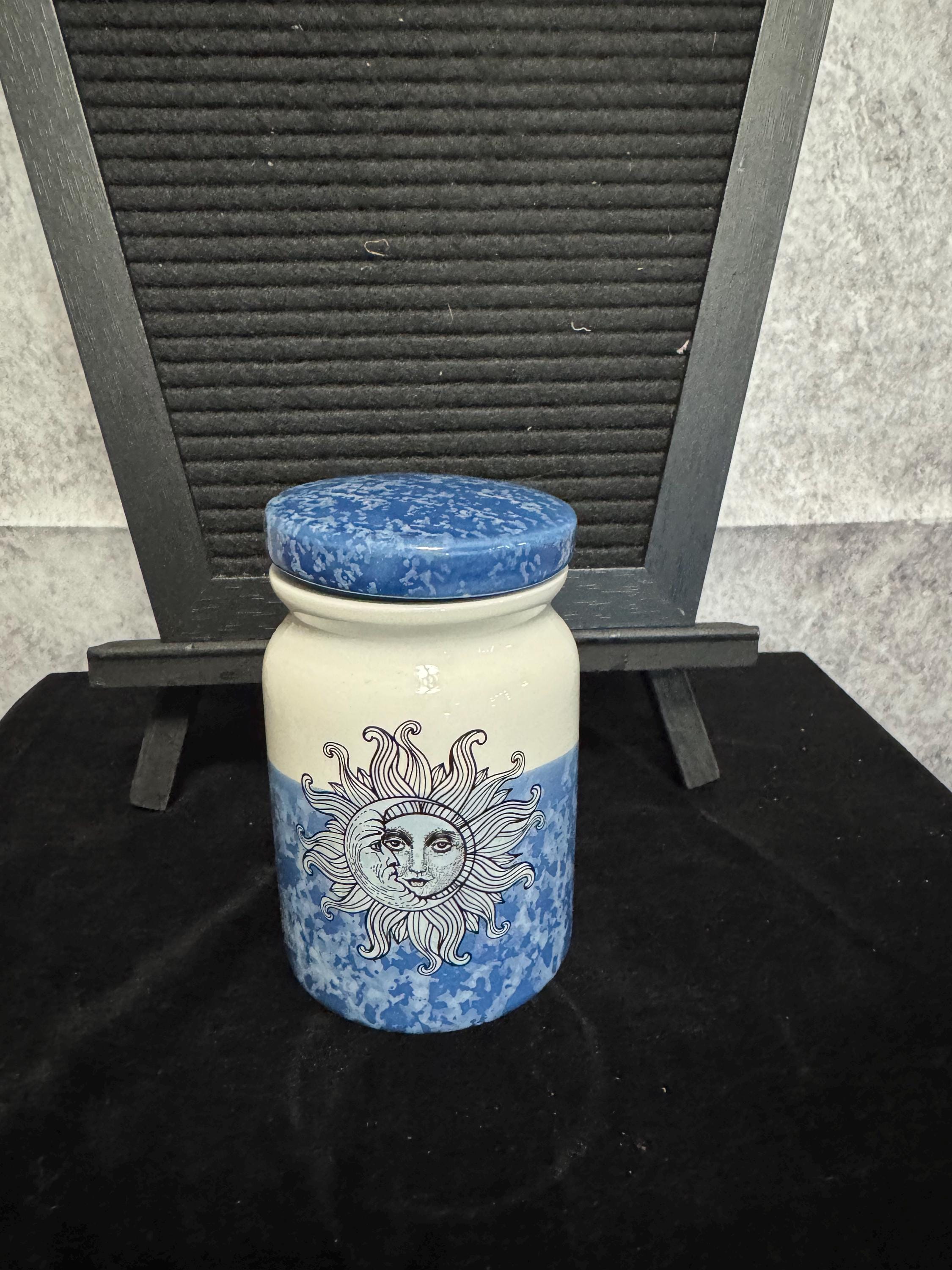Blue and White ceramic canister featuring a sun and half-moon design. The tip half of the canister is white, and the bottom half has a blue and white pattern. the lid is solid blue with a similar pattern to the bottom half.