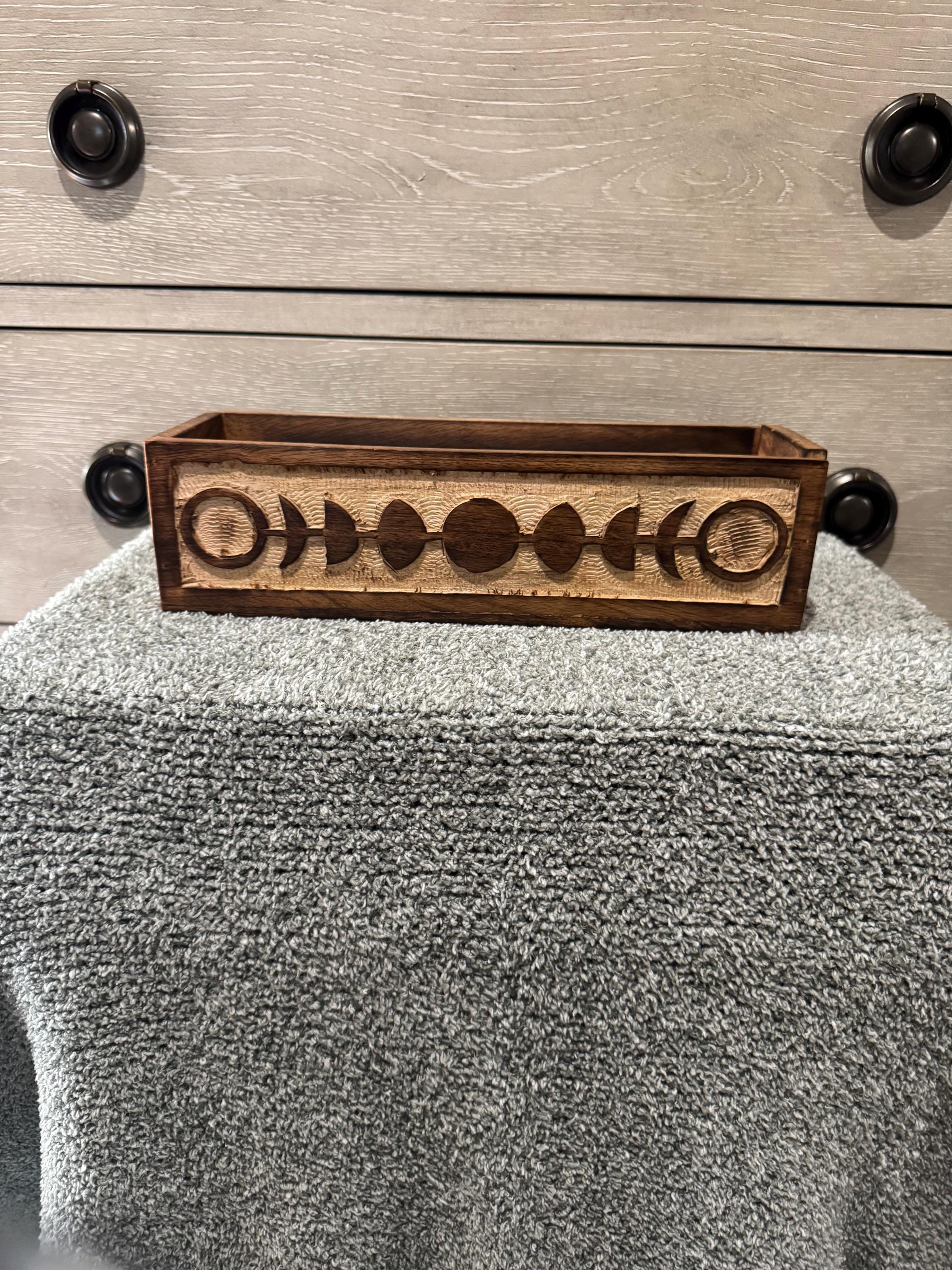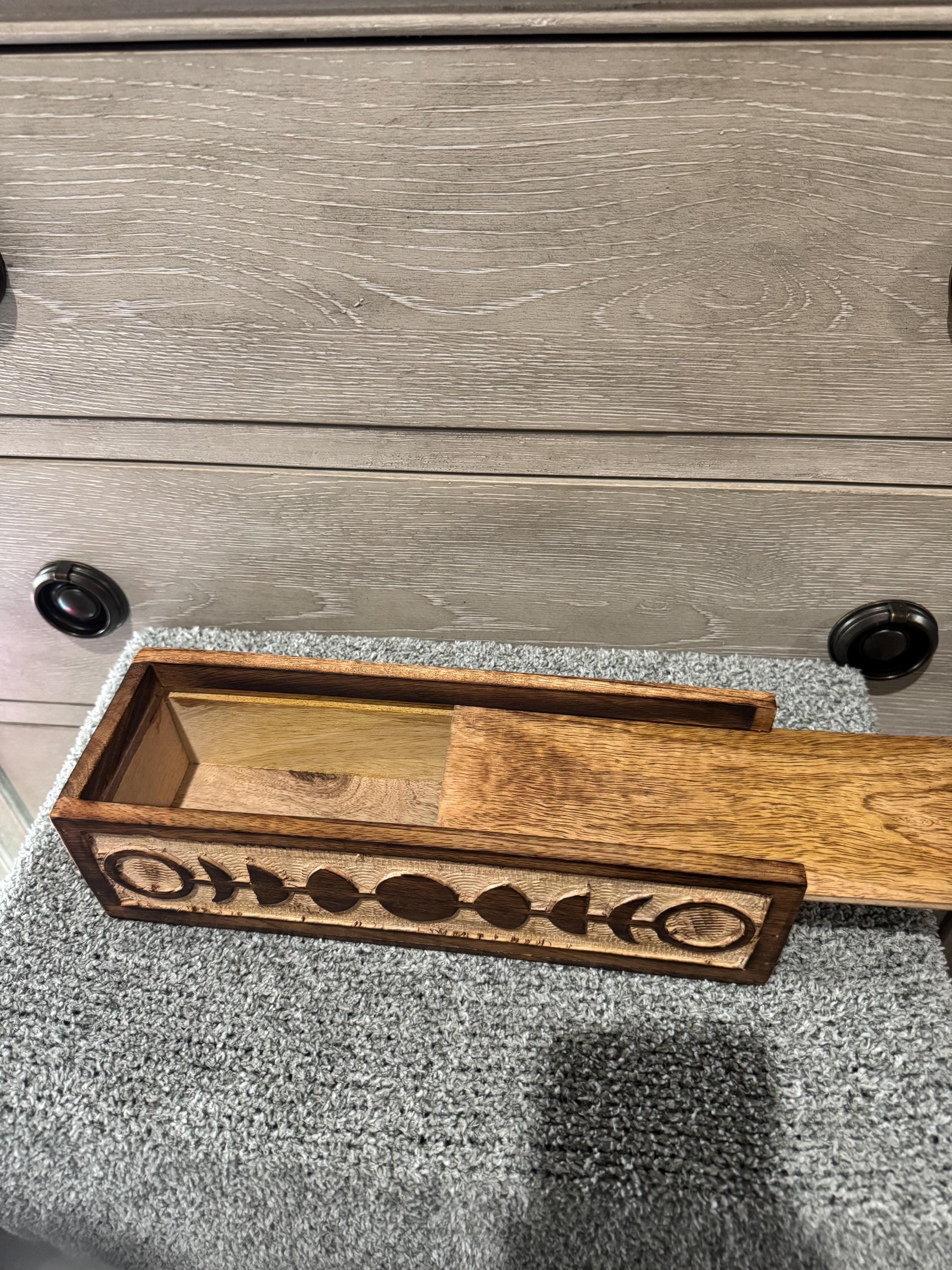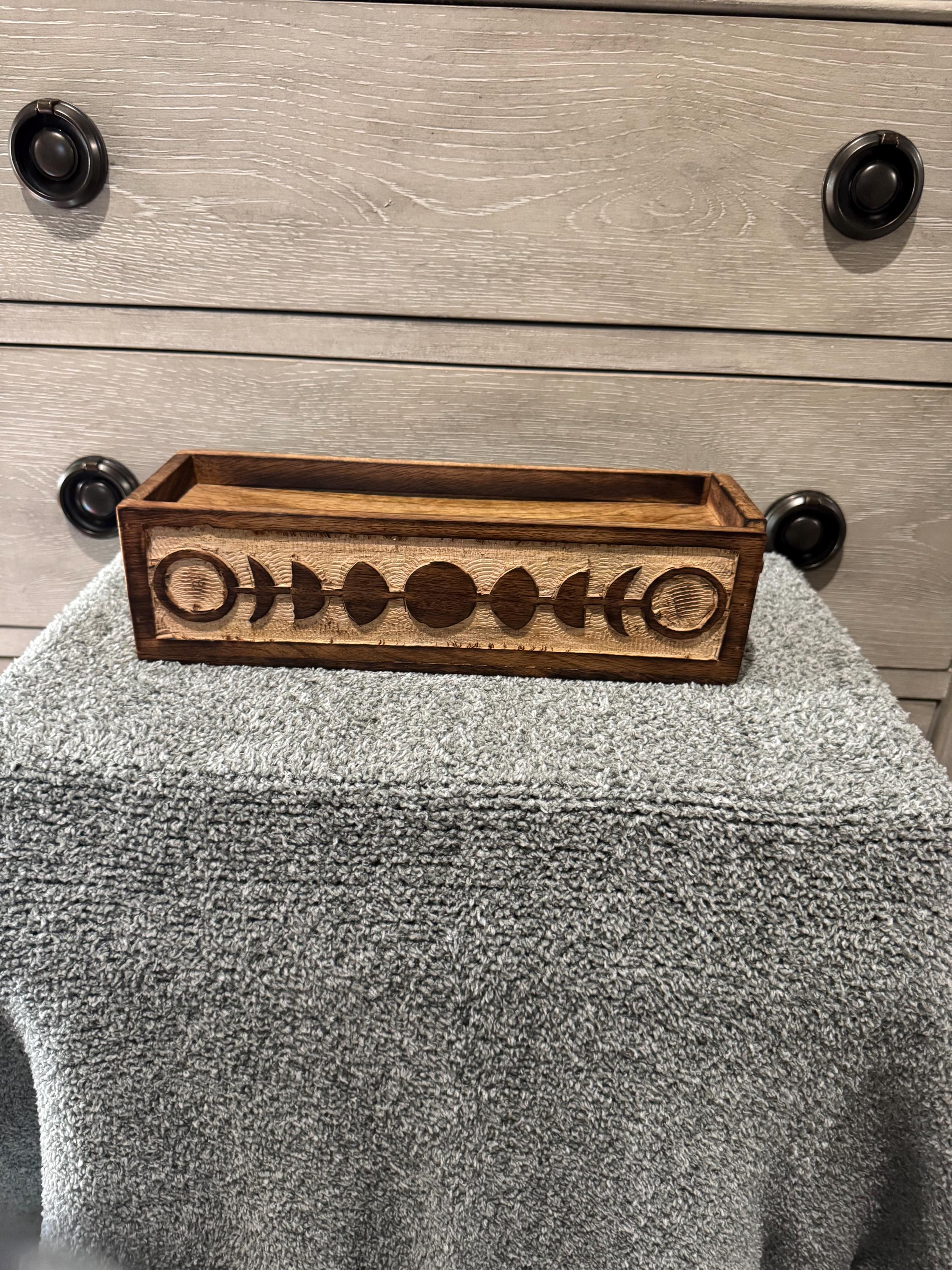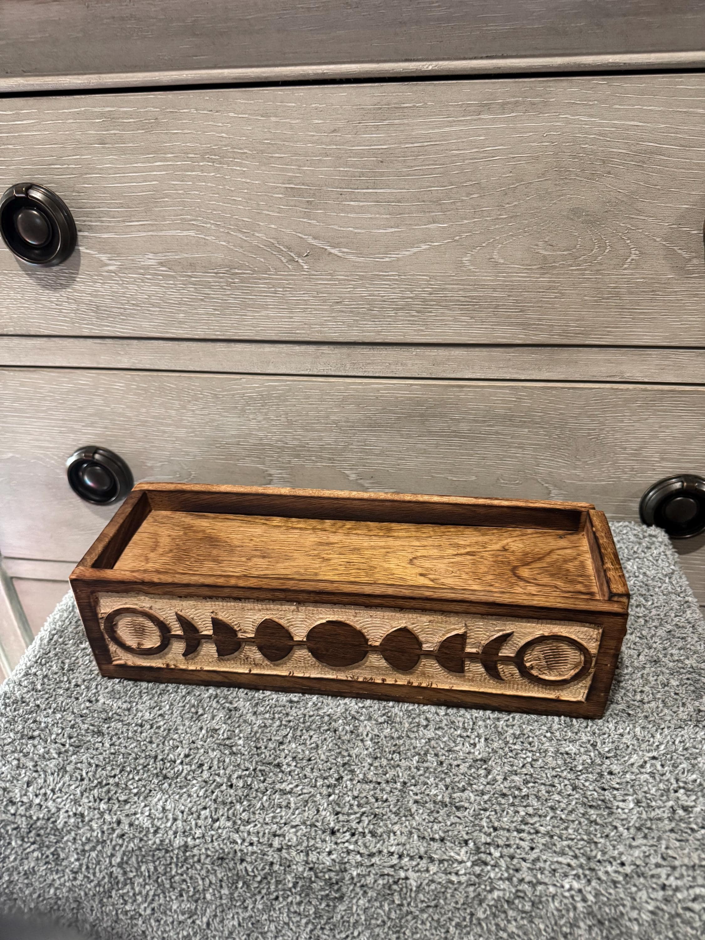 This is a decorative wooden box depicting the phases of the moon. The carving shows the moon from a new moon (the solid circle in the middle) to a full moon (the circles on the ends) and back again. The box is rectangular measures approximately 12"long 4"width and height 3.5". The top slides back to where there is an opening that's as big as the box for storage.