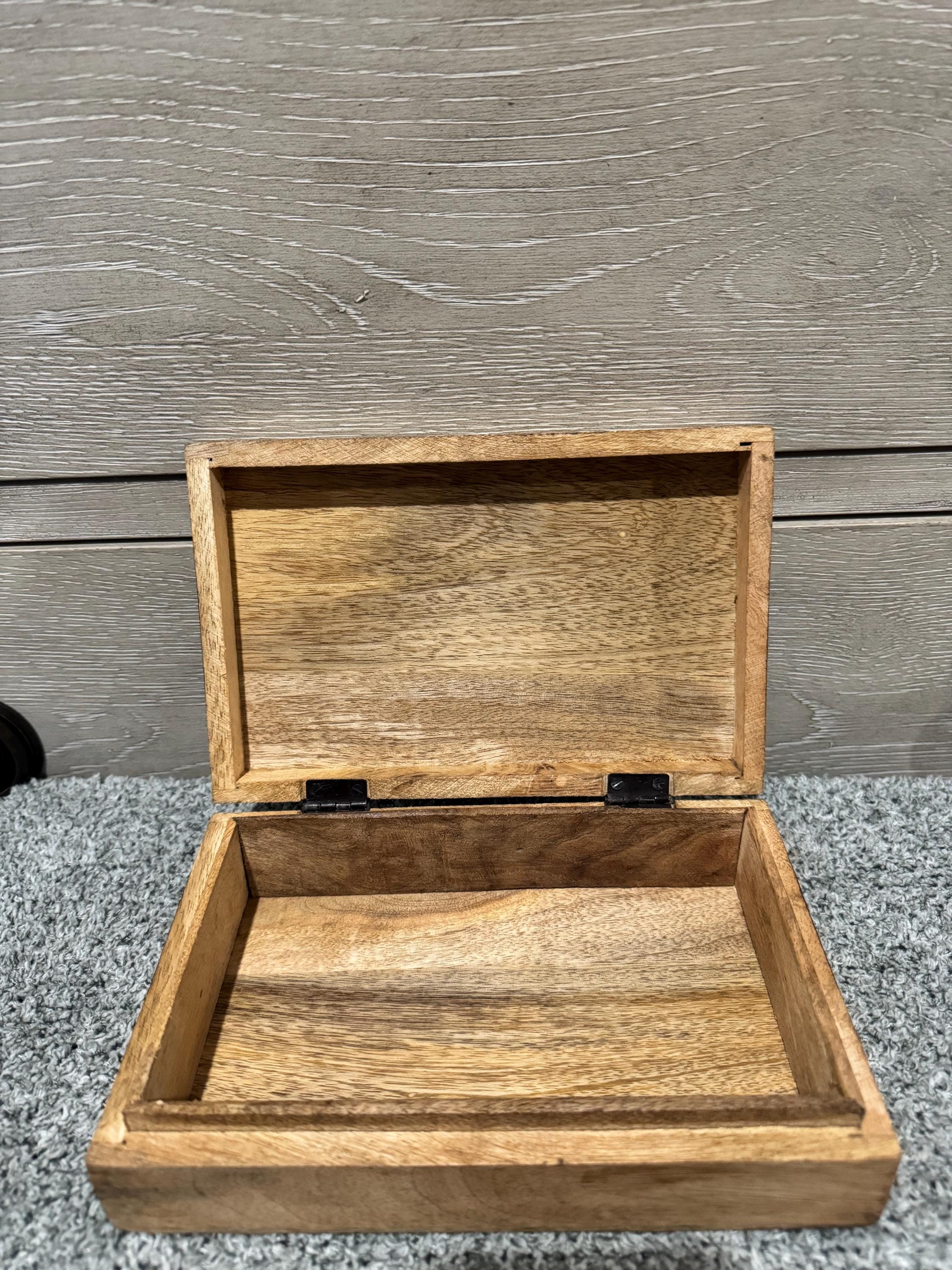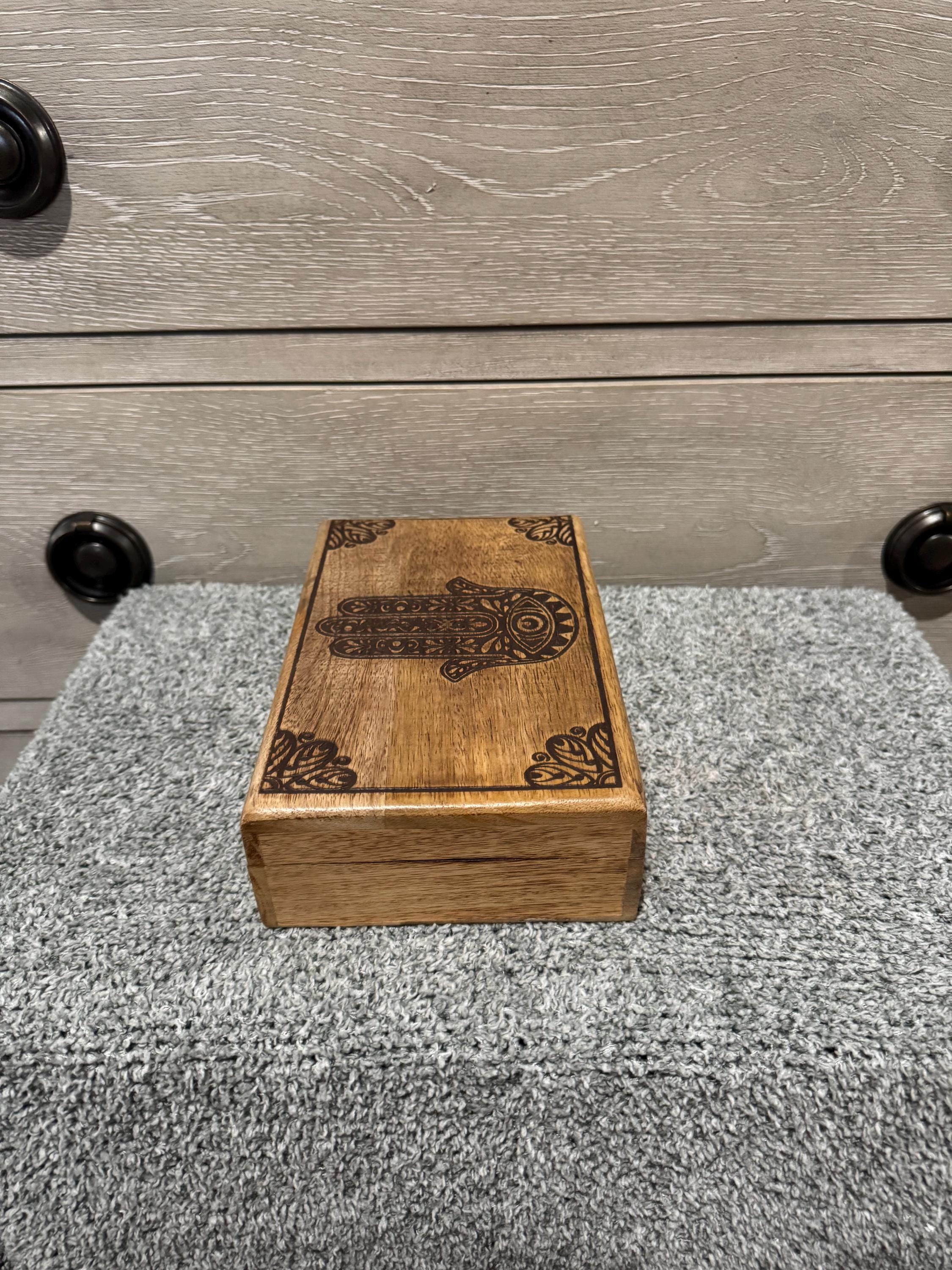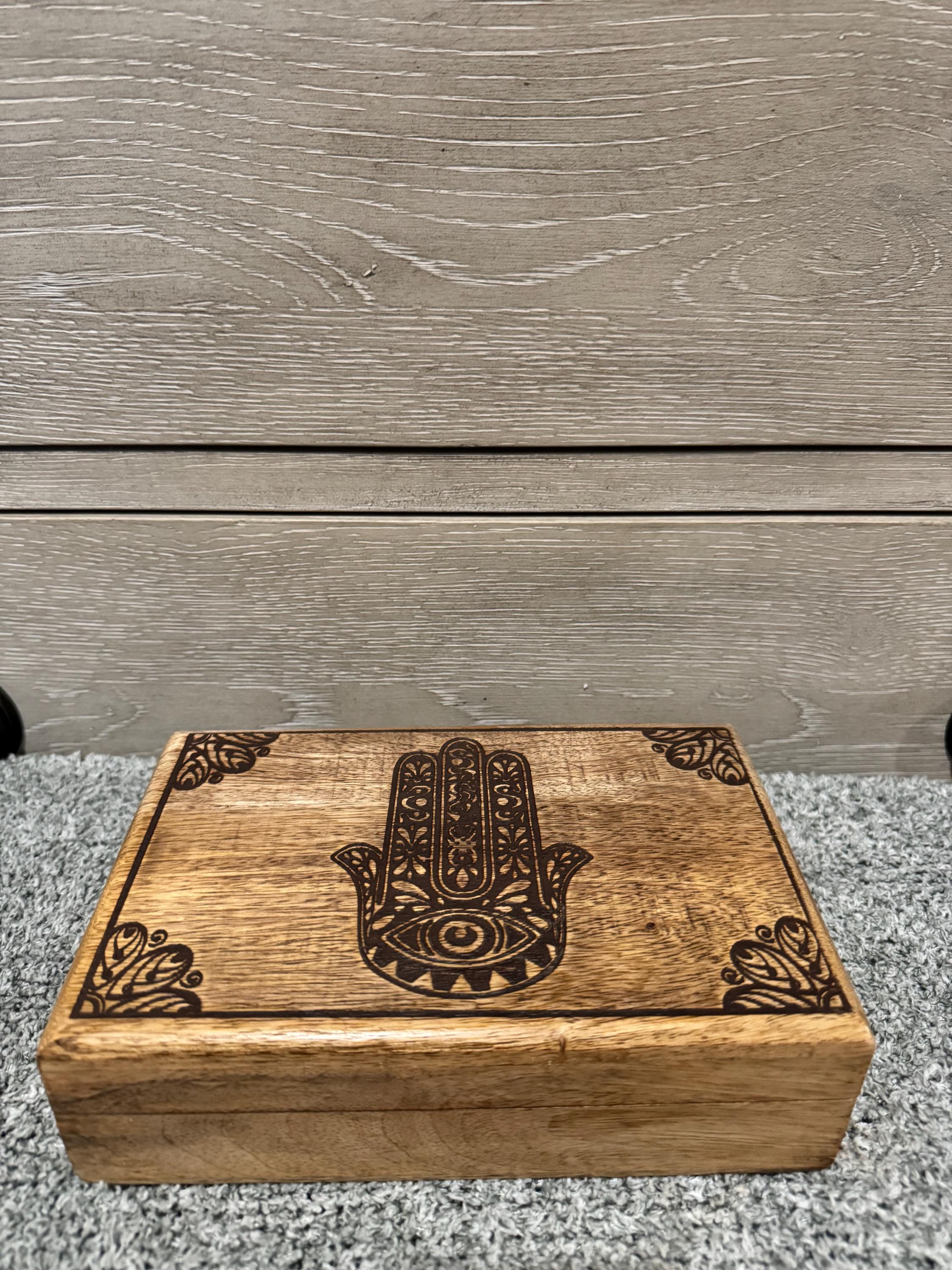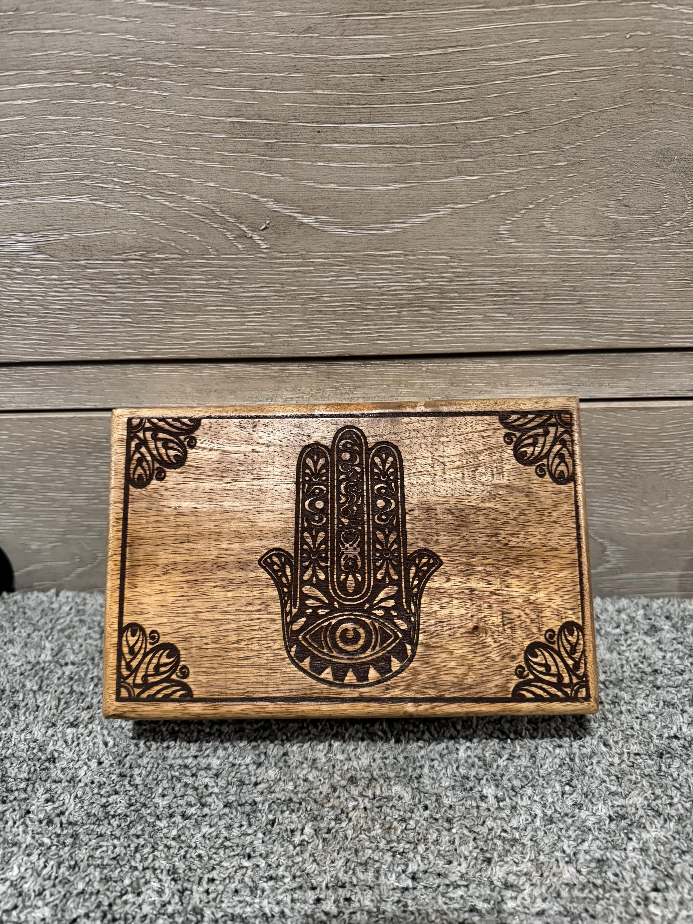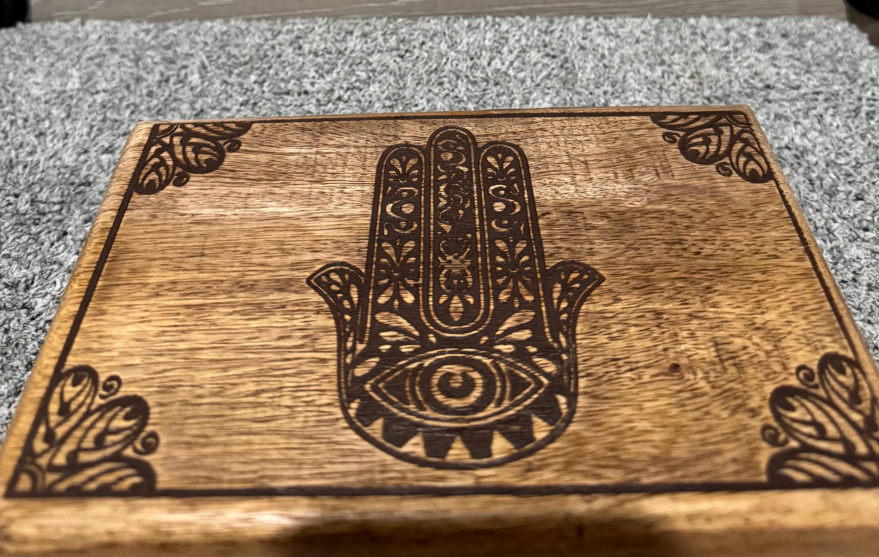 Wooden box with a carved Hamsa Symbol. The Hamsa, also known as the Hand of Fatima, is a palm-shaped amulet popular in North Africa and the Middle East. The Hamsa is a symbol of protection, believed to ward off negative energy and the evil eye.