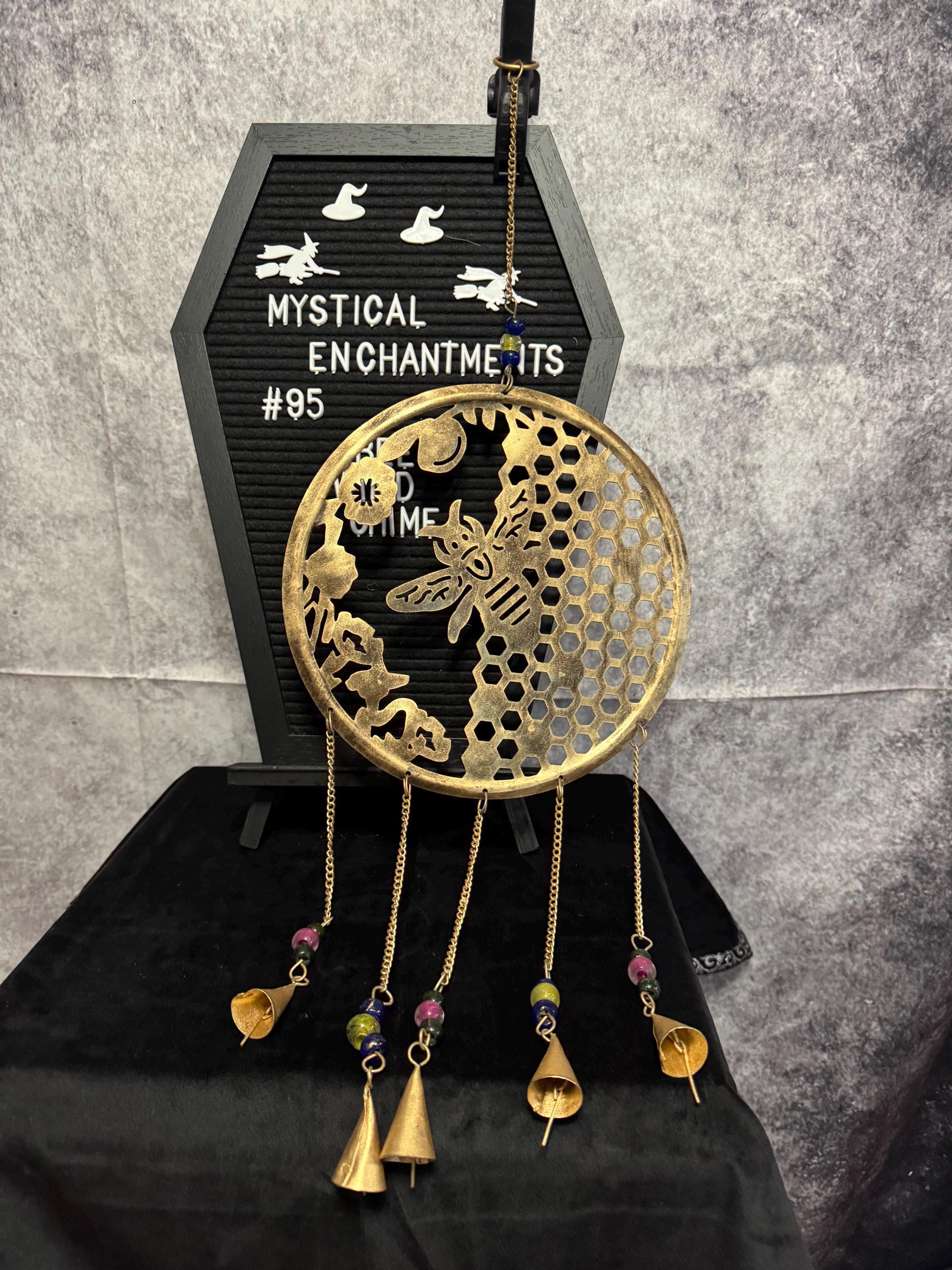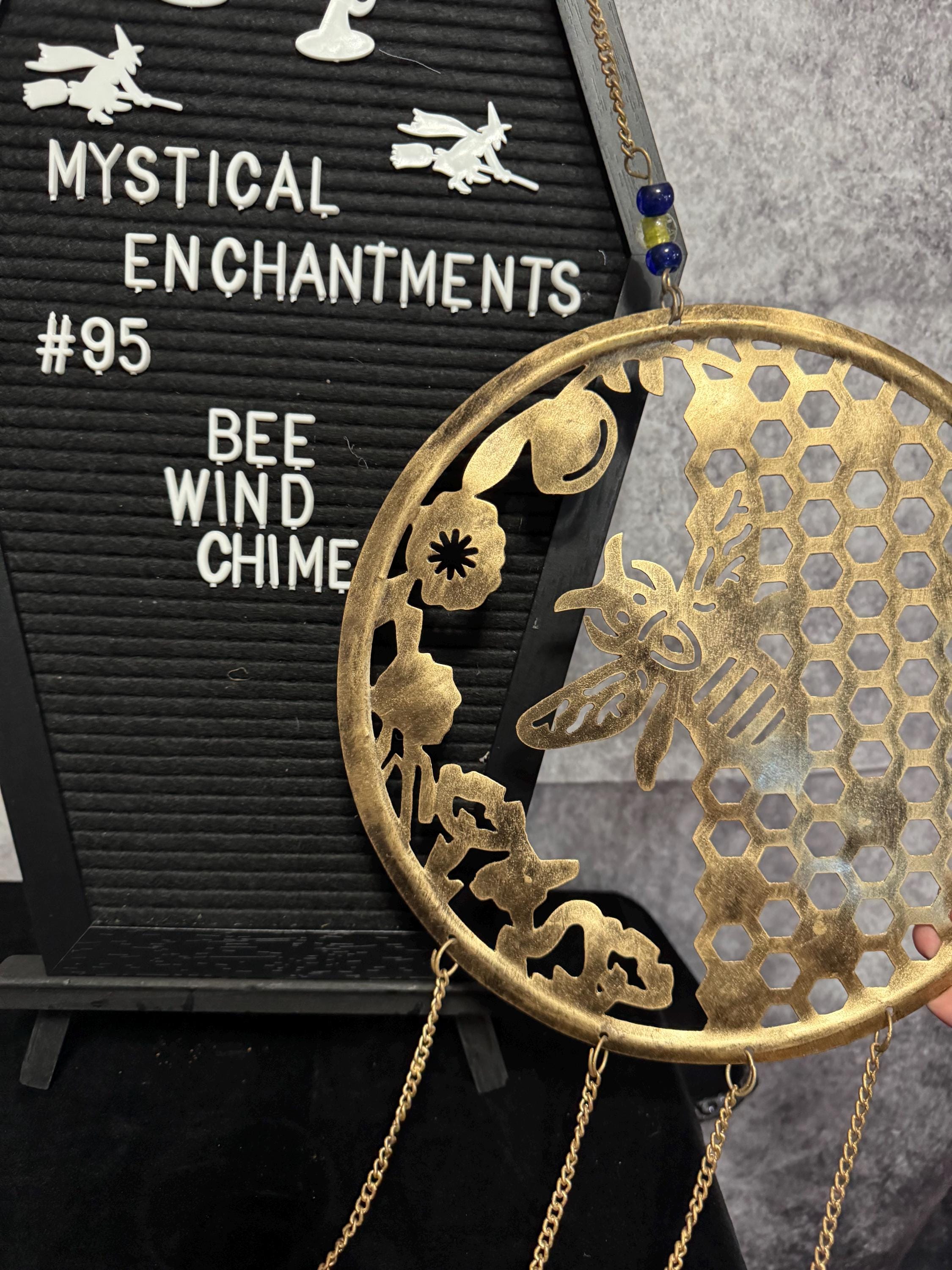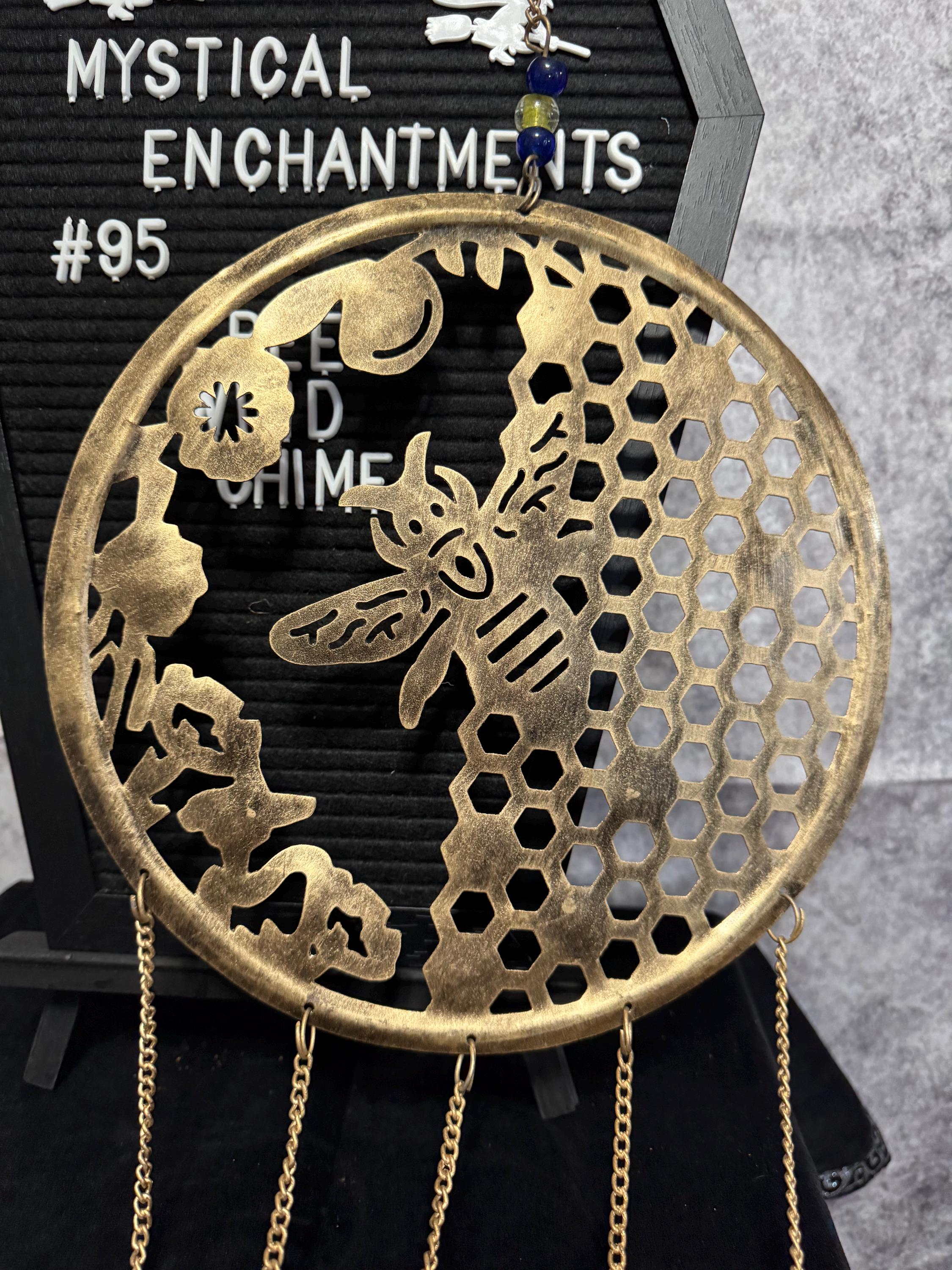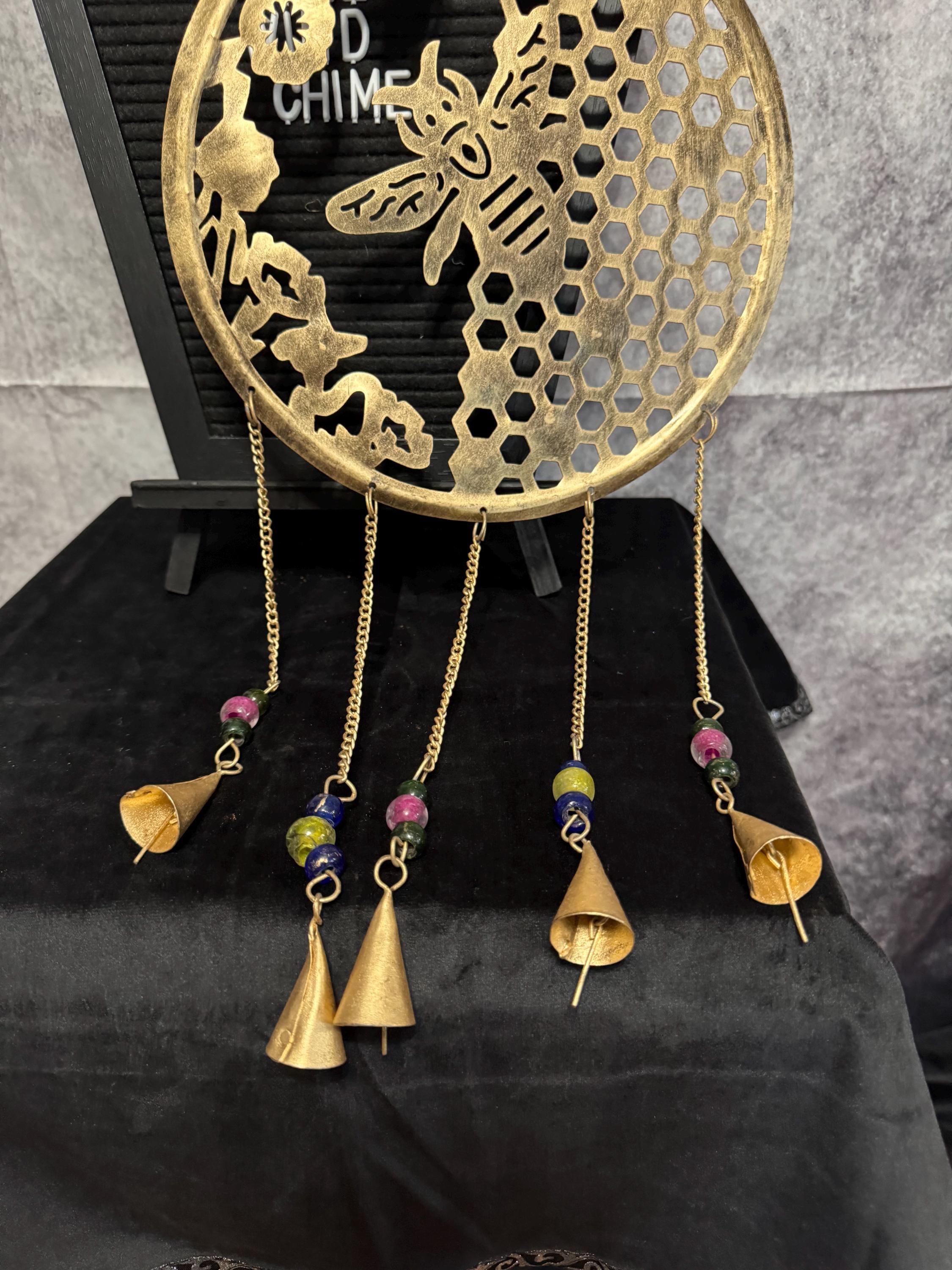 This is a metal wall art piece featuring a bee and a honeycomb design. This style can be described as farmhouse or rustic. It is typically made from metal, such as aluminum. The design is often described as a wall plaque or hanging decor. It has bells hanging at the bottom. It measures approximately 24" from top hanging piece to the bottom of the middle bell.