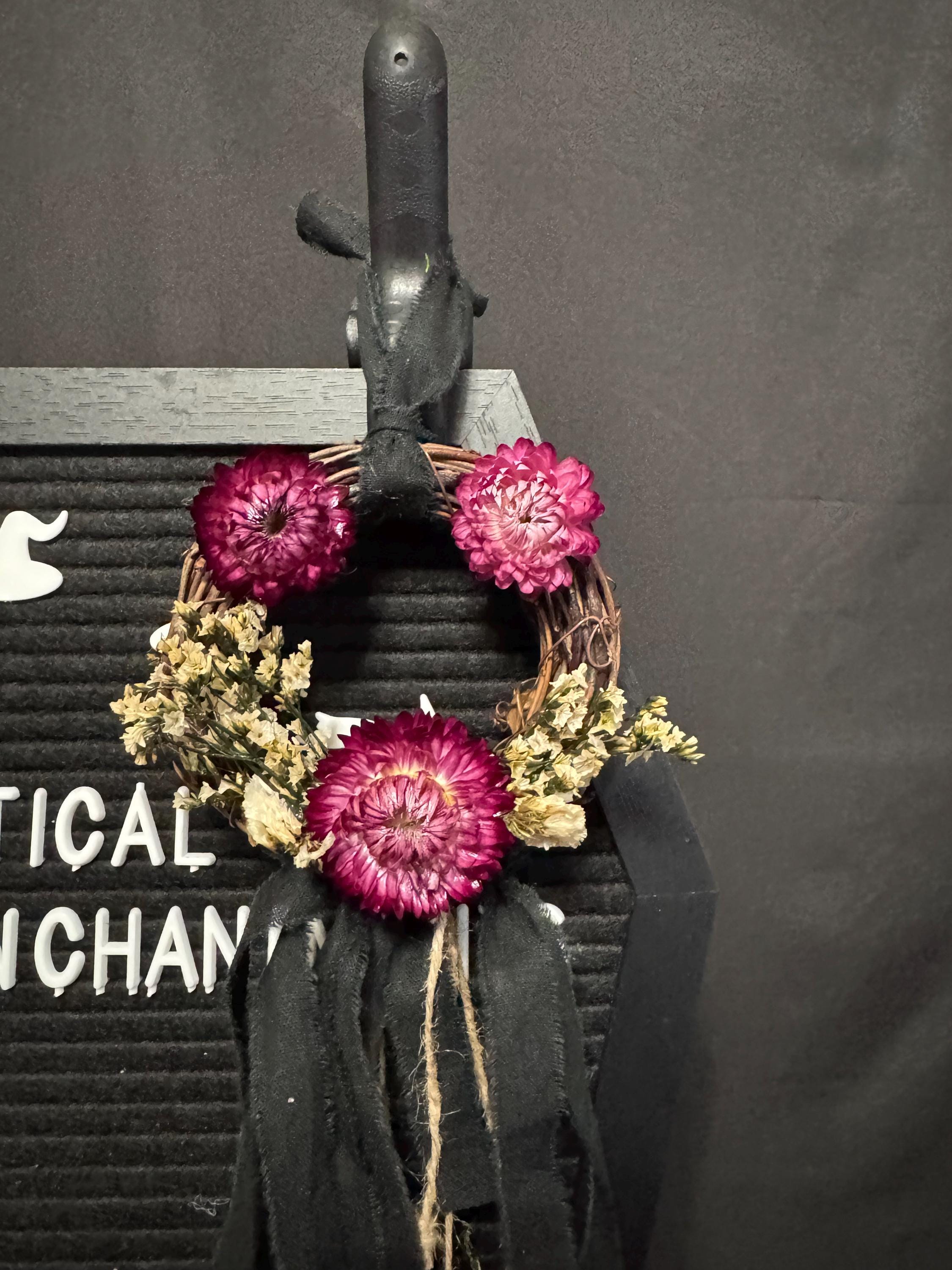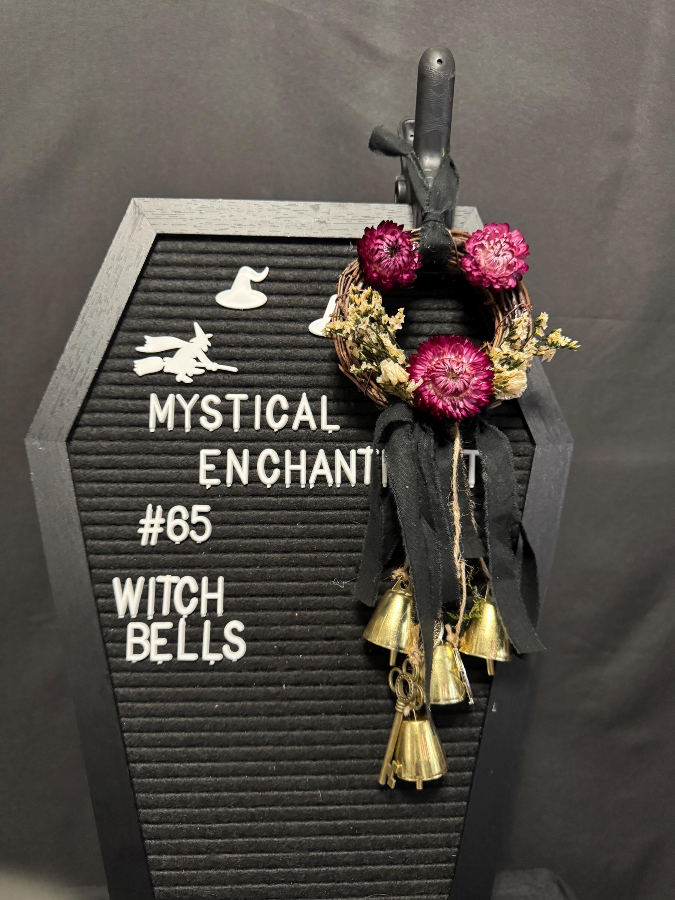 Witch Bells made with real Dried Flowers. Grapevine Vine Measures 4" and has 4 bronze bells and charms. Witches' bells are primarily used for protection and clearing negative energy from a home or sacred space. They are hung on doorknobs or near entrances to chime and ward off unwanted spirits or energy as the door opens and closes. They are also used as a decorative item and in carious rituals for protection, cleansing, or to summon spirits.