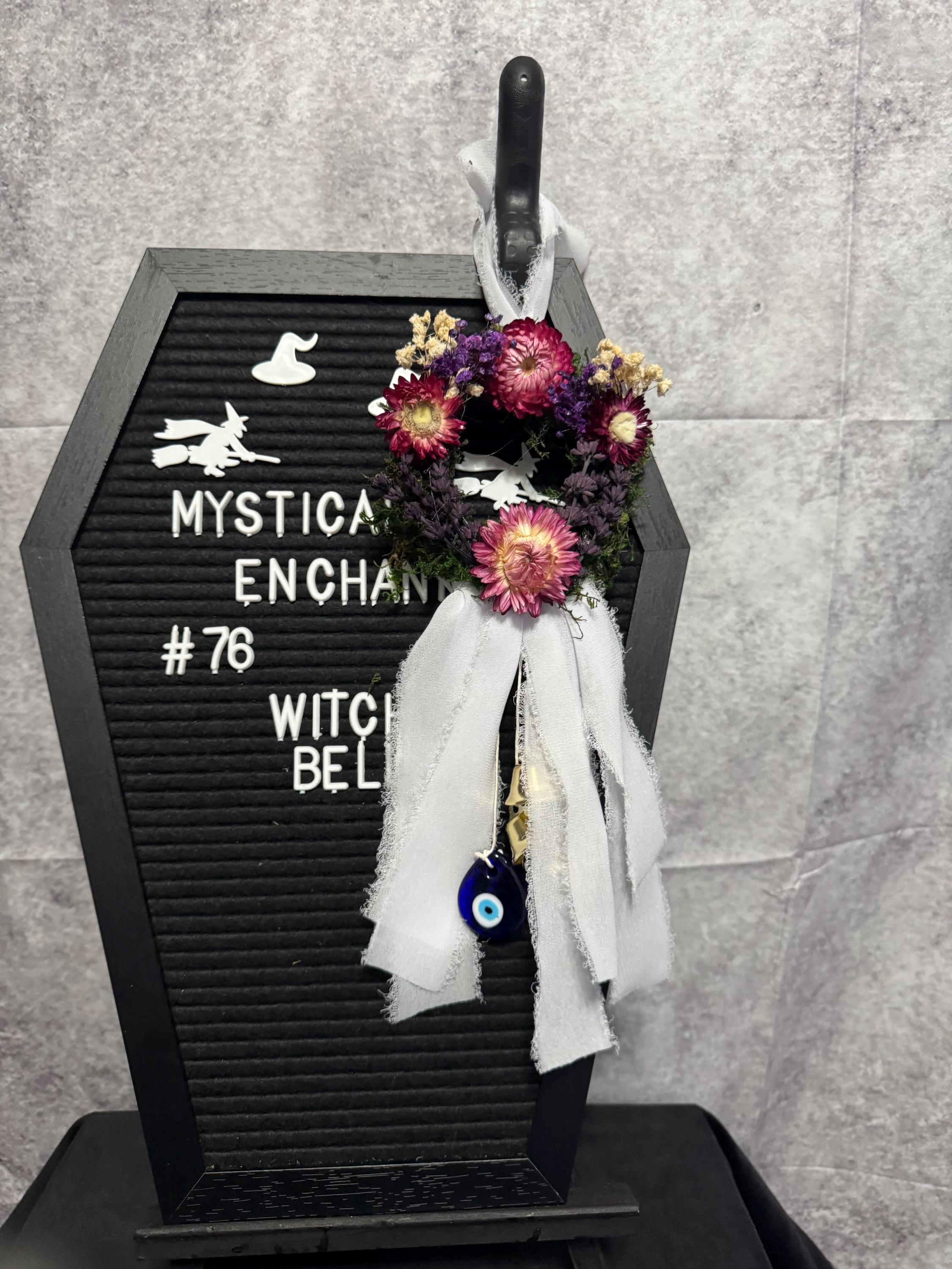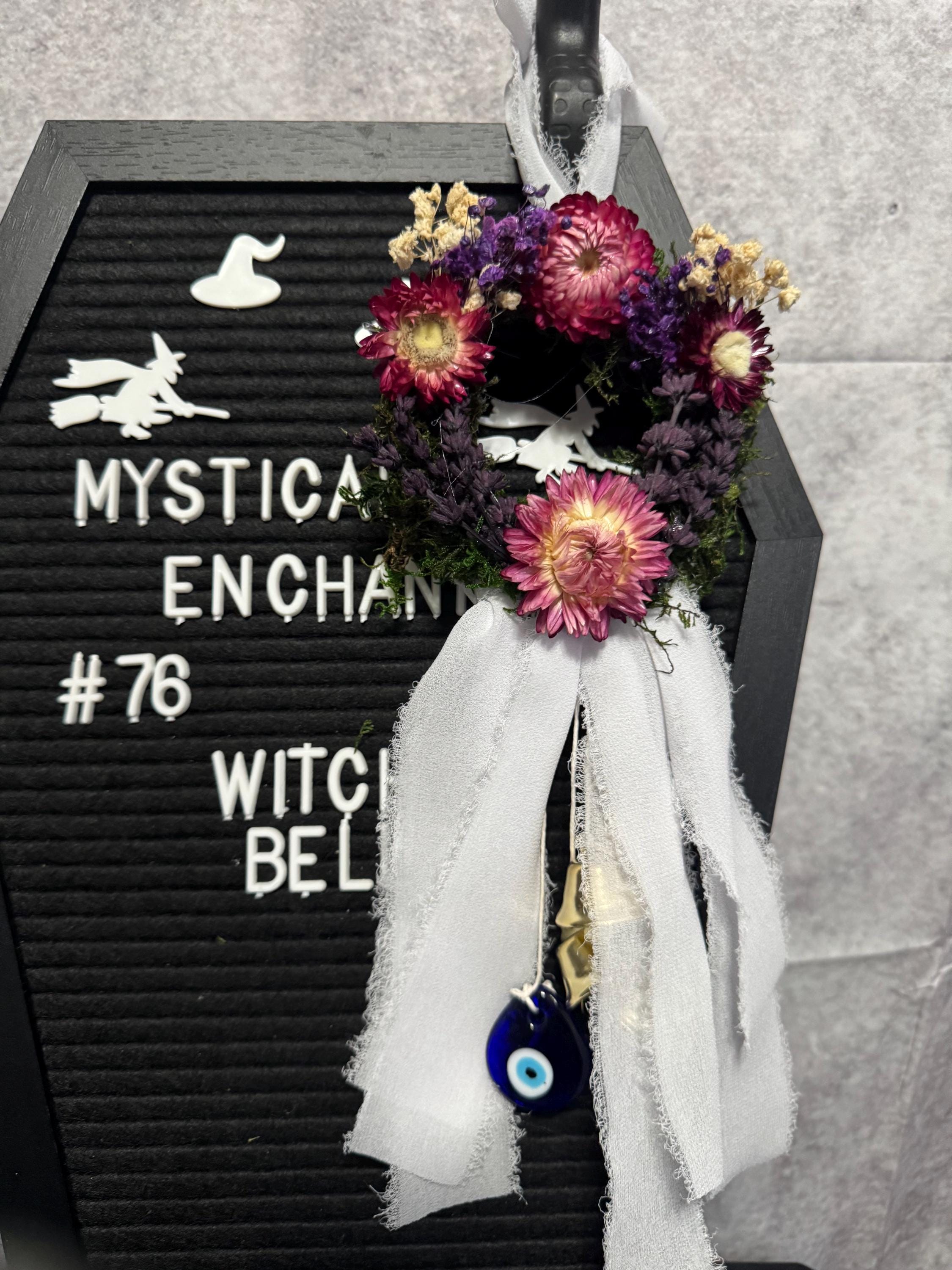 Witch Bells made with real dried flowers, charms, bells, ribbon, and 4" grapevine wreath. Witches' Bells are primarily used for protection and clearing negative energy from a home or sacred space. They are hung on doorknobs or near entrances to chime and ward off unwanted spirits or energy as the door opens and closes. They are also used as a decorative item and in various rituals for protection, cleansing, or to summon spirits.