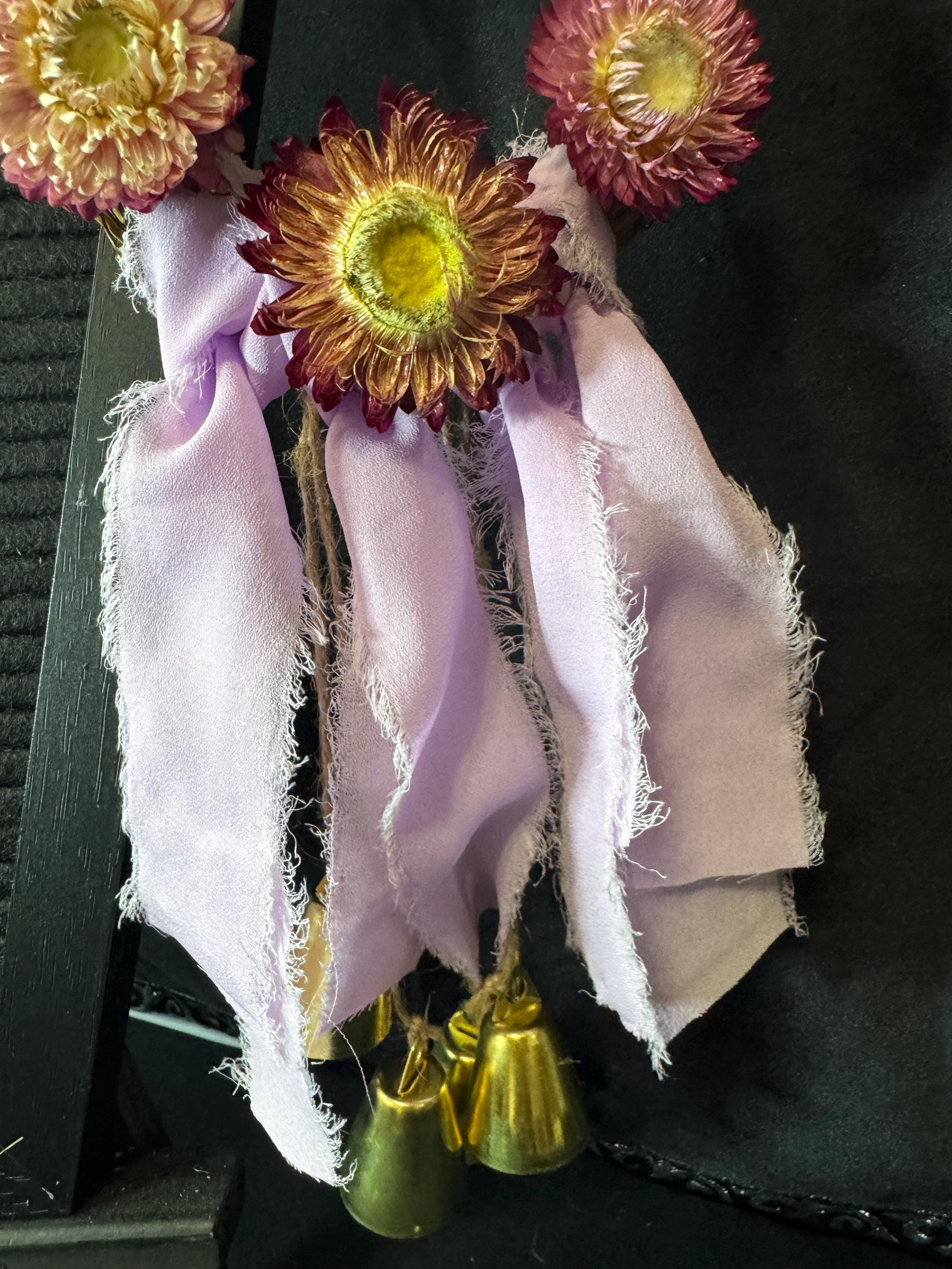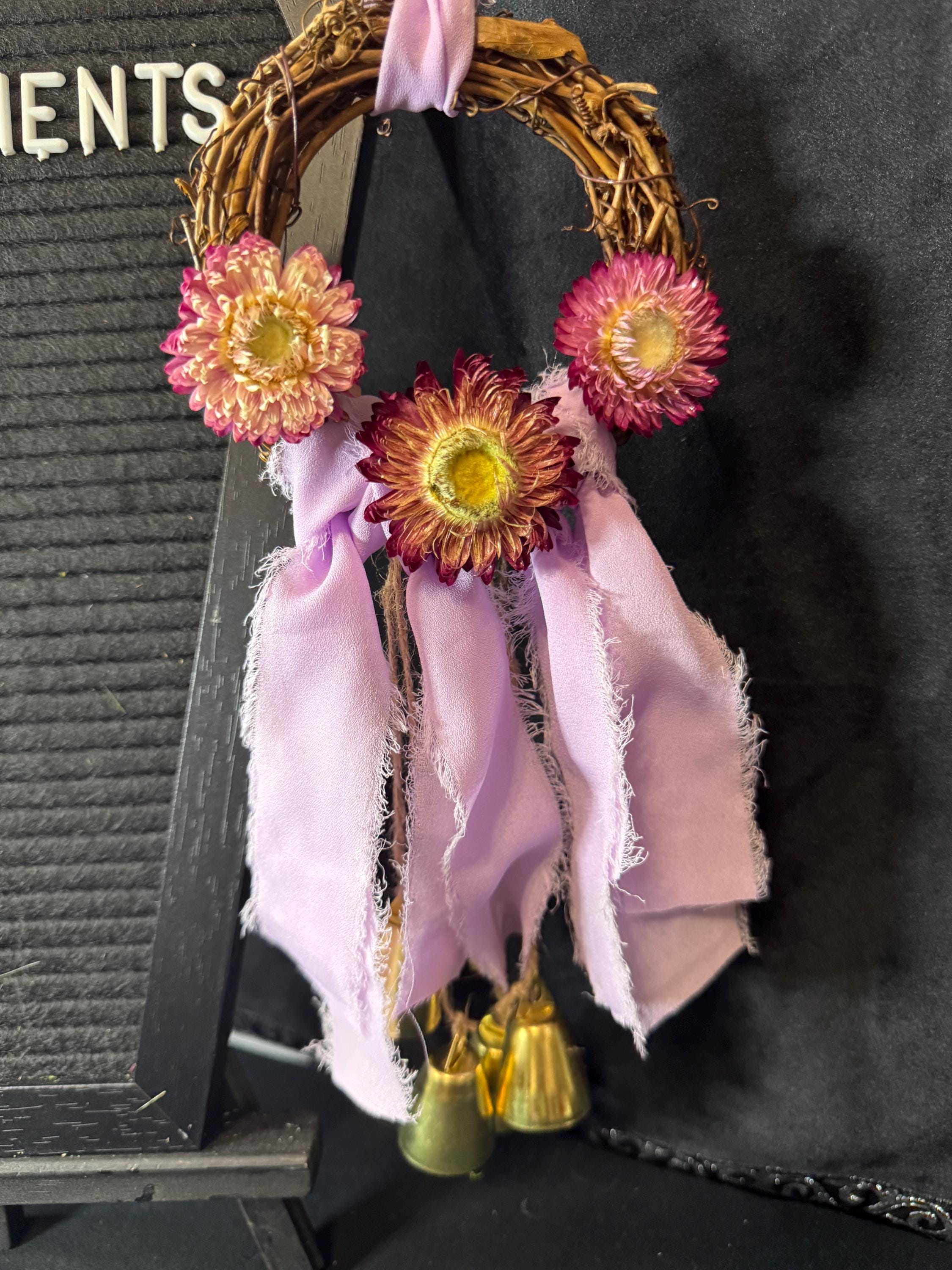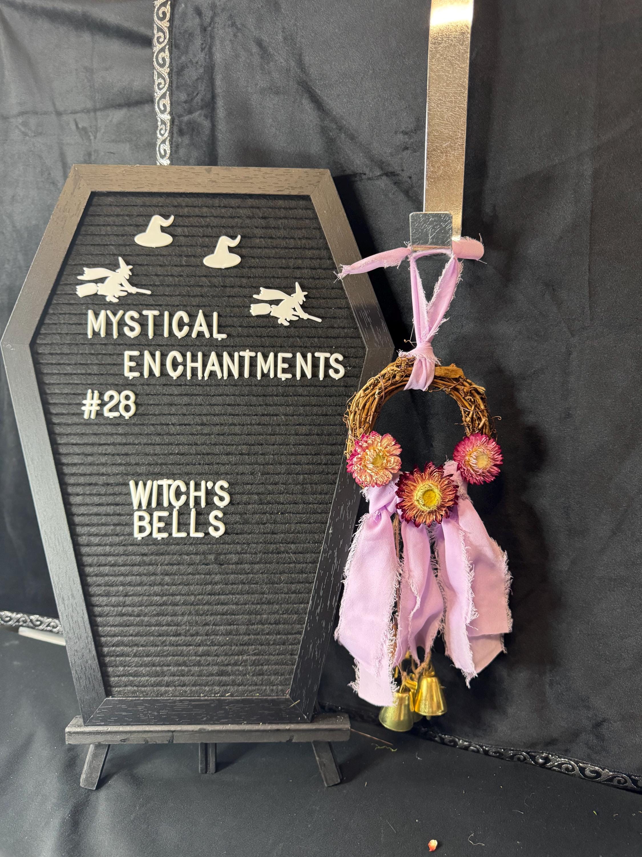 Witch Bells made with Real Dried Flowers, bells, charms, ribbon, and 3" grapevine wreath. Witches' Bells are primarily used for protection and clearing negative energy from a home or sacred space. They are hung on doorknobs or near entrances to chime and ward off unwanted spirits or energy as the door opens and closes. They are also used as a decorative item and in various rituals for protection, cleansing, or to summon spirits. Blessed Be!