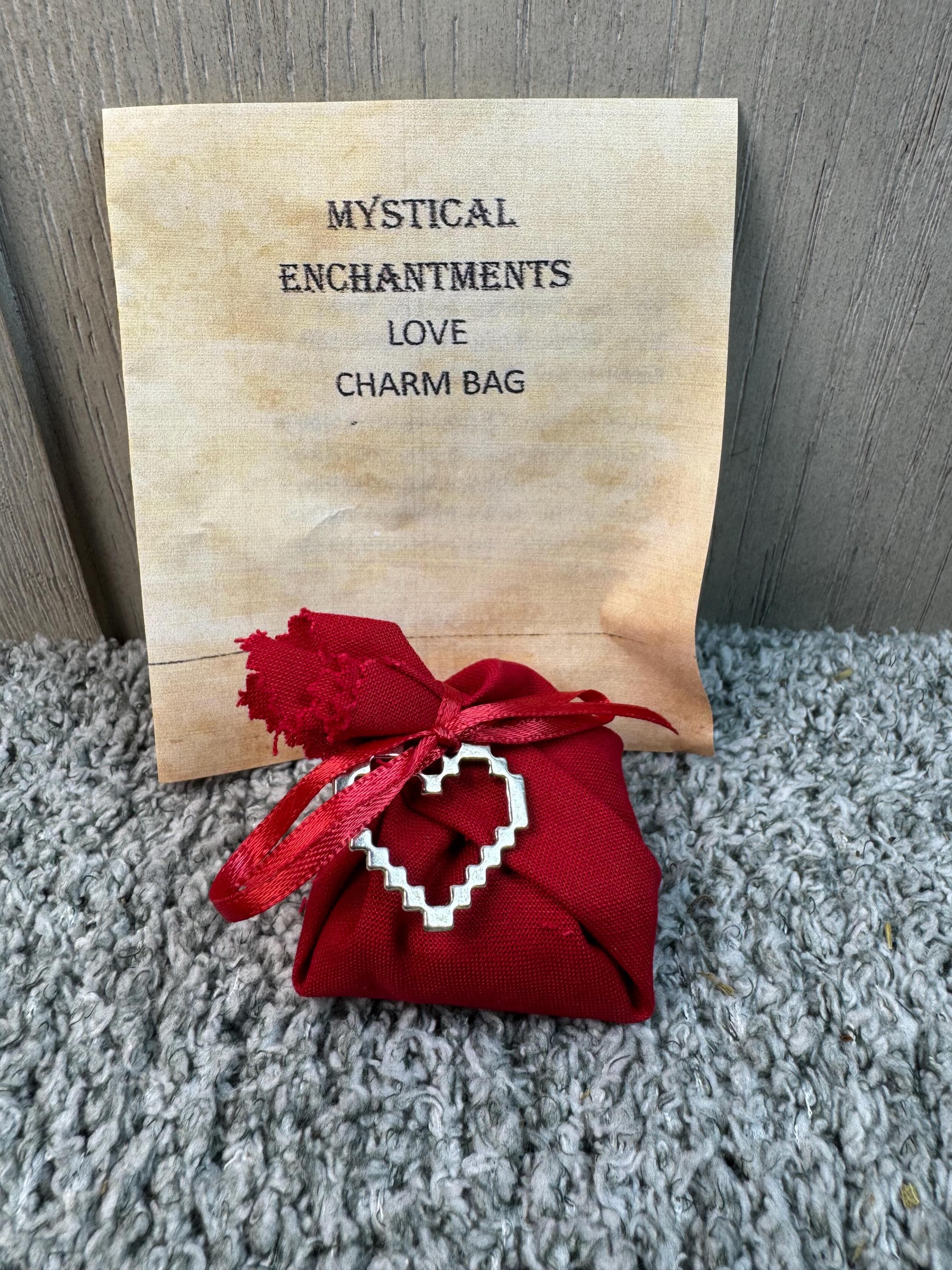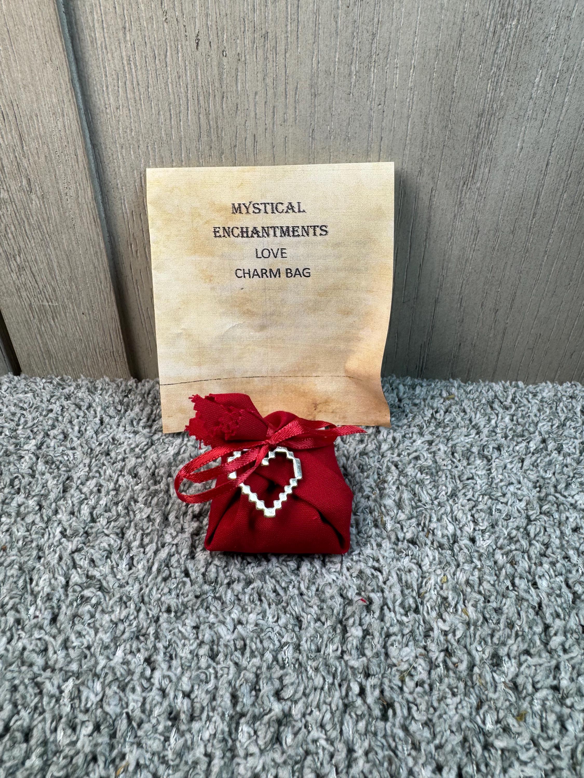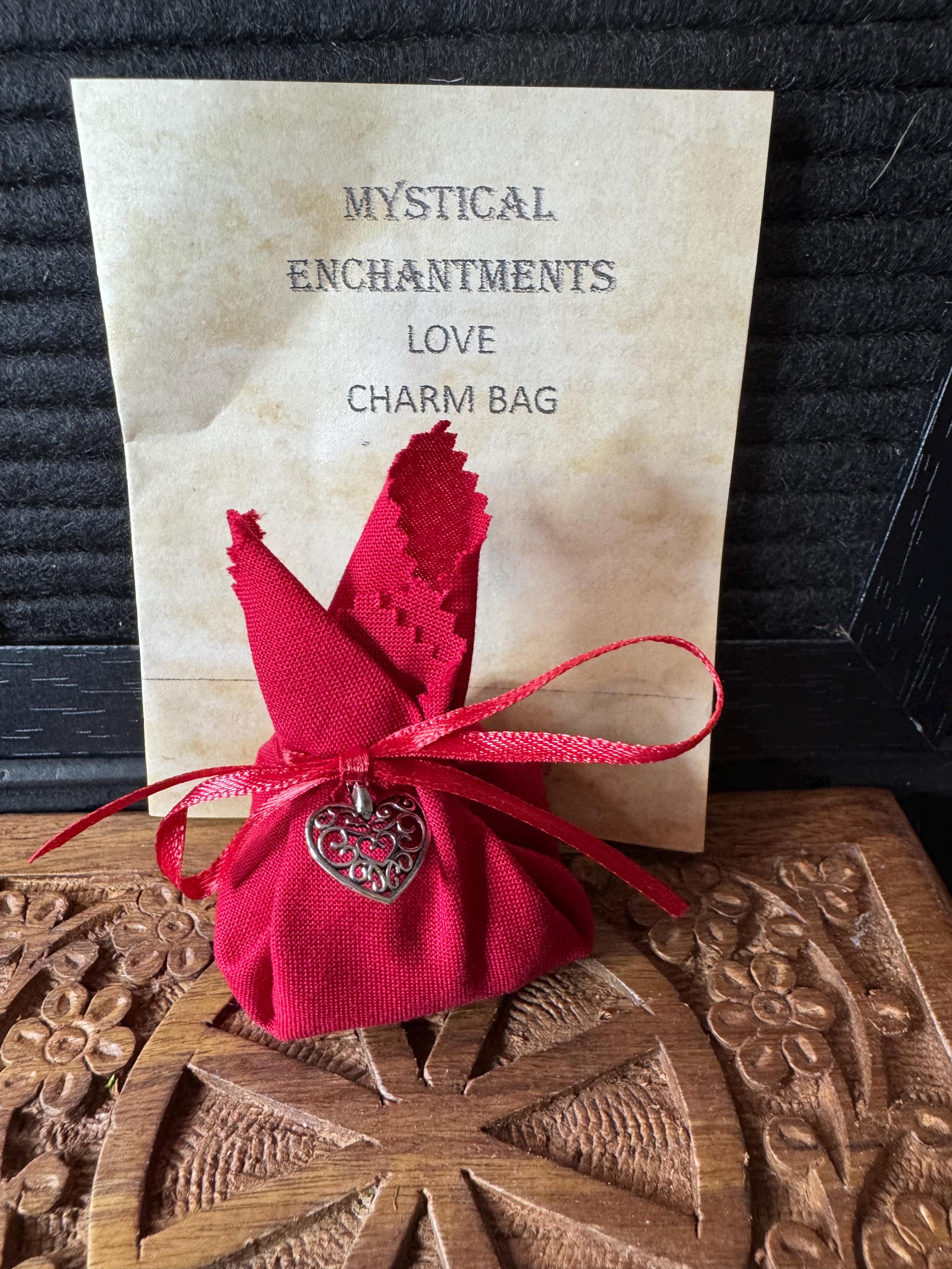 A Love Charm Bag, also known as a mojo or gris-gris bag, is a pouch containing symbolic items used to attract love, promote harmony in a relationship, or manifest a specific romantic outcome. It is created with focused intention and specific ingredients like herbs, crystals, and amulets, and then carried or kept in a special place to hold and direct spiritual energy.