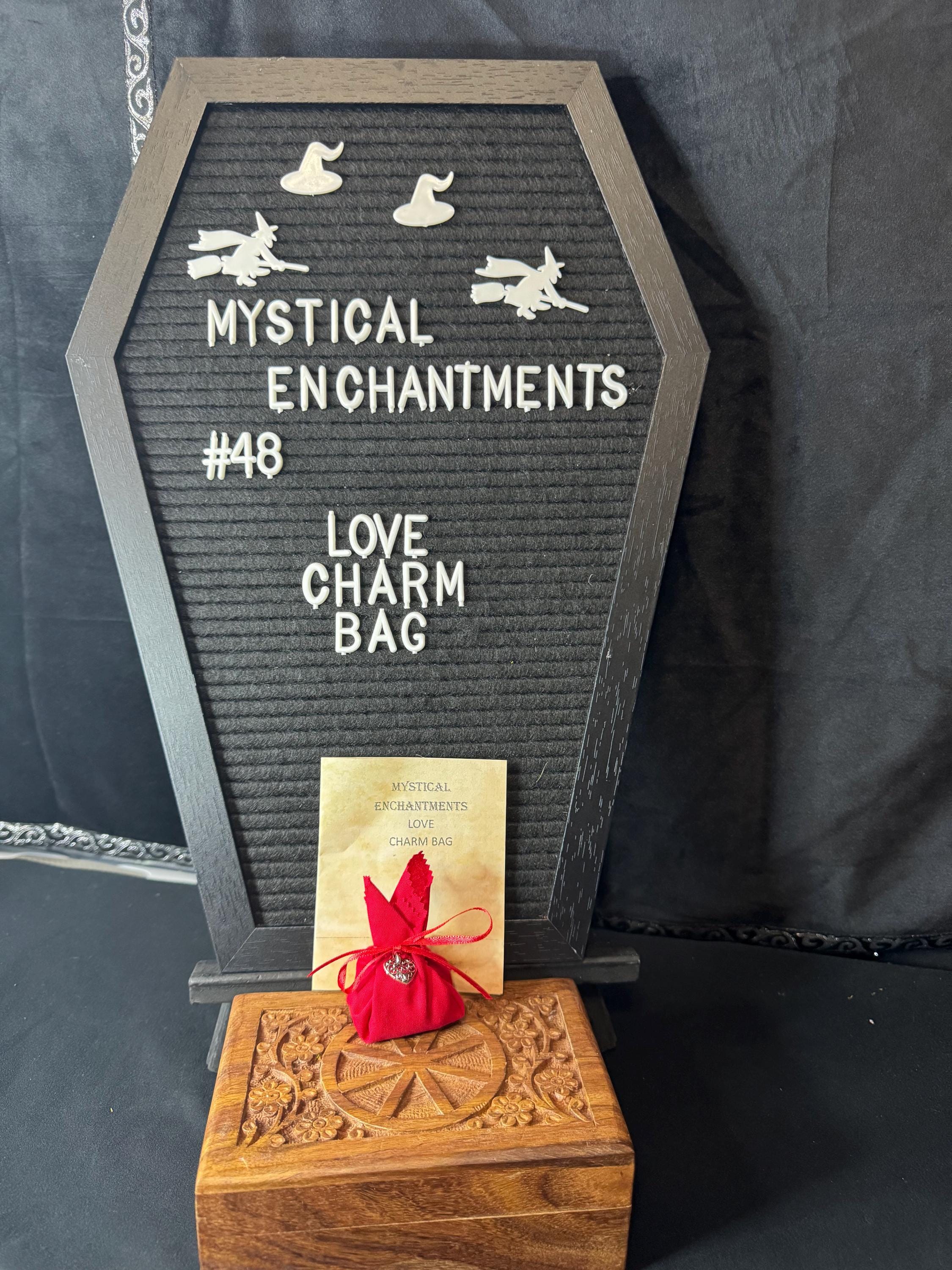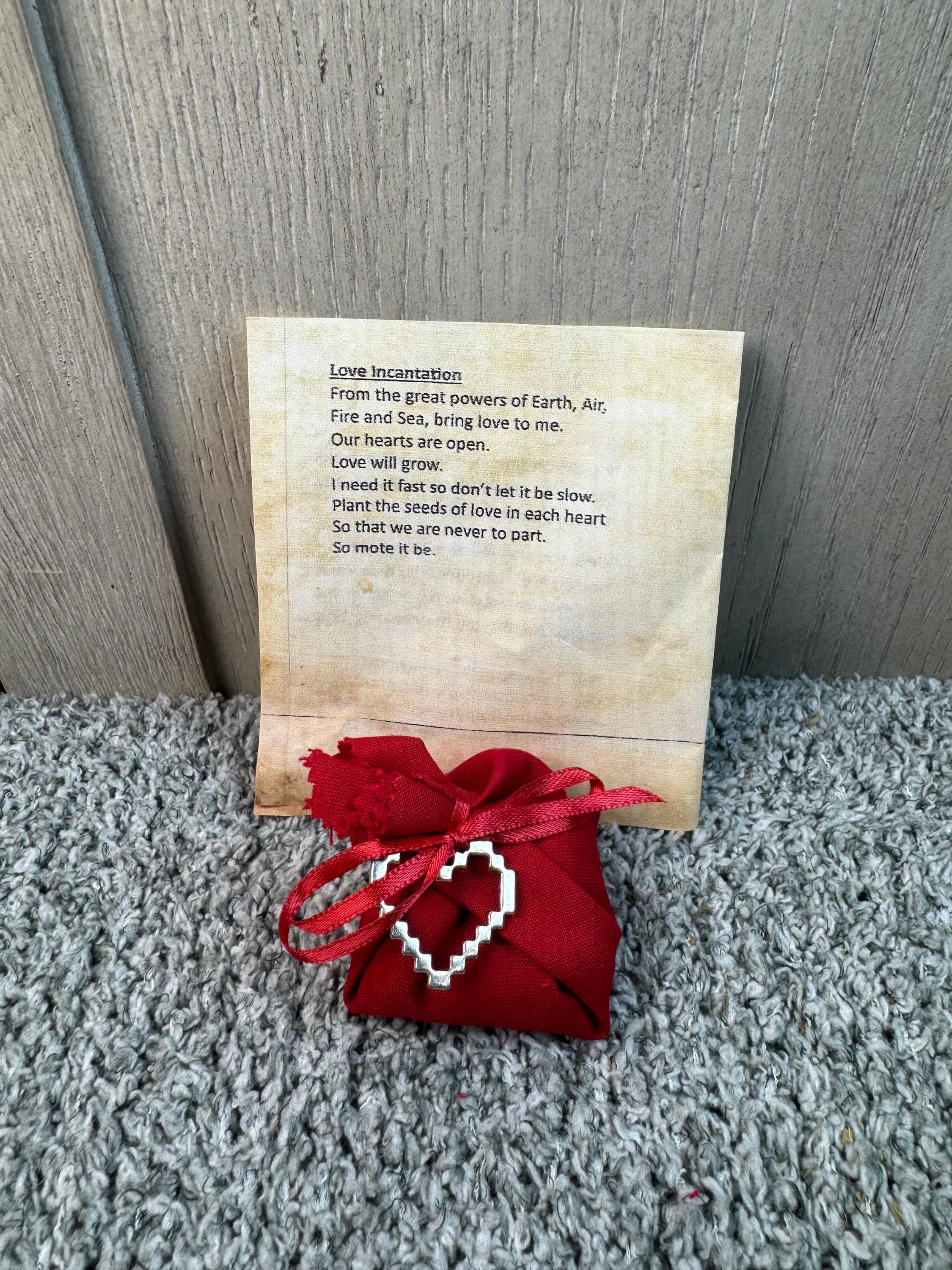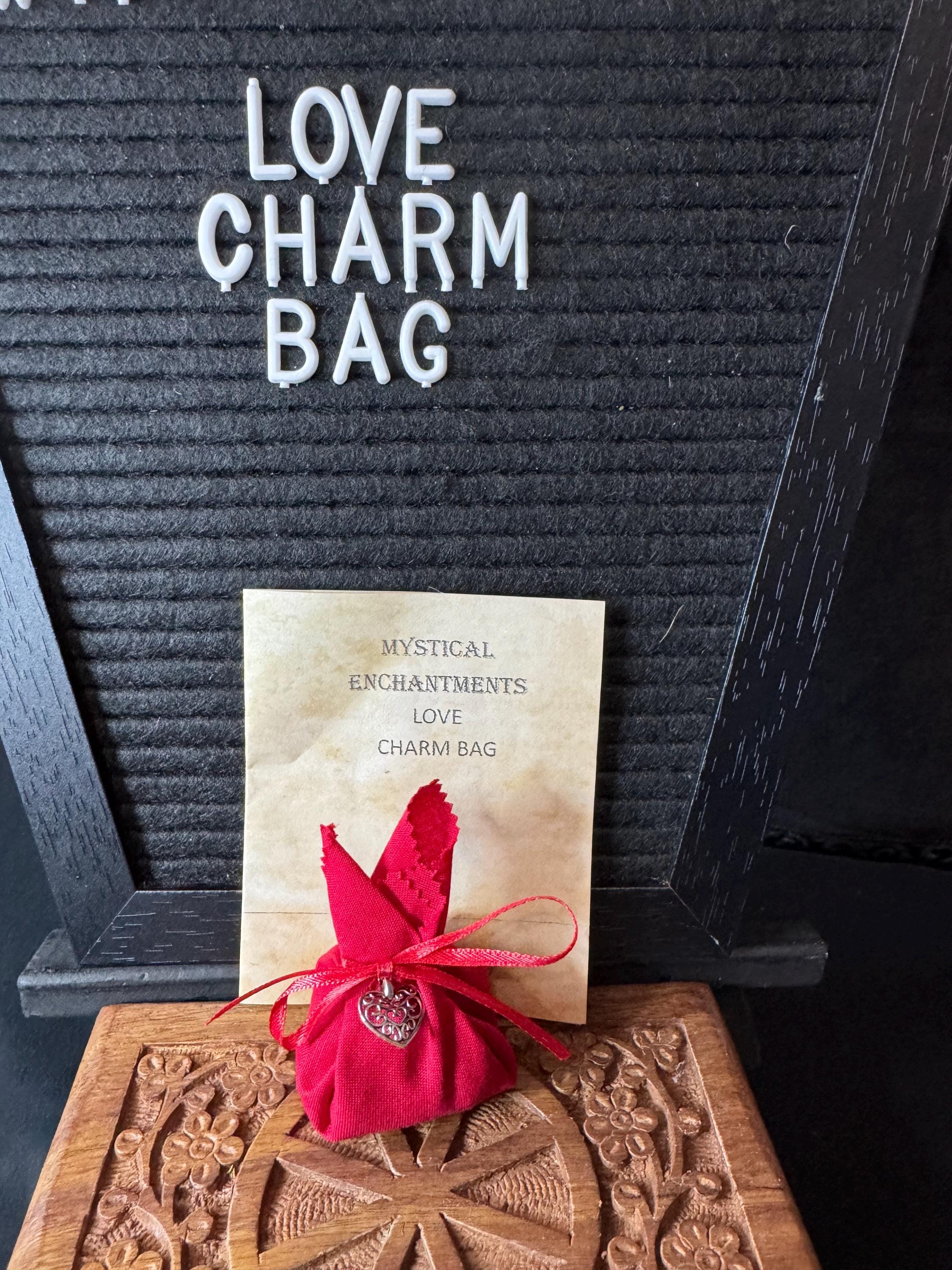A Love Charm Bag, also known as a mojo or gris-gris bag, is a pouch containing symbolic items used to attract love, promote harmony in a relationship, or manifest a specific romantic outcome. It is created with focused intention and specific ingredients like herbs, crystals, and amulets, and then carried or kept in a special place to hold and direct spiritual energy.