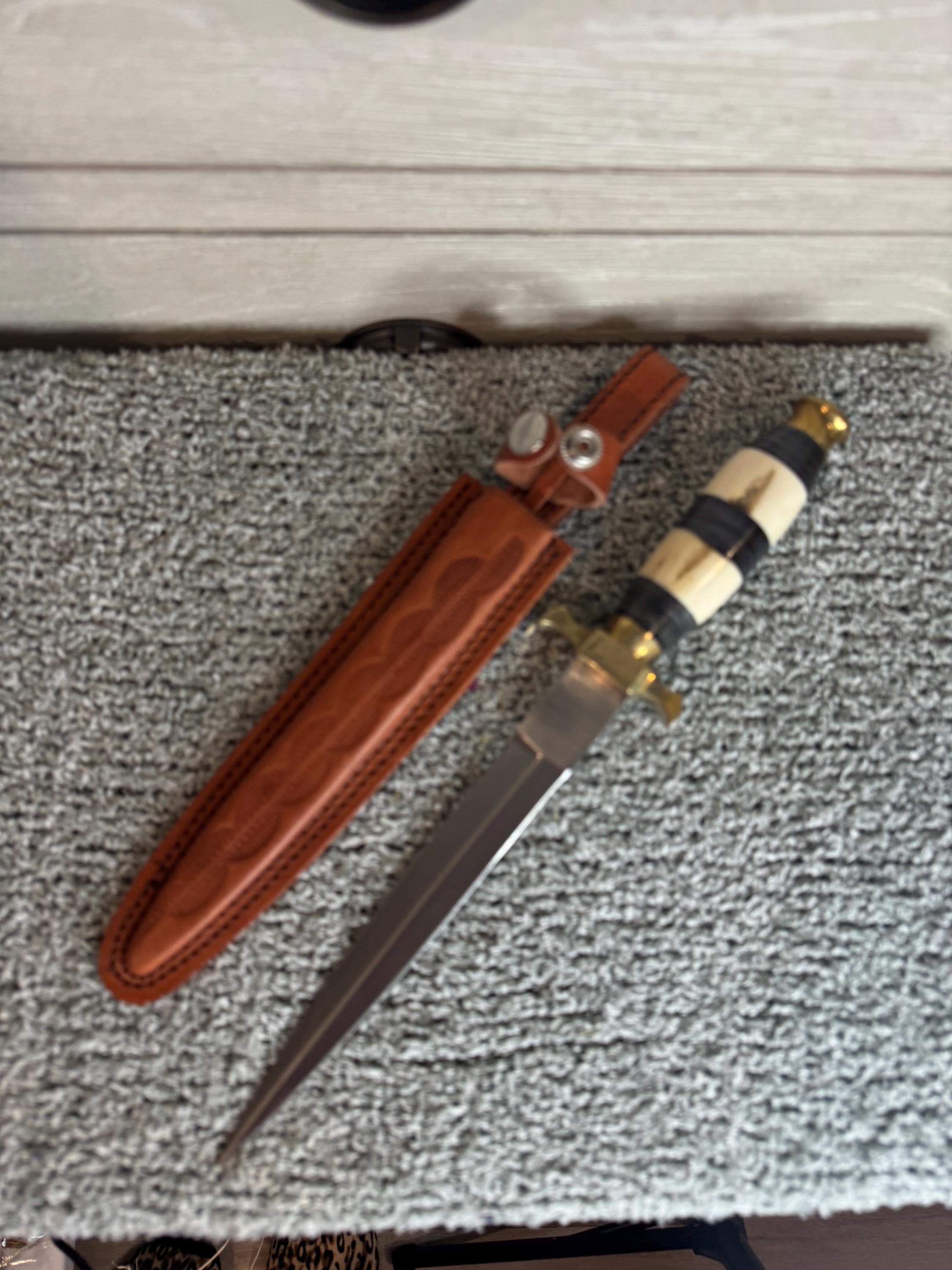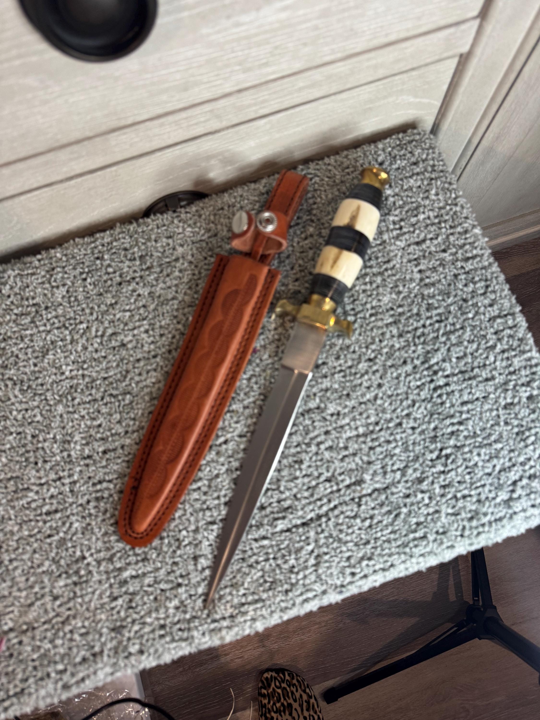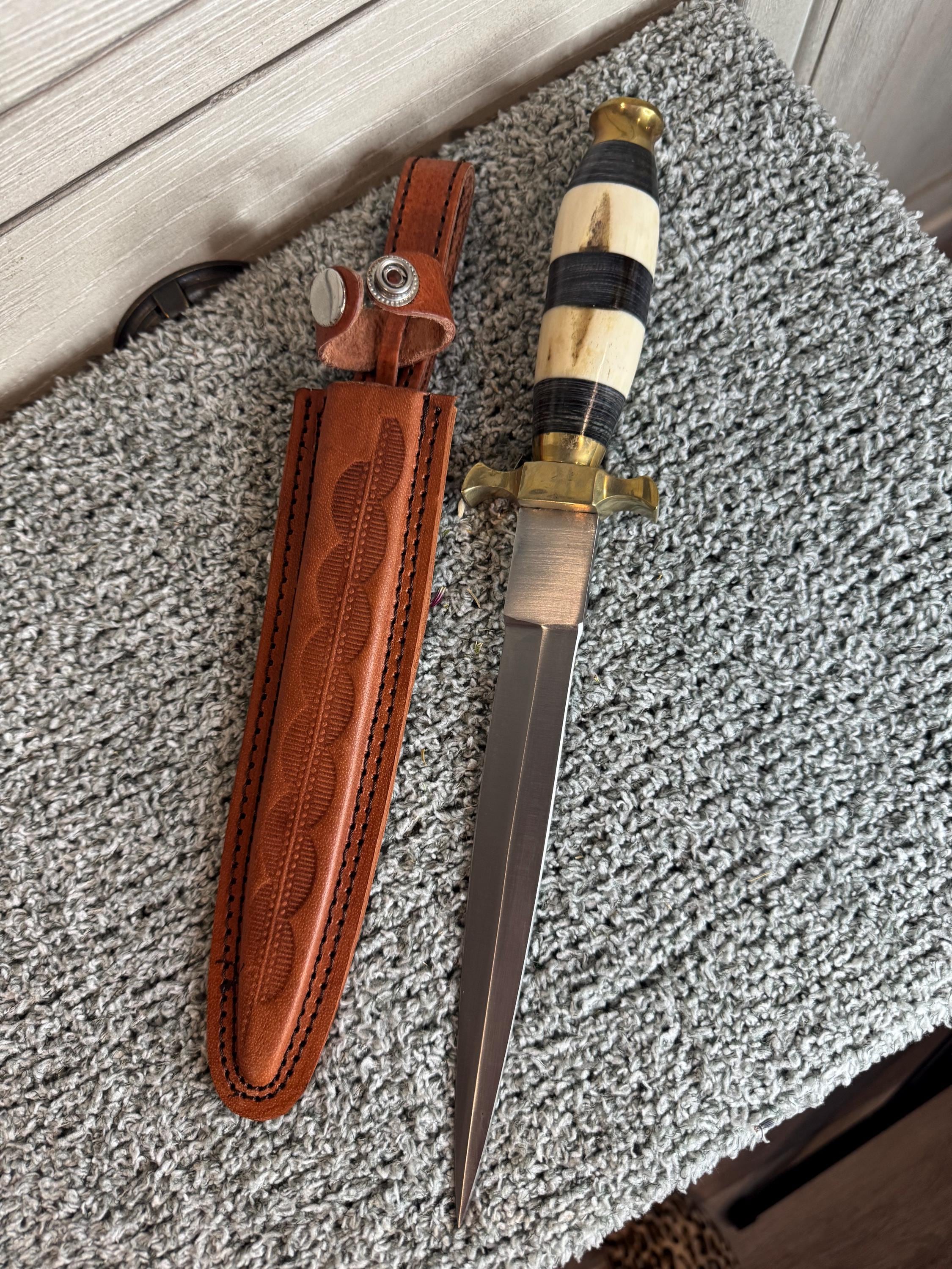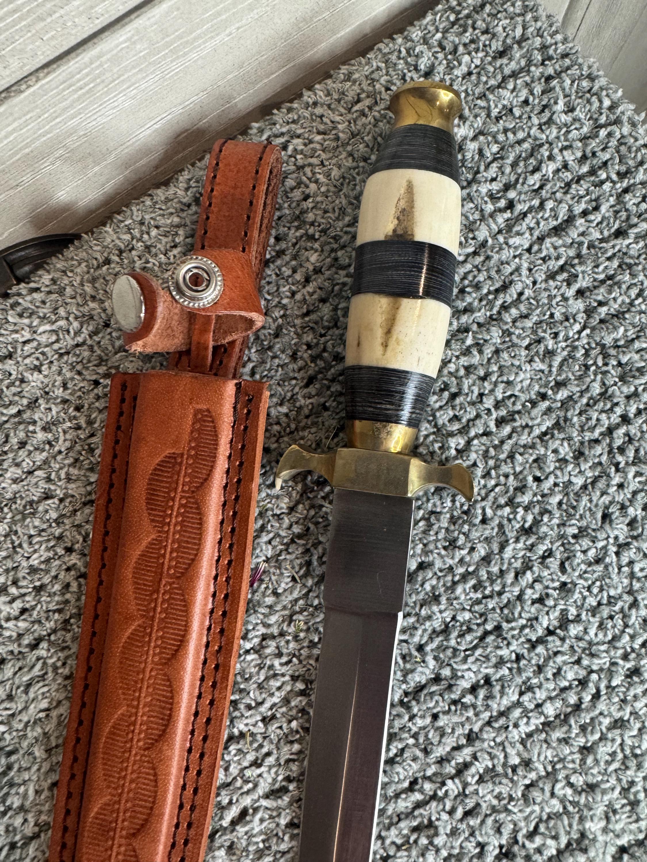 Black and white Athame. Features buffalo horn and camel bone handle with natural variations, stainless steal double-edge blade for precision and power sheath is leather and designed for belt or cord. Measures approximately 13 inches overall, with a 7.5 inch blade. Perfect for grounding rituals or working with earth energies, this athame brings vitality and intention to your altar. With its unique design and handcrafted details, no two are alike, making each blade as individual as the with who wields it. Blessed Be!