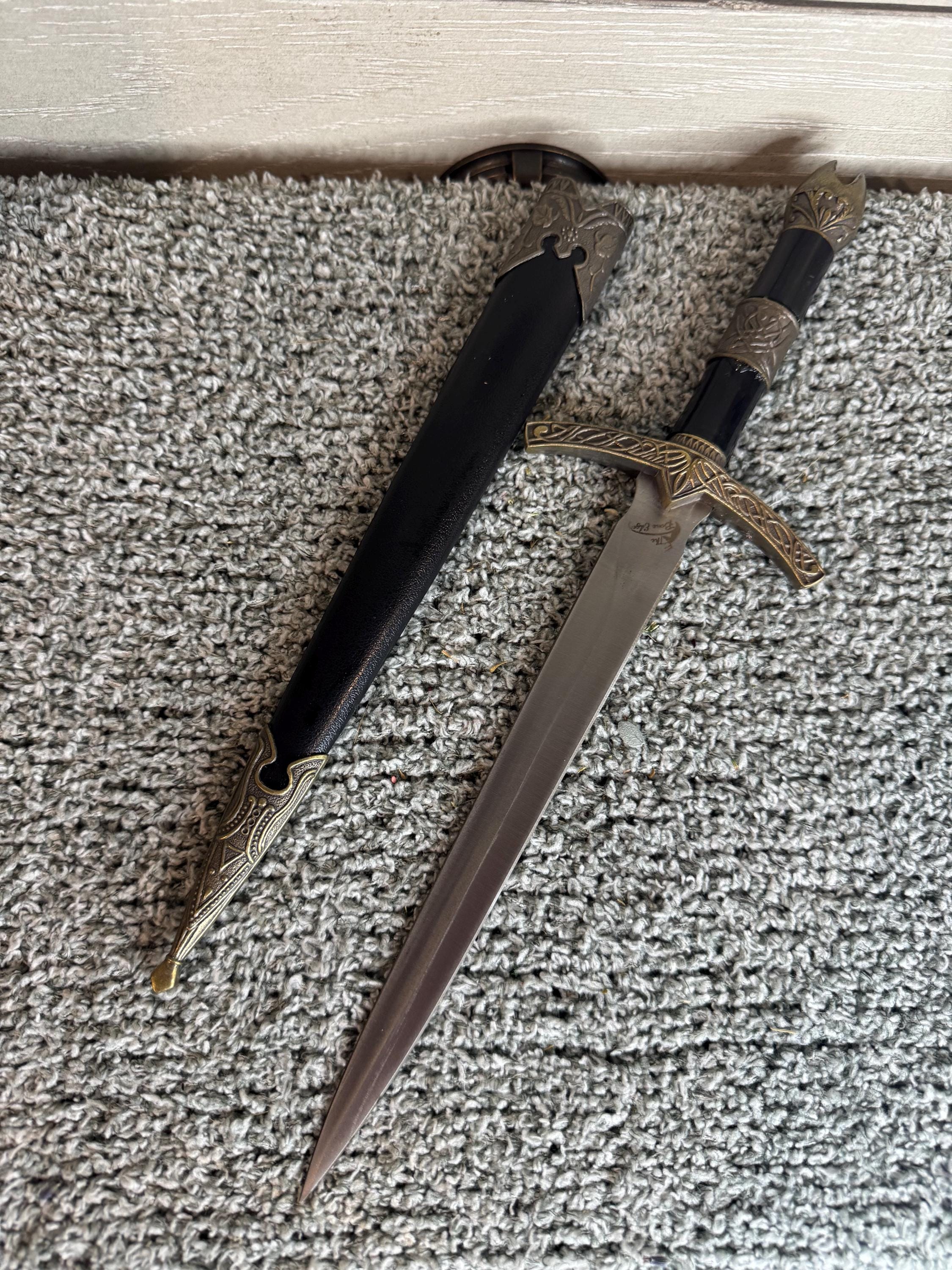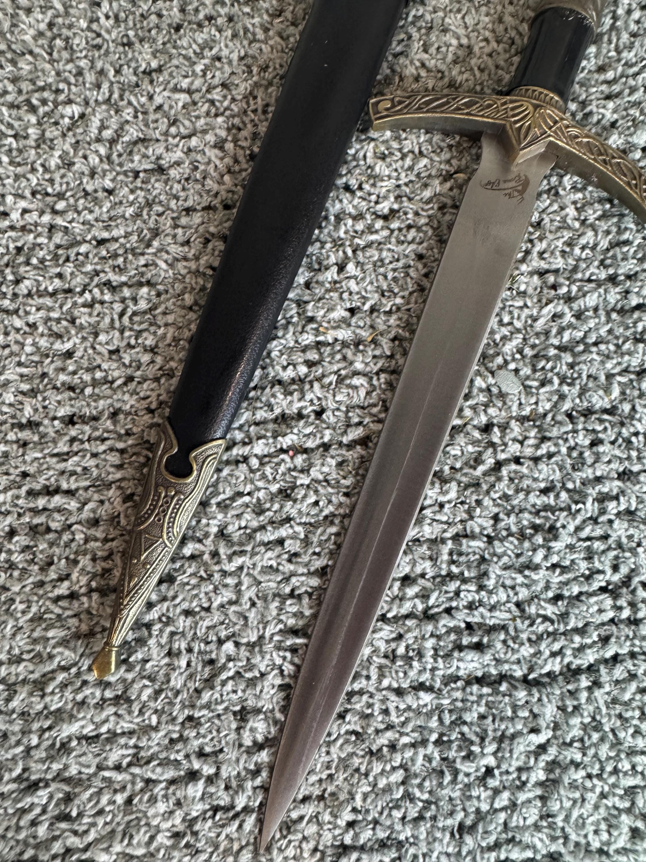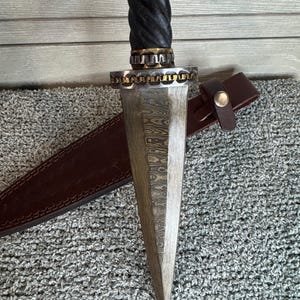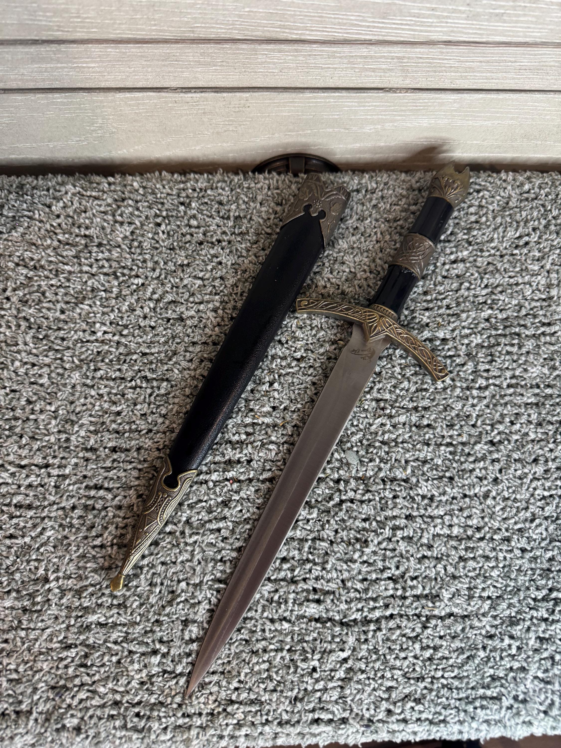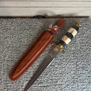 Blade of the Ancients-Unsheathing the Past with The Bone Edge Short Sword. Immerse yourself in the legacy of ancient combat with our 12-inch Roman Style Dagger, a homage to the potent and specialized double-bladed weapons of yore. Overall length is commanding presence at 12 inches, Blade Length is 7.5 Inches, Handle length is a sturdy 4.5-inch handle for a solid grip. Blessed Be!
