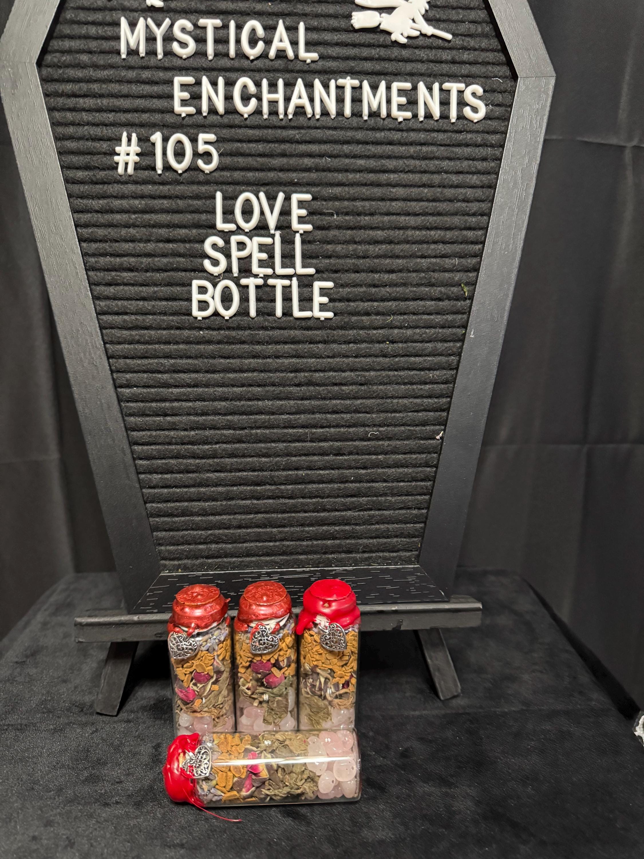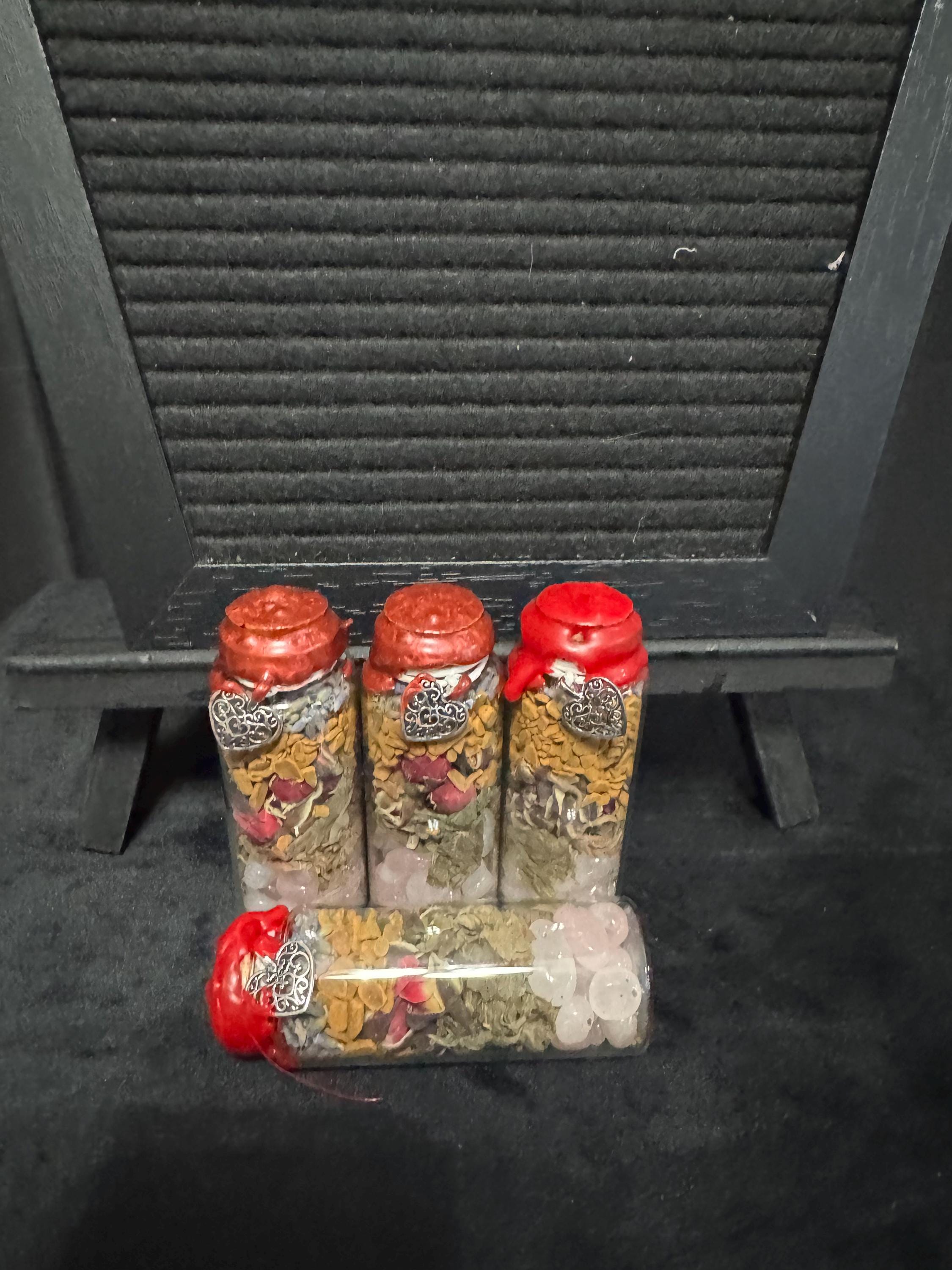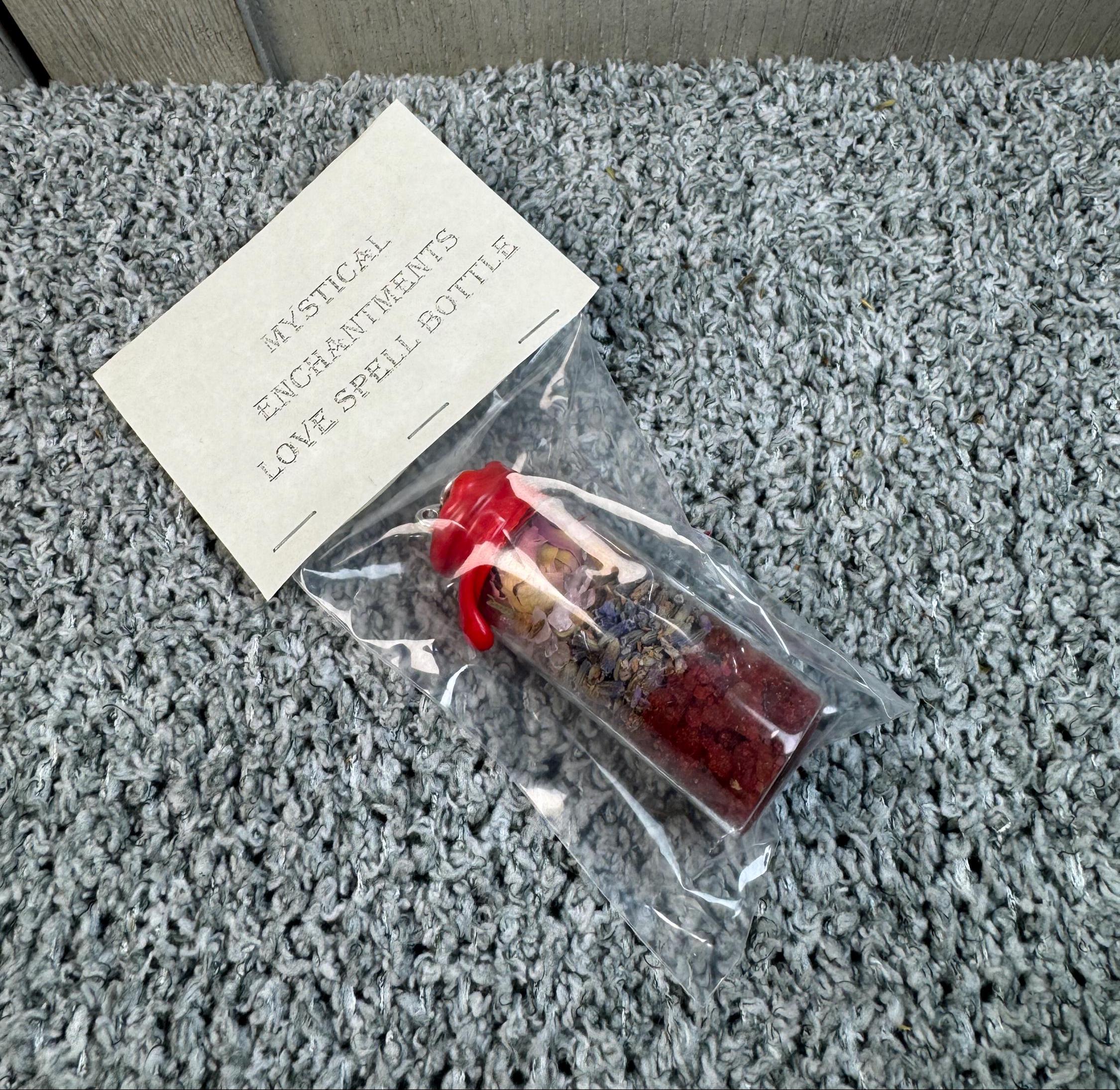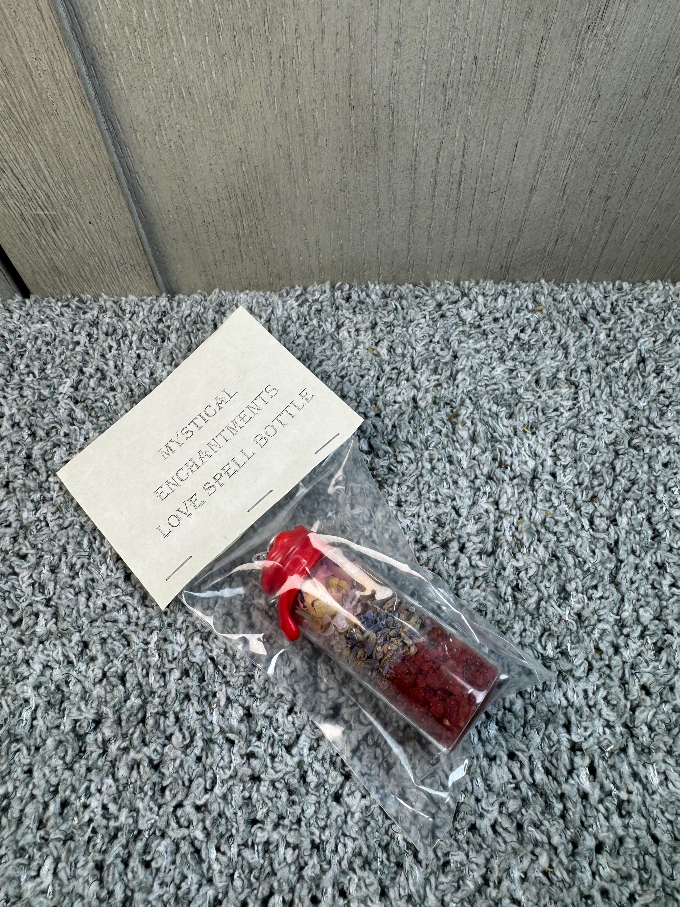 Love Spell Bottle is a jar containing a mixture of crystals, herbs, and other symbolic objects, created to manifest love in various forms, such as ginding new love, strengthening an existing relationship, or fostering self-love. The ingredients are chosen based on their symbolic correspondence to love, and the bottle is sealed after being infused with a specific intention through ritual, prayer, or meditation. The completed bottle is then placed in a specific location and may be activated periodically, like by shaking it or lighting a candle on top, to keep the energies active. Uses of a love spell bottle, attracting new love, strengthening existing relationships, promoting self-love, and influencing emotions and attraction. Instructions included. Blessed Be!