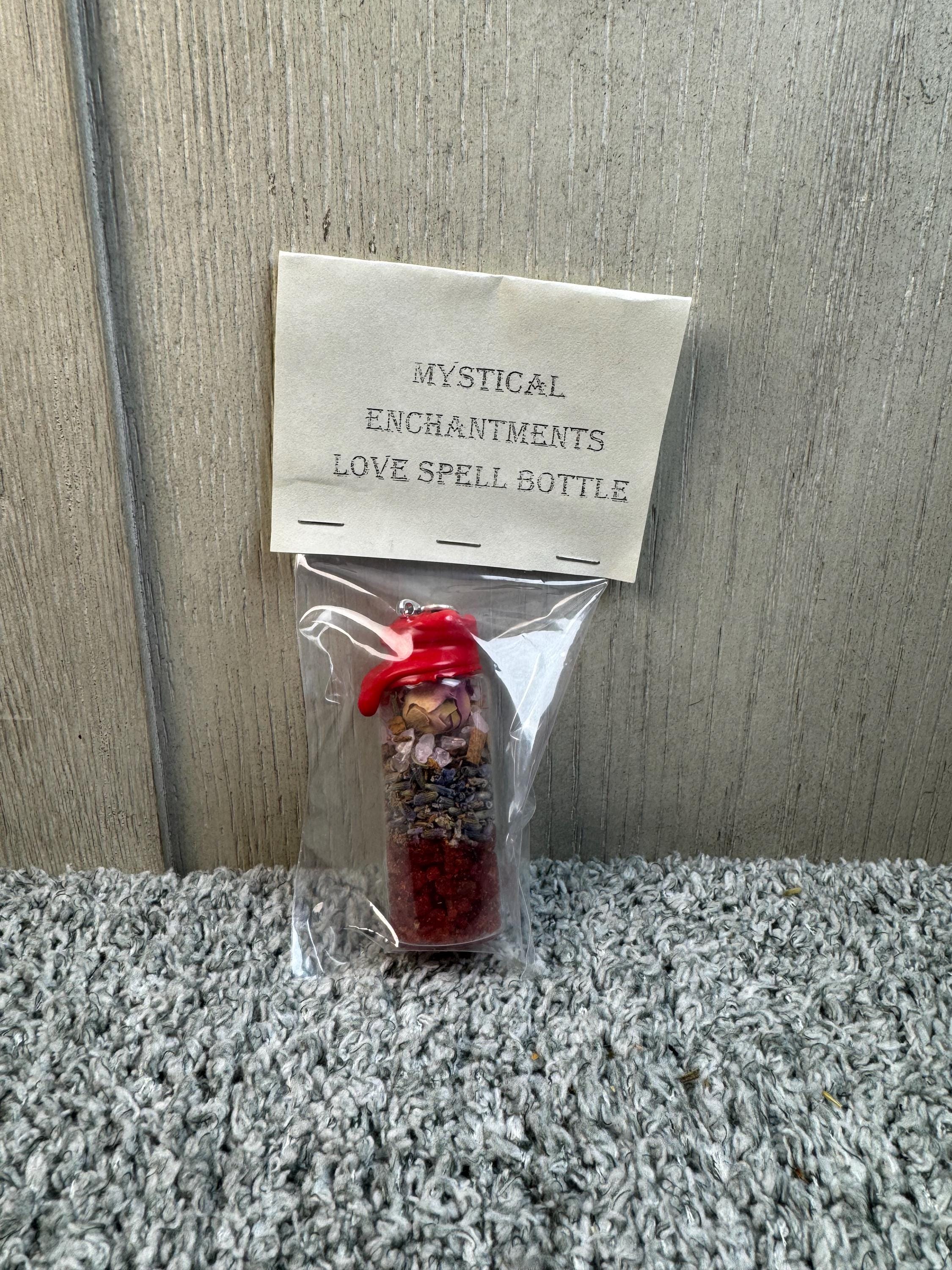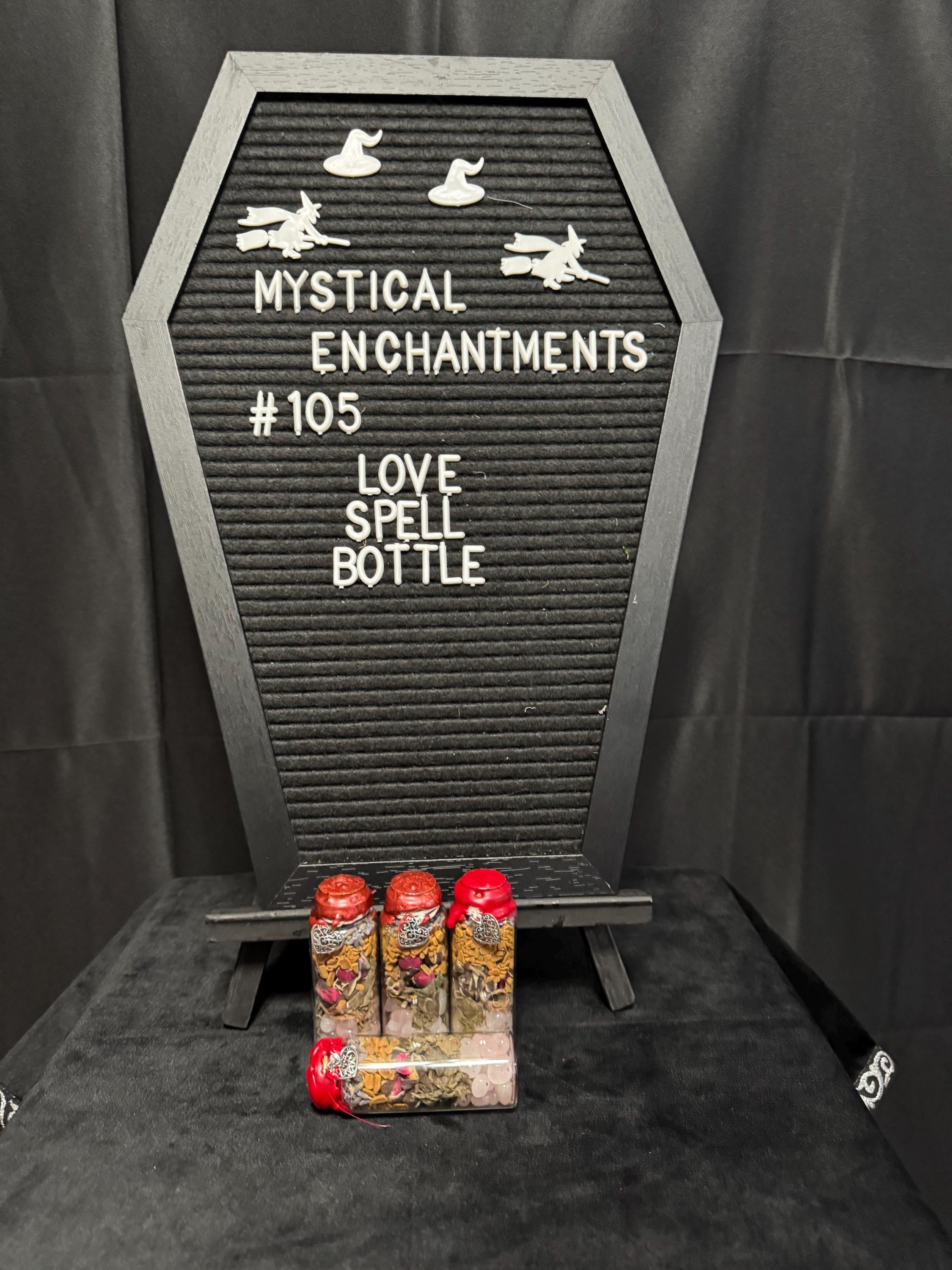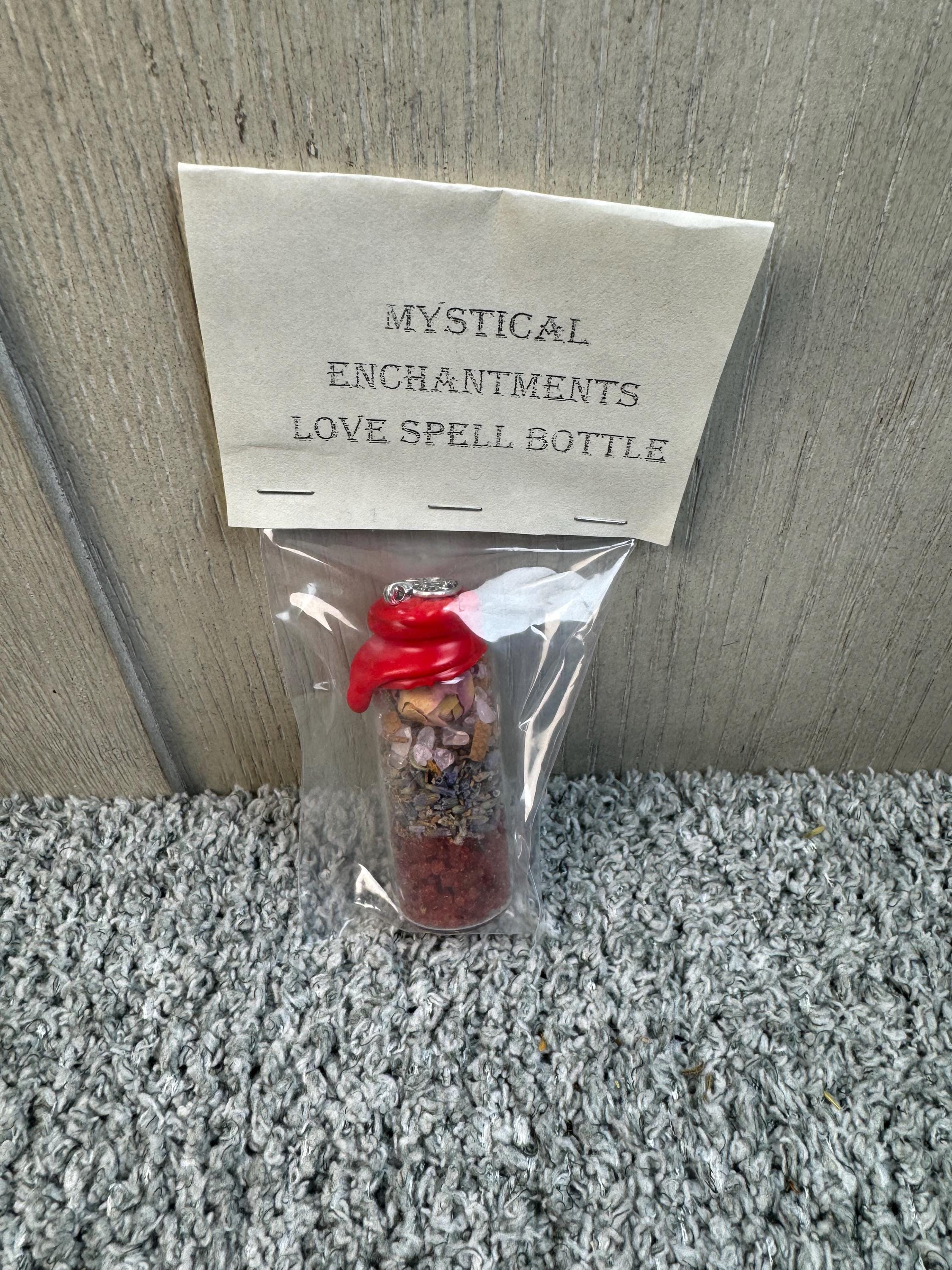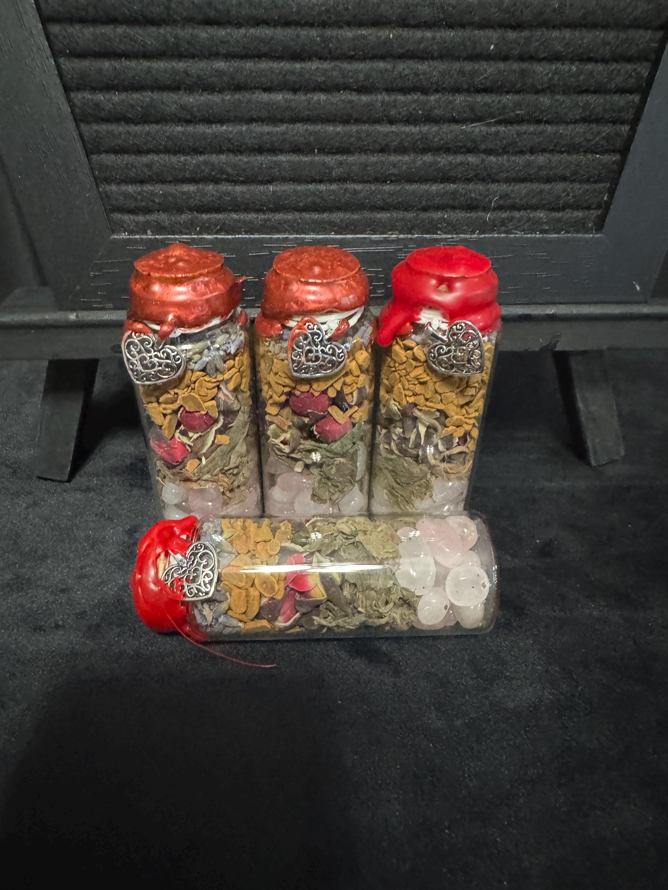 Love Spell Bottle is a jar containing a mixture of crystals, herbs, and other symbolic objects, created to manifest love in various forms, such as ginding new love, strengthening an existing relationship, or fostering self-love. The ingredients are chosen based on their symbolic correspondence to love, and the bottle is sealed after being infused with a specific intention through ritual, prayer, or meditation. The completed bottle is then placed in a specific location and may be activated periodically, like by shaking it or lighting a candle on top, to keep the energies active. Uses of a love spell bottle, attracting new love, strengthening existing relationships, promoting self-love, and influencing emotions and attraction. Instructions included. Blessed Be!