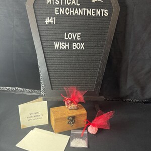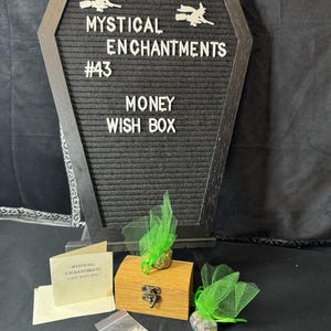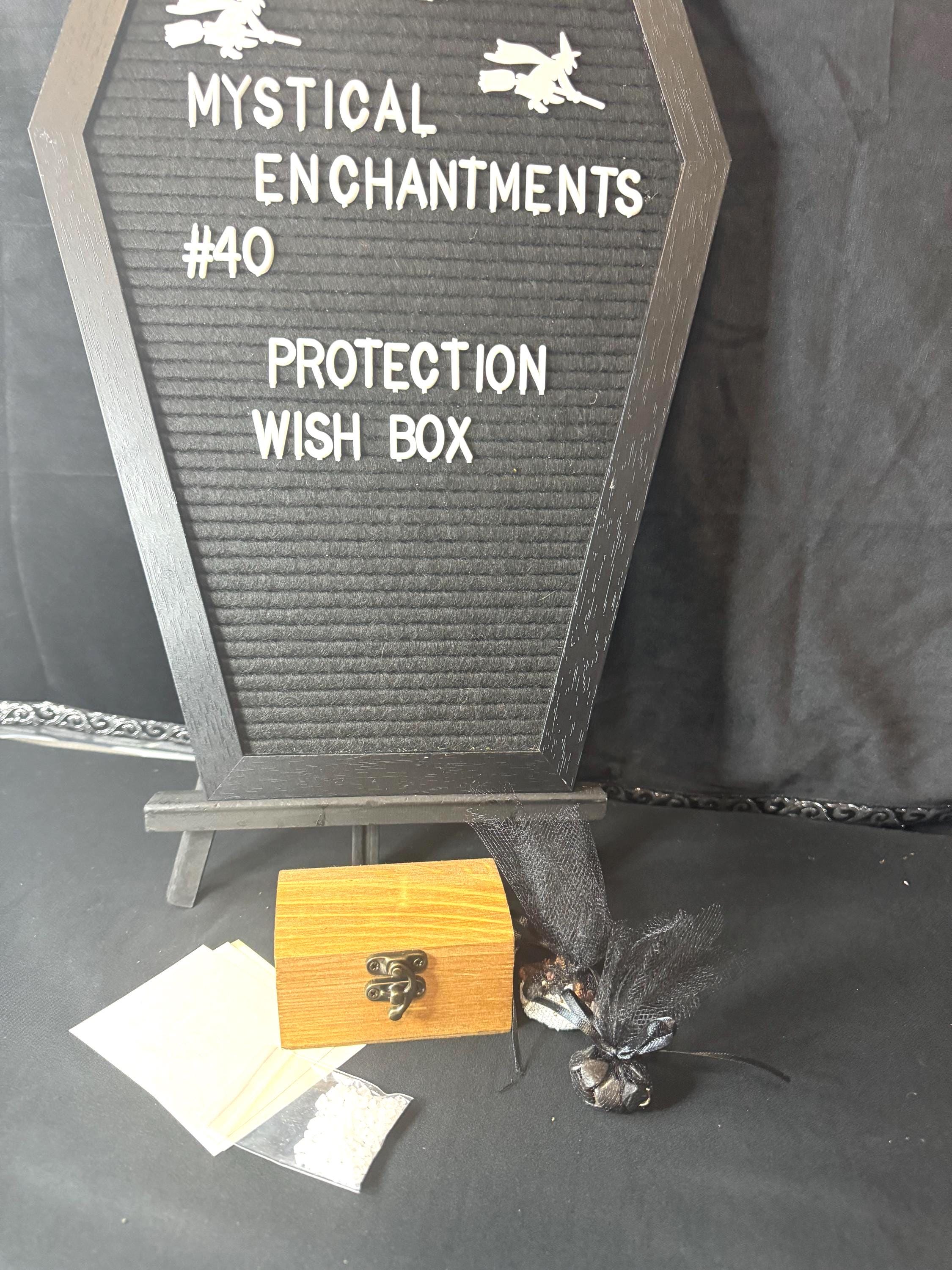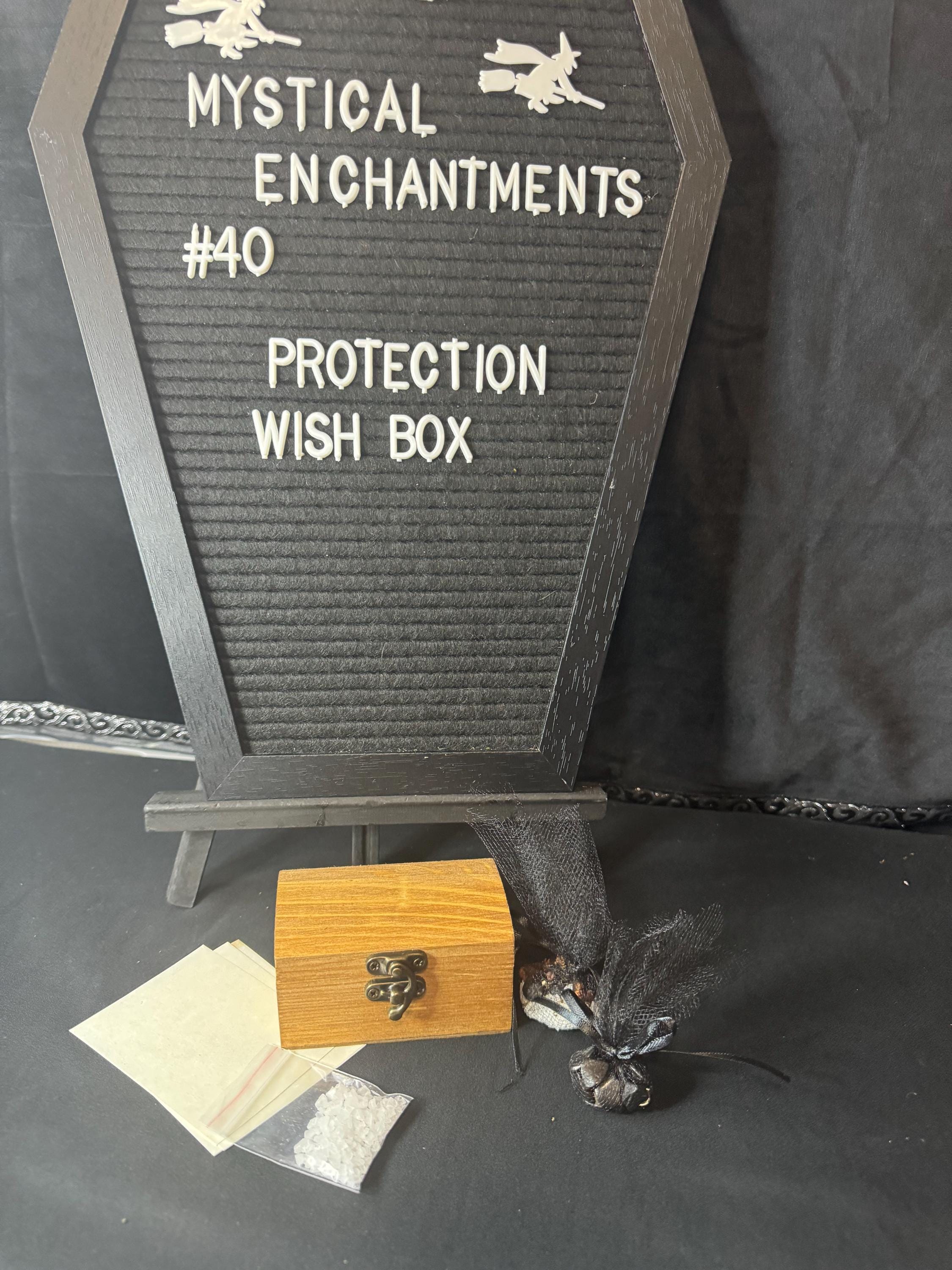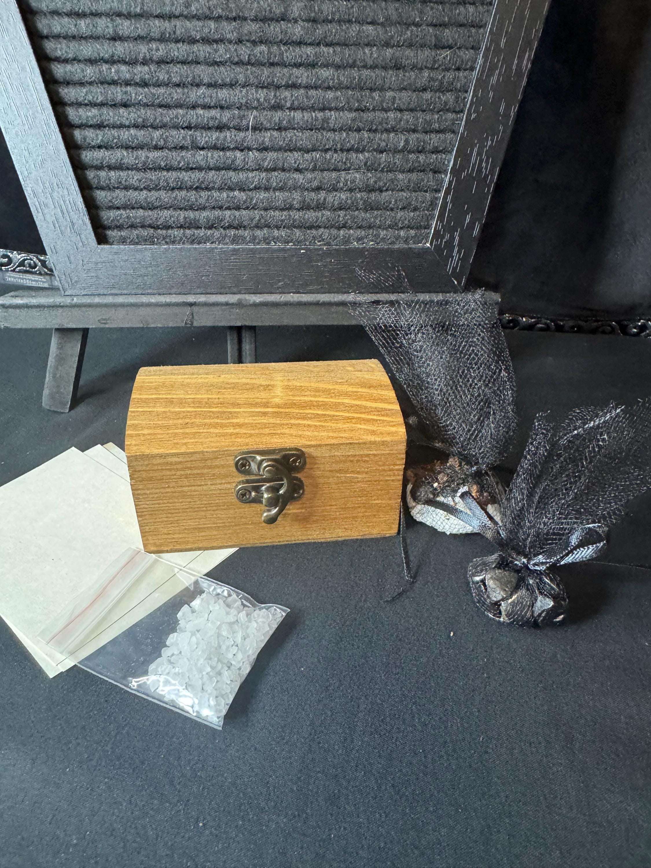 A Protection Wish Box is a container used to hold intentions for protection, safety, and other desires. People use them as part of a ritual to manifest intentions by writing down their wishes on paper or collecting items like crystals, photos, or personal mementos that represent their goals, such as a lock of hair for protection, and placing them inside the box. The box is then kept in a special place to help the person focus on their goals, sometimes while visualizing them coming to life. Instruction are included. Comes with wooden wish box, sea salt, herbs for protection, and parchment paper. Blessed Be!