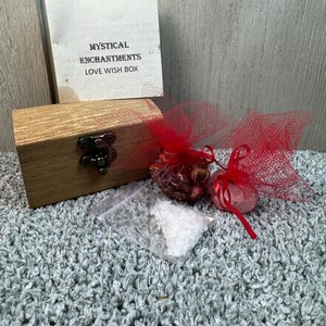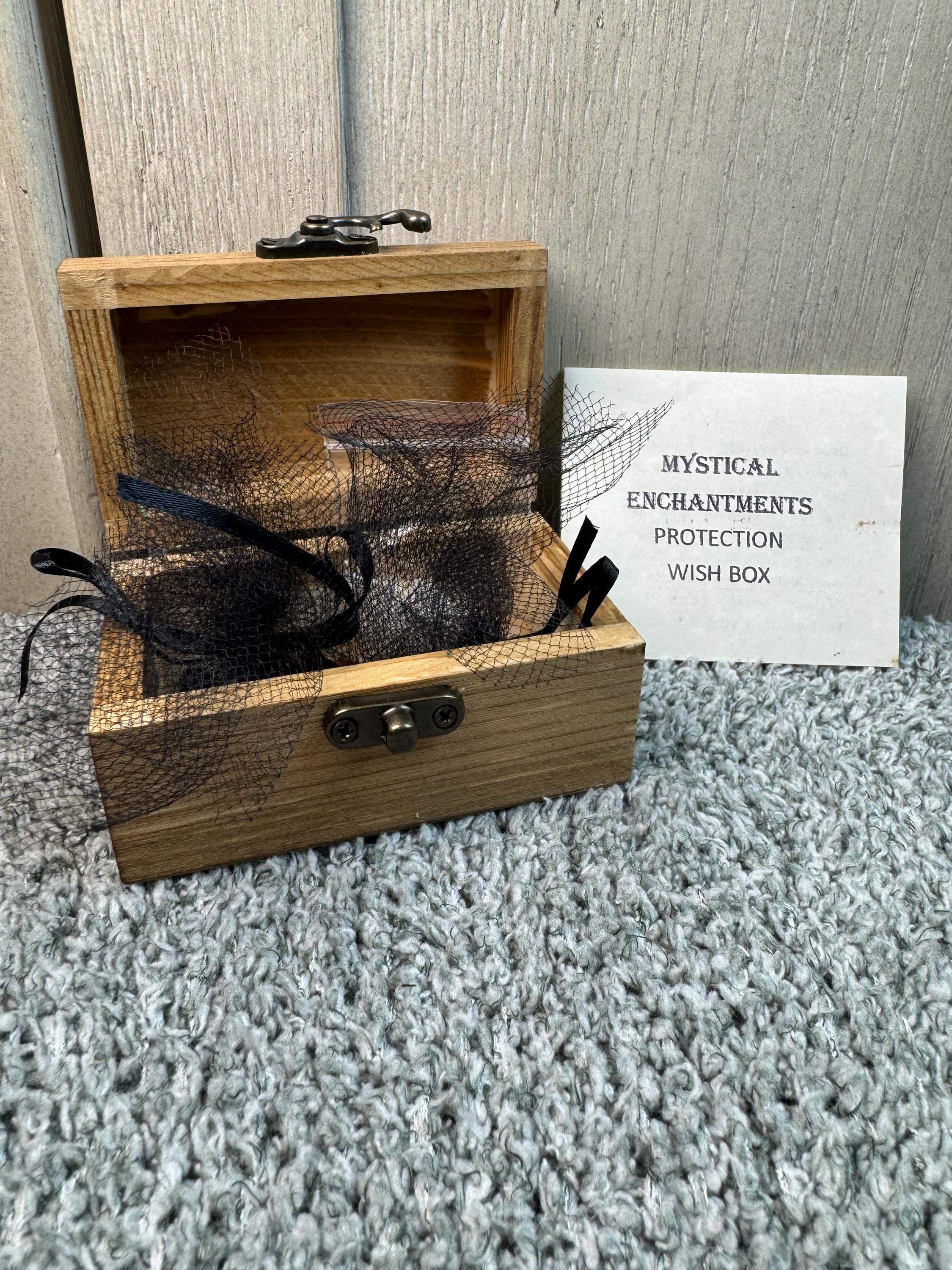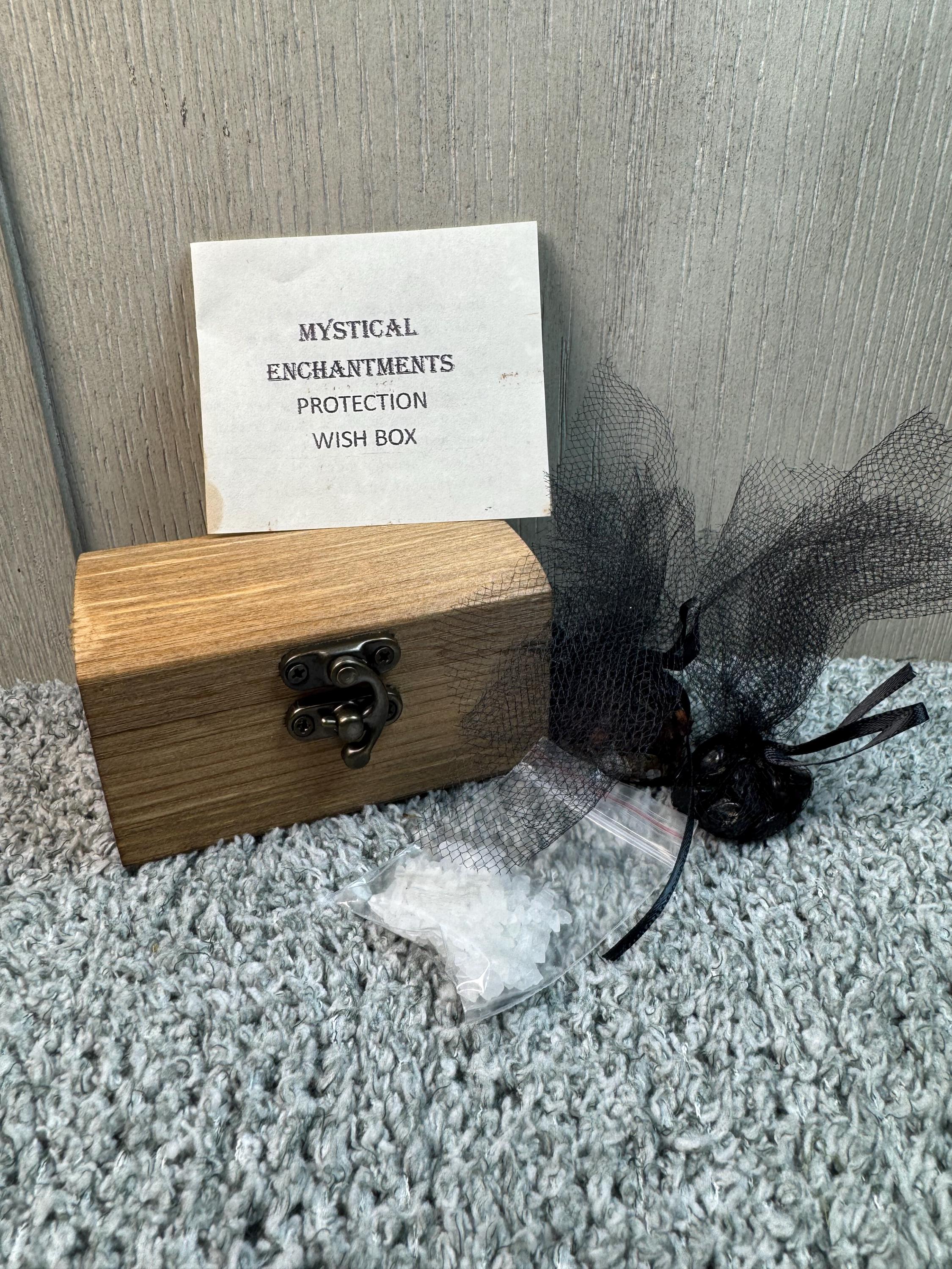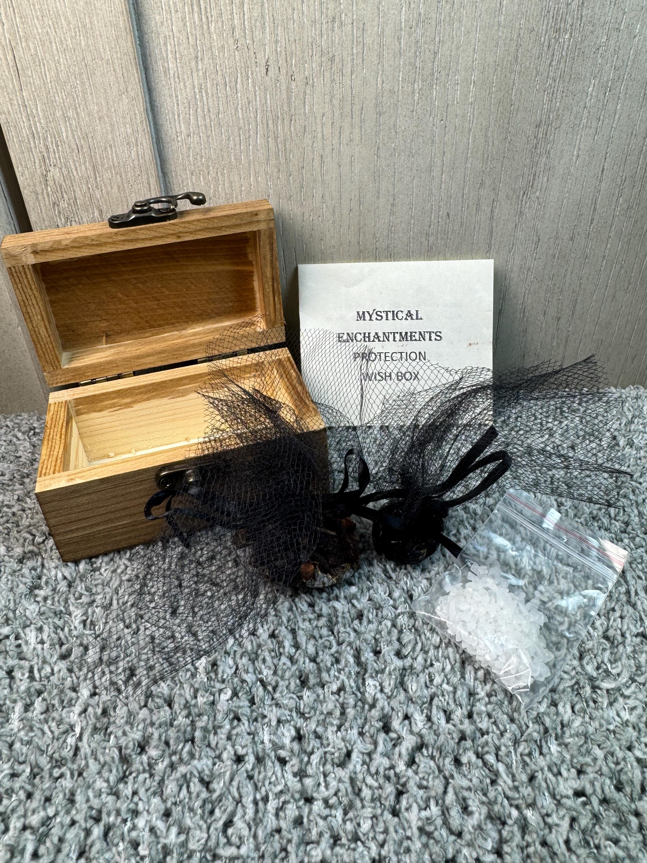 A Protection Wish Box is a container used to hold intentions for protection, safety, and other desires. People use them as part of a ritual to manifest intentions by writing down their wishes on paper or collecting items like crystals, photos, or personal mementos that represent their goals, such as a lock of hair for protection, and placing them inside the box. The box is then kept in a special place to help the person focus on their goals, sometimes while visualizing them coming to life. Instruction are included. Comes with wooden wish box, sea salt, herbs for protection, and parchment paper. Blessed Be!