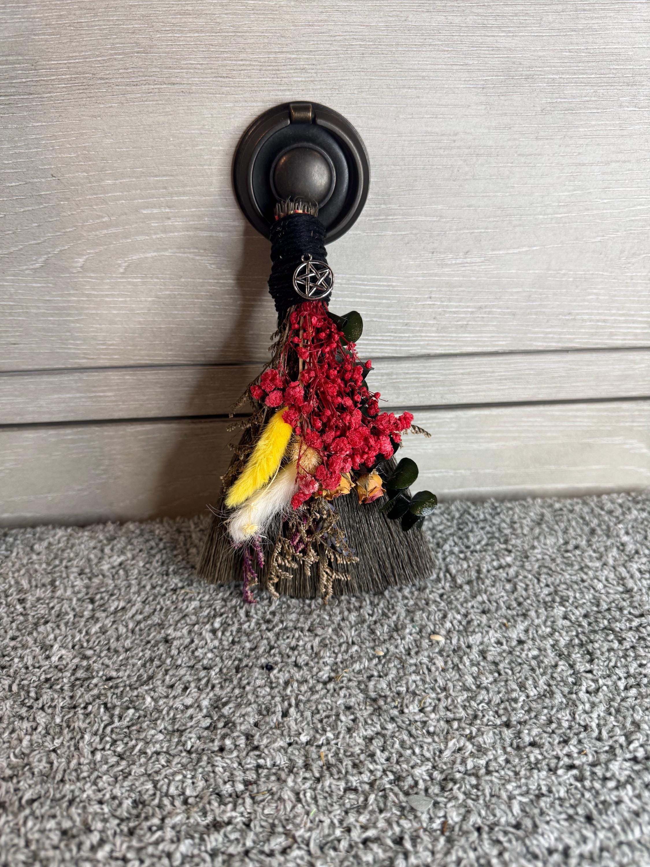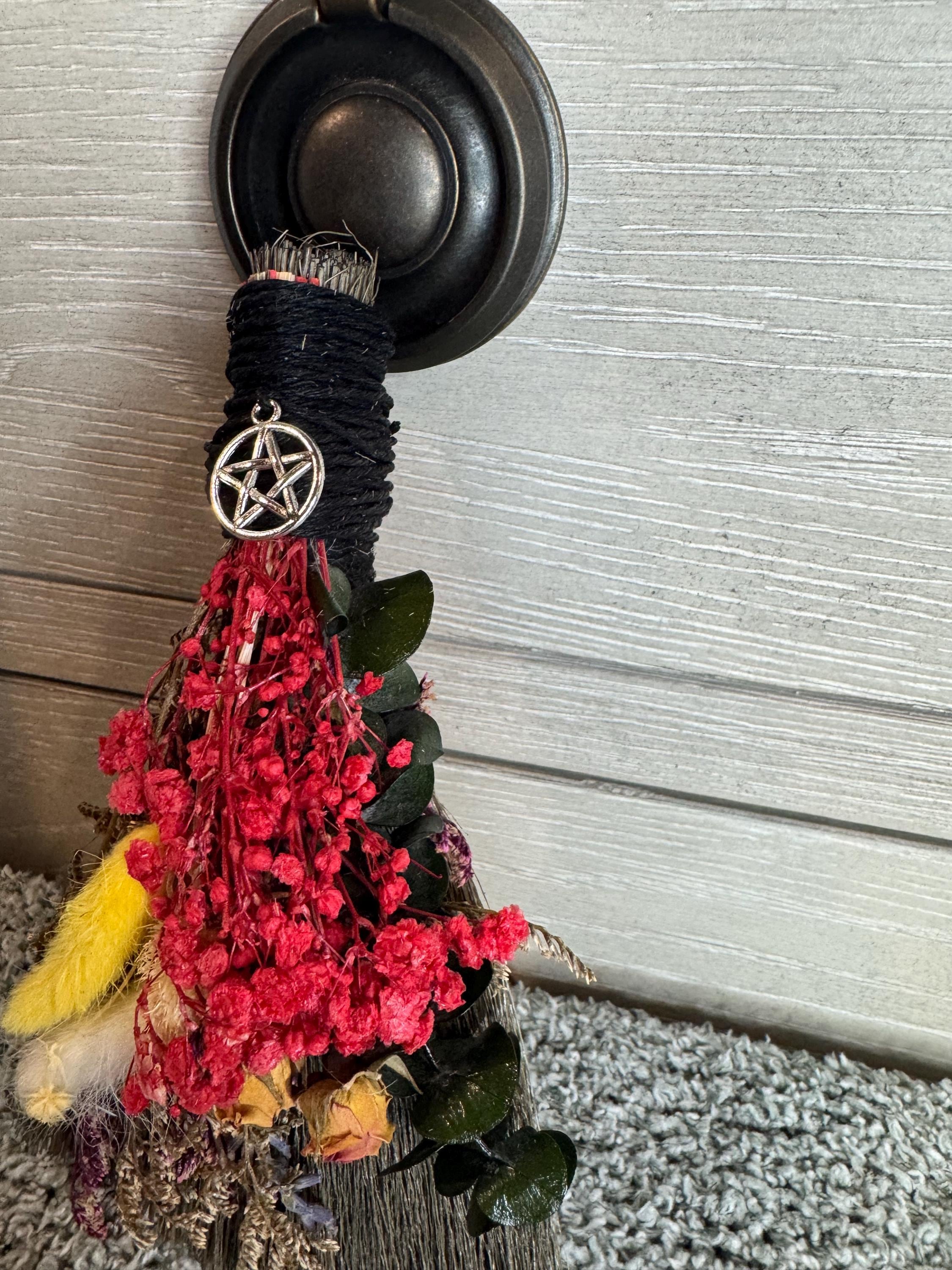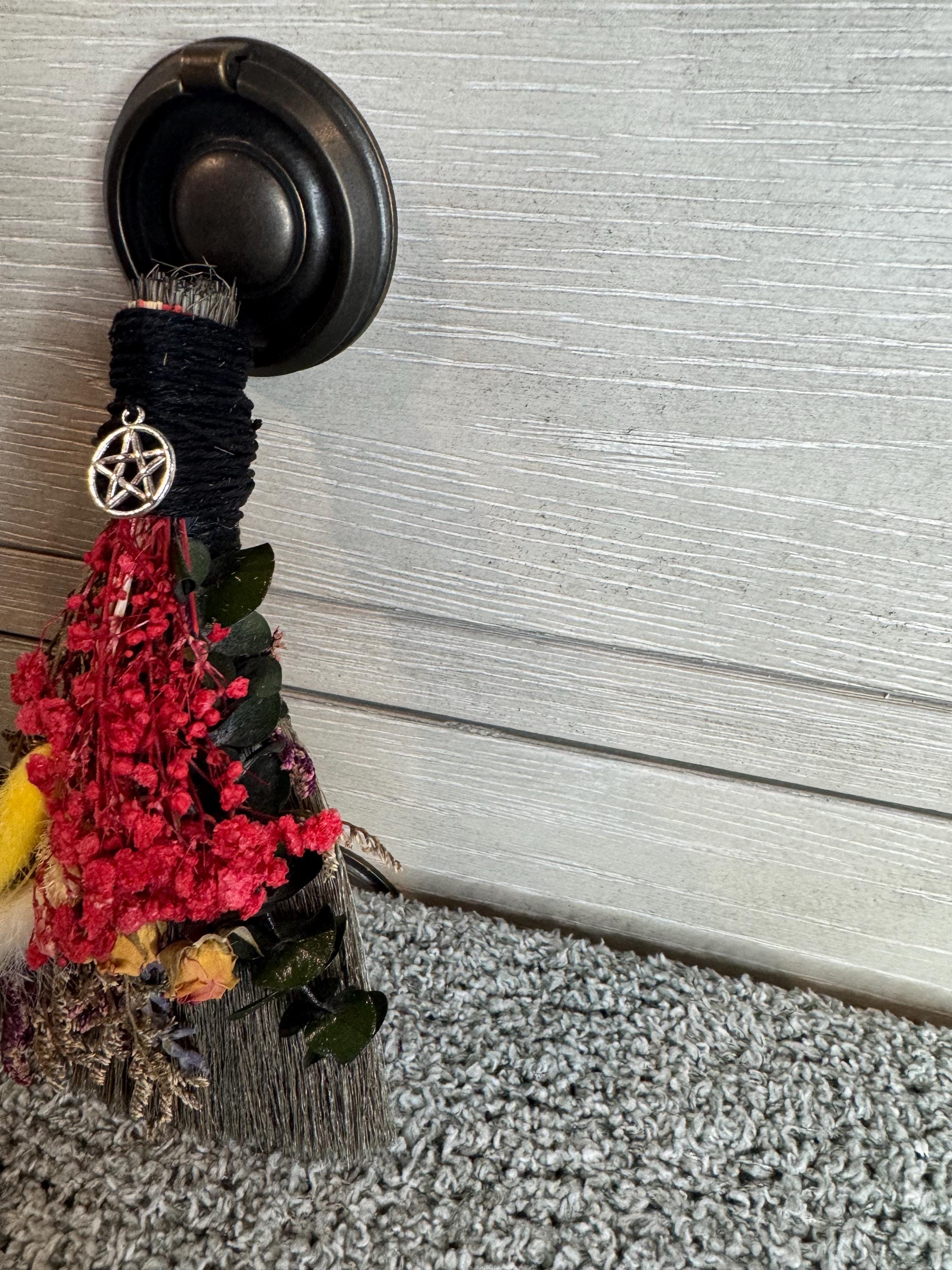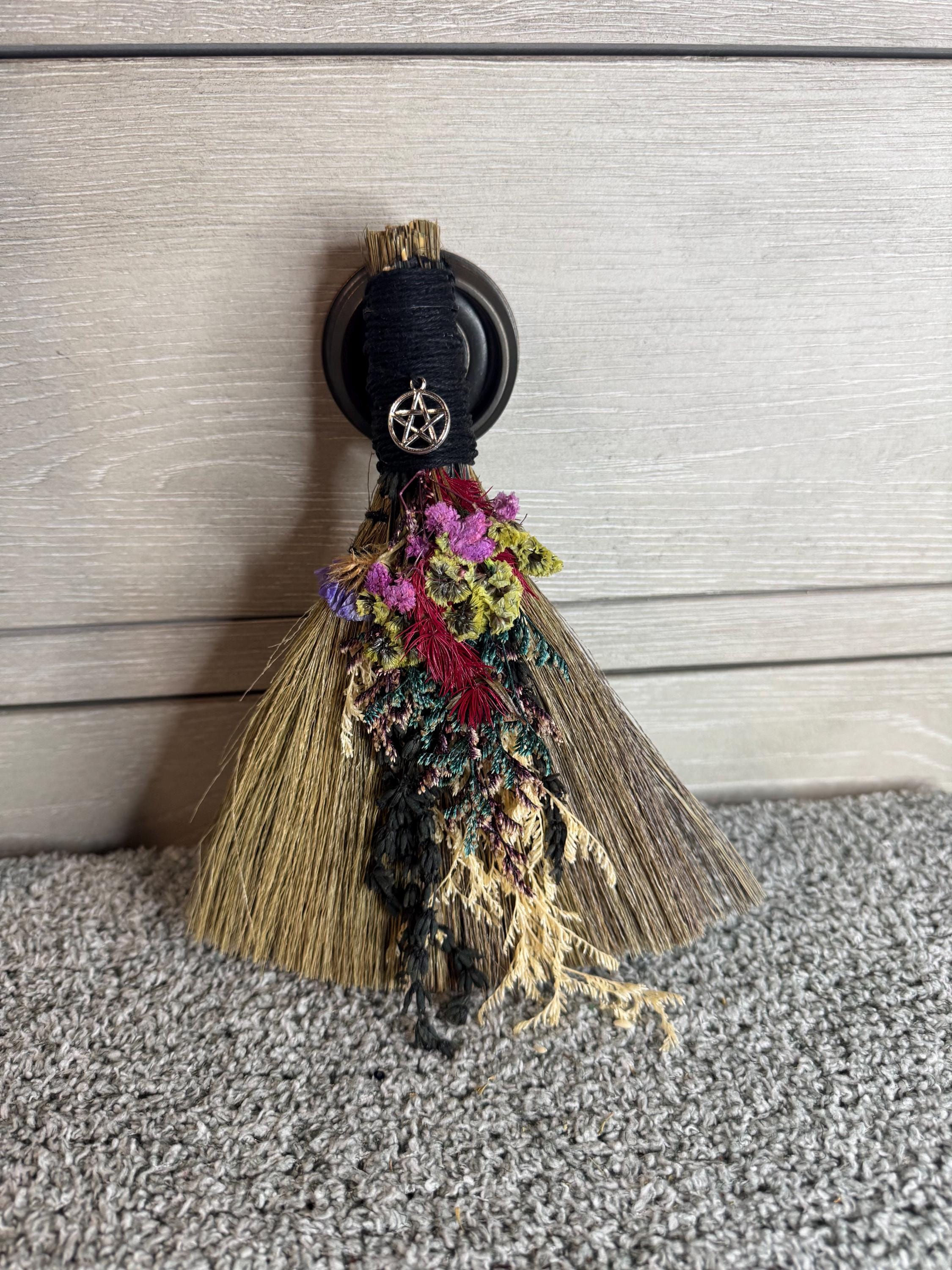 An altar besom is used in witchcraft for magical cleansing, purifying and altar space by sweeping away negative energy, and preparing the area for ritual. It is also used for other purposes like protection marking sacred boundaries, and as a symbolic element in handfasting ceremonies. Besom measures 9" long and made with real dried flowers. Blessed Be!