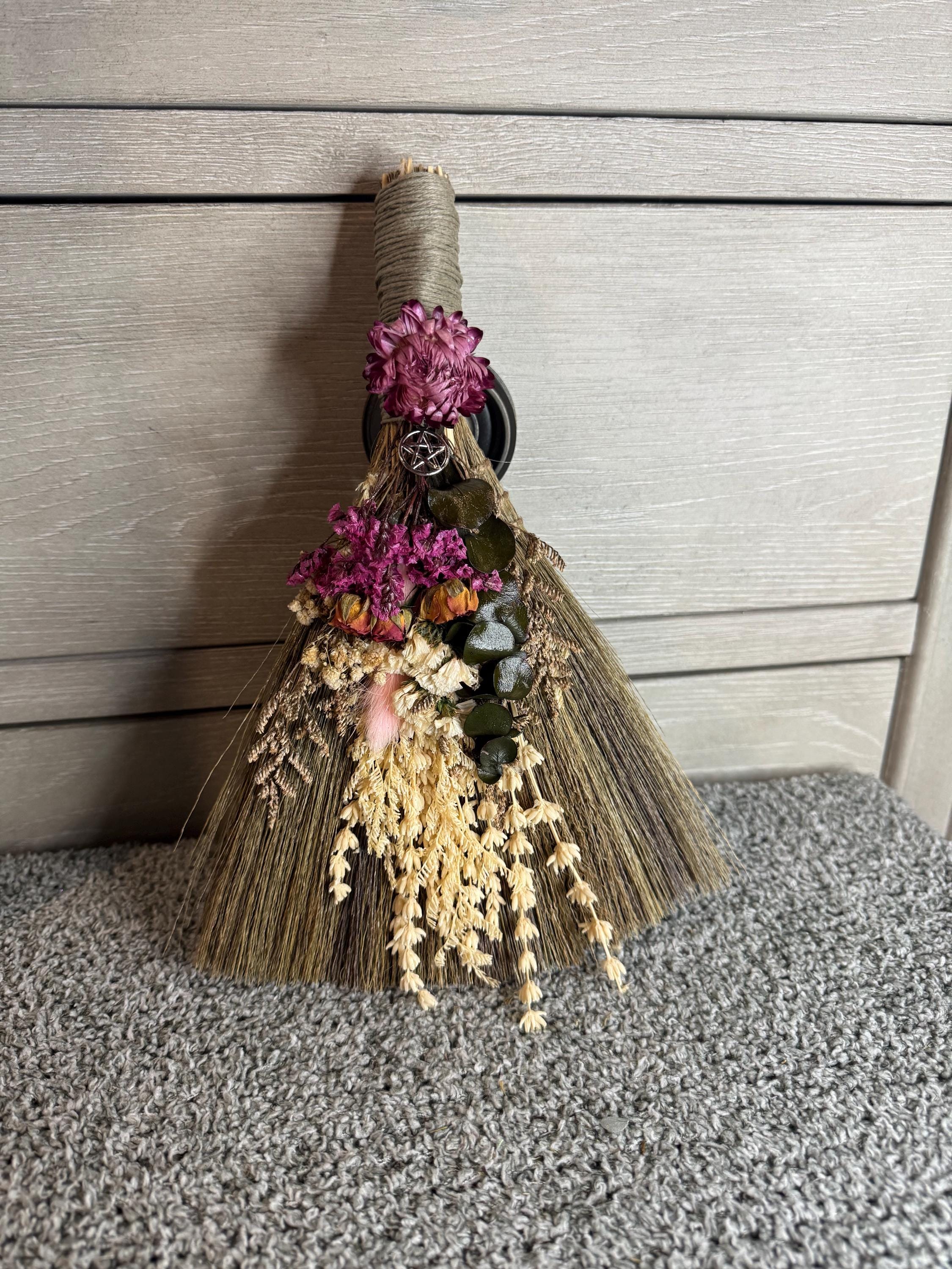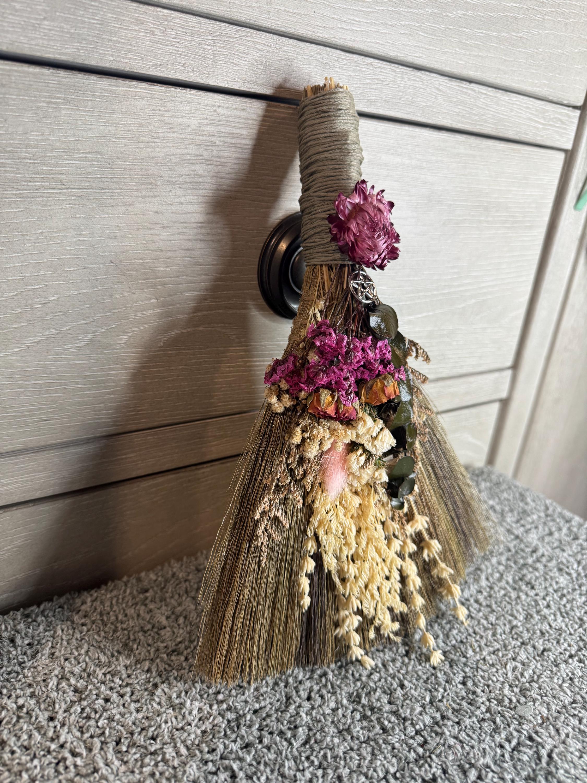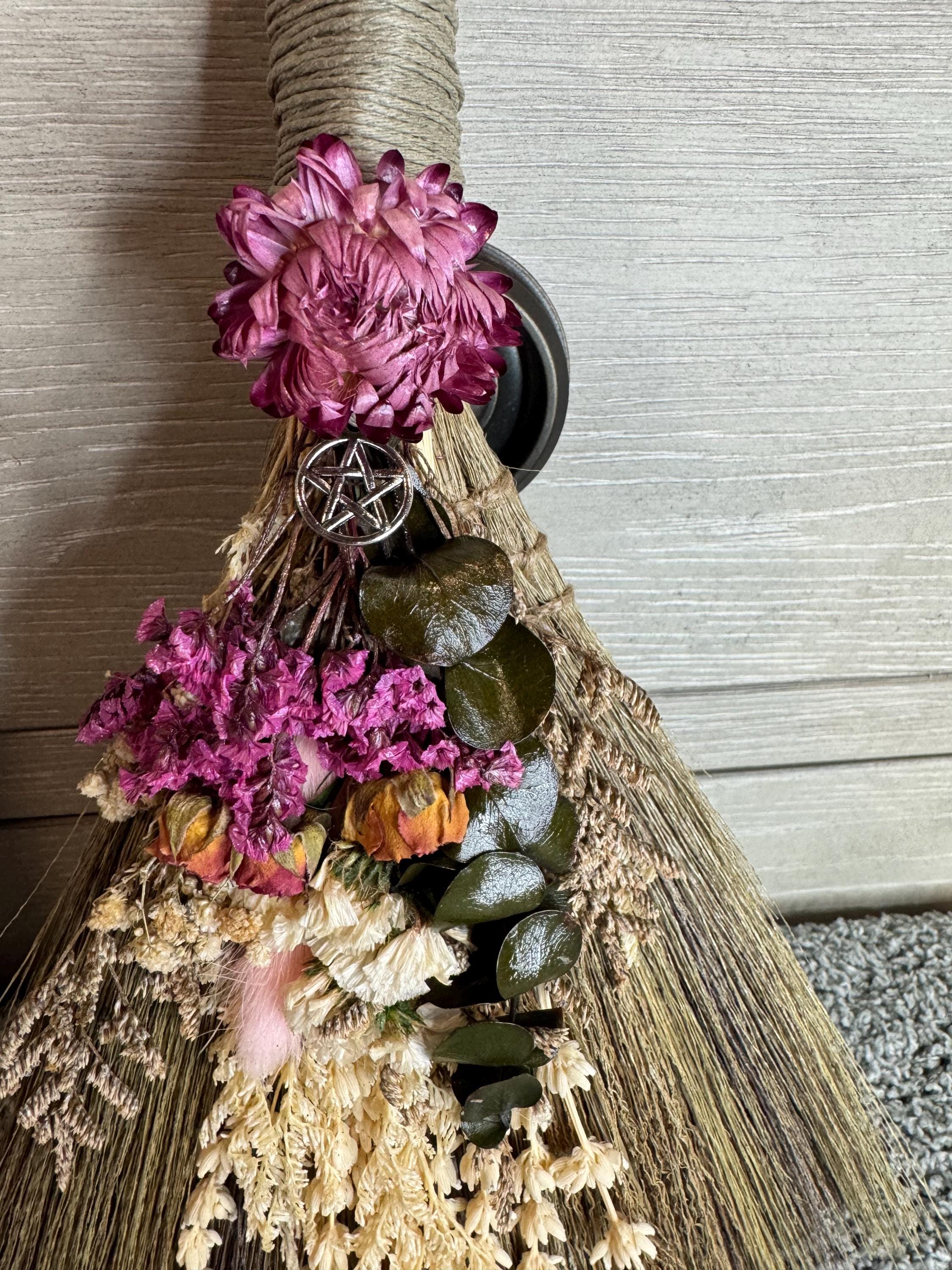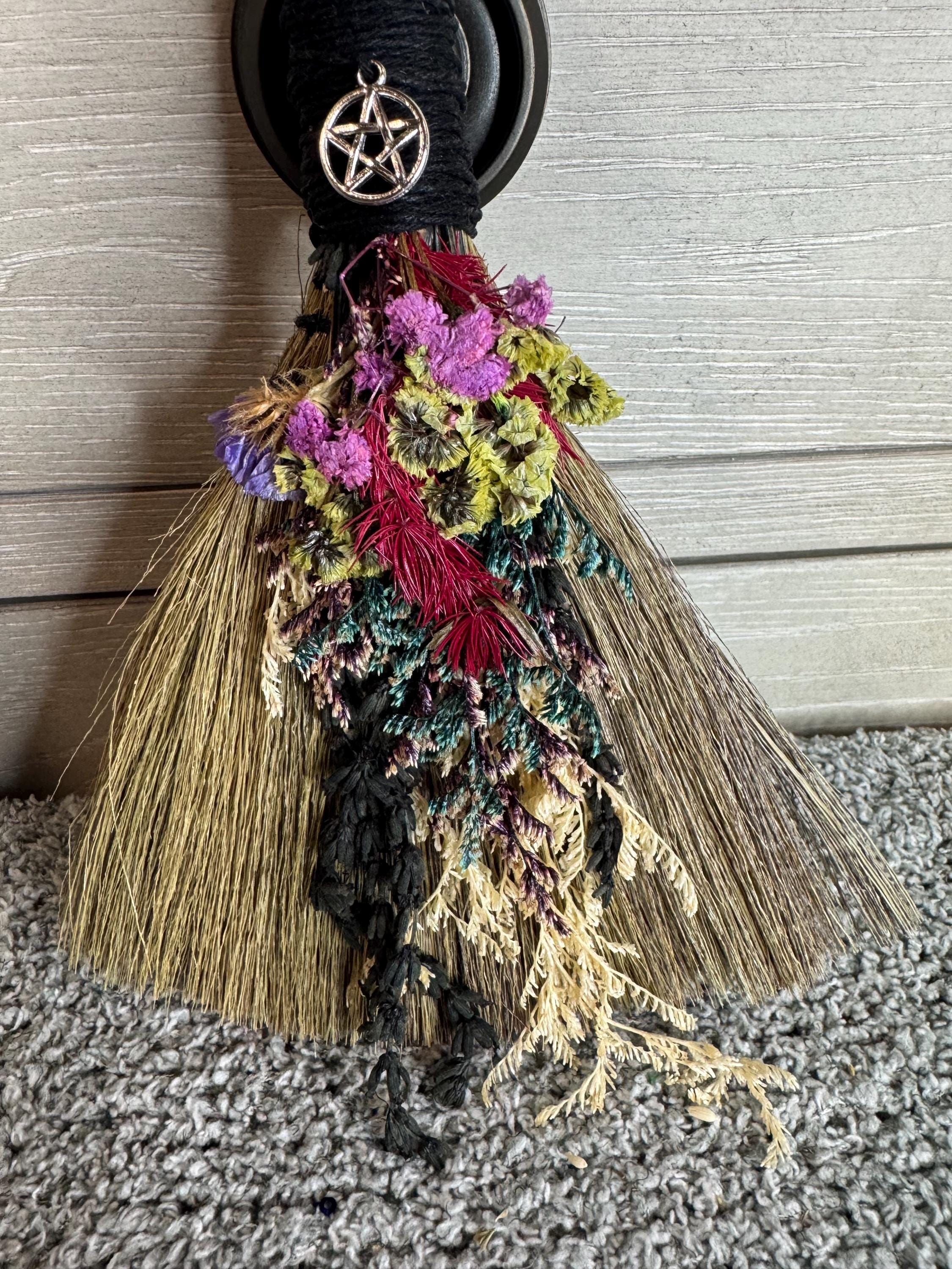 An Altar Besom is used in witchcraft for magical cleansing, purifying and altar space by sweeping away negative energy, and preparing the area for ritual. It is also used for other purposes like protection, marking sacred boundaries, and as a symbolic element in handfasting ceremonies, where couples might jump over the besom. Uses in Witchcraft: cleansing, protection, ceremonial, symbolism, and energy redirection. Made with real dried flowers and measures 11" long. Blessed Be!