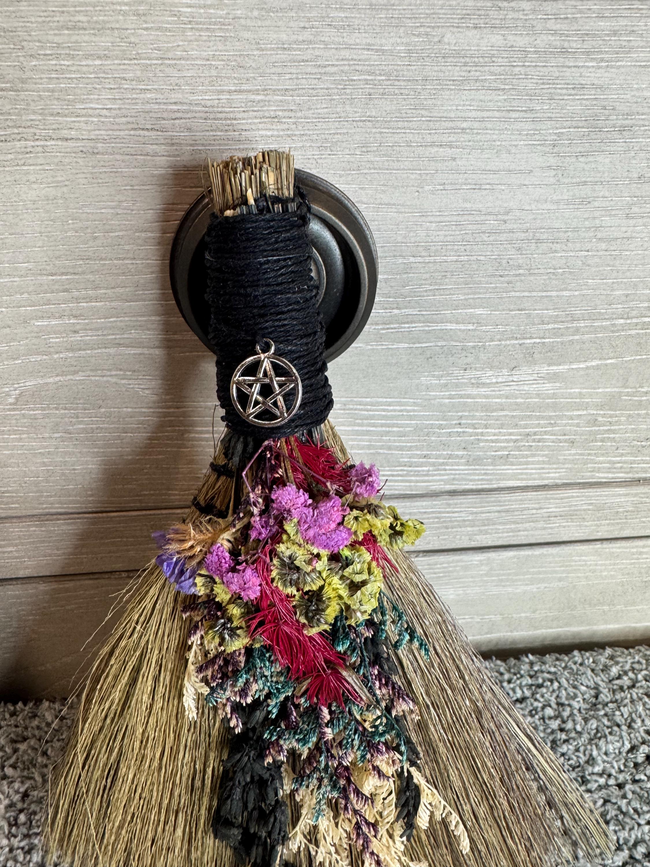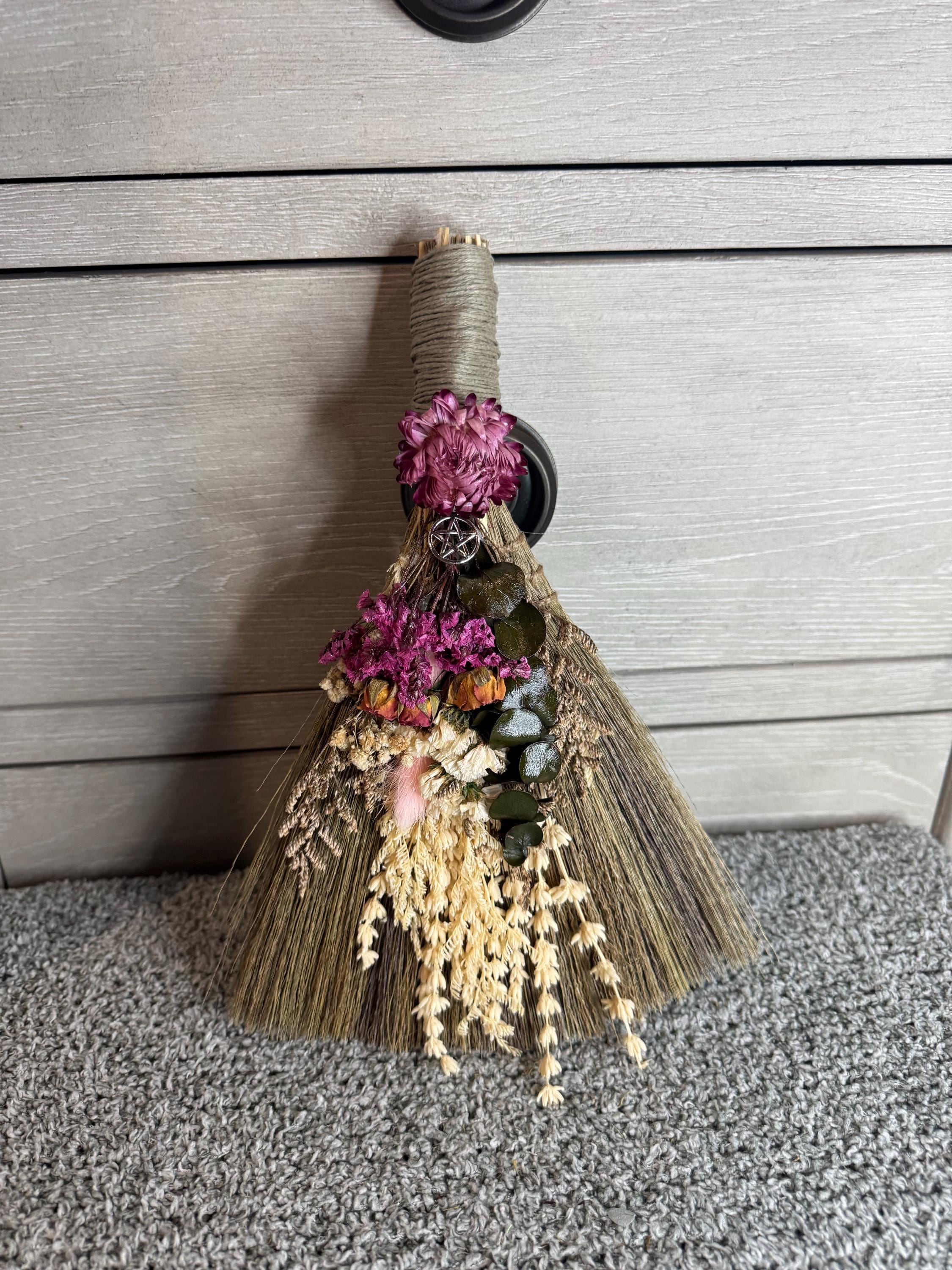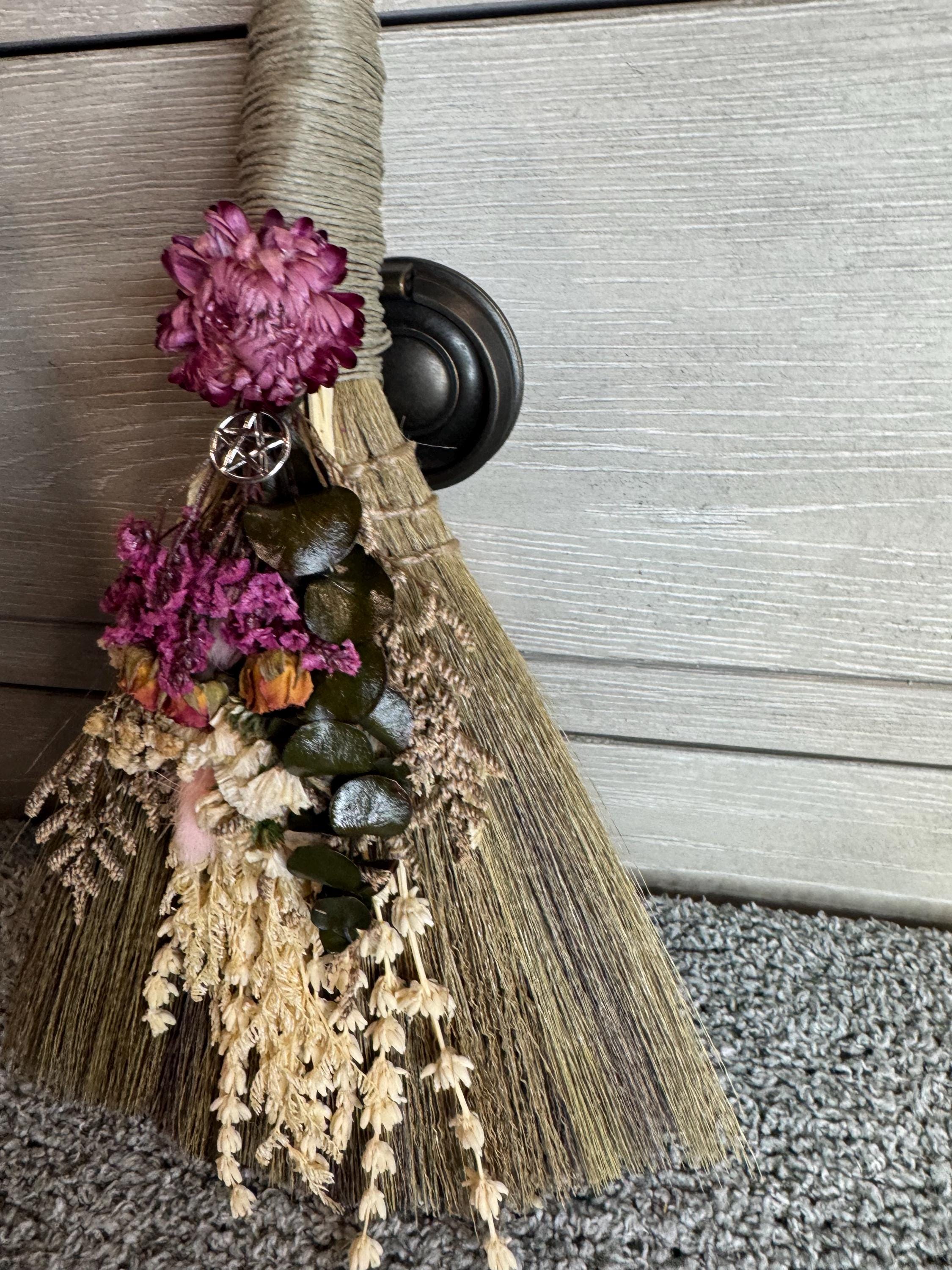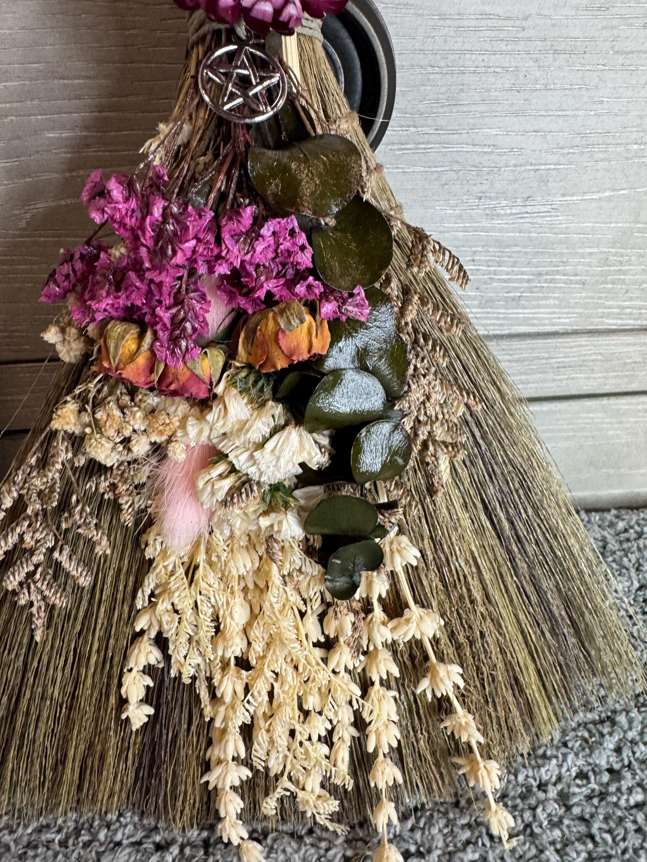 An Altar Besom is used in witchcraft for magical cleansing, purifying and altar space by sweeping away negative energy, and preparing the area for ritual. It is also used for other purposes like protection, marking sacred boundaries, and as a symbolic element in handfasting ceremonies, where couples might jump over the besom. Uses in Witchcraft: cleansing, protection, ceremonial, symbolism, and energy redirection. Made with real dried flowers and measures 11" long. Blessed Be!