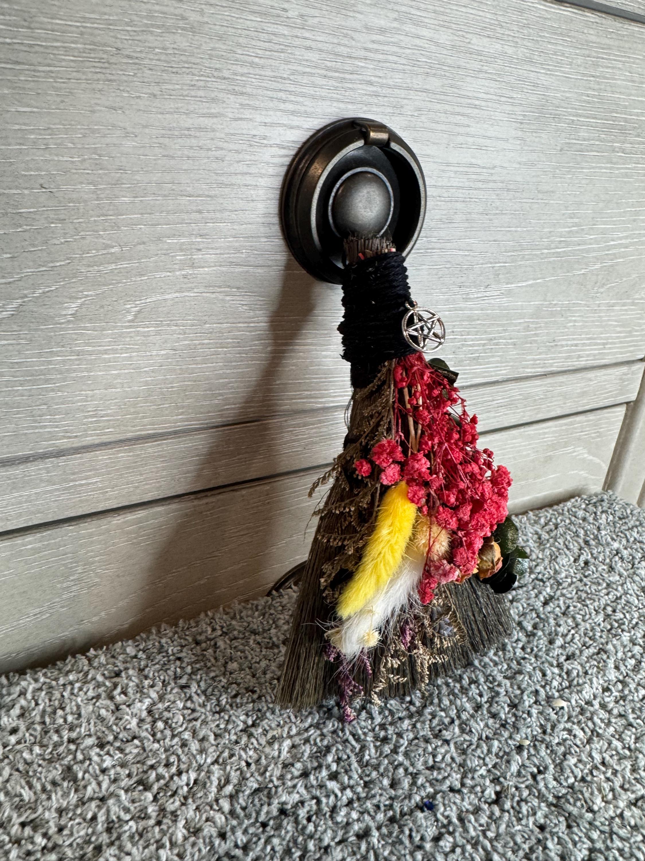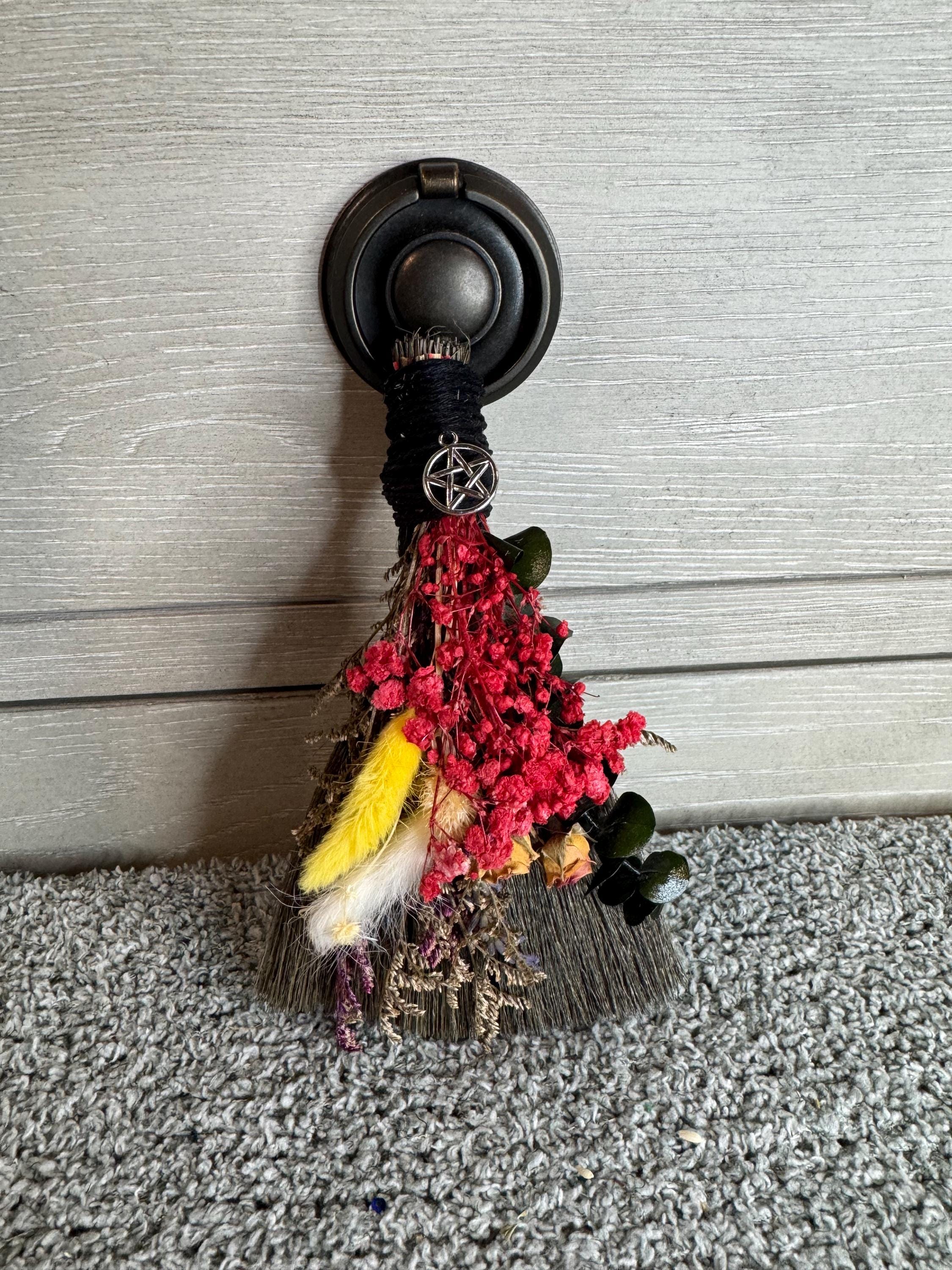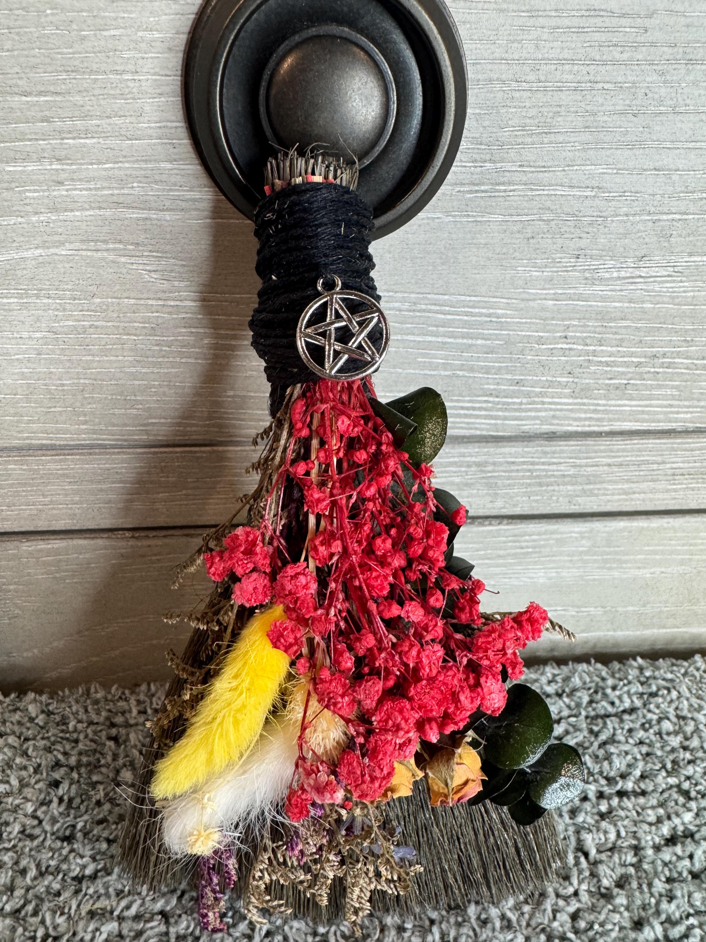 An altar besom is used in witchcraft for magical cleansing, purifying and altar space by sweeping away negative energy, and preparing the area for ritual. It is also used for other purposes like protection, marking sacred boundaries, and as a symbolic element in handfasting ceremonies. Besom measures 6" long made with real dried flowers. Blessed Be!