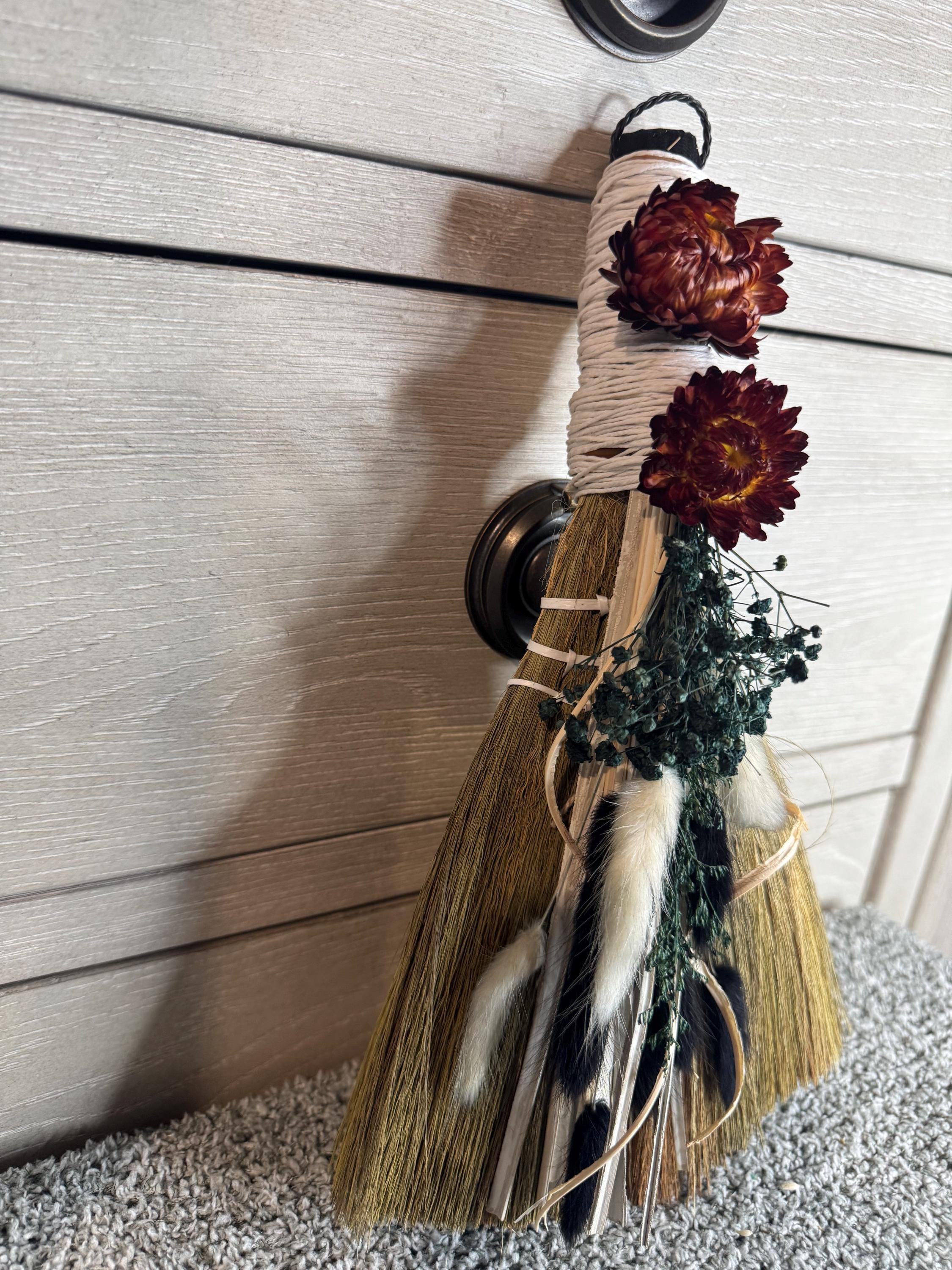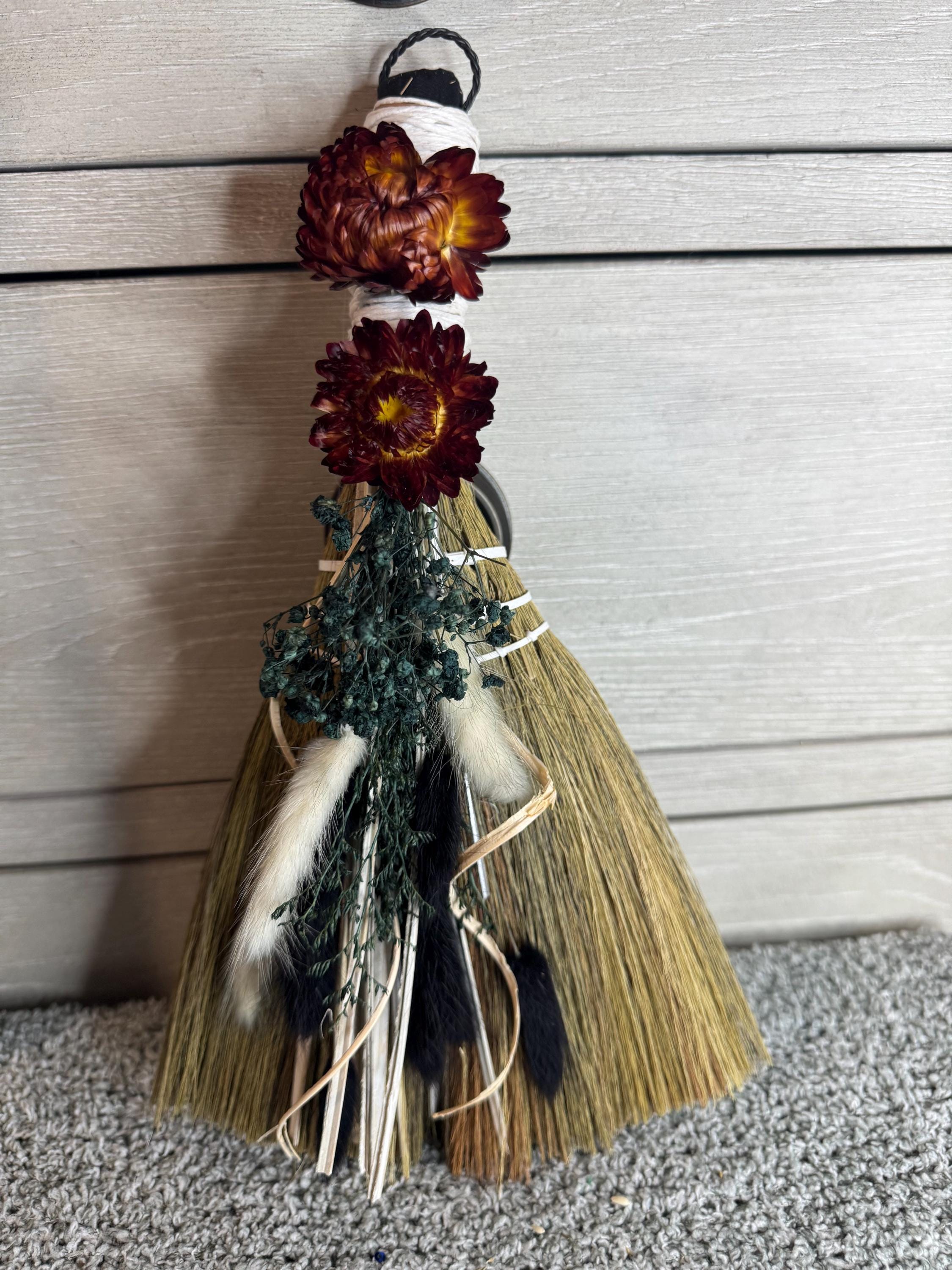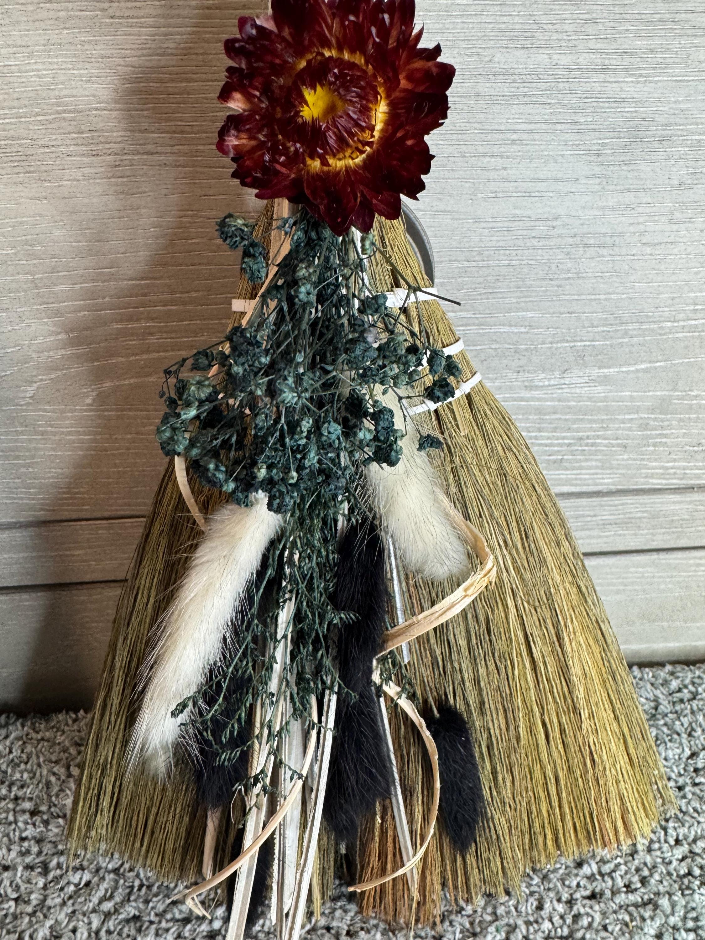 An altar Besom is used in witchcraft for magical cleansing, purifying and altar space by sweeping away negative energy, and preparing the area for ritual. It is also used for other purposes like, protection, marking sacred boundaries, and as a symbolic element in handfasting ceremonies. Made with real dried flowers and measures 12" Long. Blessed Be!