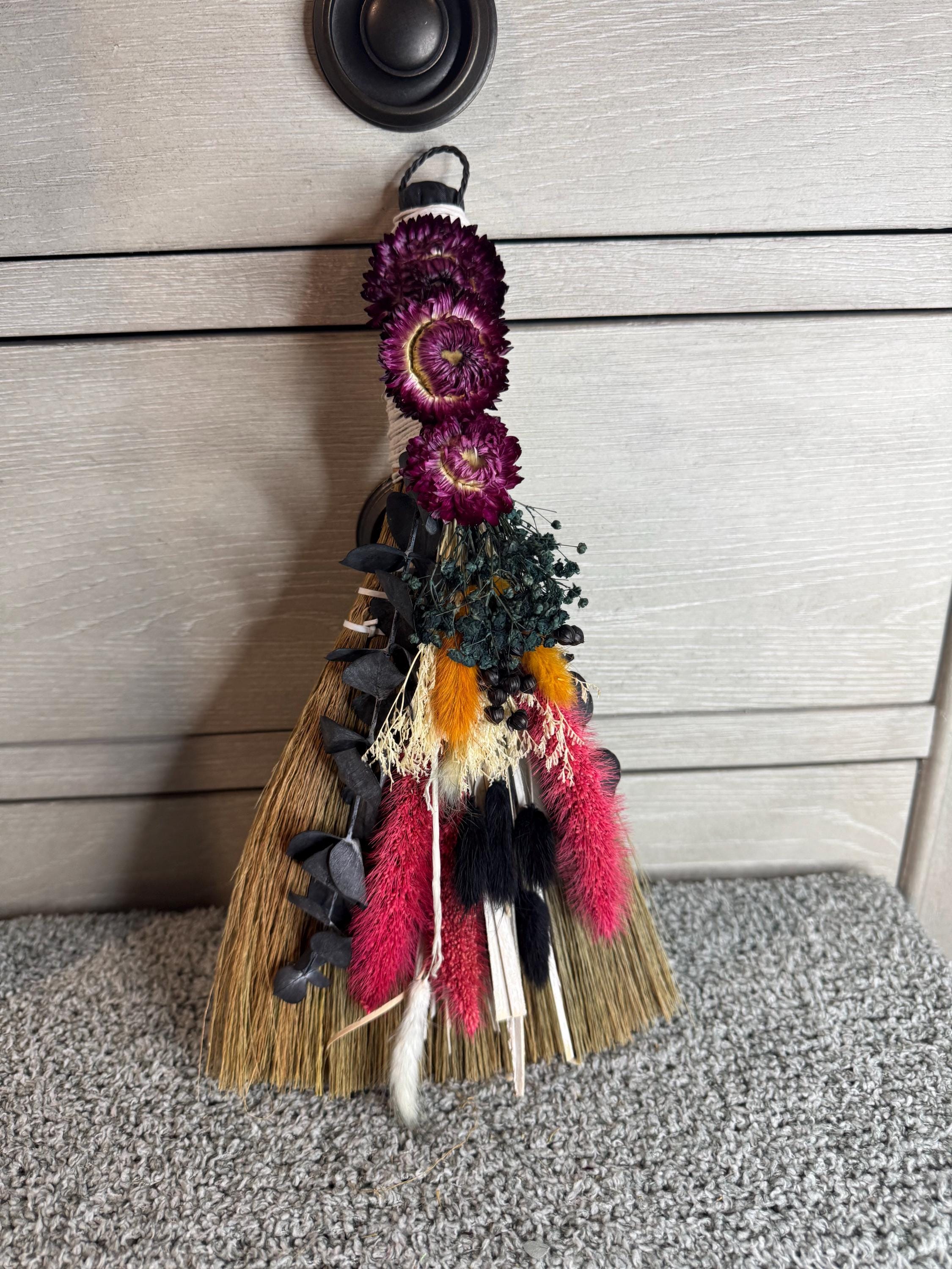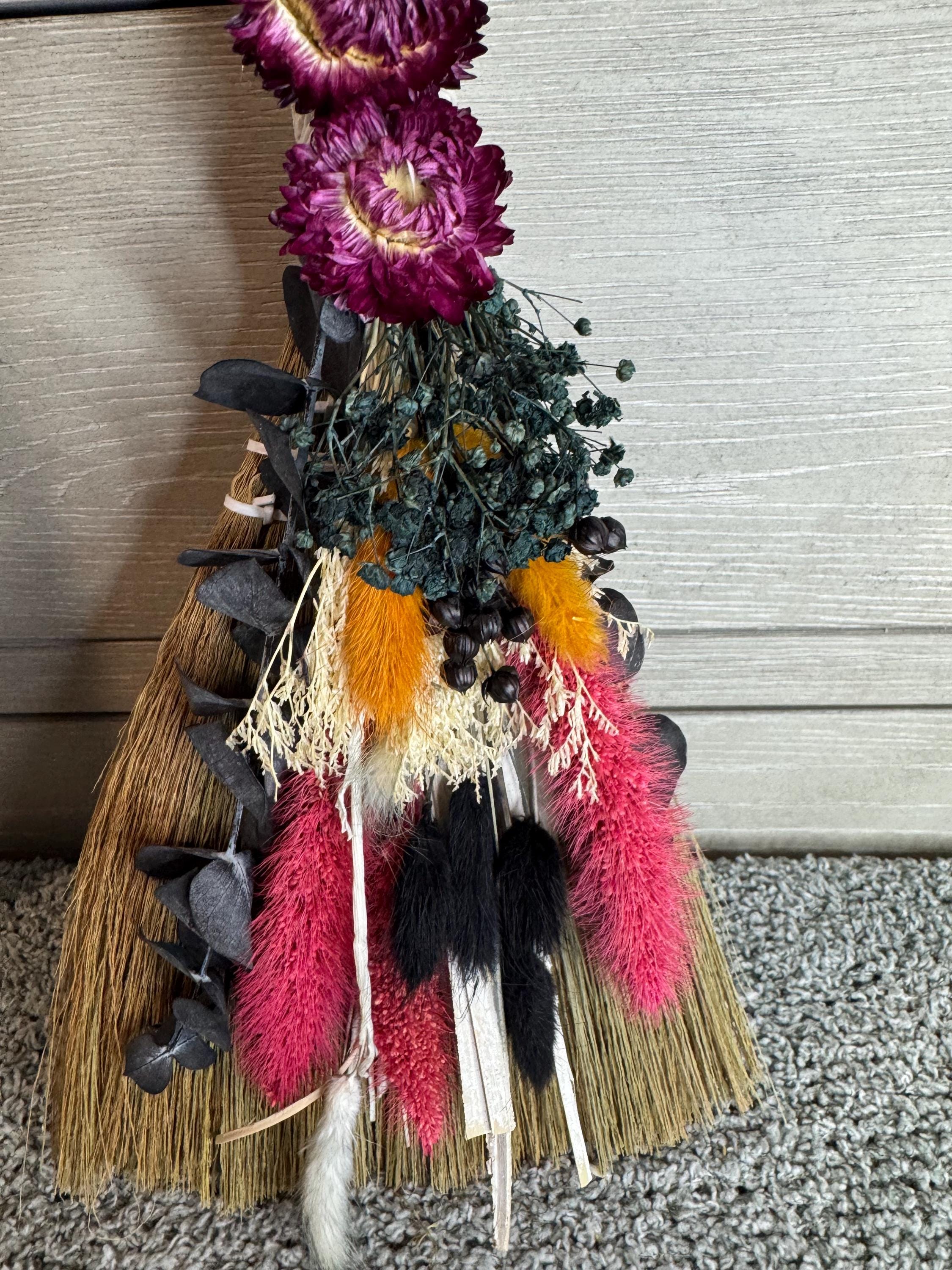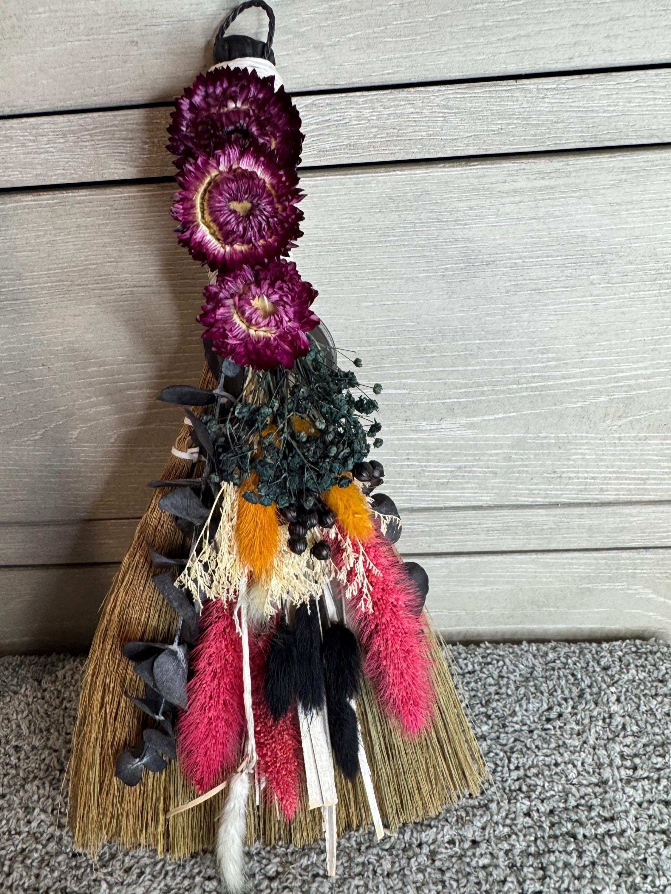 An altar besom is used in witchcraft for magical cleansing, purifying and altar space by sweeping away negative energy, and preparing the area for ritual. It is also used for other purposes like protection, marking sacred boundaries, and as a symbolic element in handfasting ceremonies. Besom is made with real dried flowers and measures 12" long. Blessed Be!