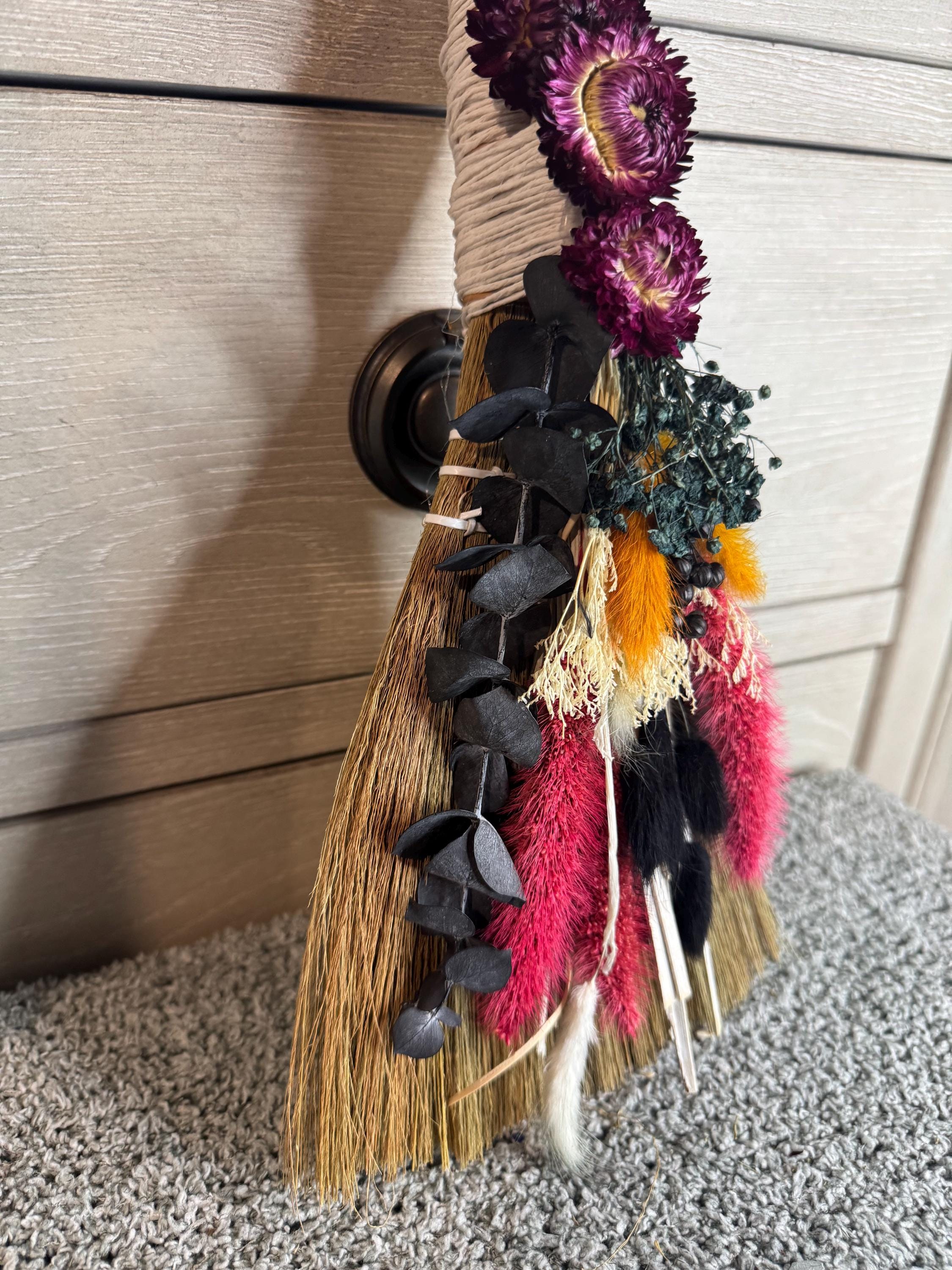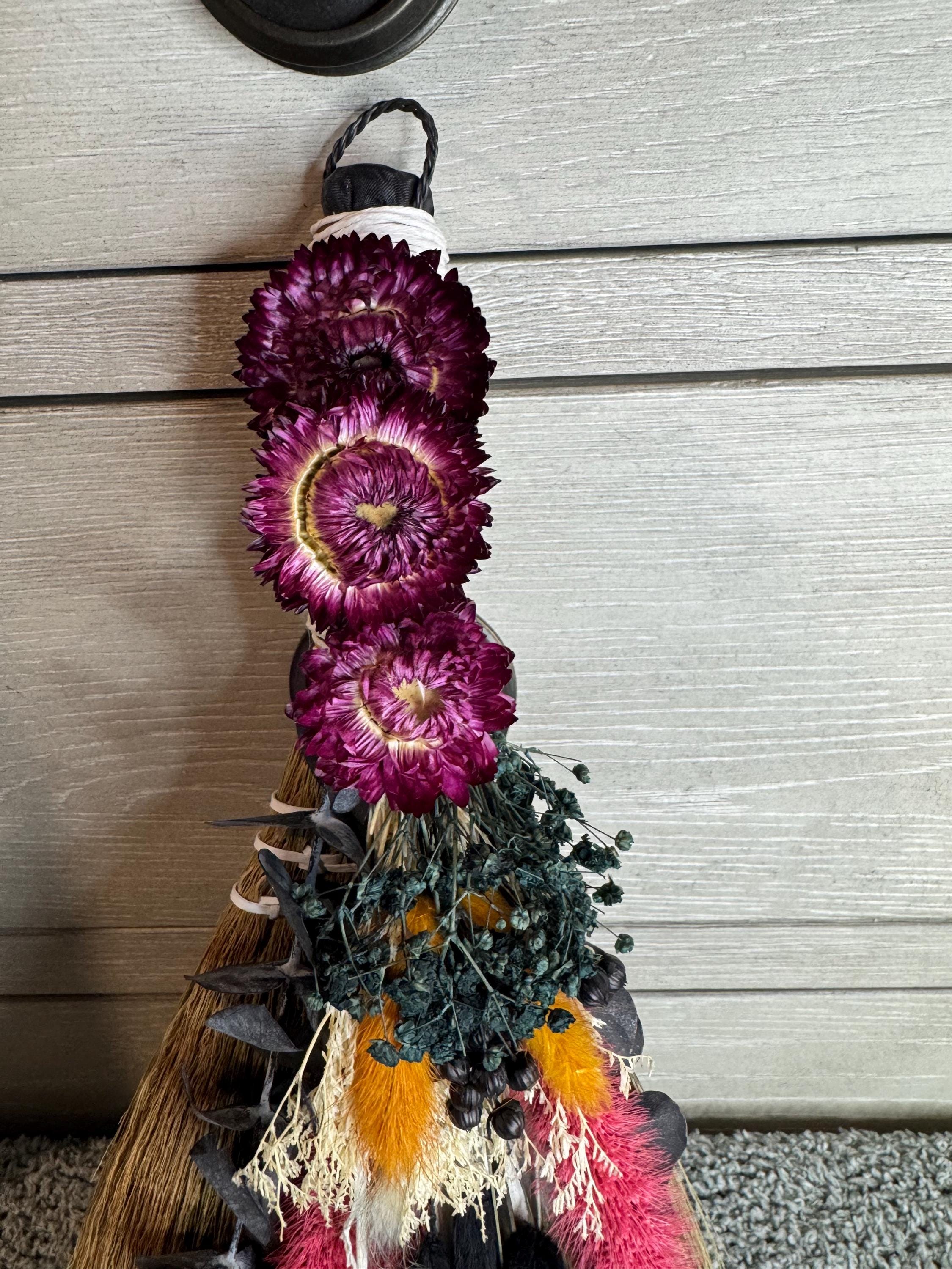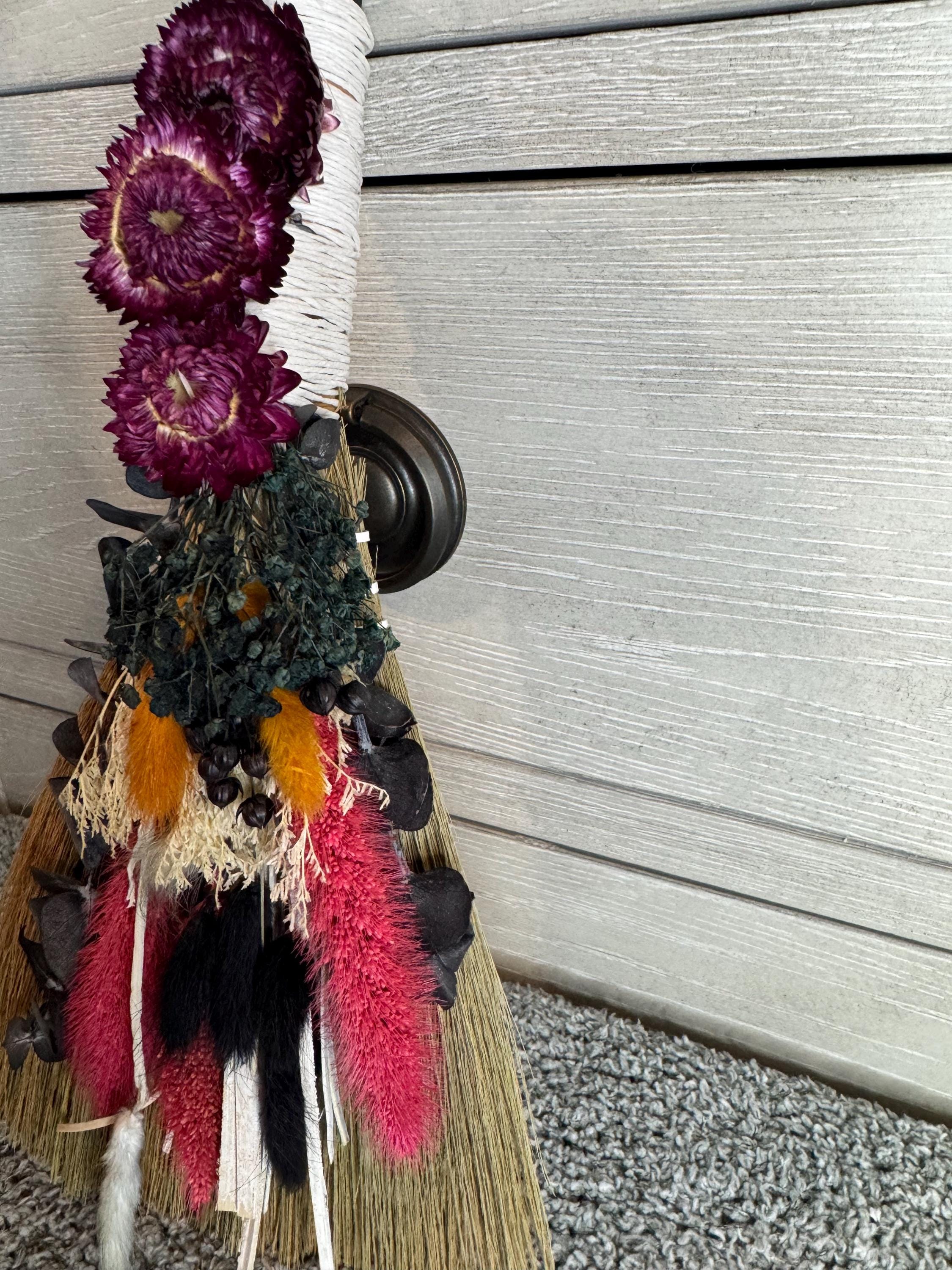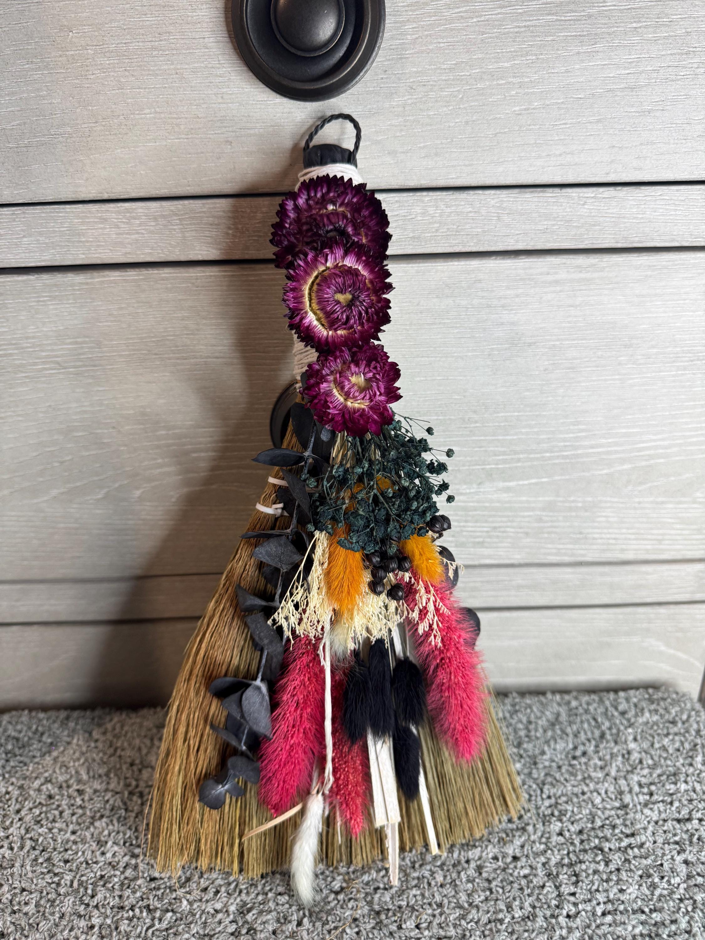 An altar besom is used in witchcraft for magical cleansing, purifying and altar space by sweeping away negative energy, and preparing the area for ritual. It is also used for other purposes like protection, marking sacred boundaries, and as a symbolic element in handfasting ceremonies. Besom is made with real dried flowers and measures 12" long. Blessed Be!
