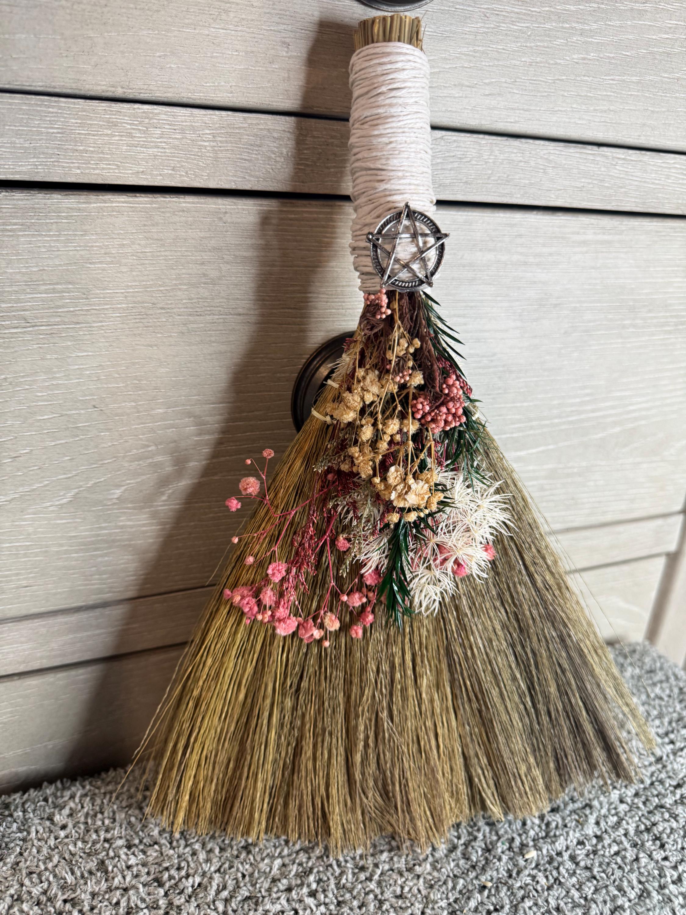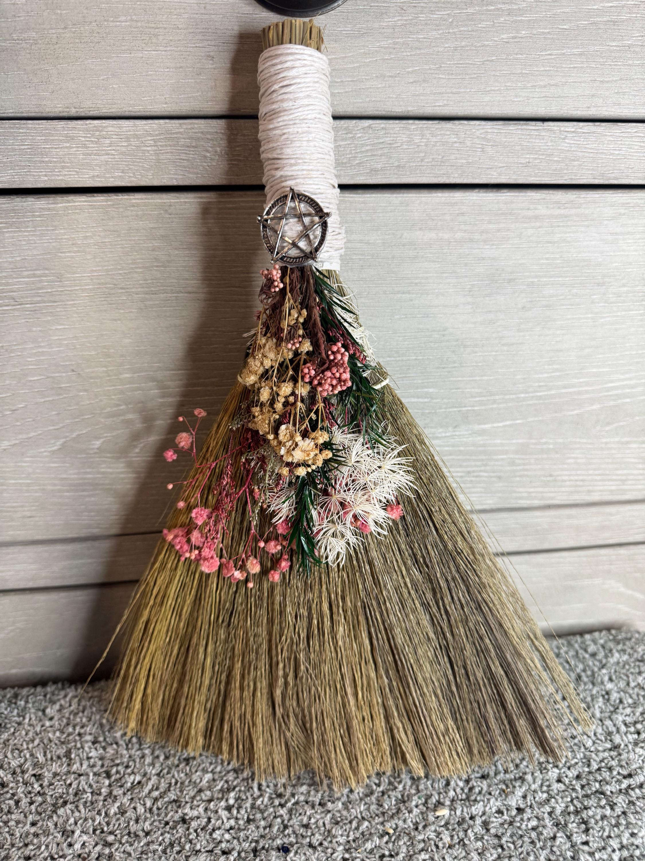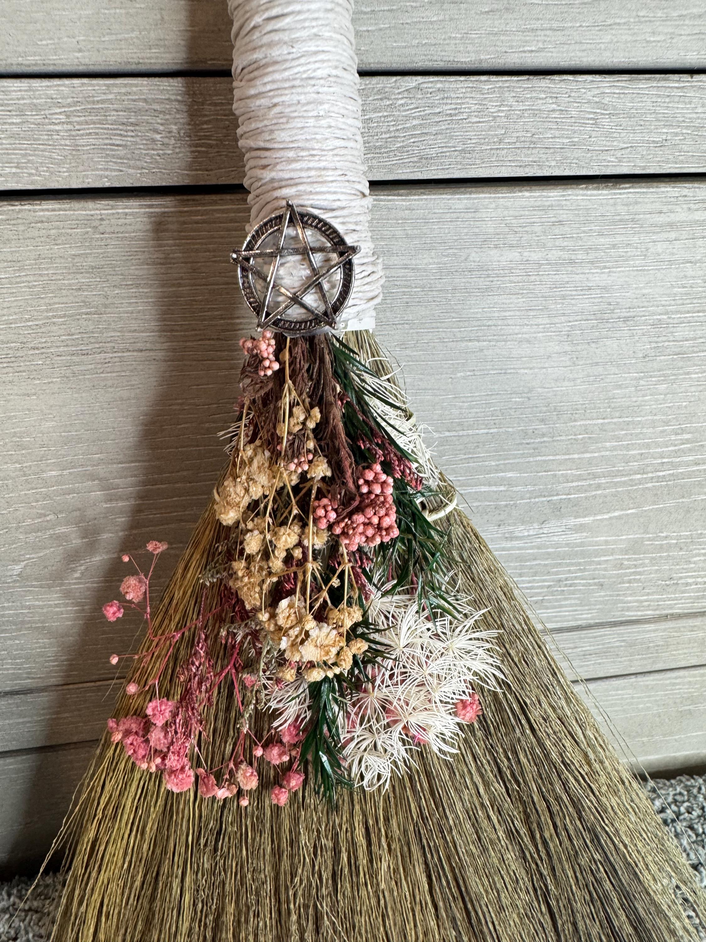 An altar besom is used in witchcraft for magical cleansing, purifying and altar space by sweeping away negative energy, and preparing the area for ritual. It is also used for other purposes like Protection, marking sacred boundaries, and as a symbolic element in handfasting ceremonies. Bemsom is made with real dried flowers and measures 12" Long. Blessed Be!