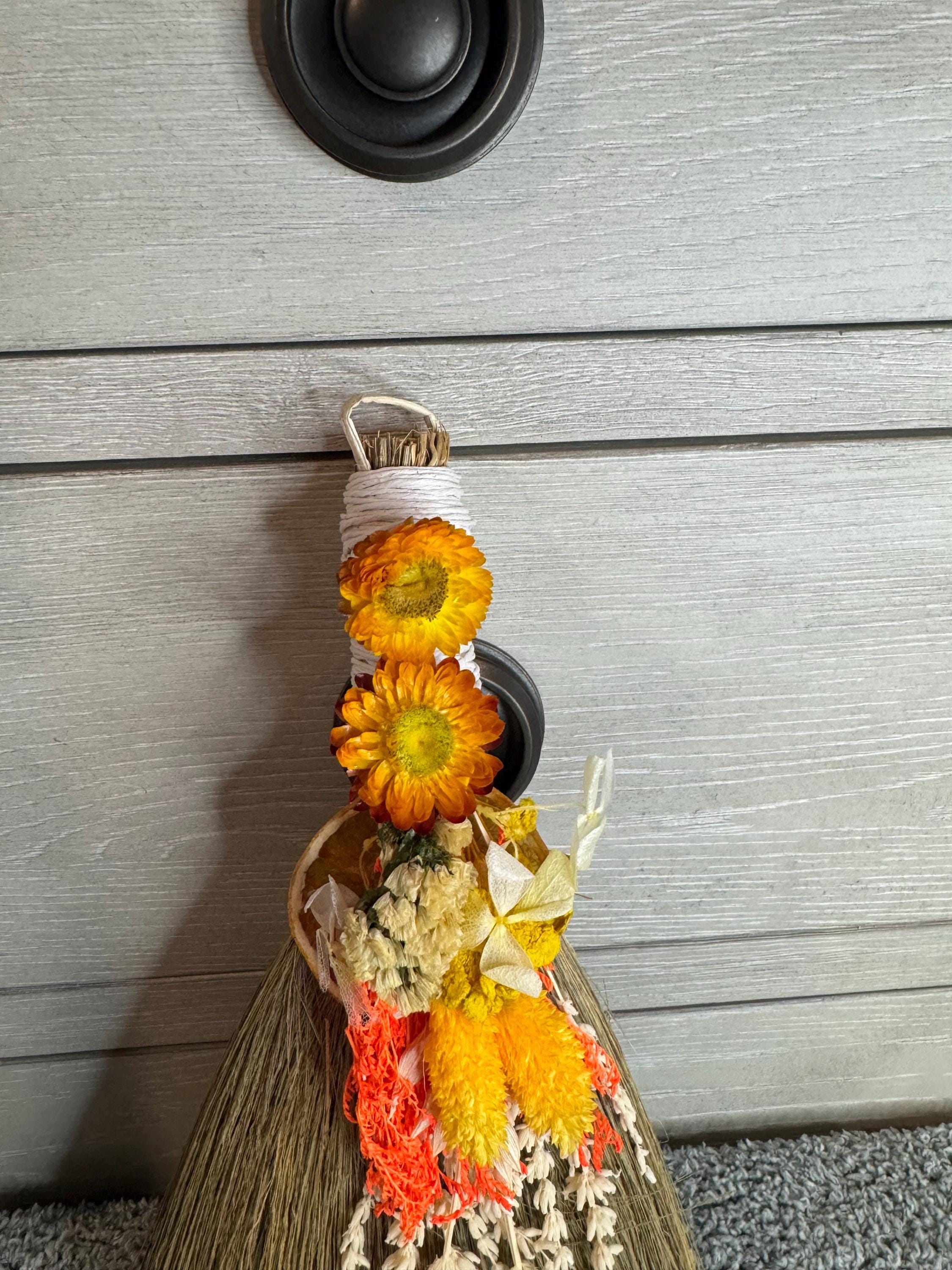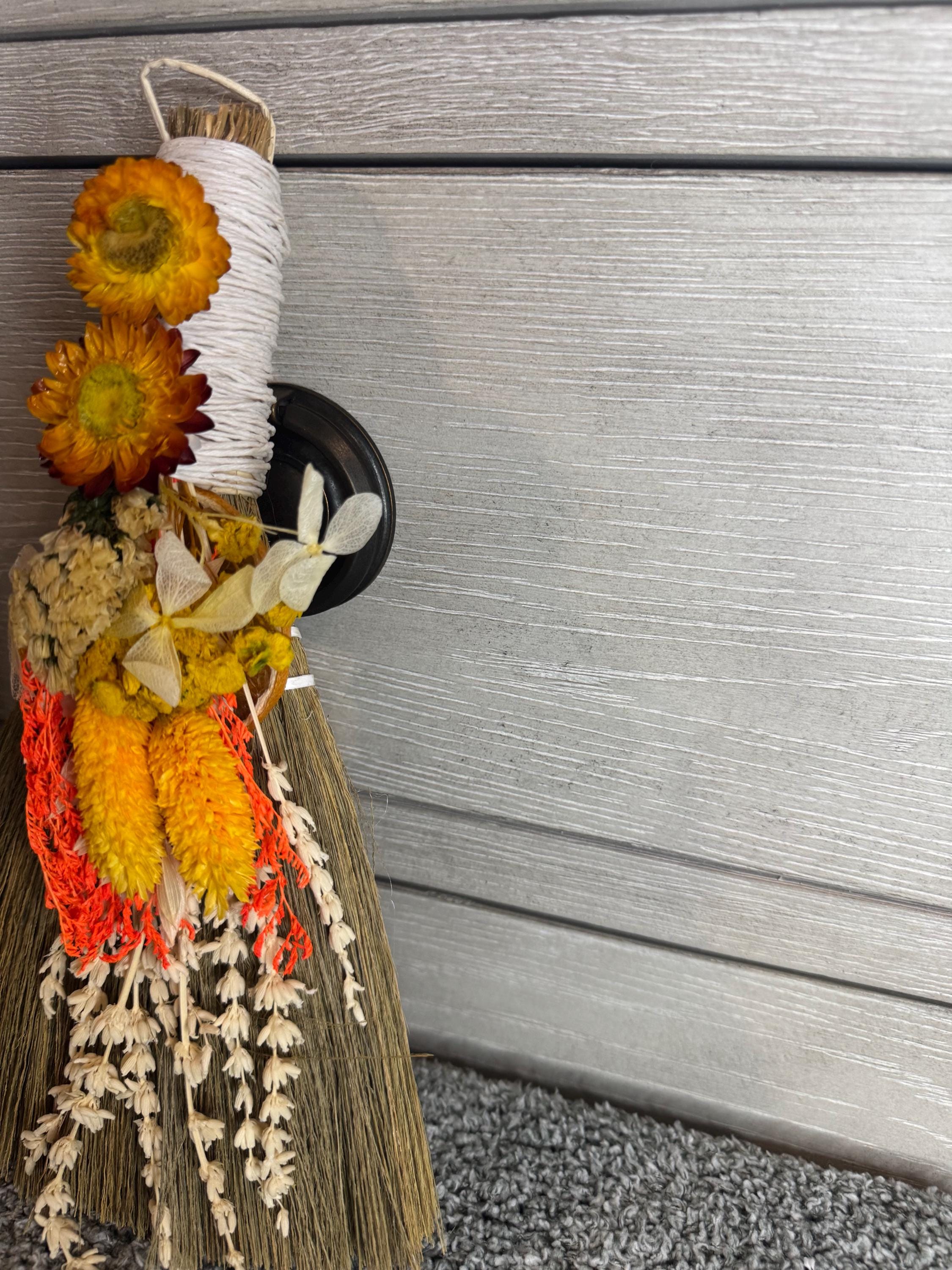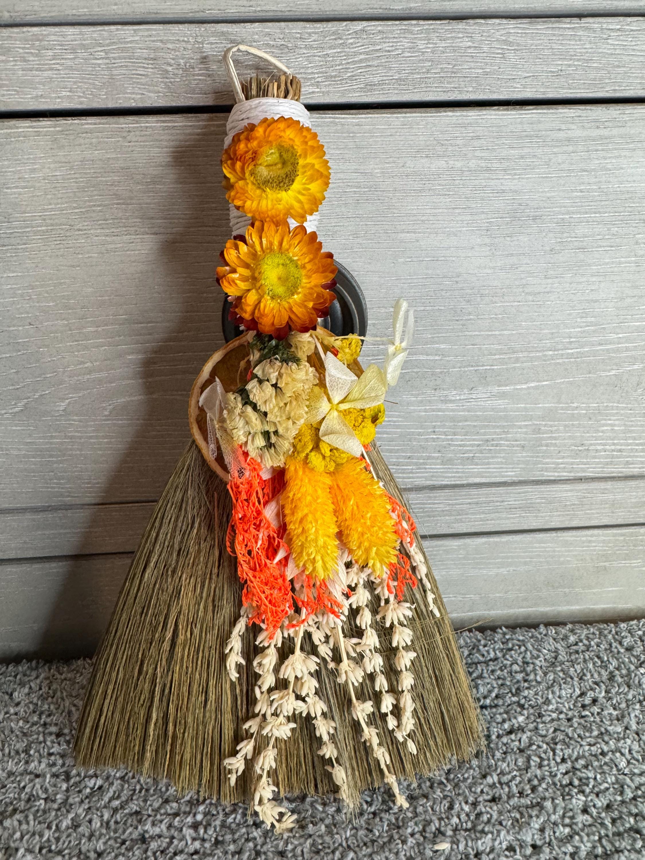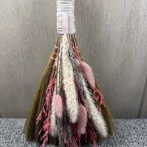 An altar besom is used in witchcraft for magical cleansing, purifying an altar space by sweeping away negative energy, and preparing the area for ritual. It is also used for other purposes like protection, marking sacred boundaries, and as a symbolic element in handfasting ceremonies. Made with real dried flowers and measures 10" Long.