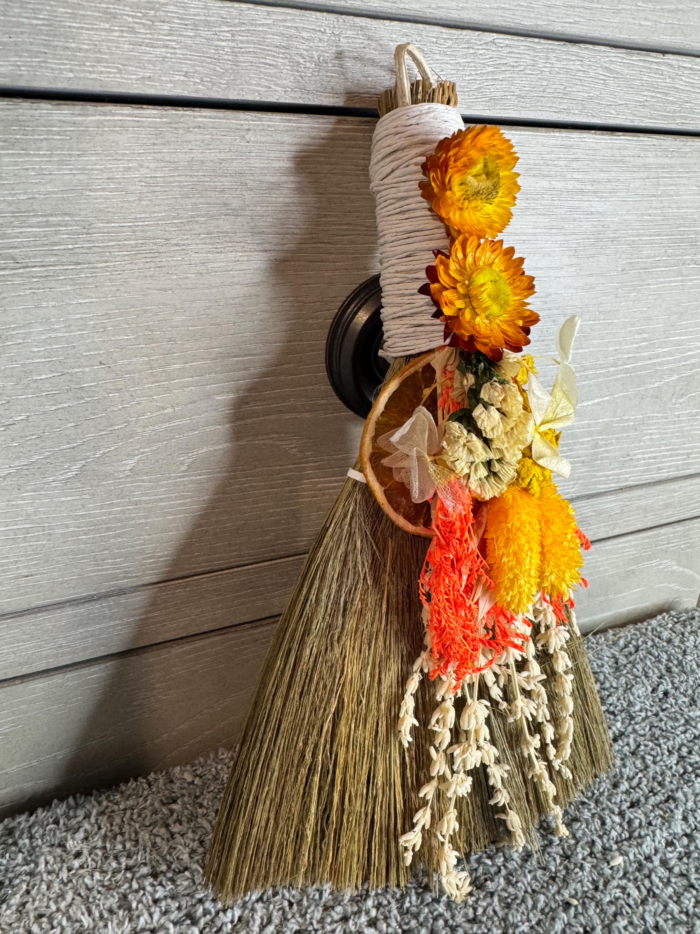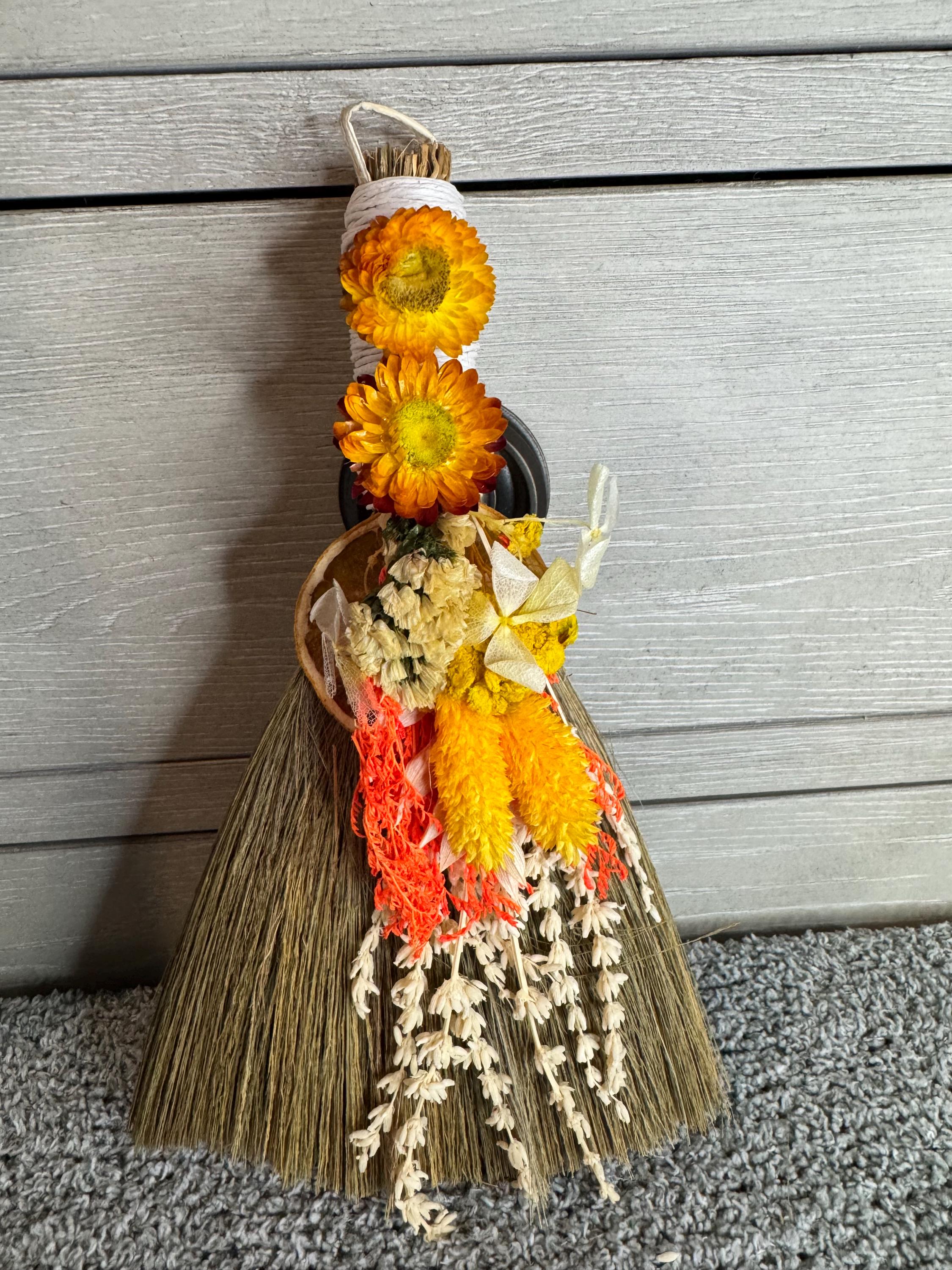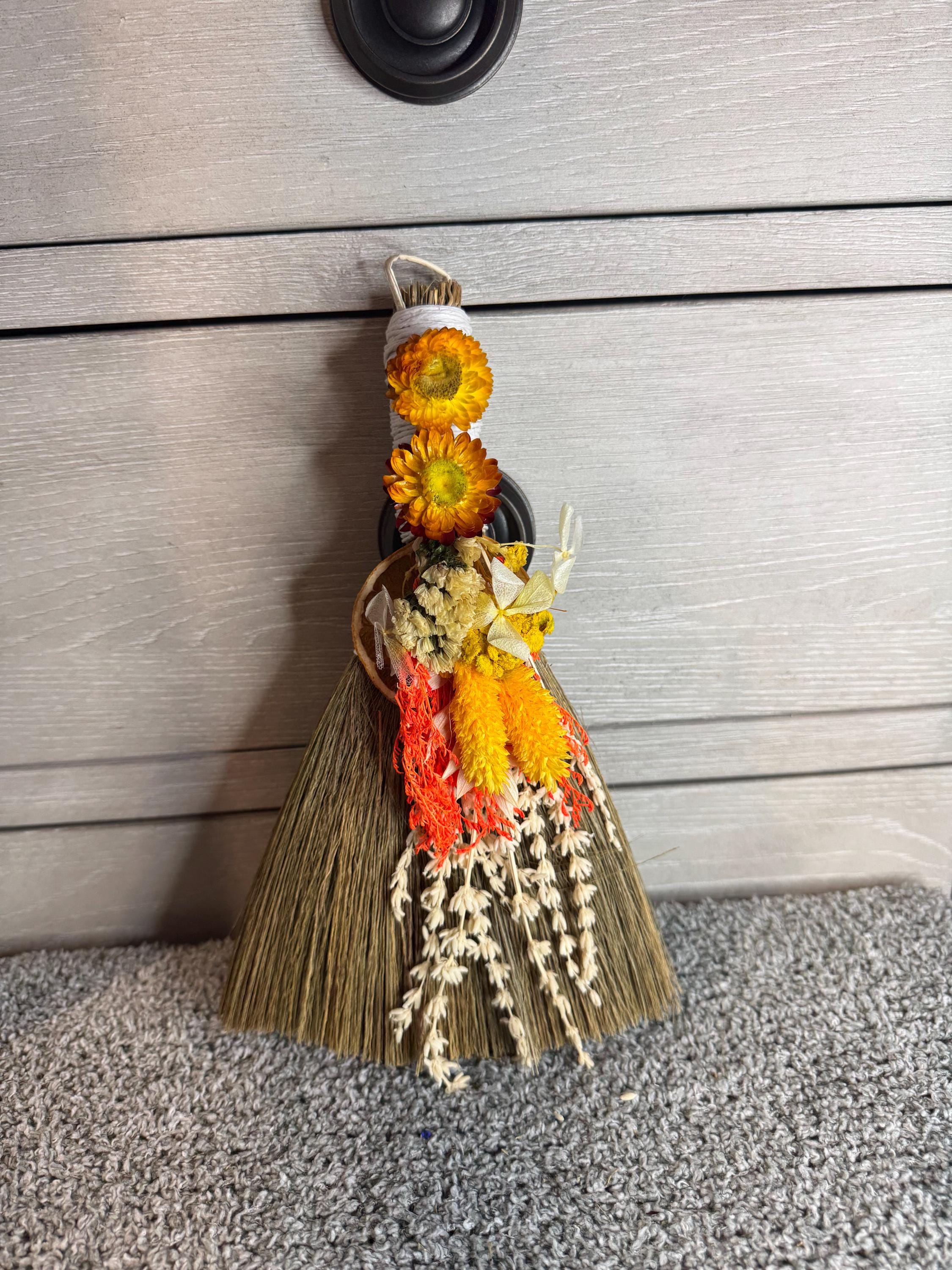 An altar besom is used in witchcraft for magical cleansing, purifying an altar space by sweeping away negative energy, and preparing the area for ritual. It is also used for other purposes like protection, marking sacred boundaries, and as a symbolic element in handfasting ceremonies. Made with real dried flowers and measures 10" Long.