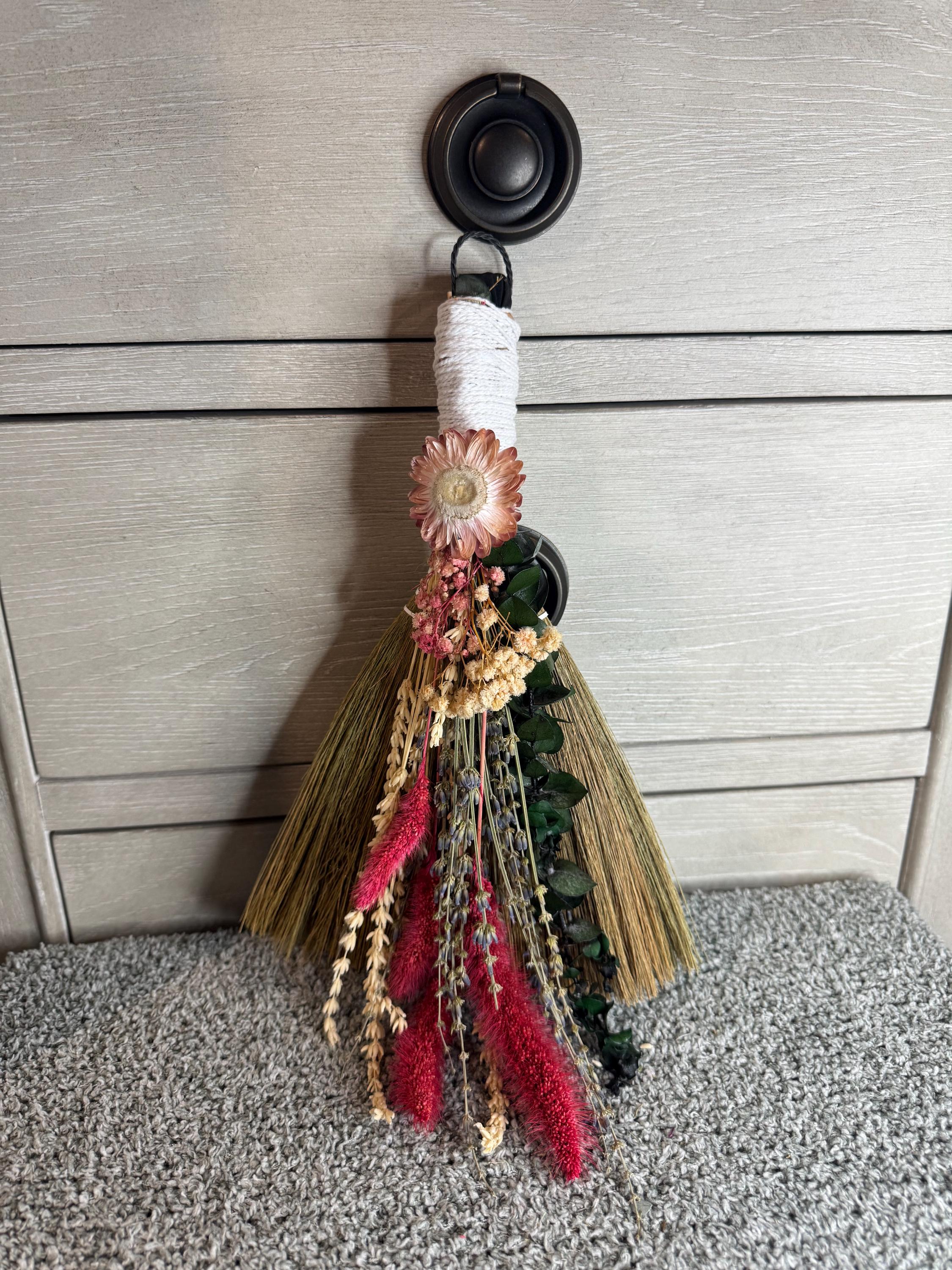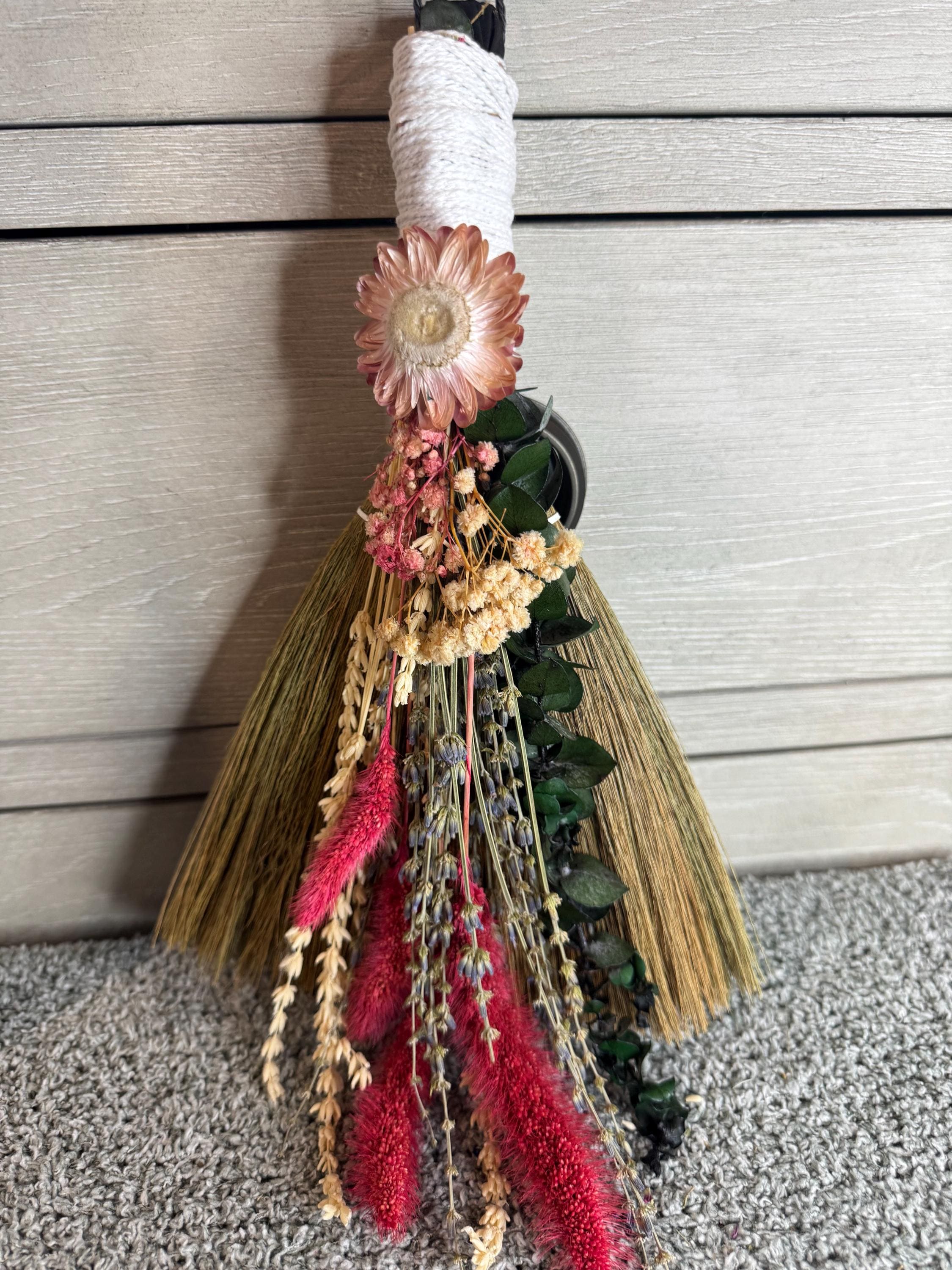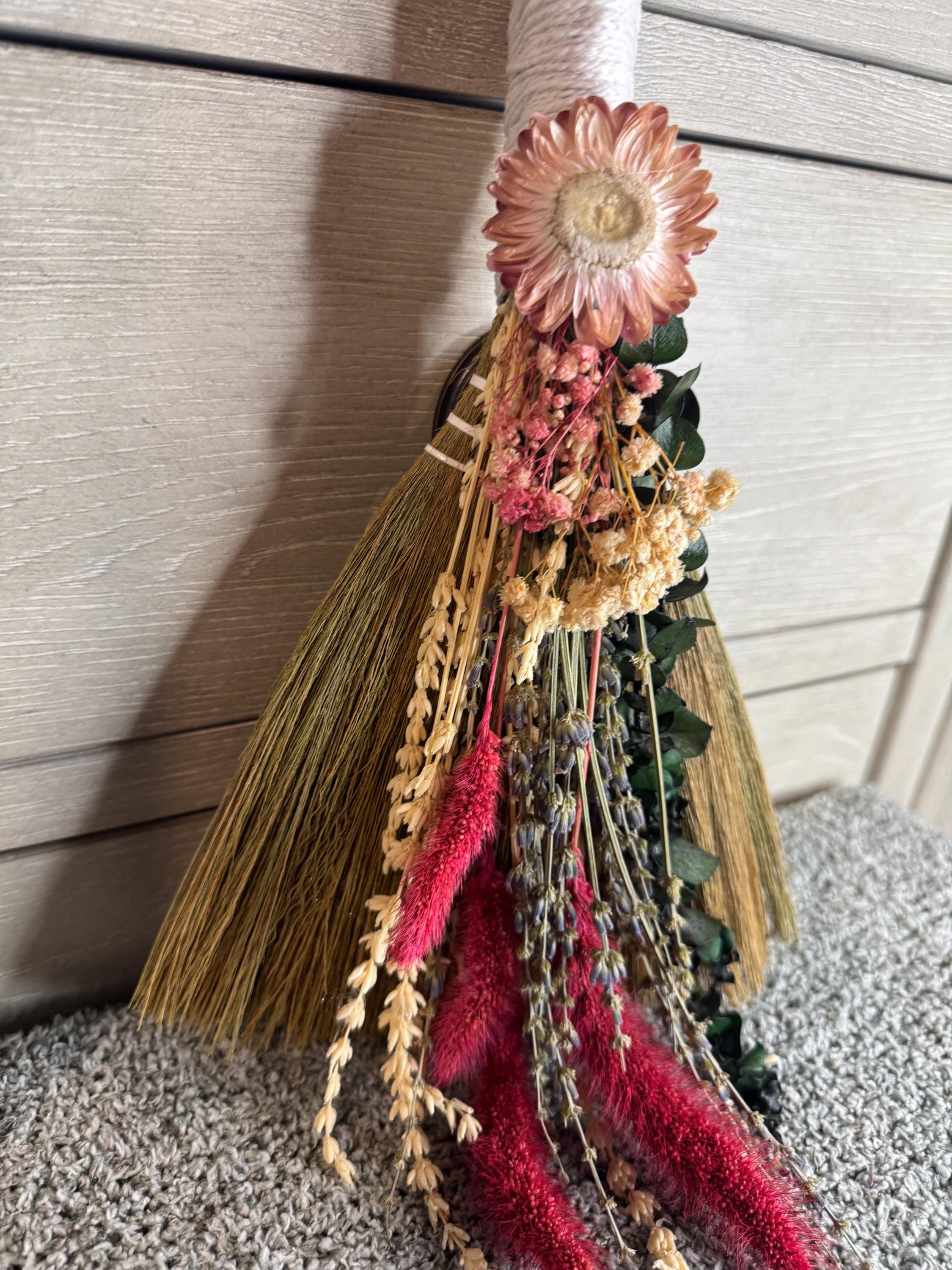 An altar besom is used in witchcraft for magical cleansing, purifying an altar space aby sweeping away negative energy, and preparing the area for a ritual. It is also used for other purposed like protection, marking sacred boundaries, and as a symbolic element in handfasting ceremonies. Made with real dried flowers and measures 12". Blessed Be!