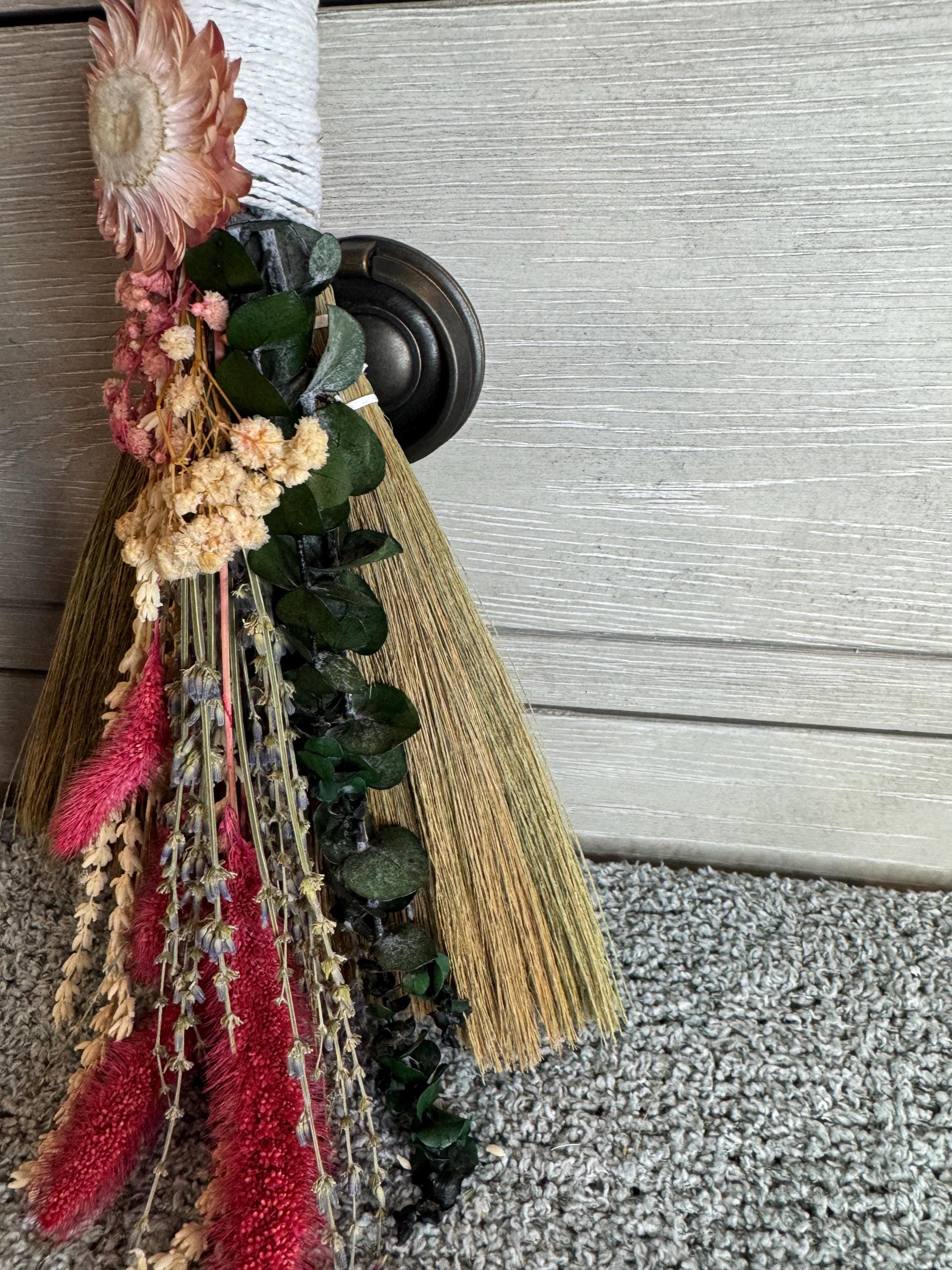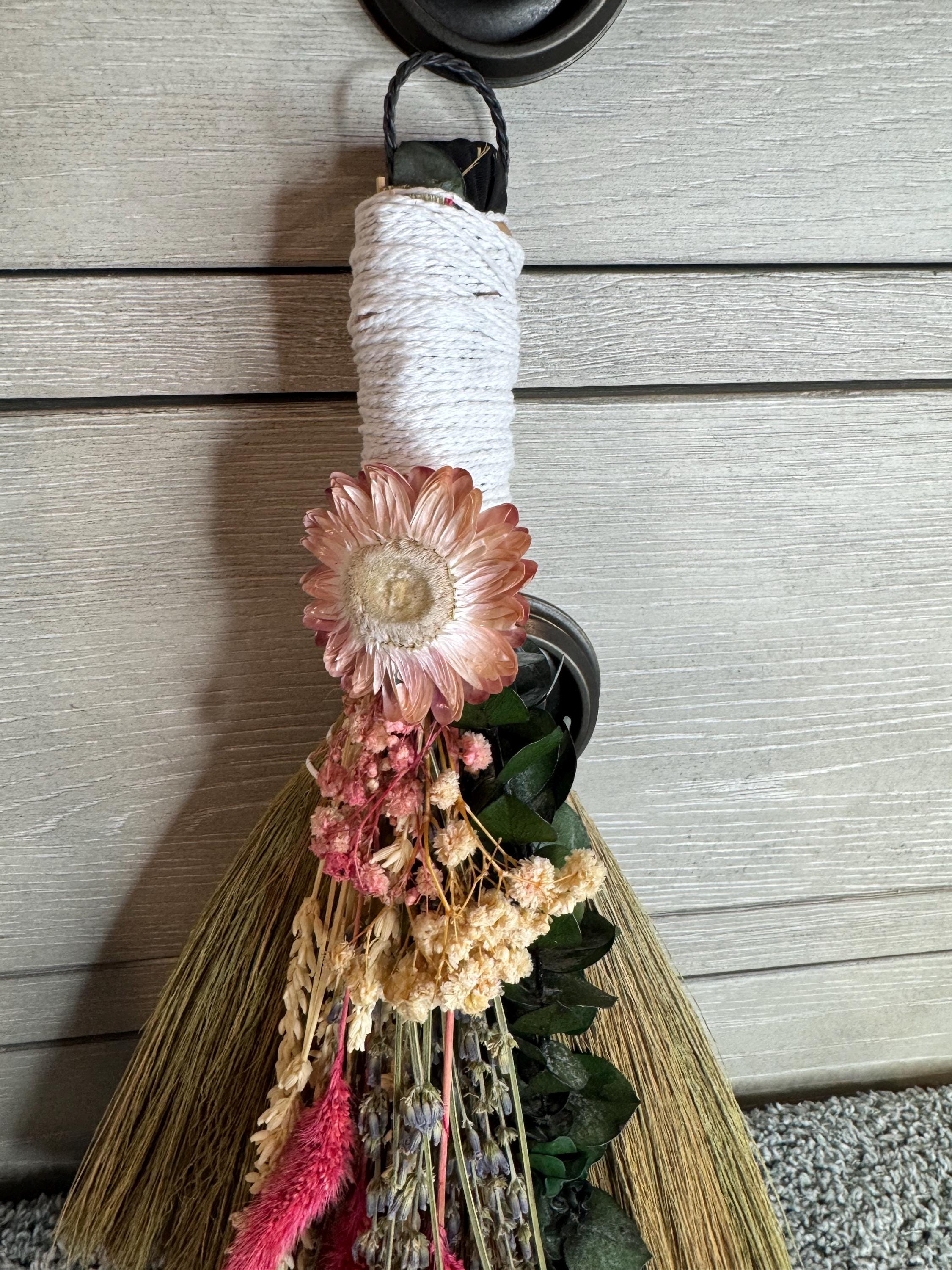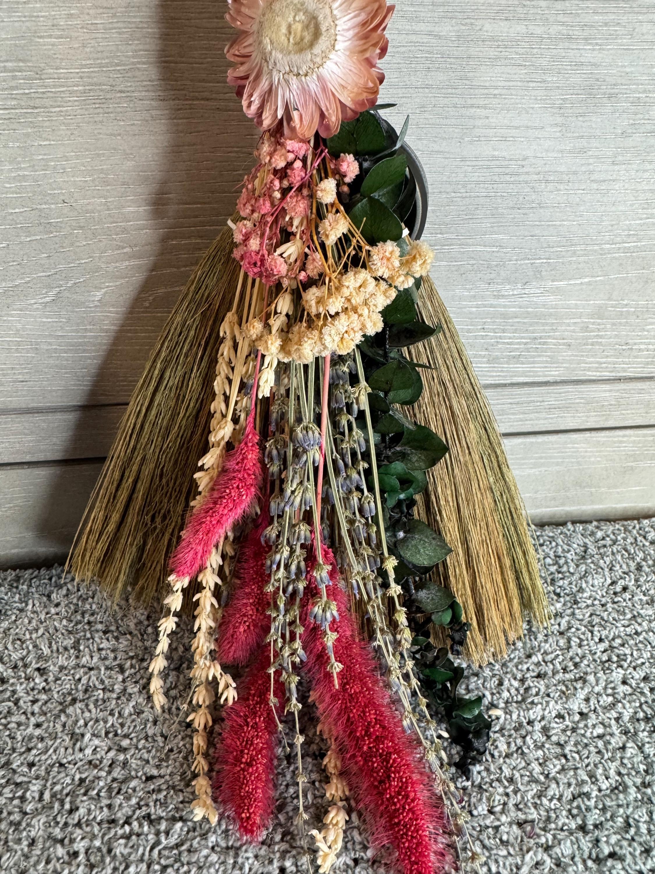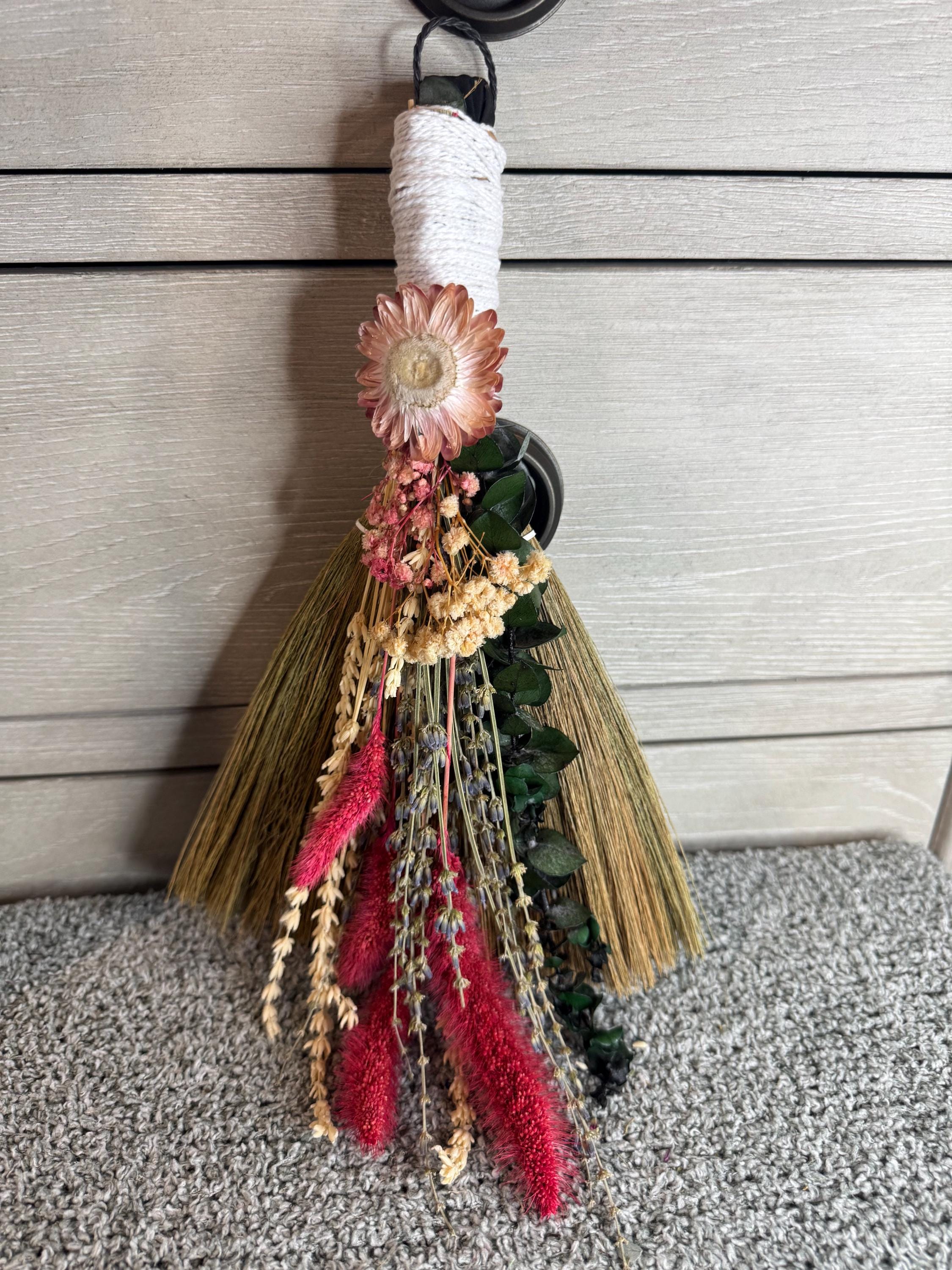 An altar besom is used in witchcraft for magical cleansing, purifying an altar space aby sweeping away negative energy, and preparing the area for a ritual. It is also used for other purposed like protection, marking sacred boundaries, and as a symbolic element in handfasting ceremonies. Made with real dried flowers and measures 12". Blessed Be!